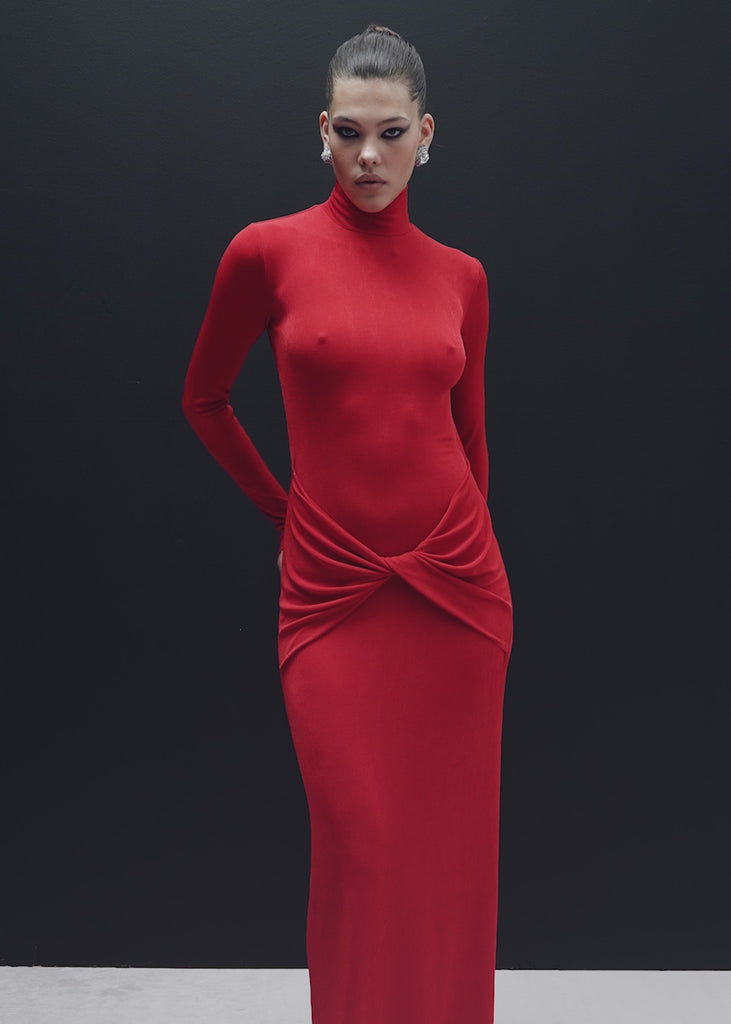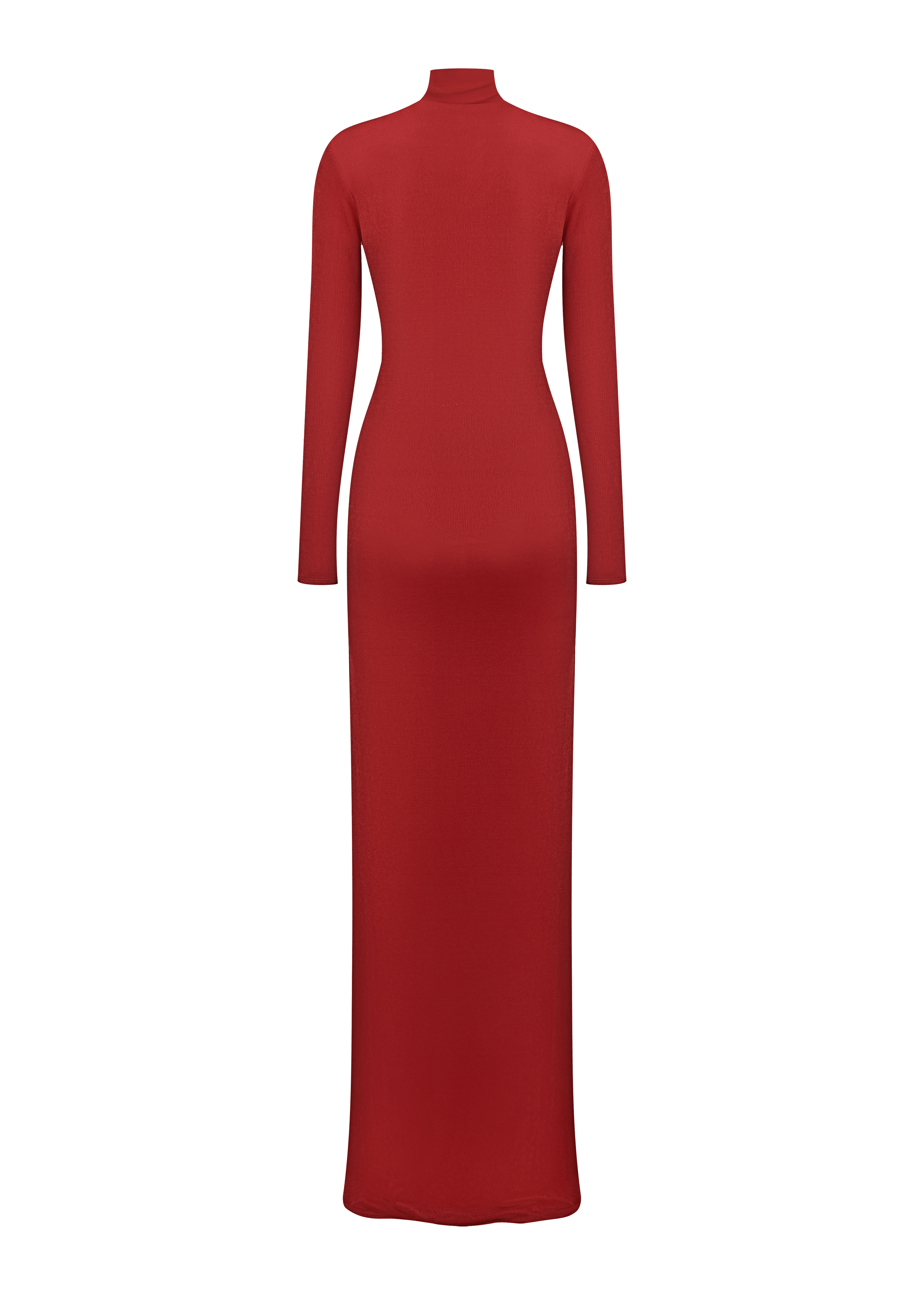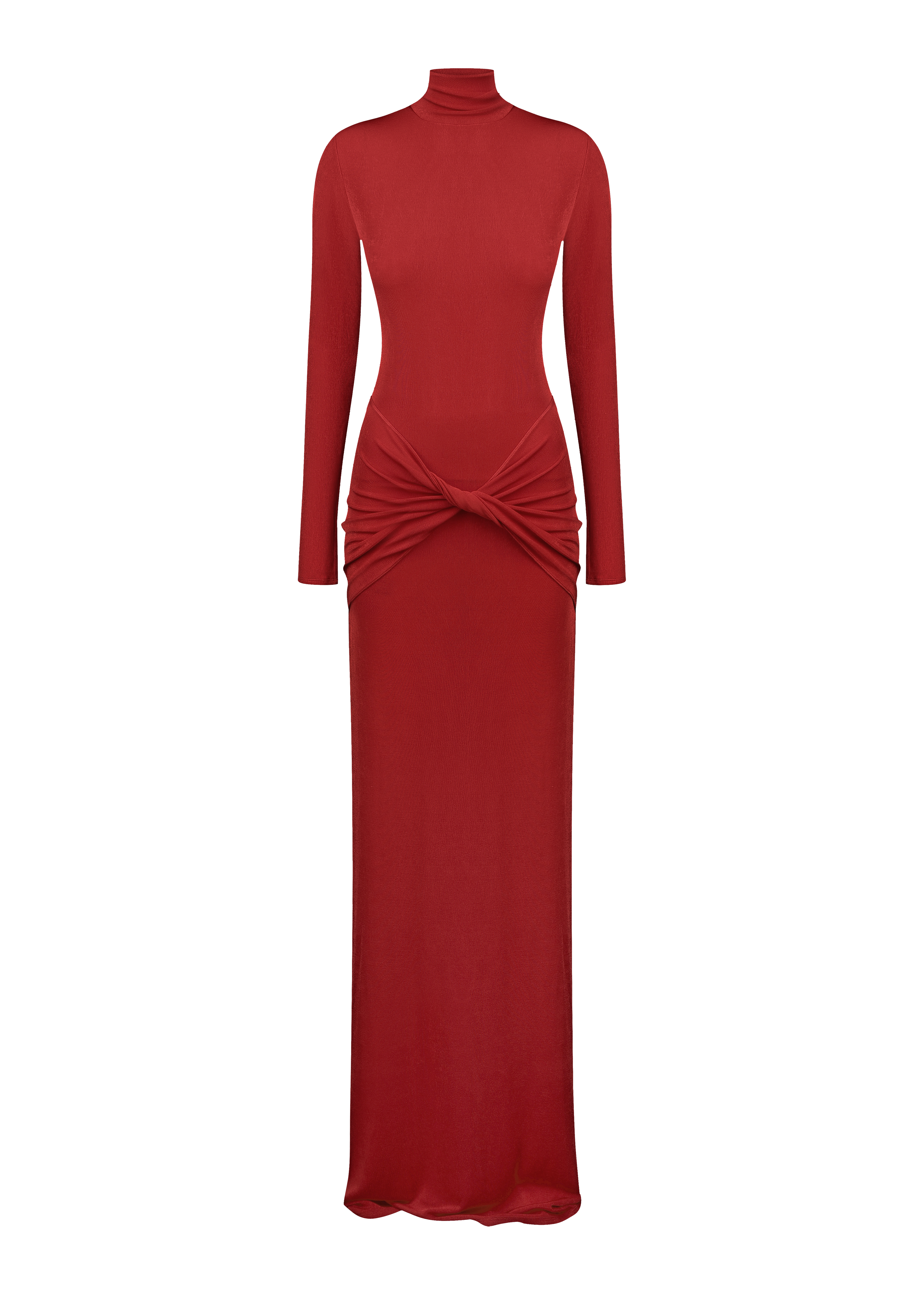 Dramatic long sleeve turtleneck maxi dress in ruby red hue crafted from soft luxurious jersey fabric. The central element of the composition is knot detail on hips. It creates sculpted sensual silhouette. Crafted from soft, stretchy fabric, Antonia dress hugs your curves for a flawless fit, making it the perfect choice for passionate date night.