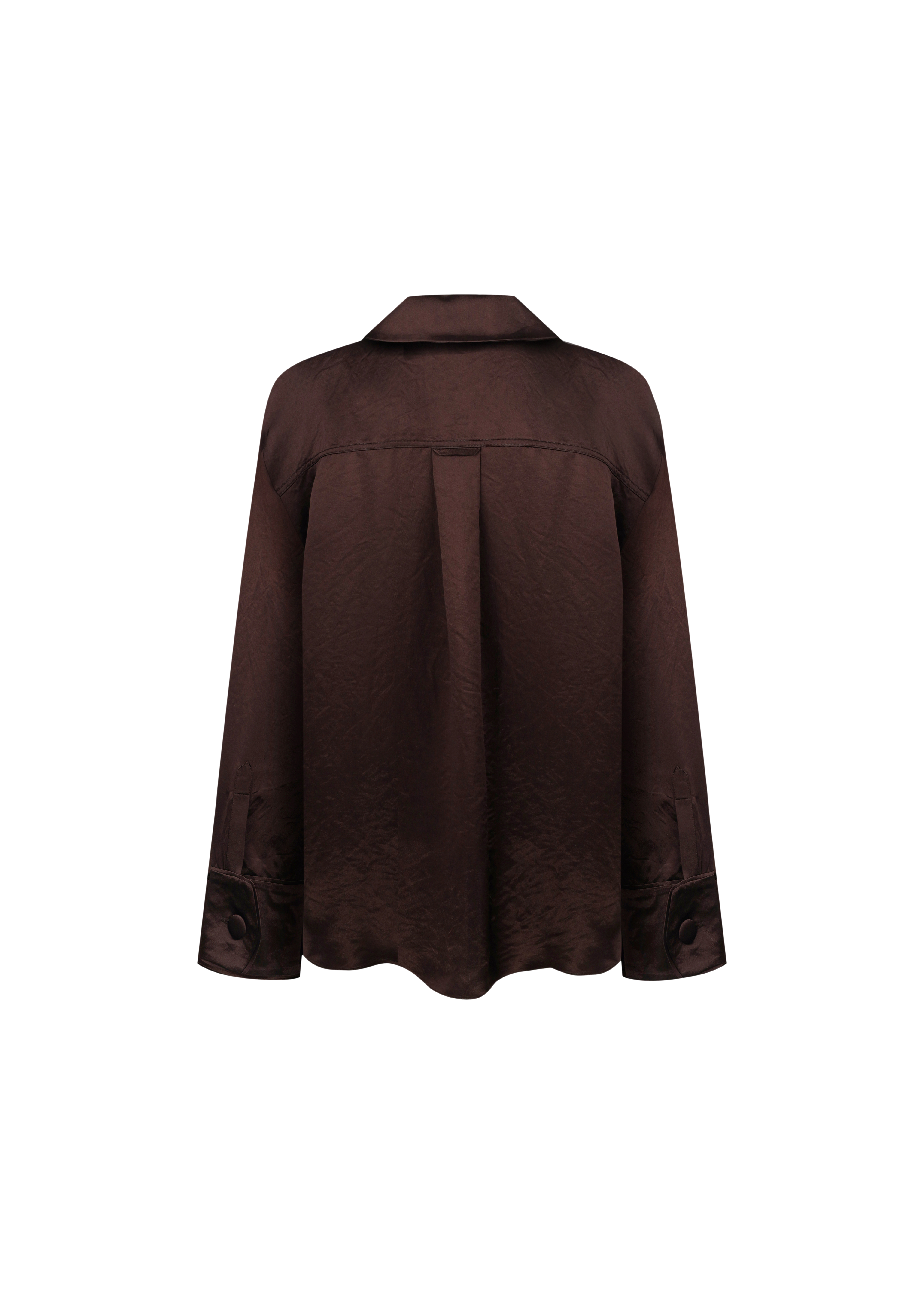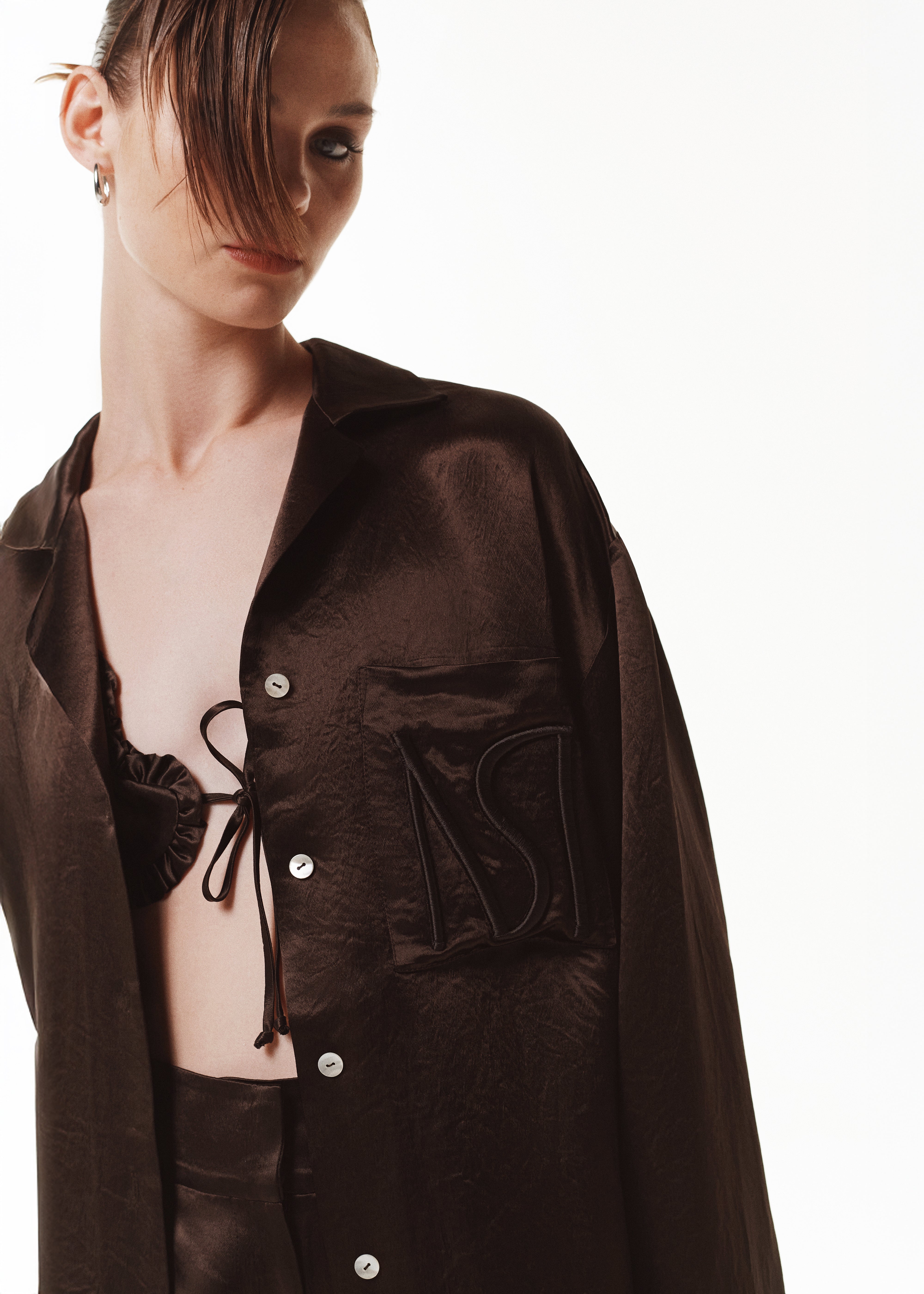 Oversized blouse in the pajama style with wide and dropped sleeves. Blouse is fastened with elegant pearl buttons and has a large patch chest pocket with a puffy embroidered Marianna Senchina logo. The last touch in decor is stitching in the main color and locker loop.