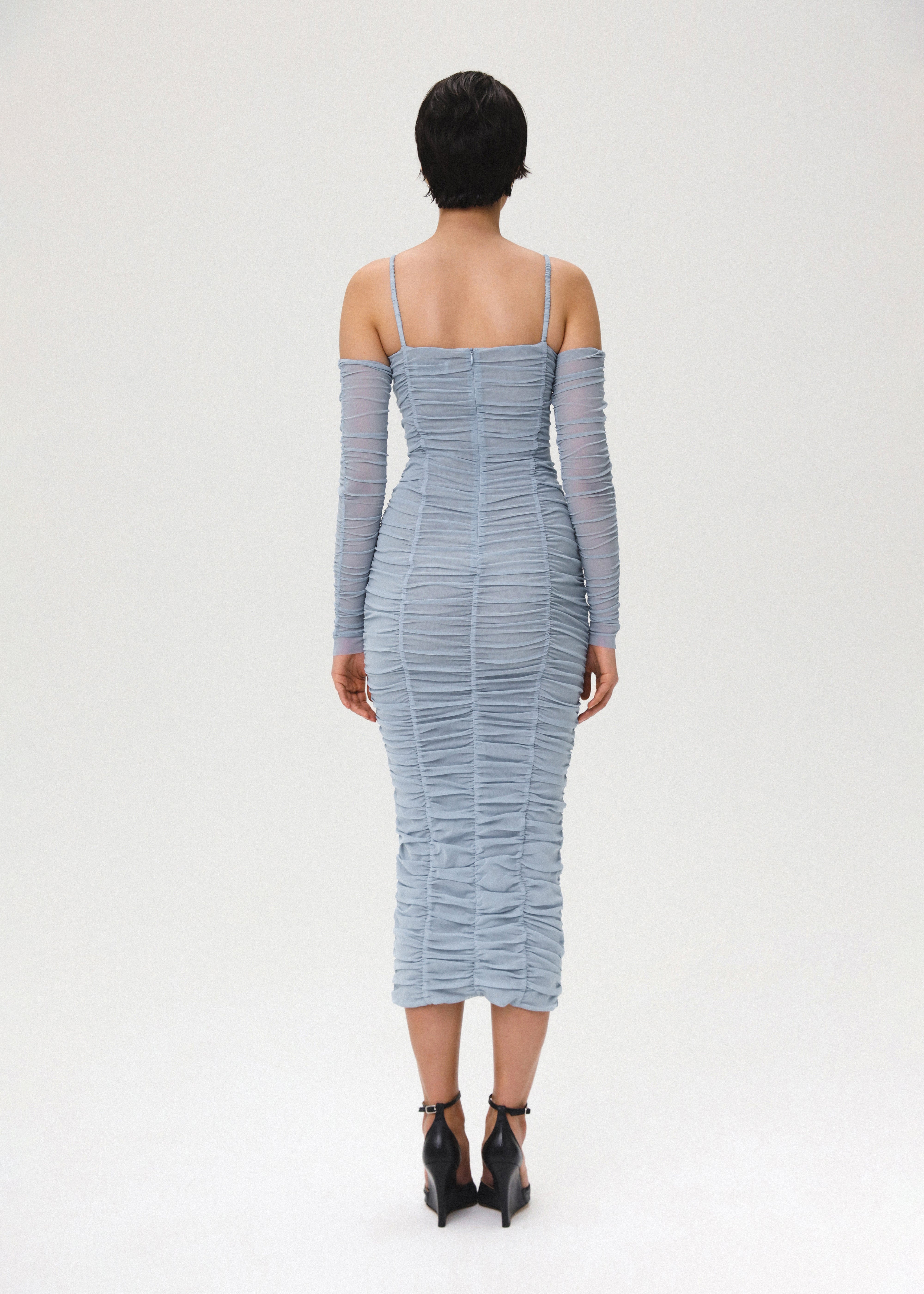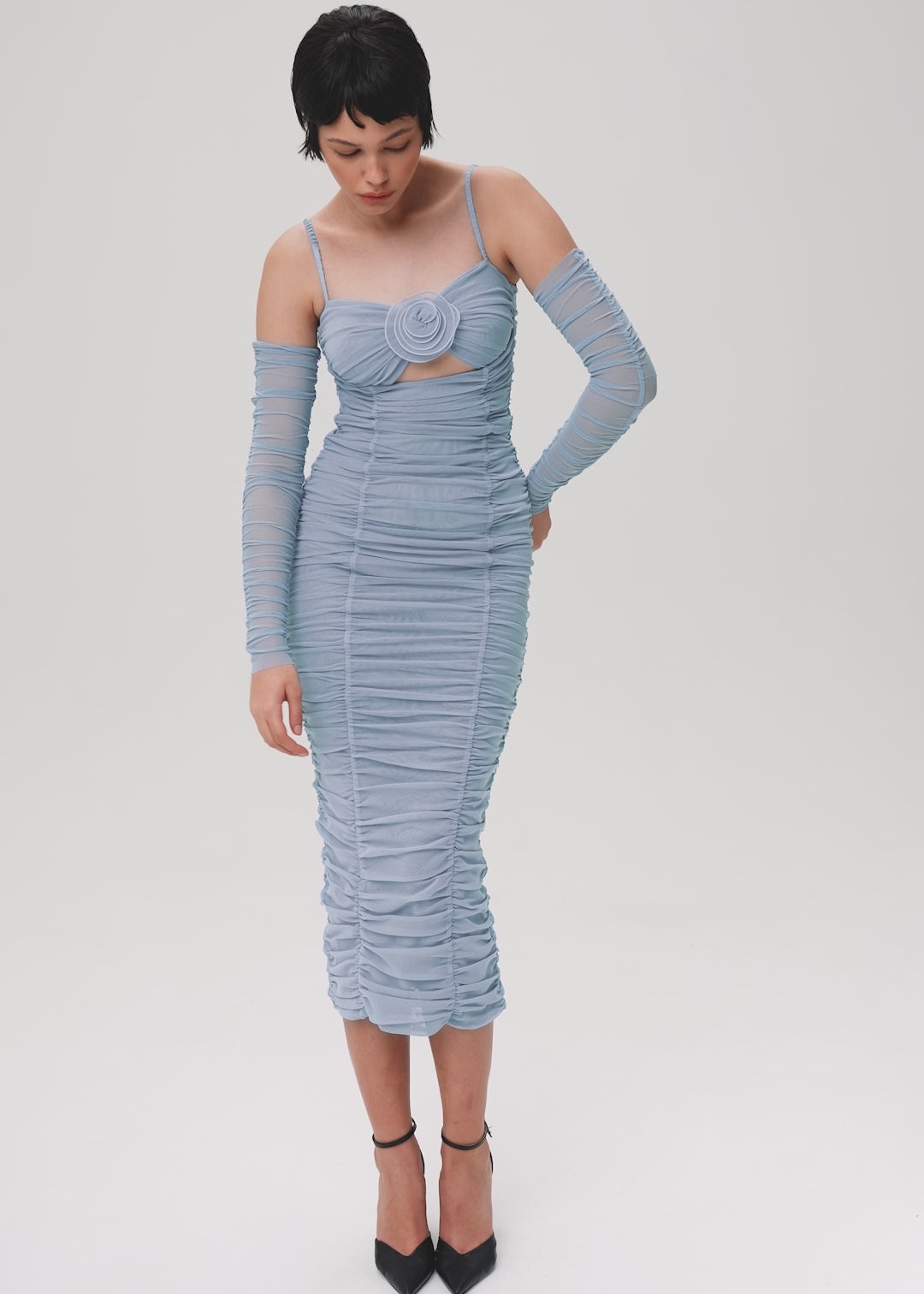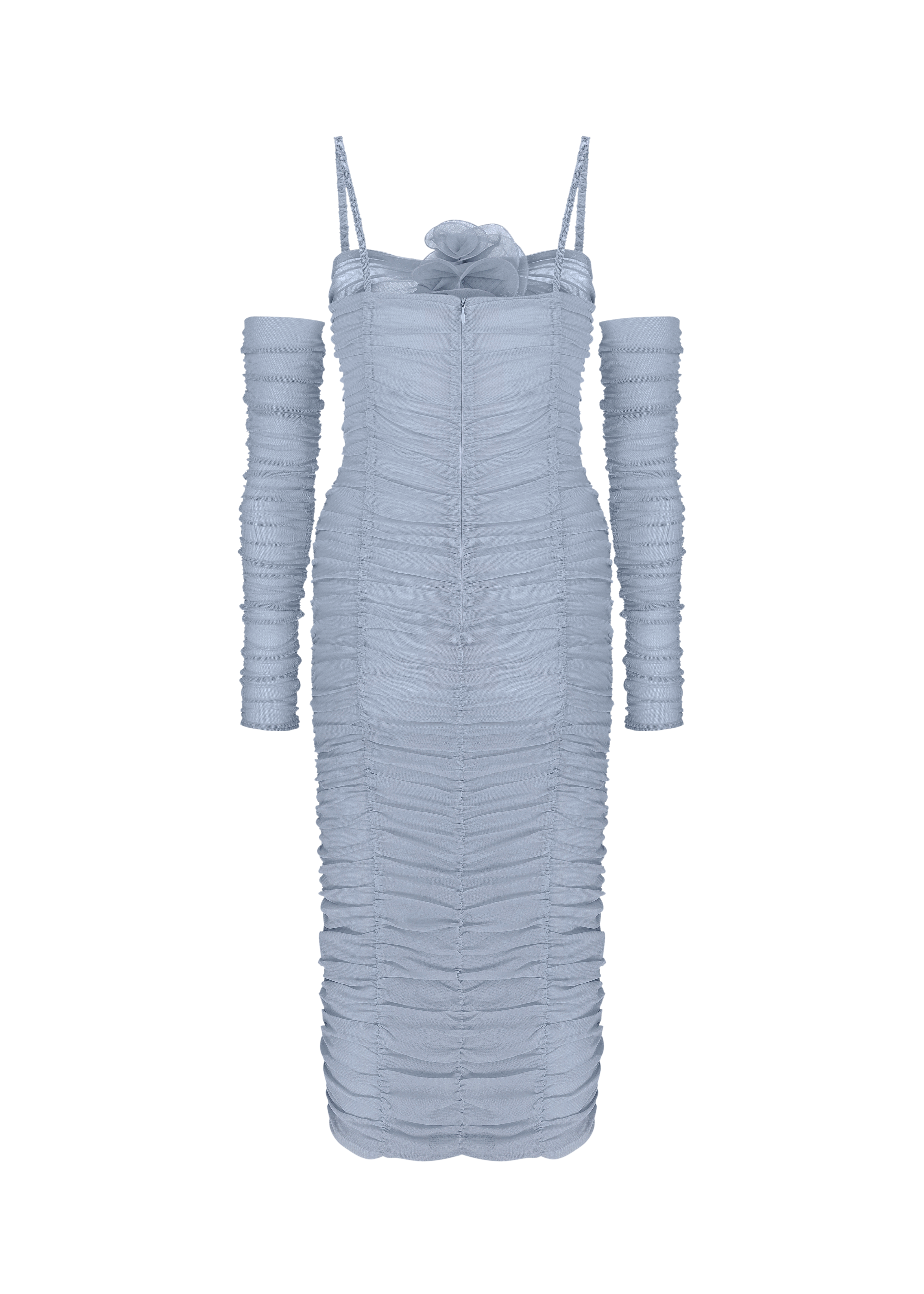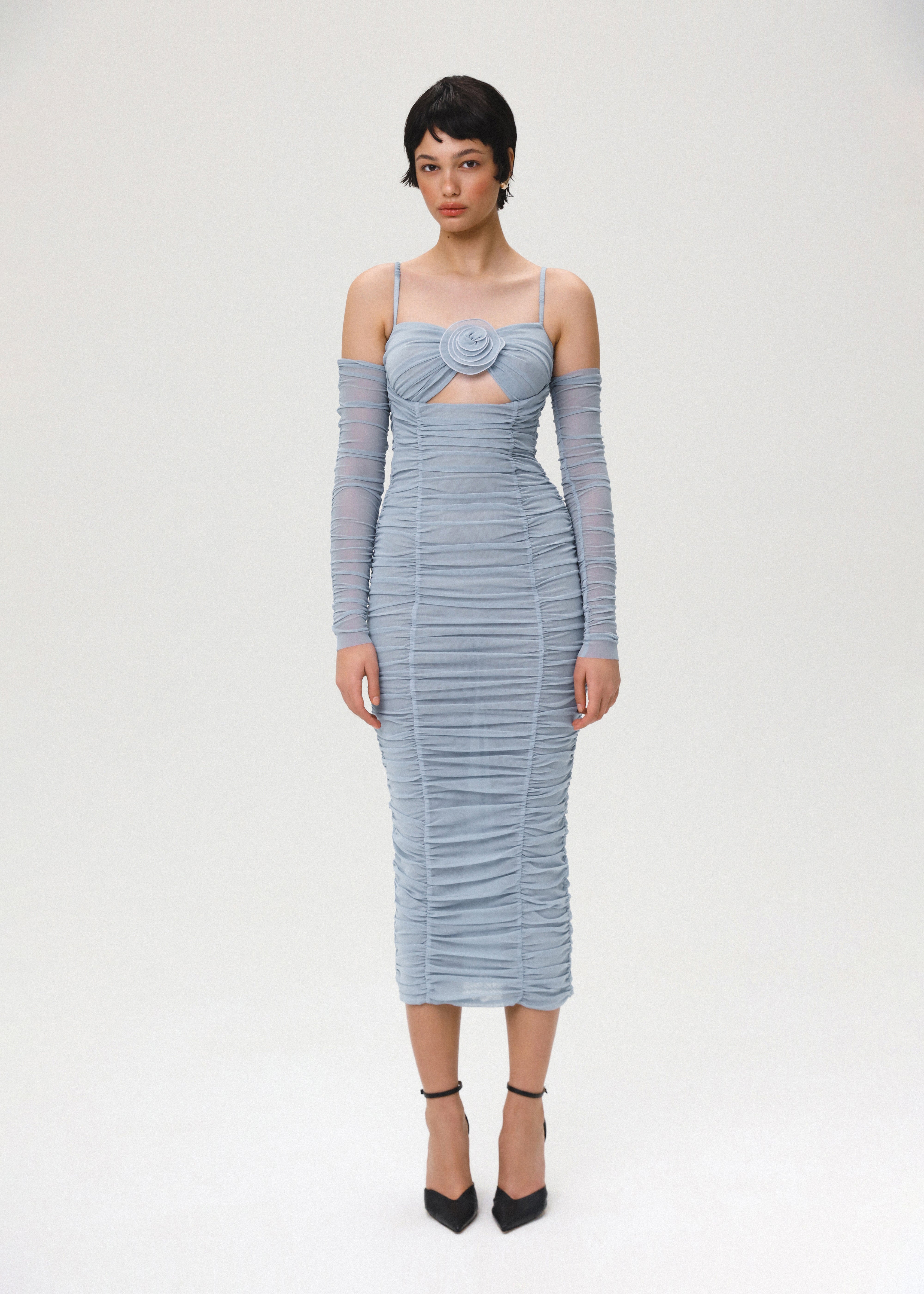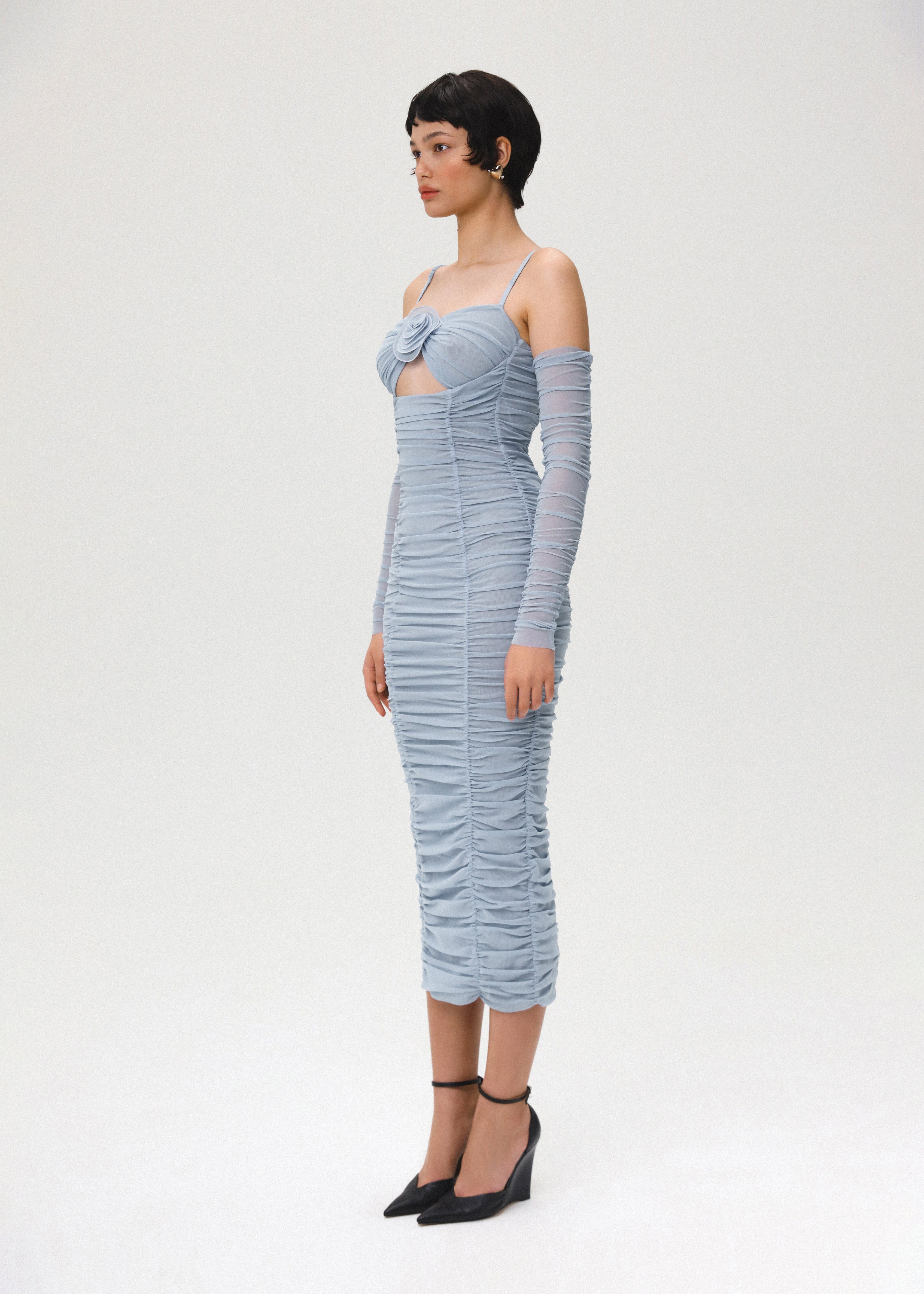 Flower bloom midi dress crafted from cool blue mesh fabric. The dress features elastic straps and ruching on two sides, ensuring a comfortable and confident fit with its stretchy fabric. The cutout detailing on the chest area, adorned with handcrafted 3D flower, adds a perfect touch of girlish charm. Fastened with a concealed back zipper and hook-and-eye closure.