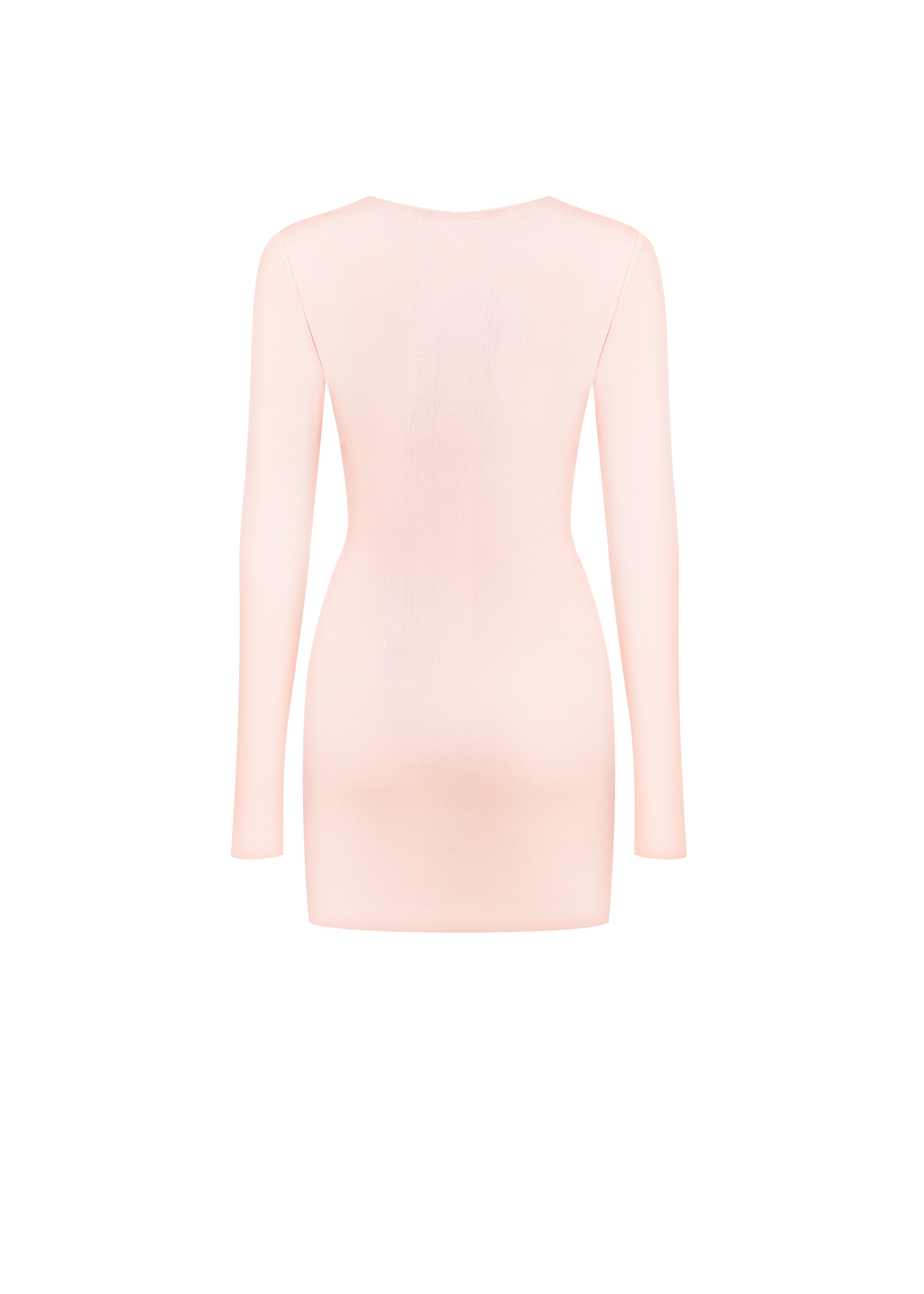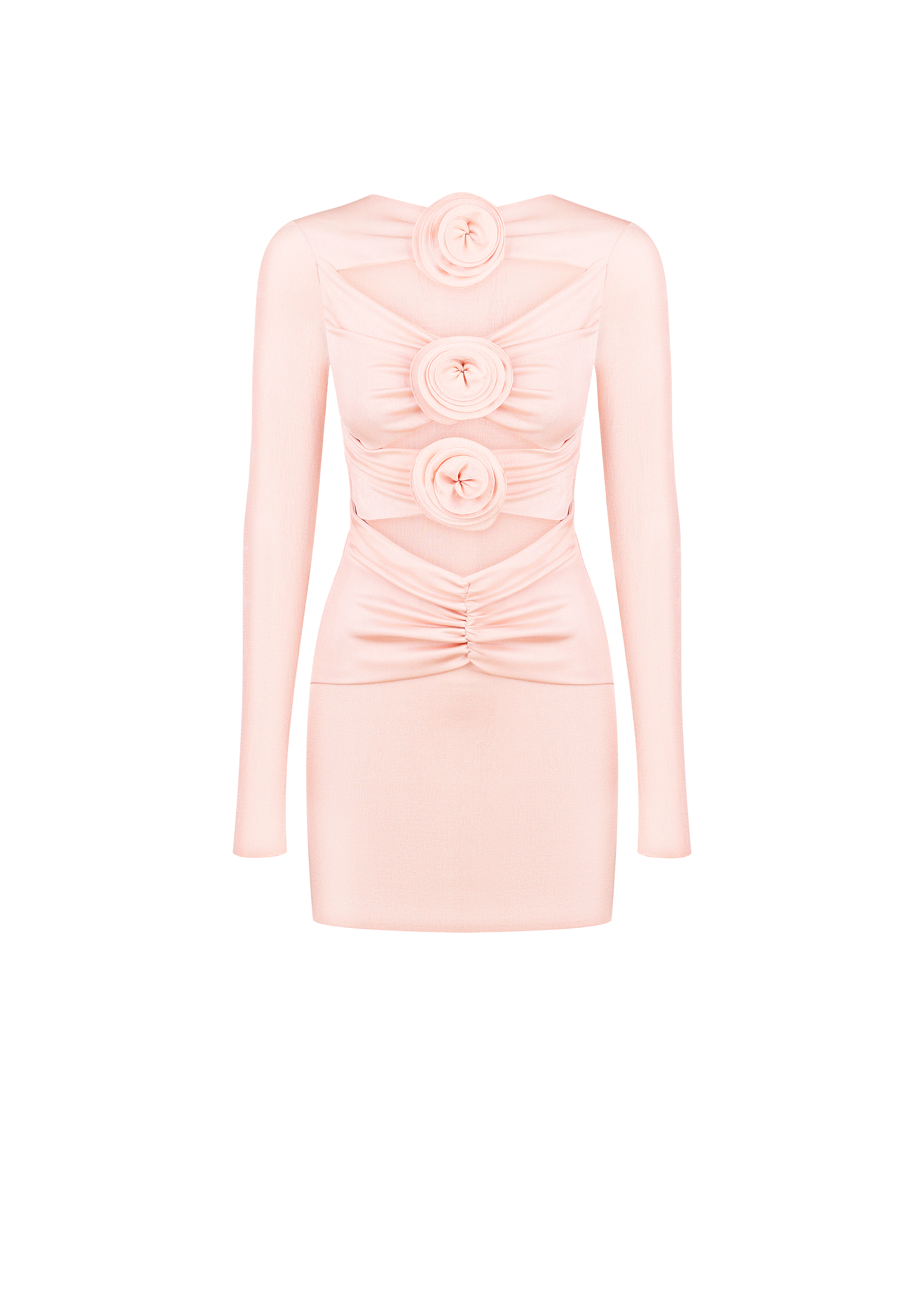 Crafted from delicate jersey fabric in champagne color, this fitted long-sleeve mini dress embodies both structure and allure. The strict crew neckline creates a striking contrast with the daring cutouts, each adorned with handcrafted flowers for a playful, eye-catching touch. Designed with stretchy fabric for a flawless fit, it ensures both comfort and confidence.