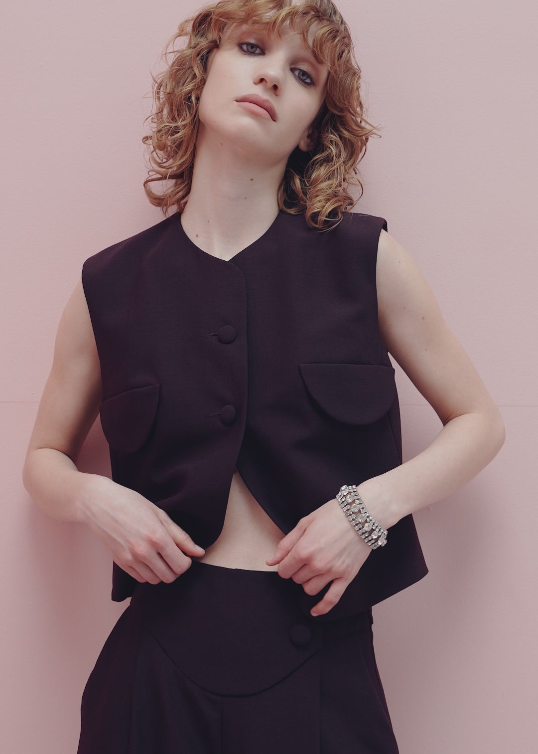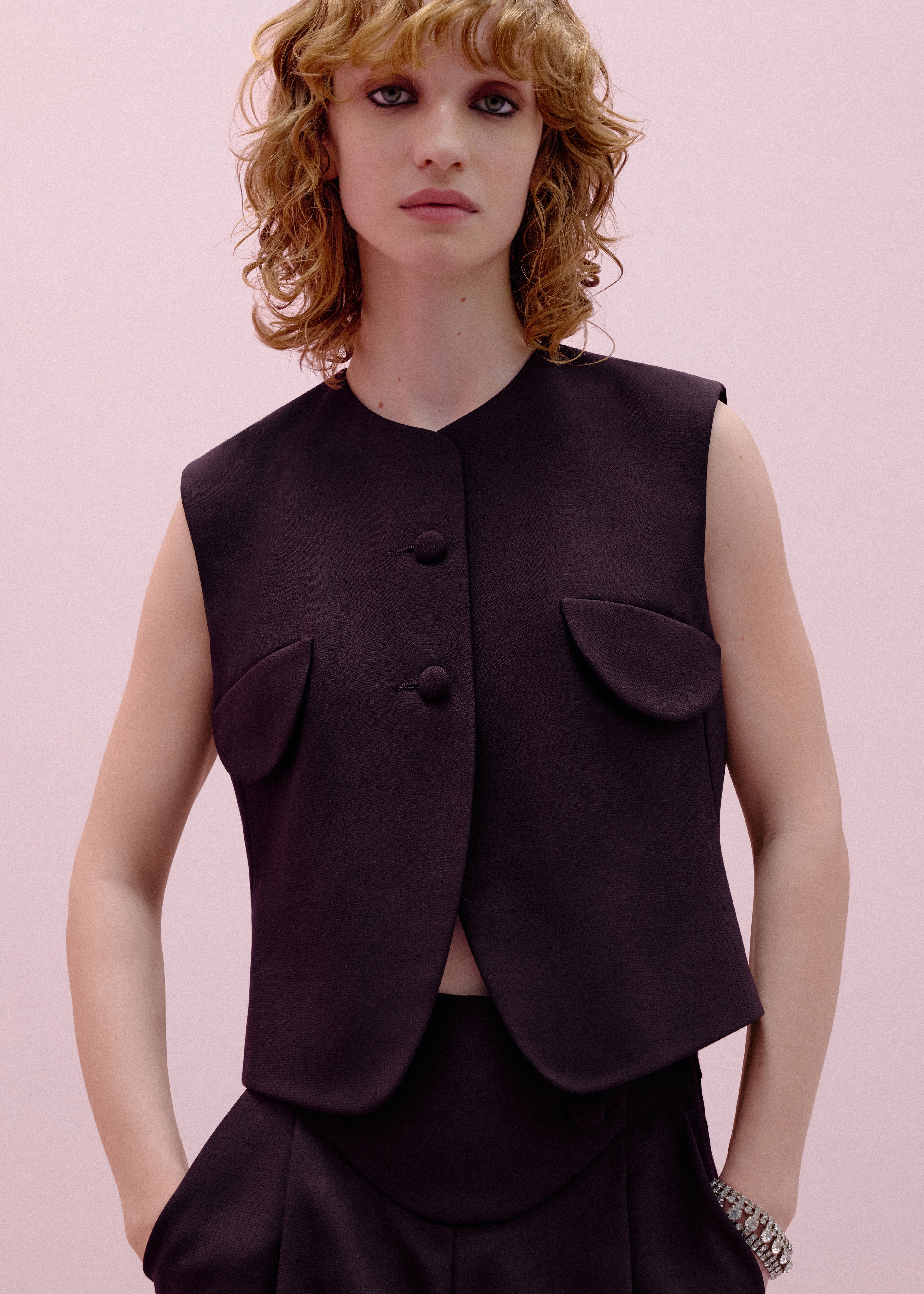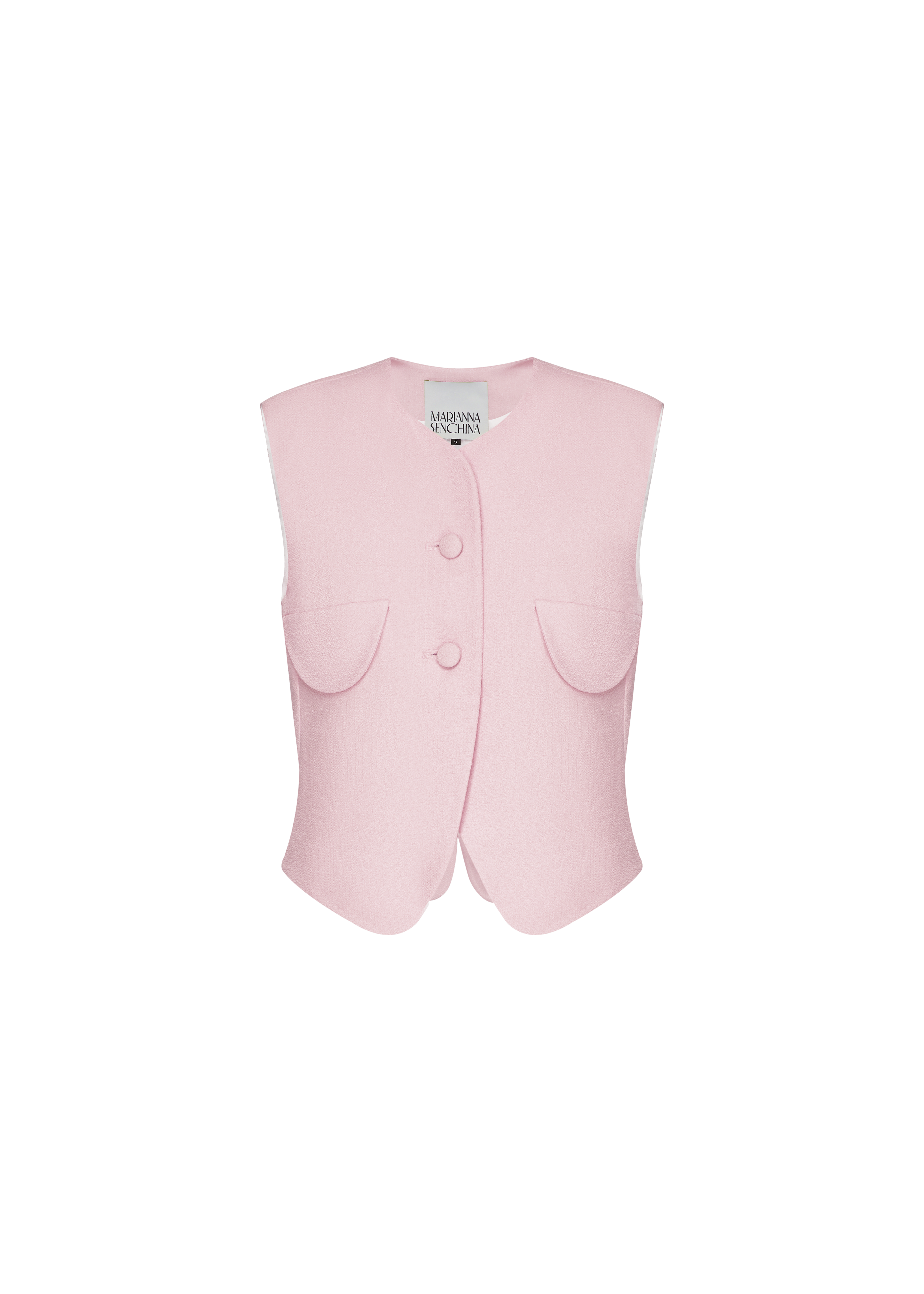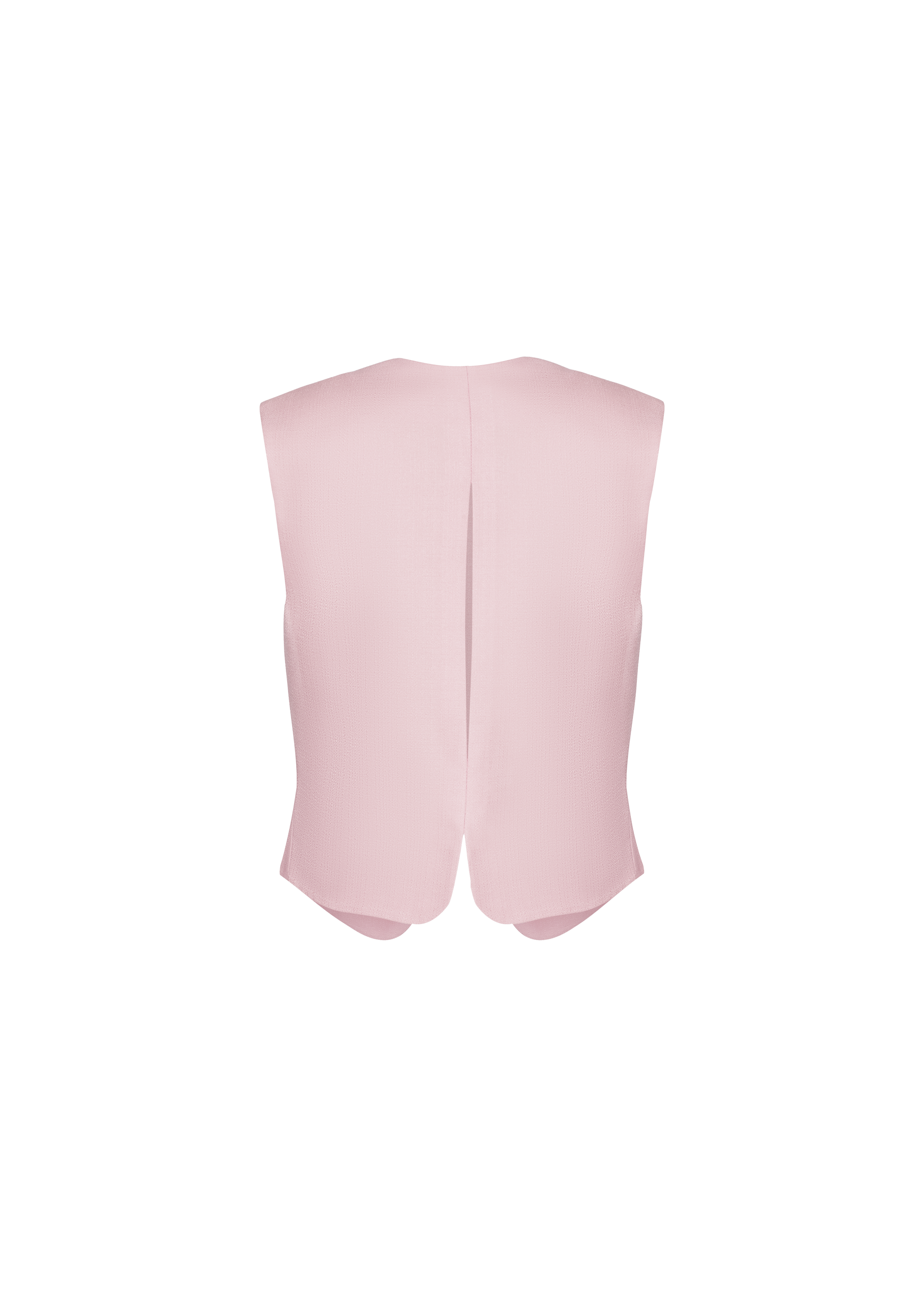 Linda vest in a baby pink color. This piece features a unique cut-out design on the back, adding a touch of intrigue to the overall look. The vest is fastened by two buttons, and includes imitation flaps at the front. The round neckline enhances the sleek and modern aesthetic of the vest. Designed for both comfort and style, this vest is fully lined.