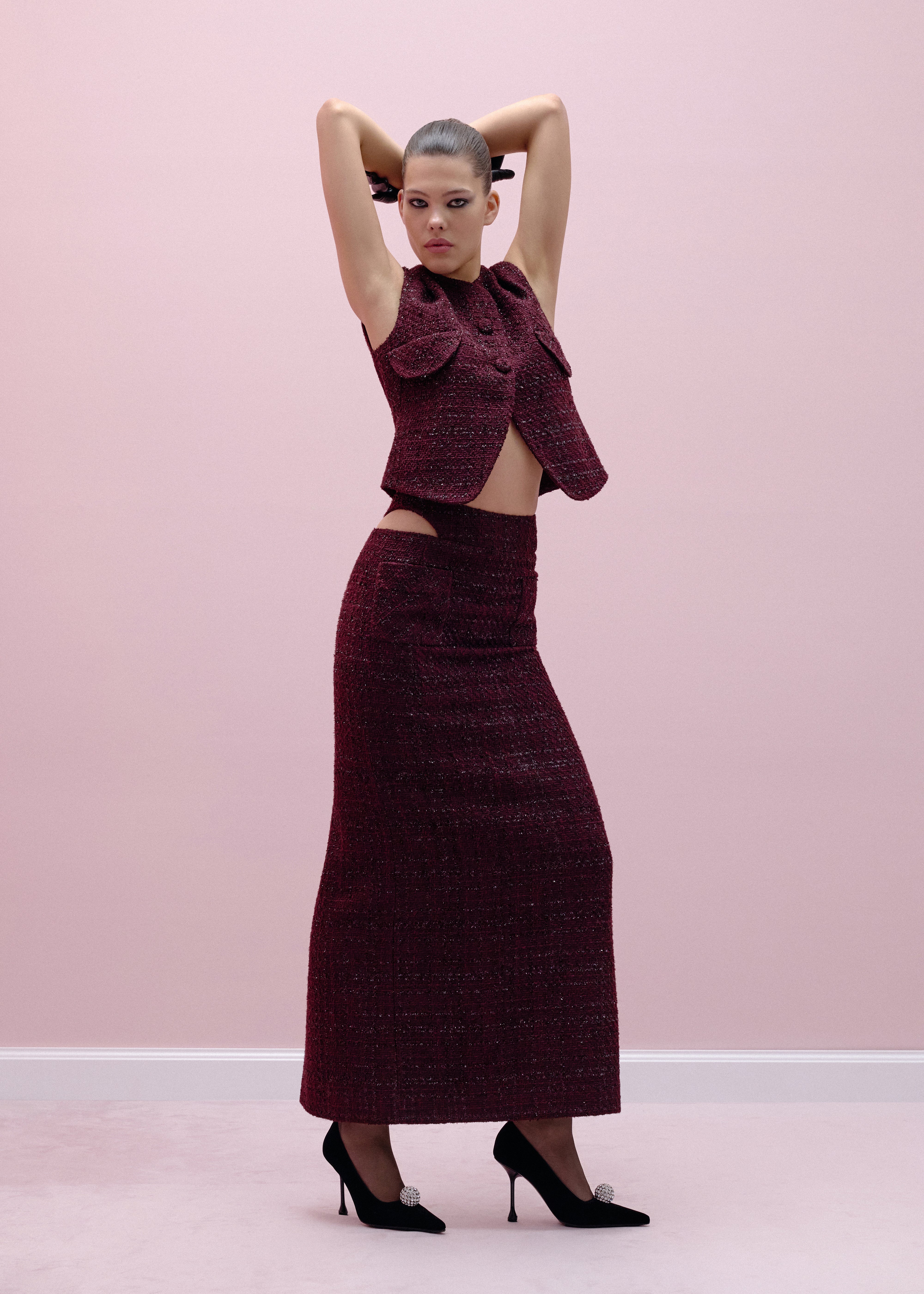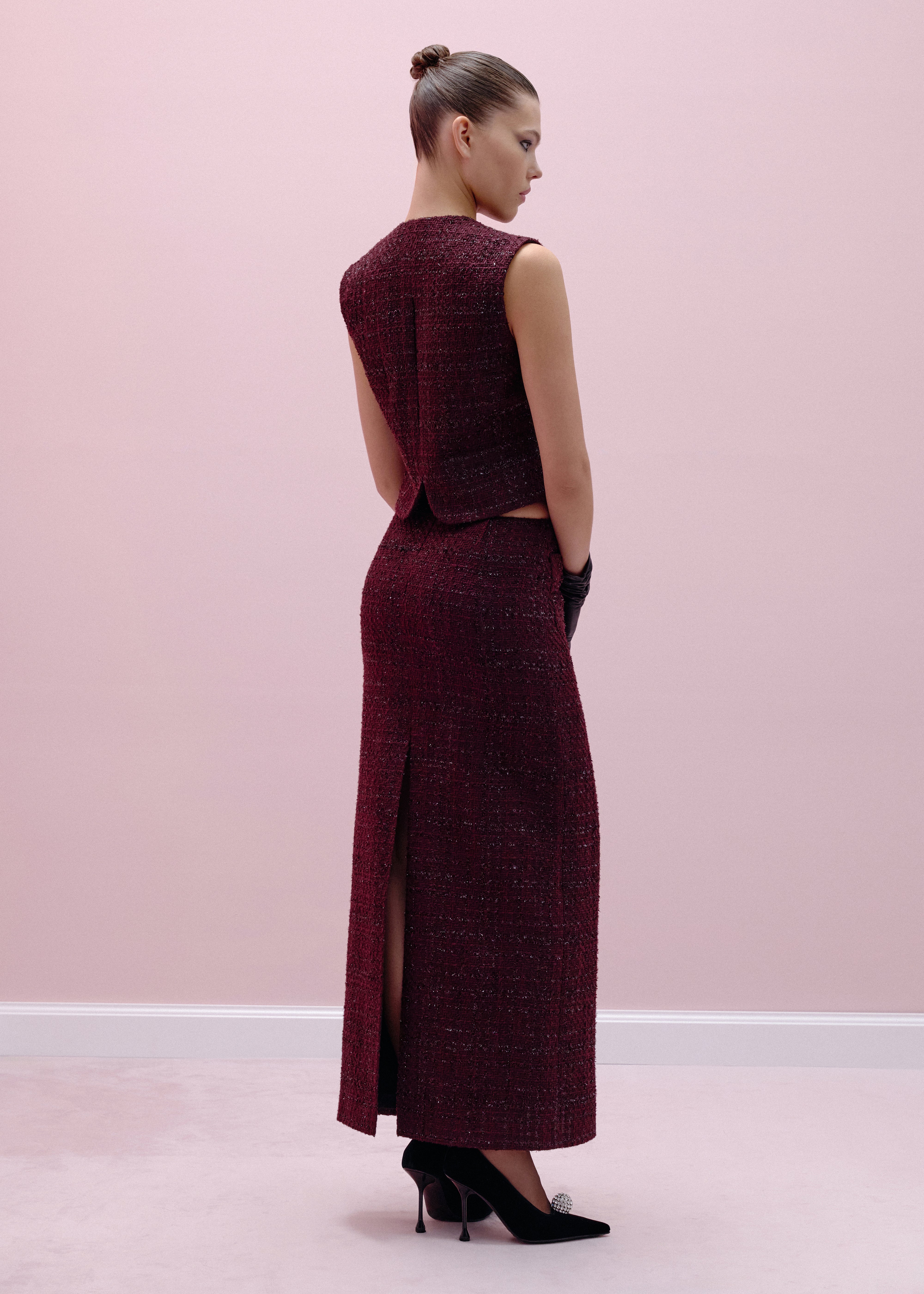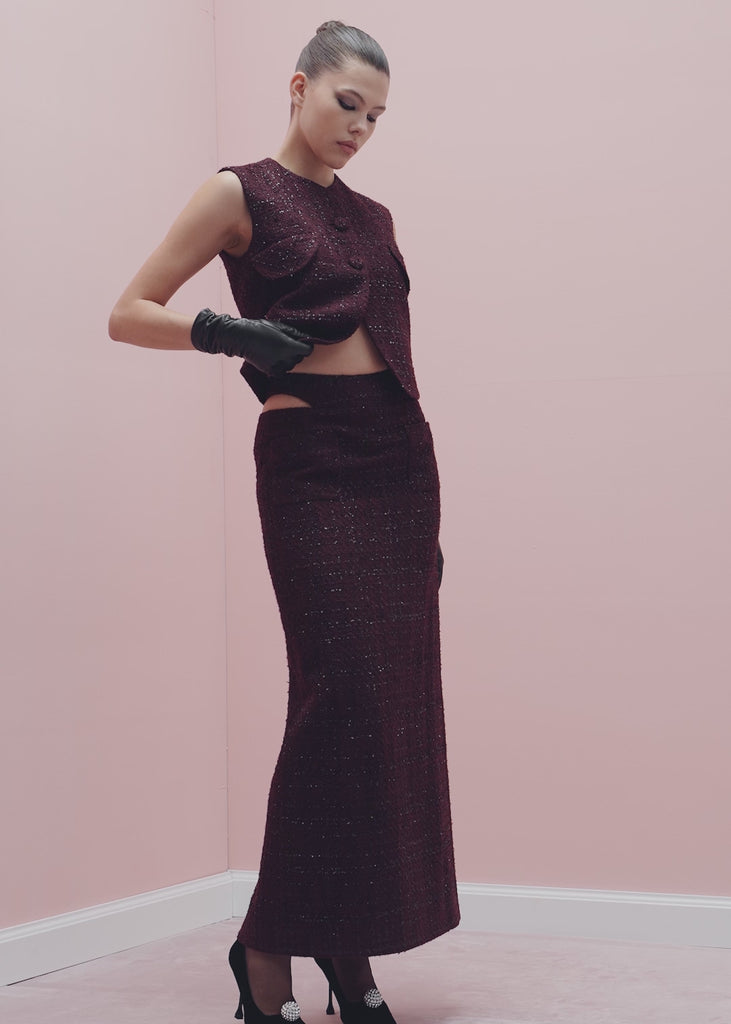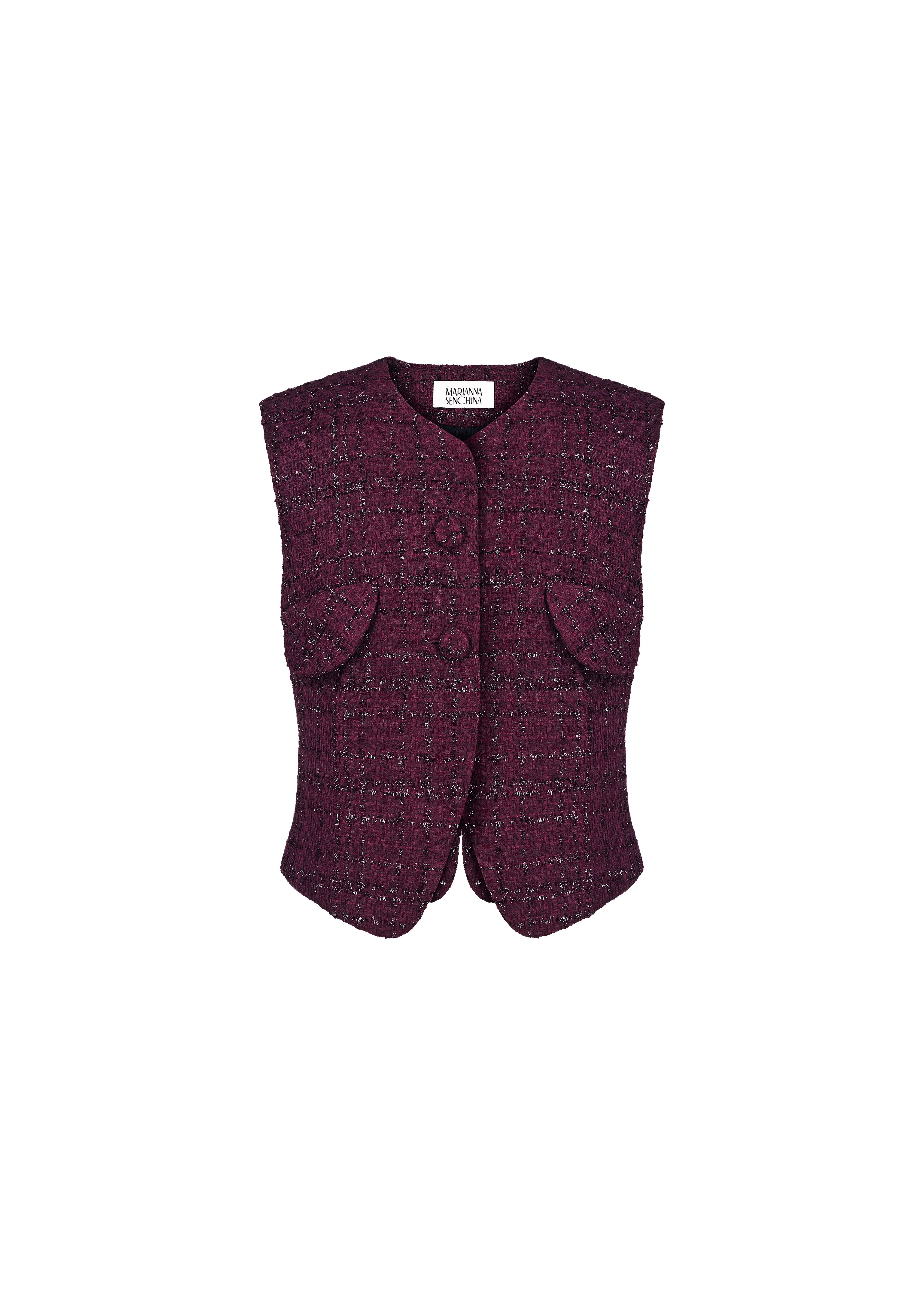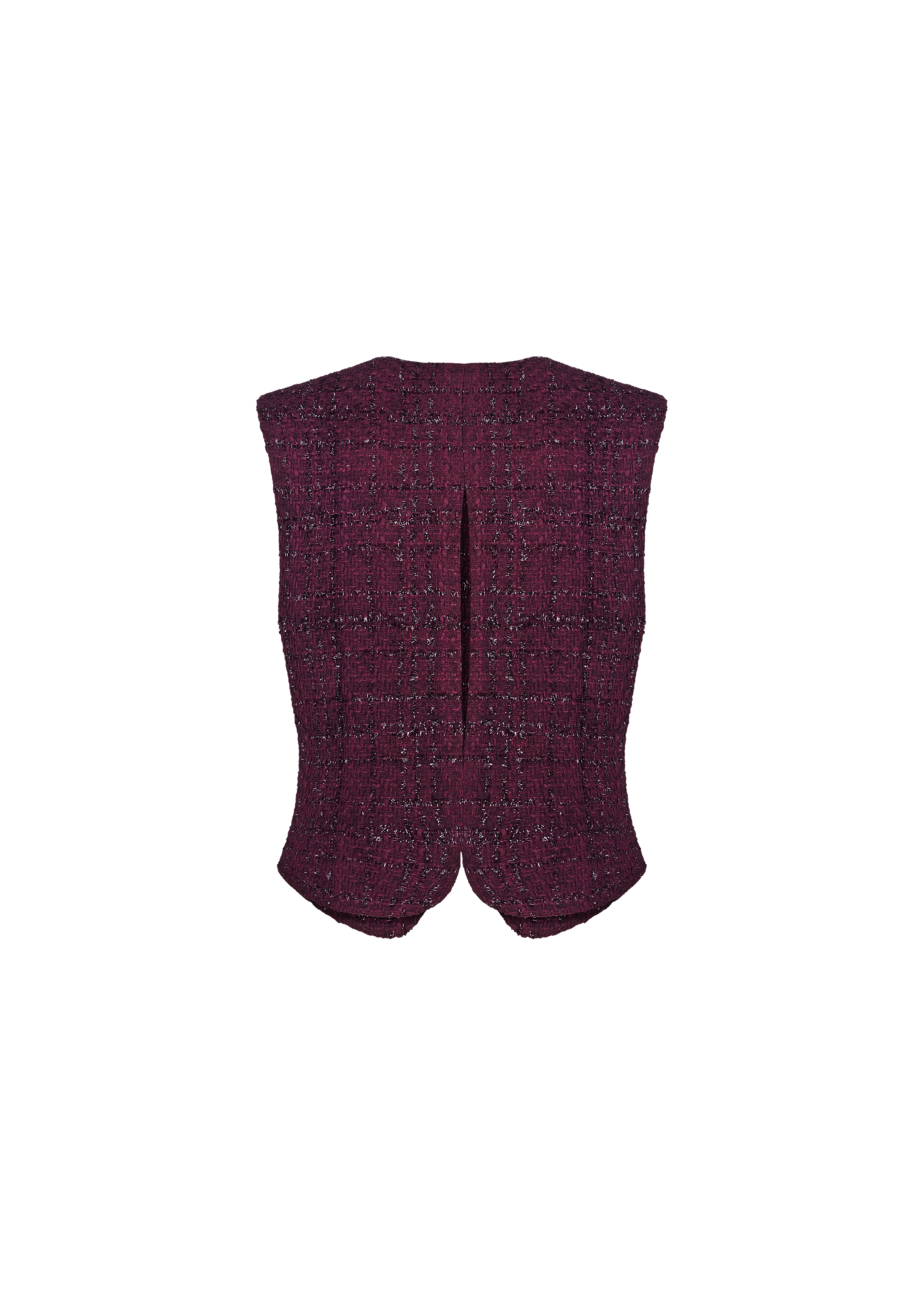 Linda vest crafted from tweed with lurex in mulberry color. This piece features a unique cut-out design on the back, adding a touch of intrigue to the overall look. The vest is fastened by two buttons, and includes imitation flaps at the front. The round neckline enhances the sleek and modern aesthetic of the vest. Designed for both comfort and style, this vest is fully lined.