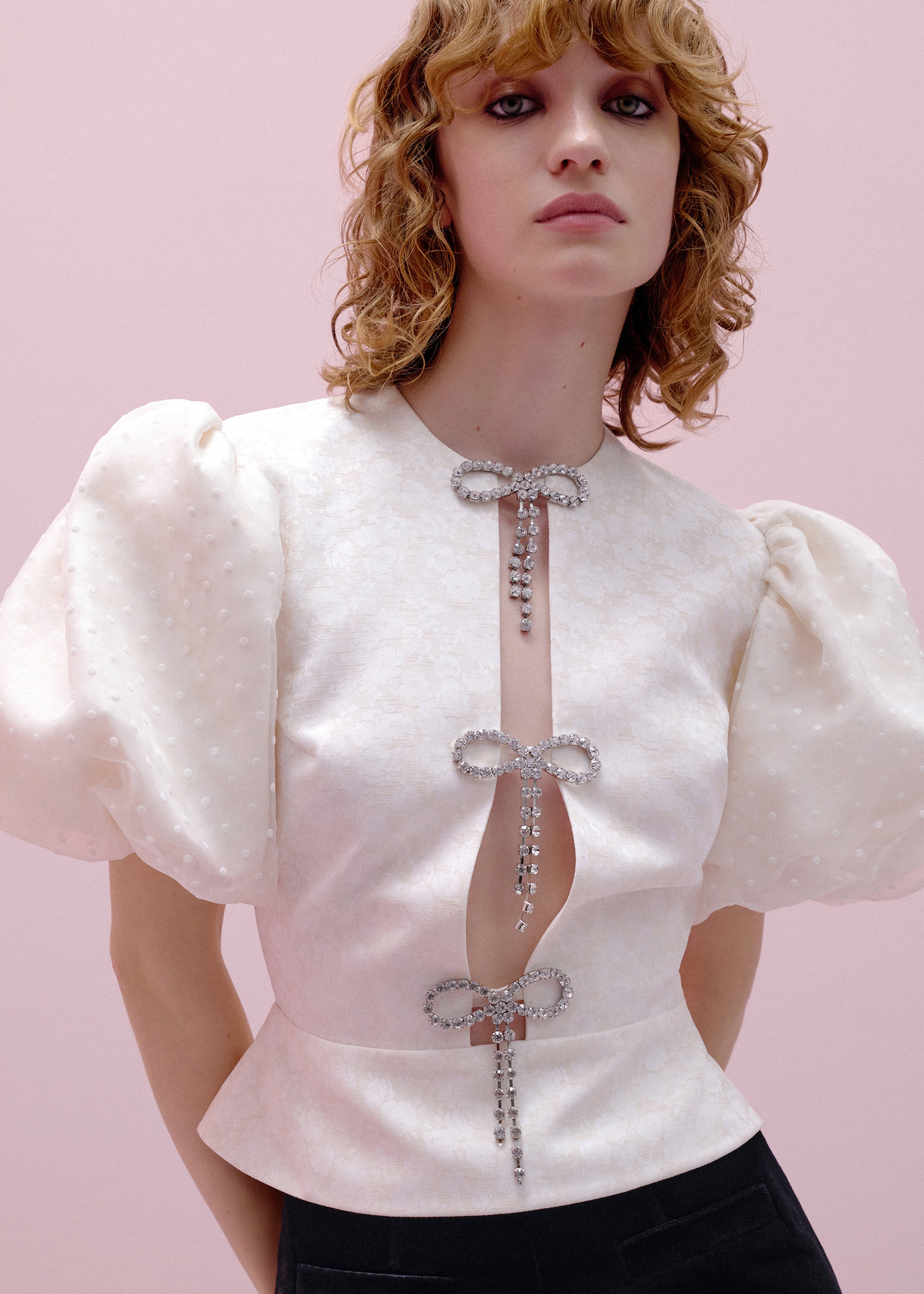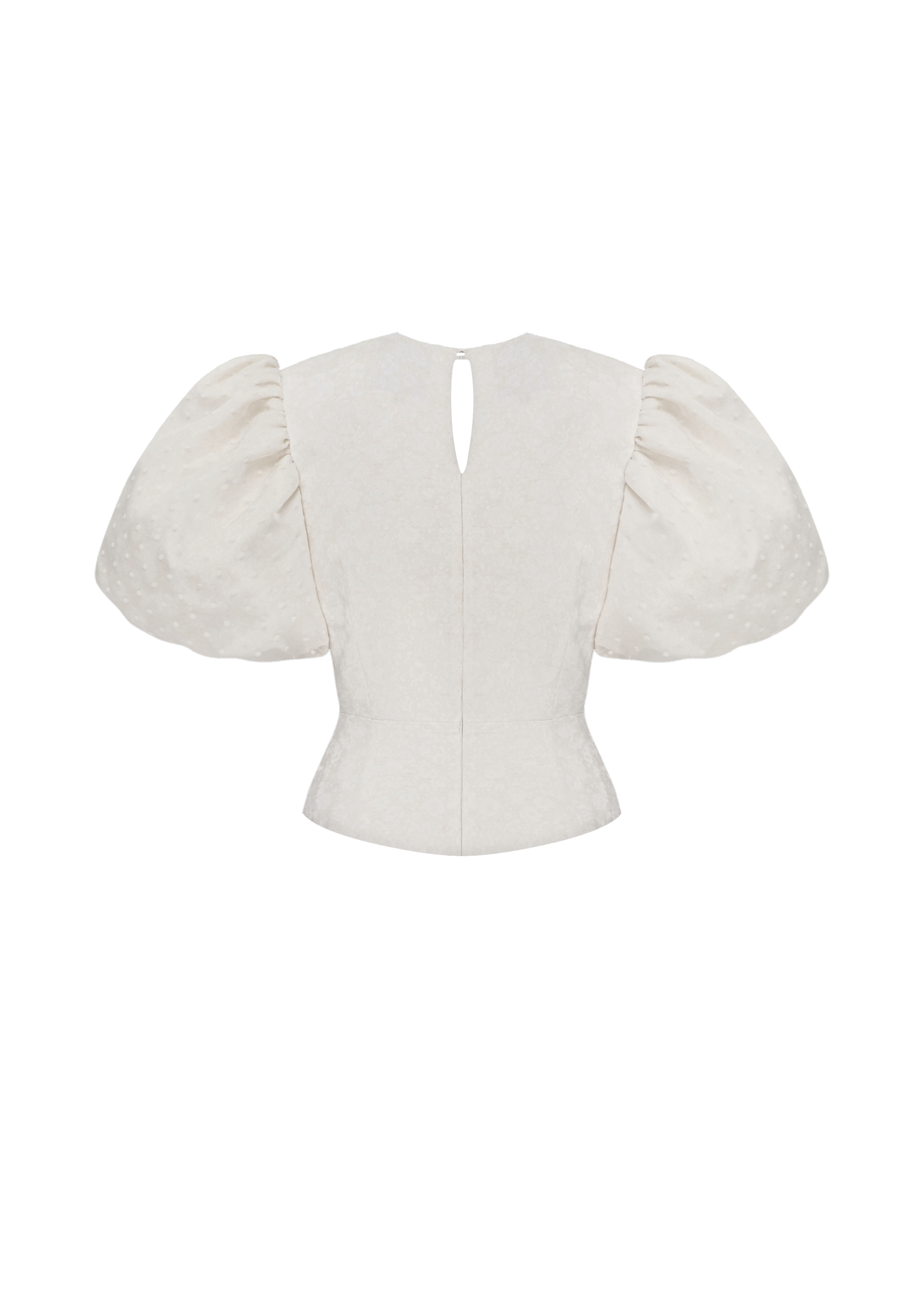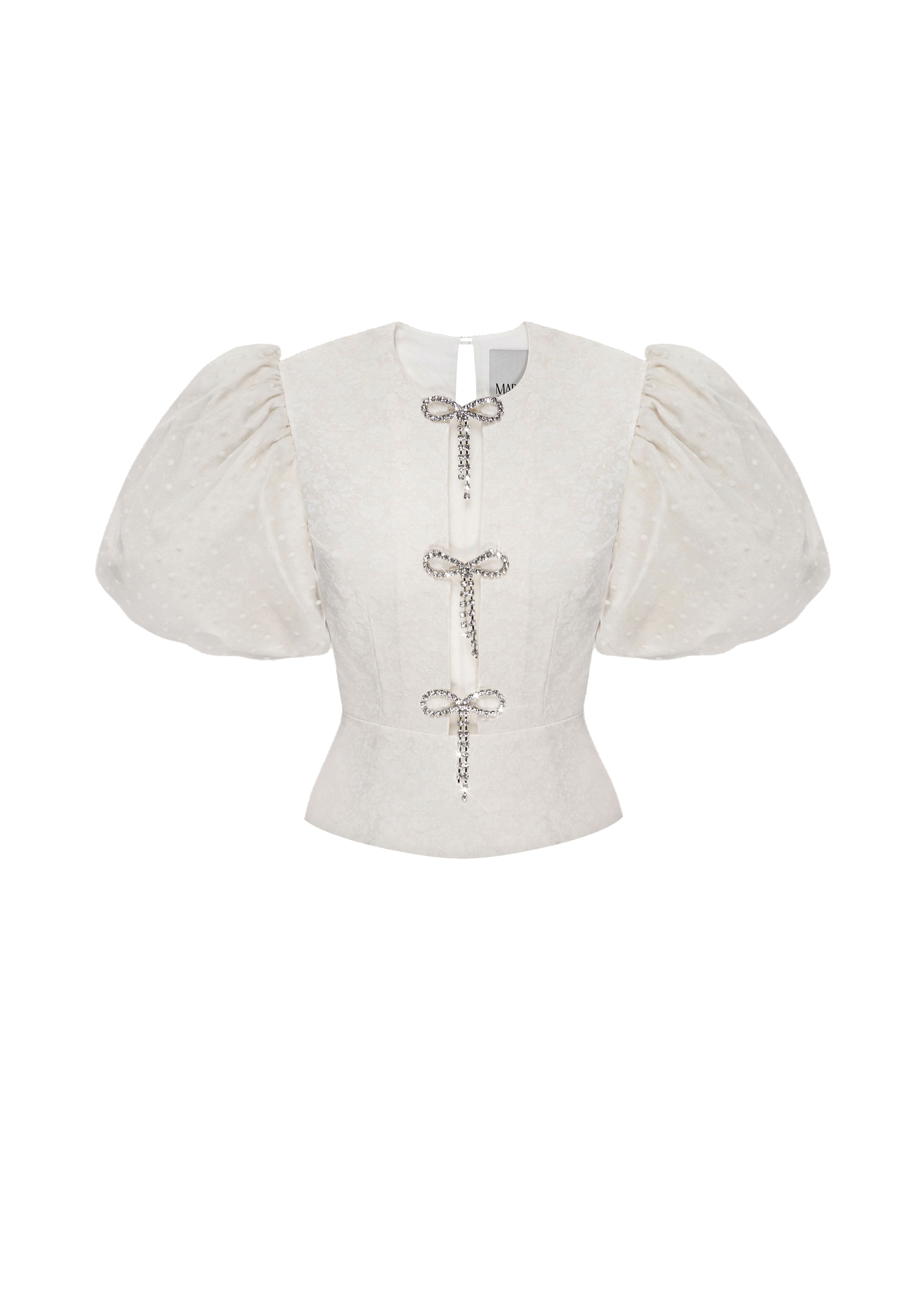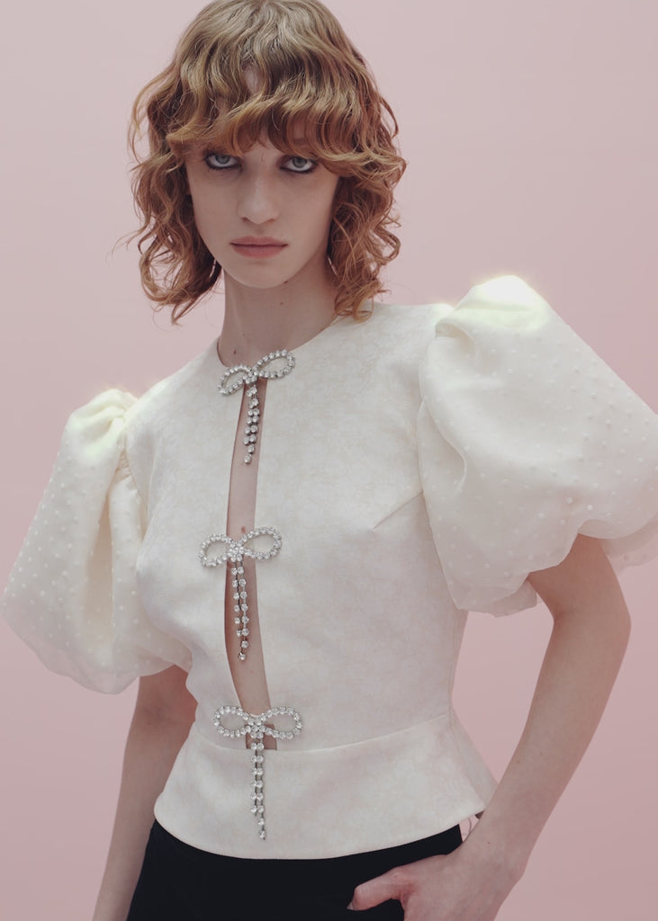 Meringue top crafted from floral print ivory color fabric. The top also boasts organza buff sleeves in flocked white polka dots, providing a subtle texture that adds depth to the design. Slightly fitted with a basque at the waist, it accentuates curves and emphasizes a flattering shape. A standout feature is the elegant cutout on the abdomen, adorned with mini sparkling bows and rhinestones, adding a touch of sophistication. The top is secured with an invisible side zipper and a button at the back, and is fully lined.
