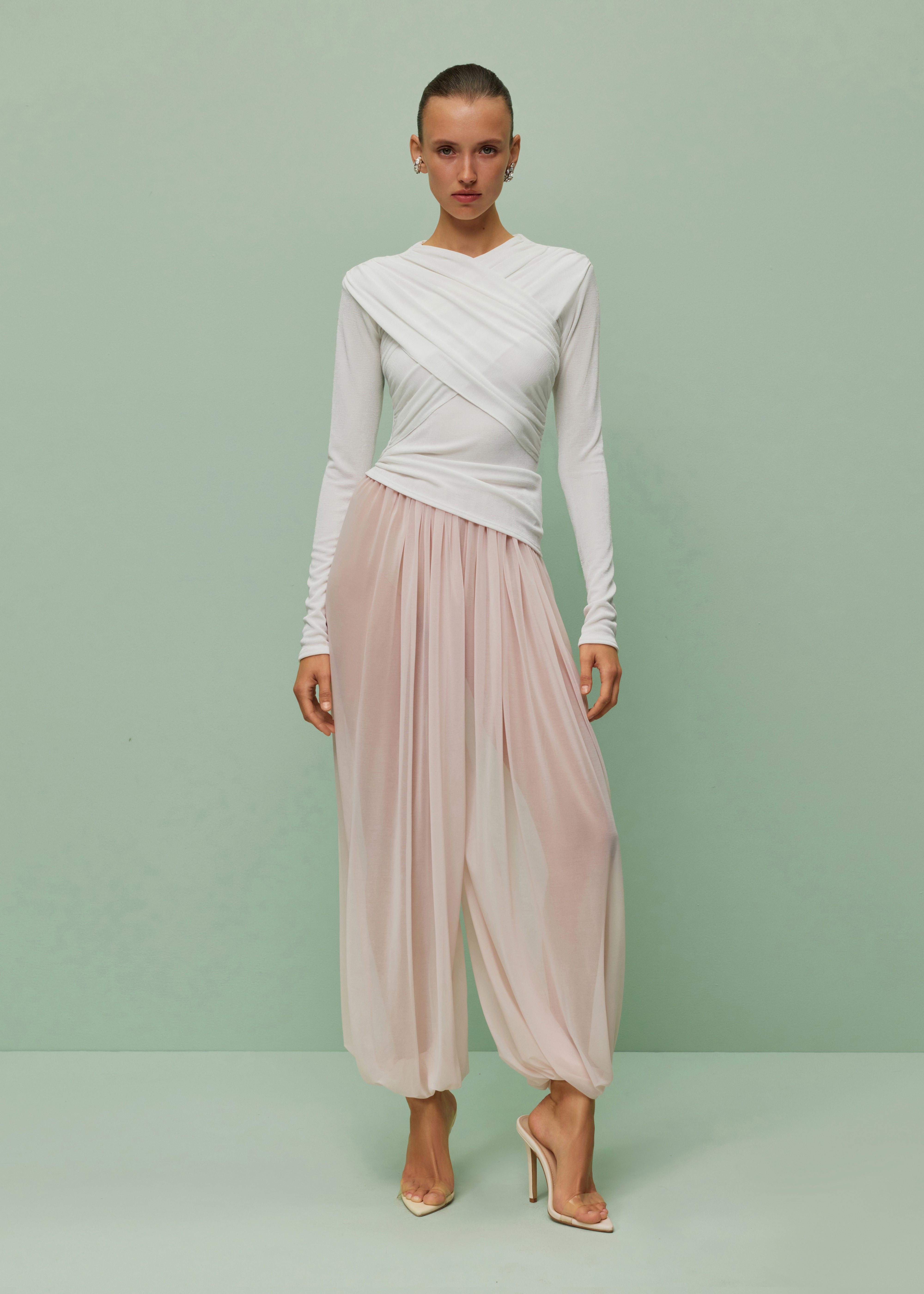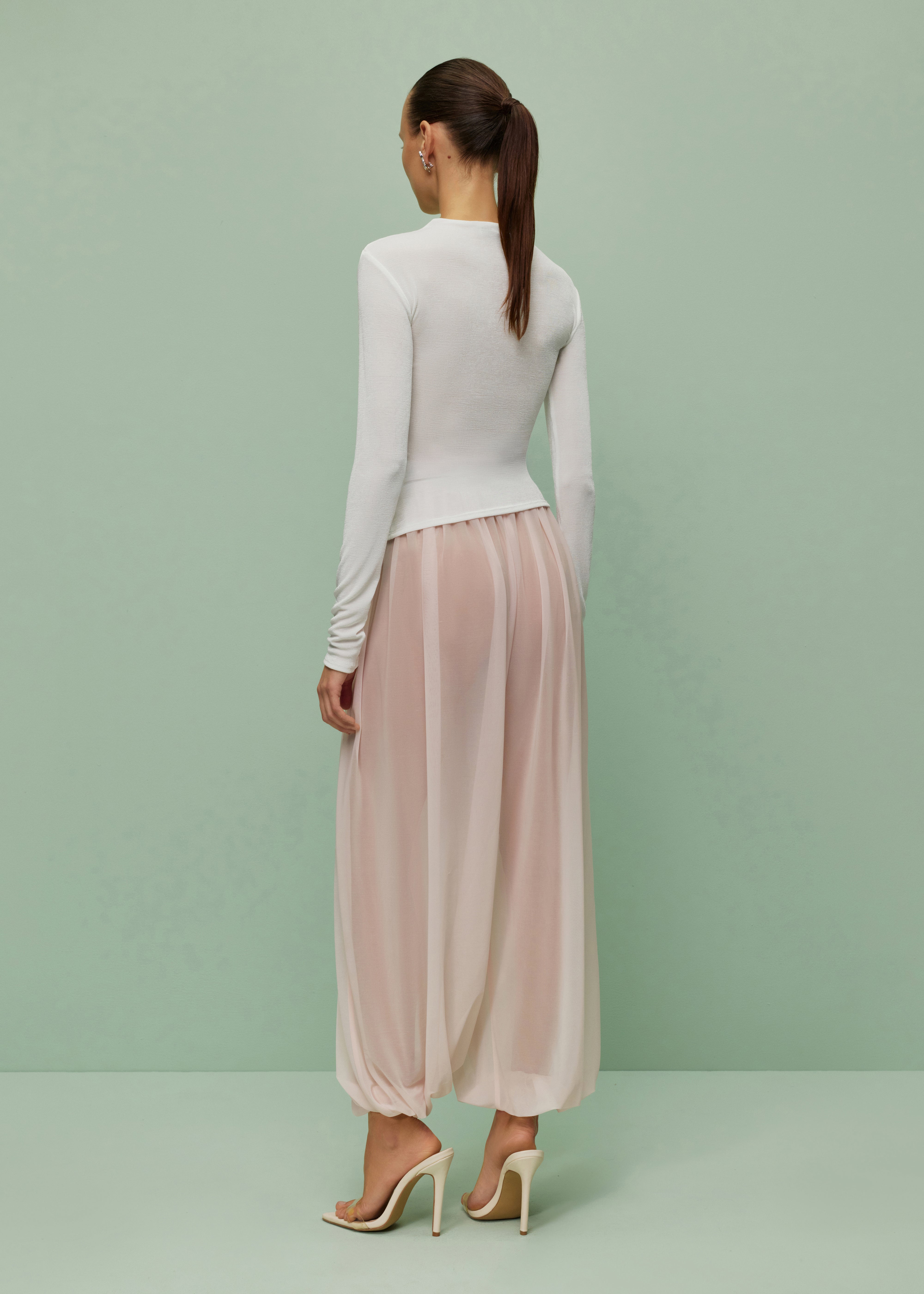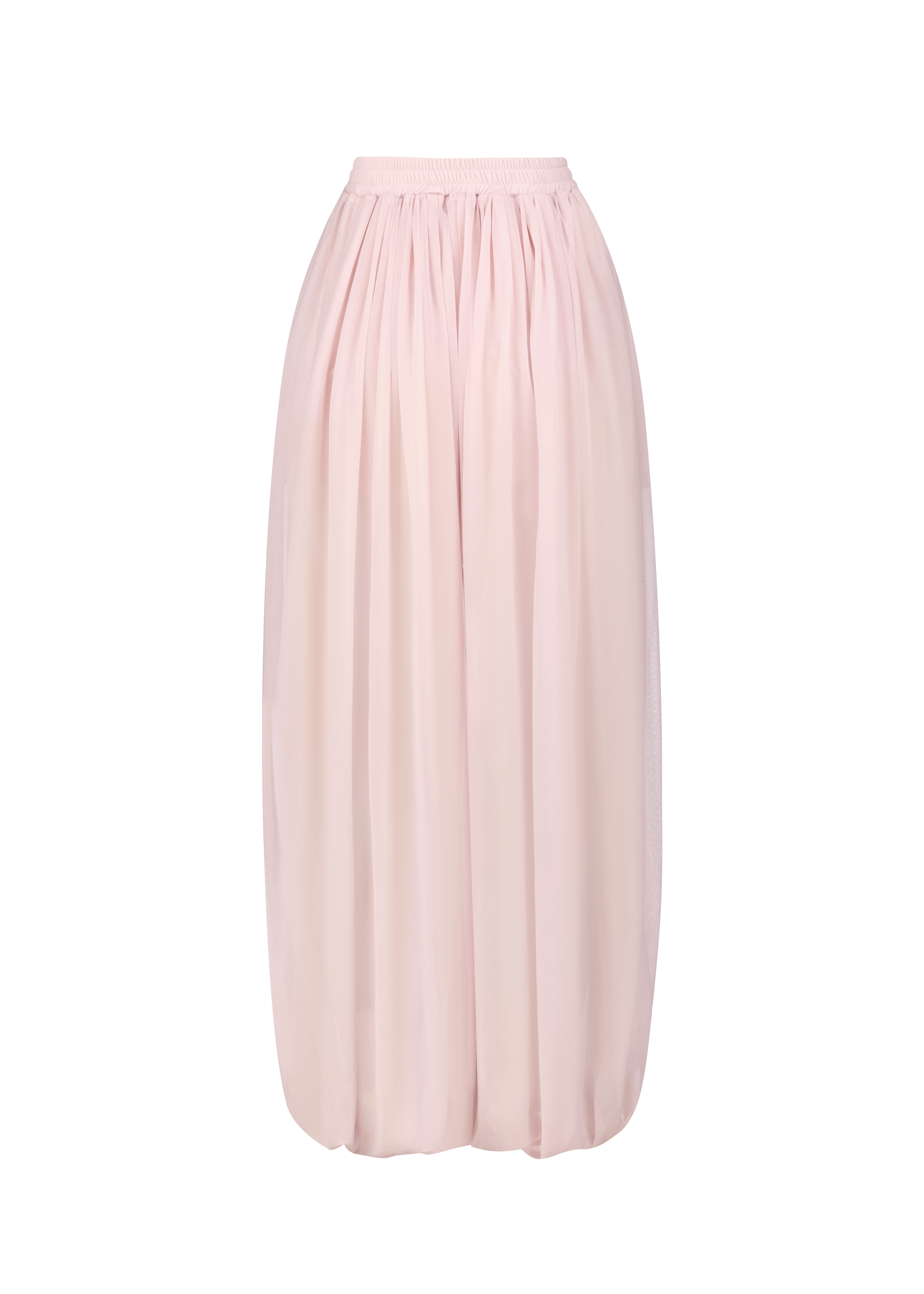 Beautifuly draped harem pants with an elastic waistband and gathered hems. Crafted in sheer lighrweight primrose pink fabric.