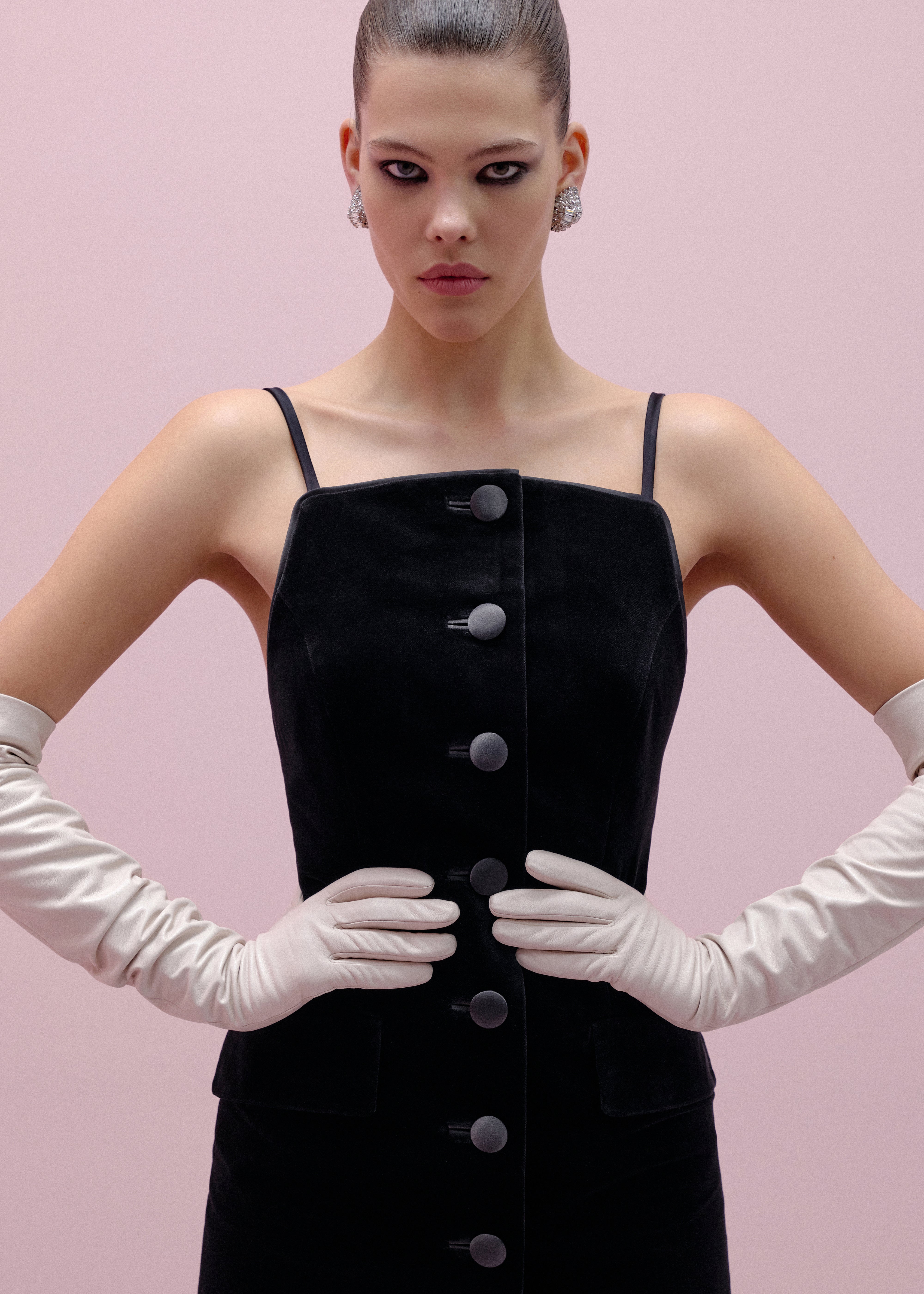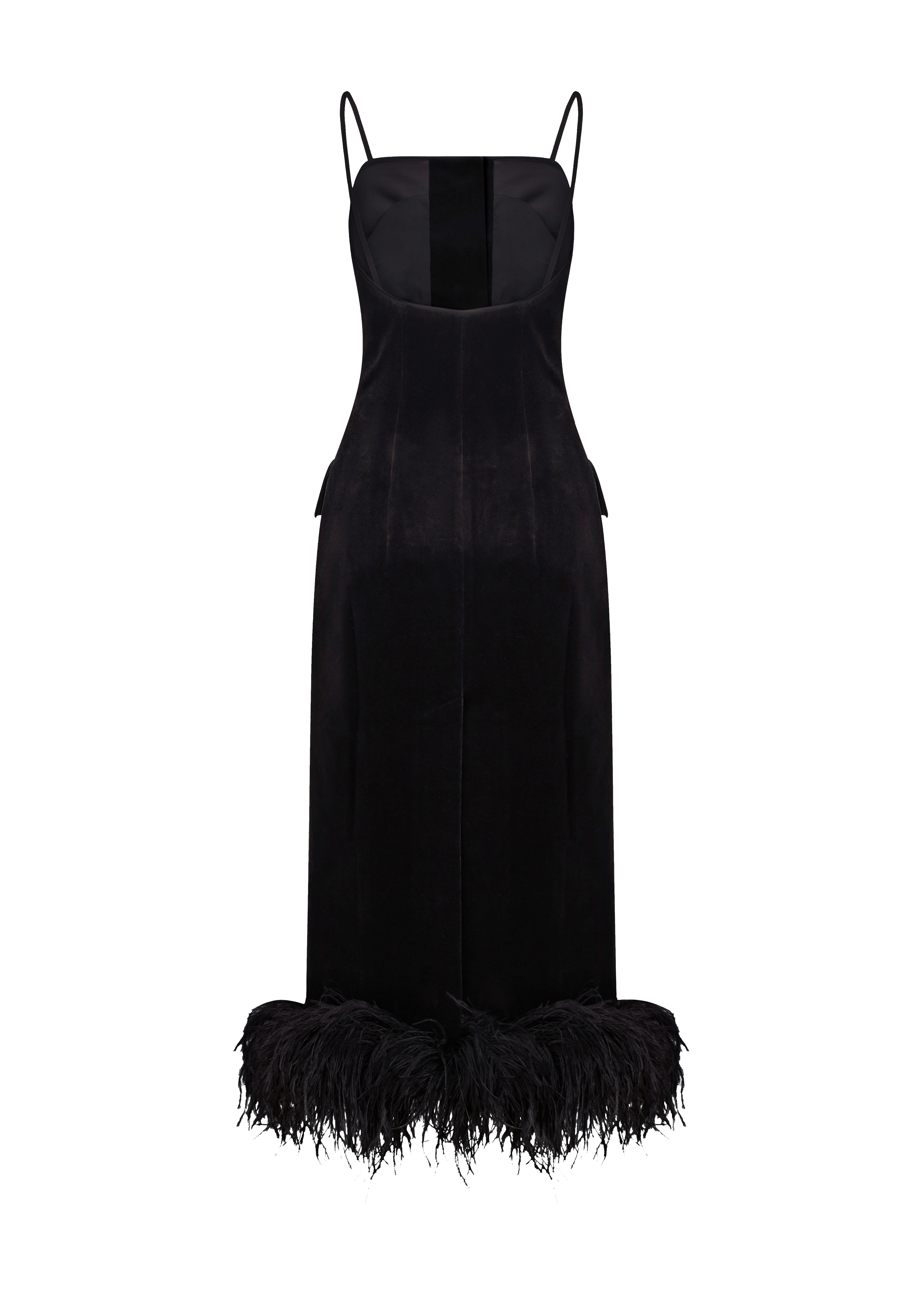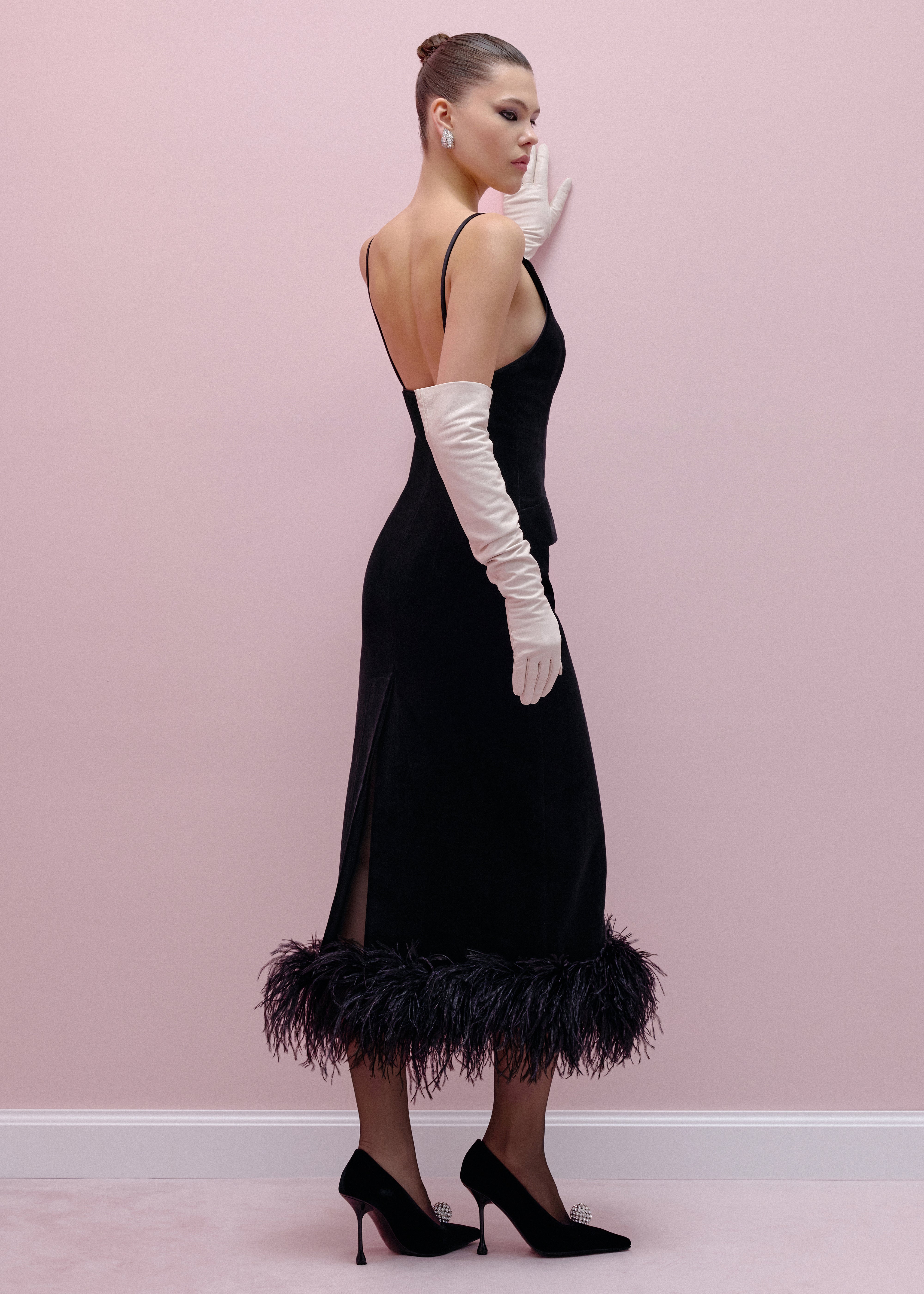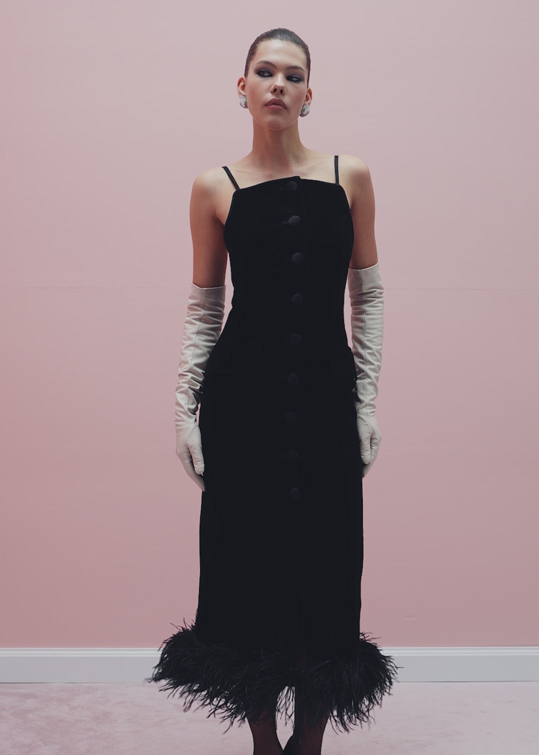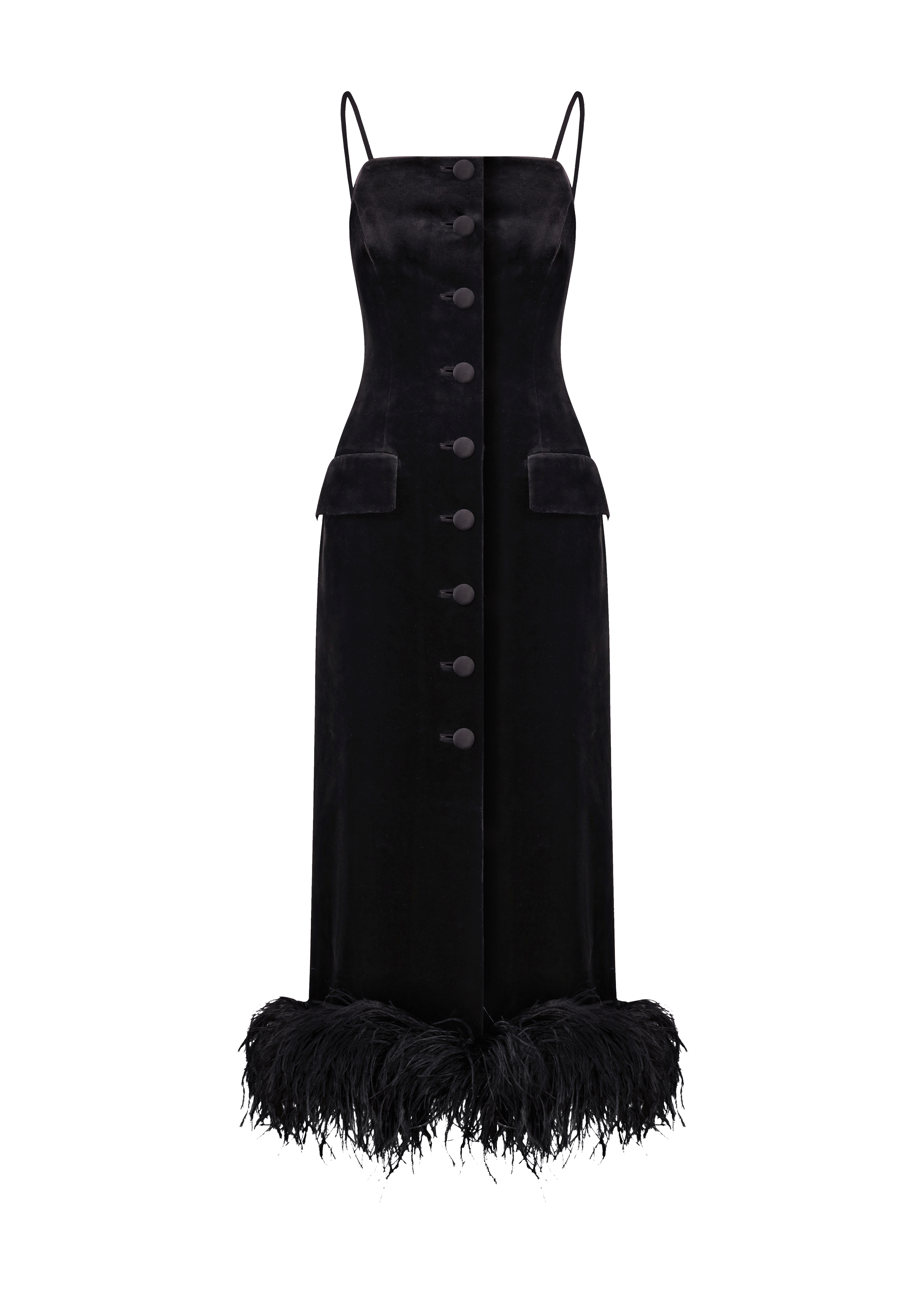 Meticulously crafted from black velvet, this exquisite open-shoulder midi jacket dress features a dramatic ostrich trim and is elegantly fastened with sleek black satin buttons, adding a touch of refinement to the design. Decorative velvet flaps on the waist enhance the overall charm of the dress. Fully lined.