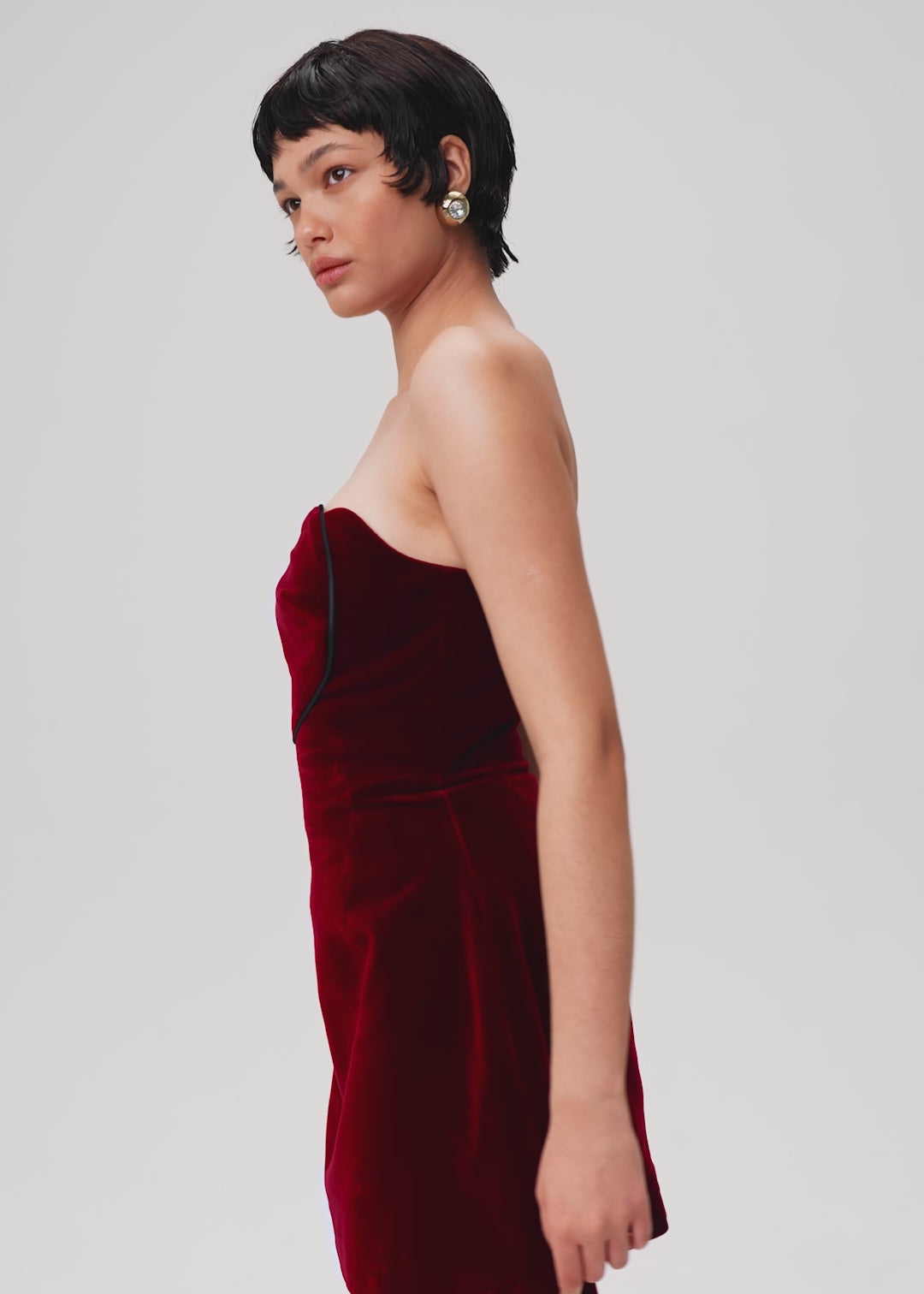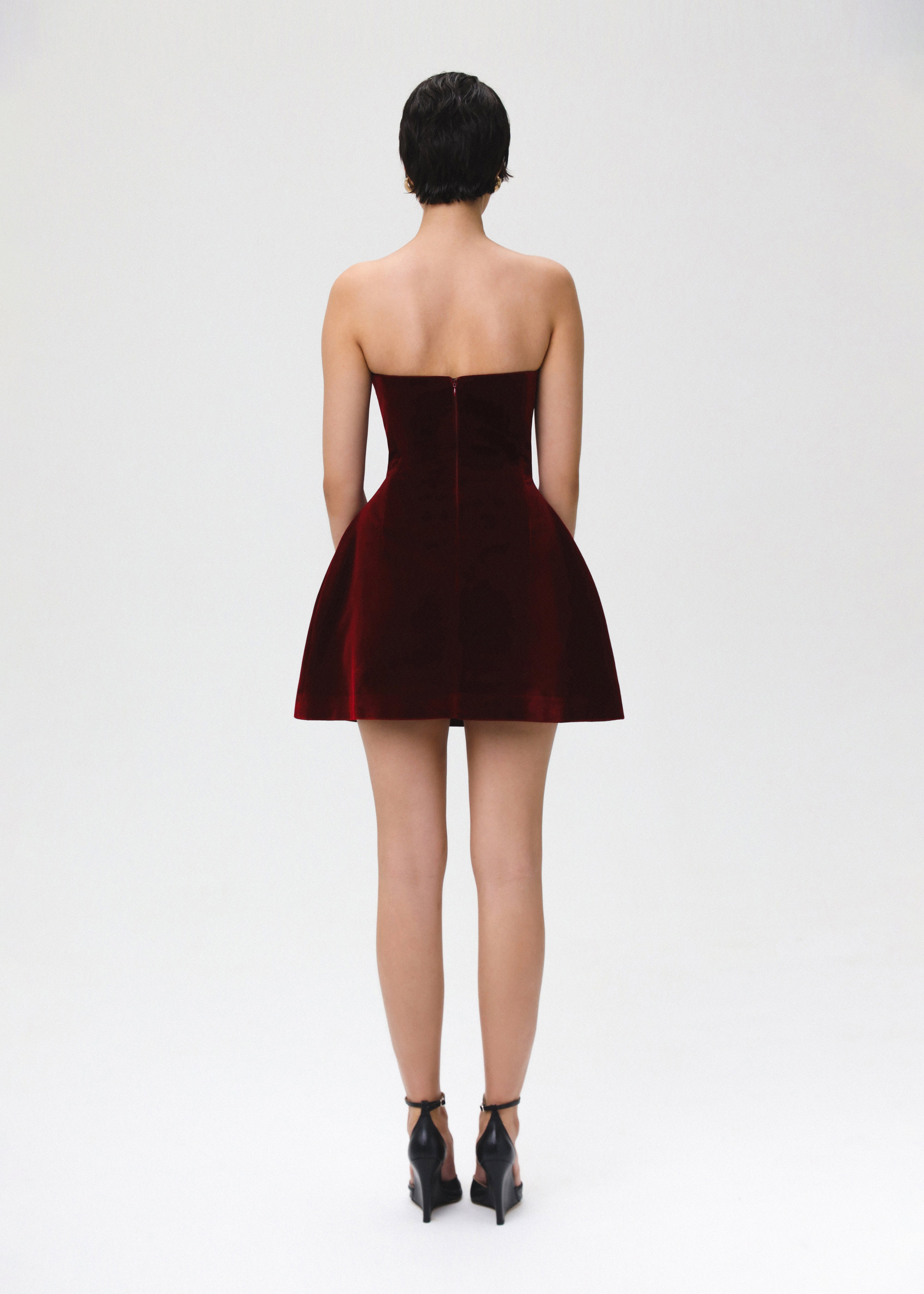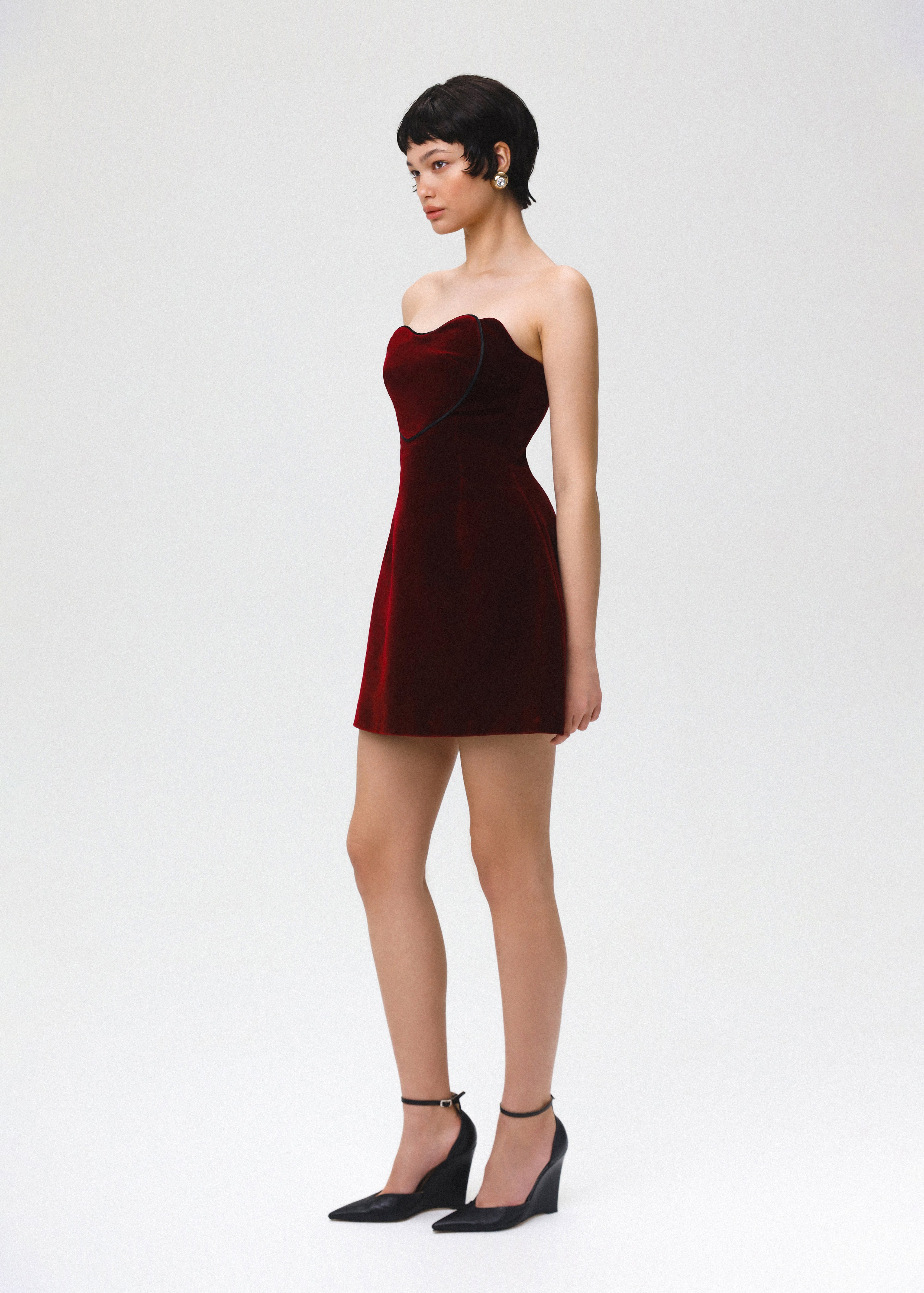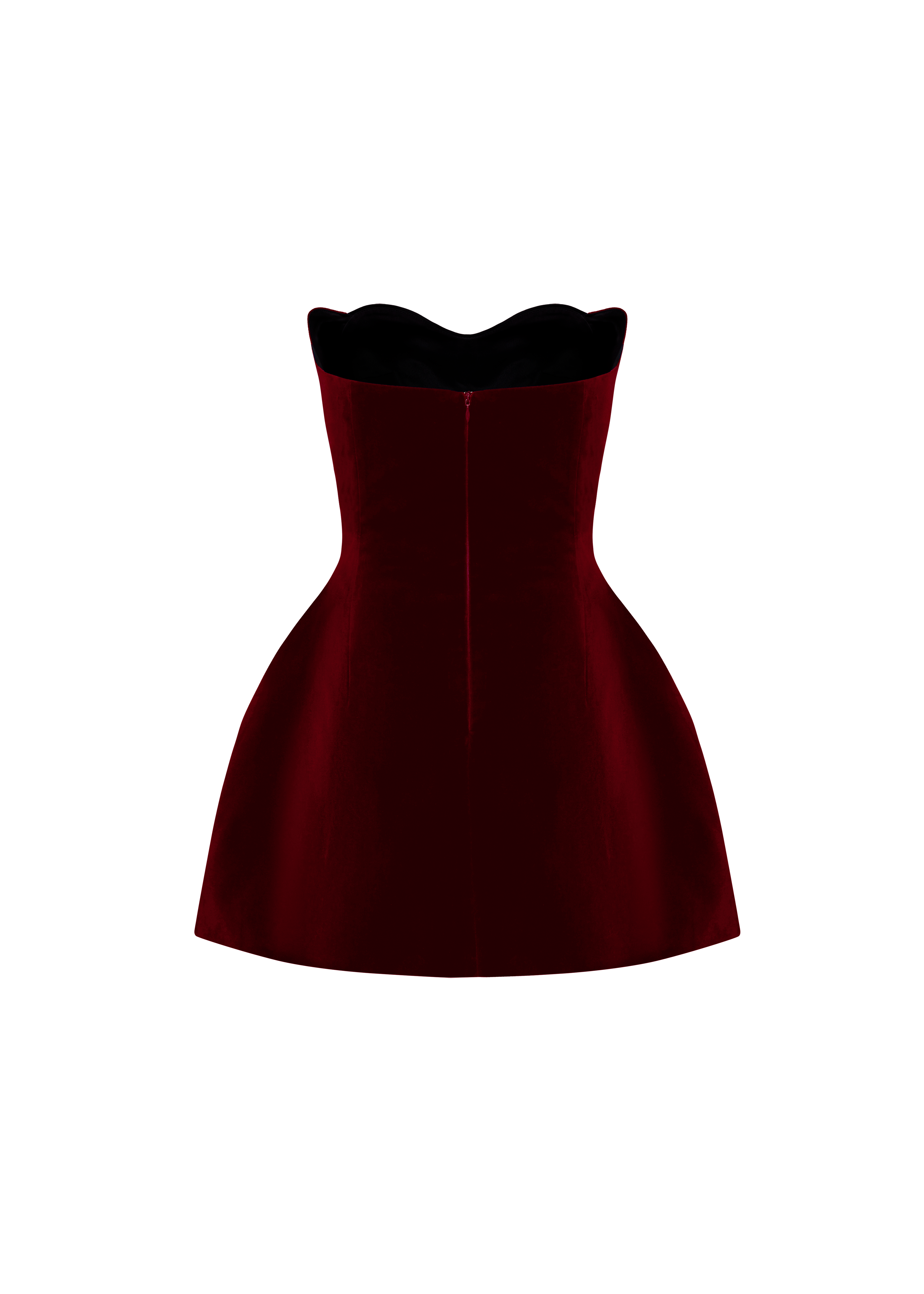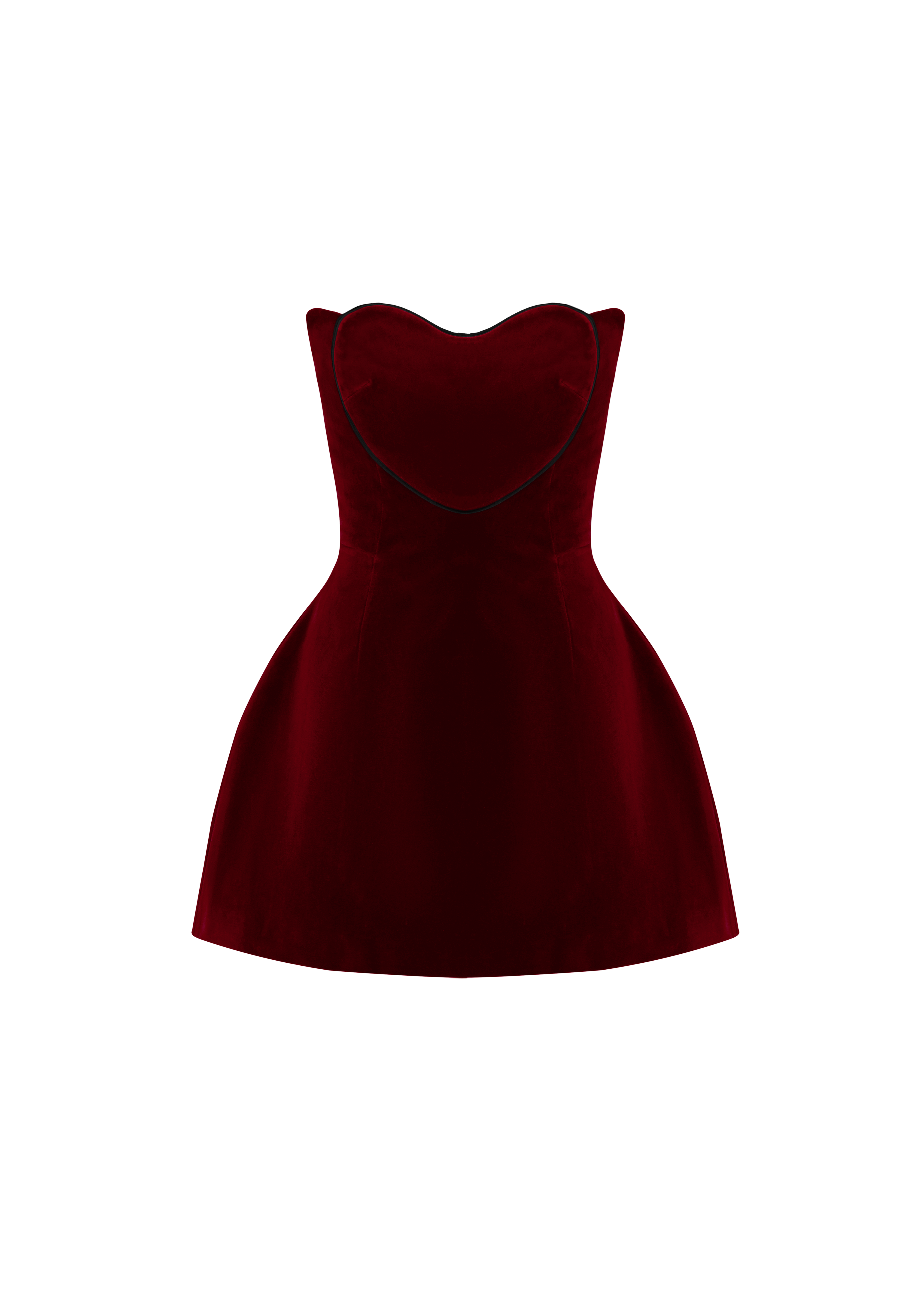 Meticulously crafted from rich burgundy velvet, the Best Lover dress features an alluring silhouette with its strapless, heart-shaped bustier and A-line mini skirt. The corset-style bodice, complete with boning, expertly enhances your figure, providing a beautifully contoured look that exudes confidence and style. Fastened with a concealed back zipper and hook and eye. Fully lined.