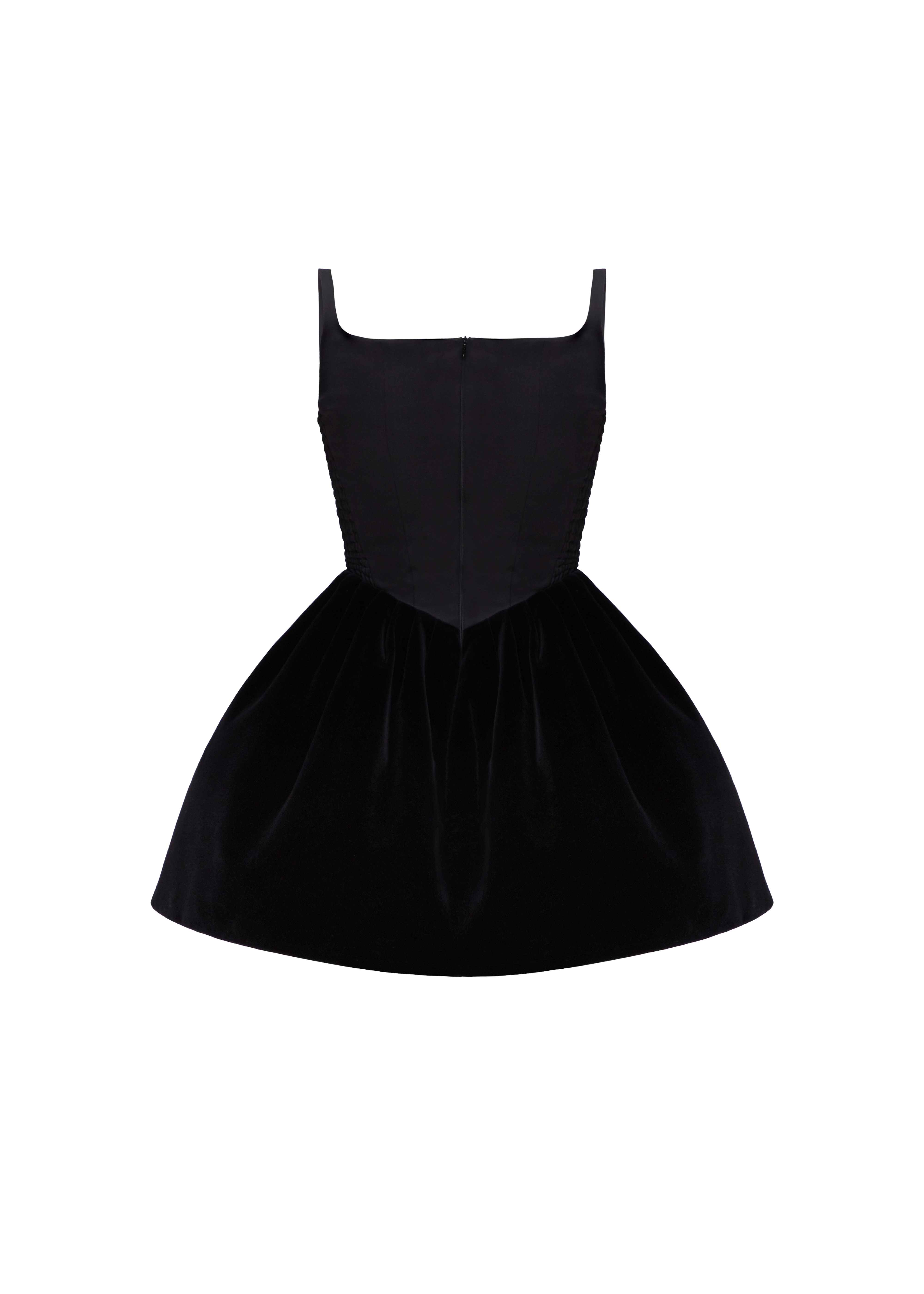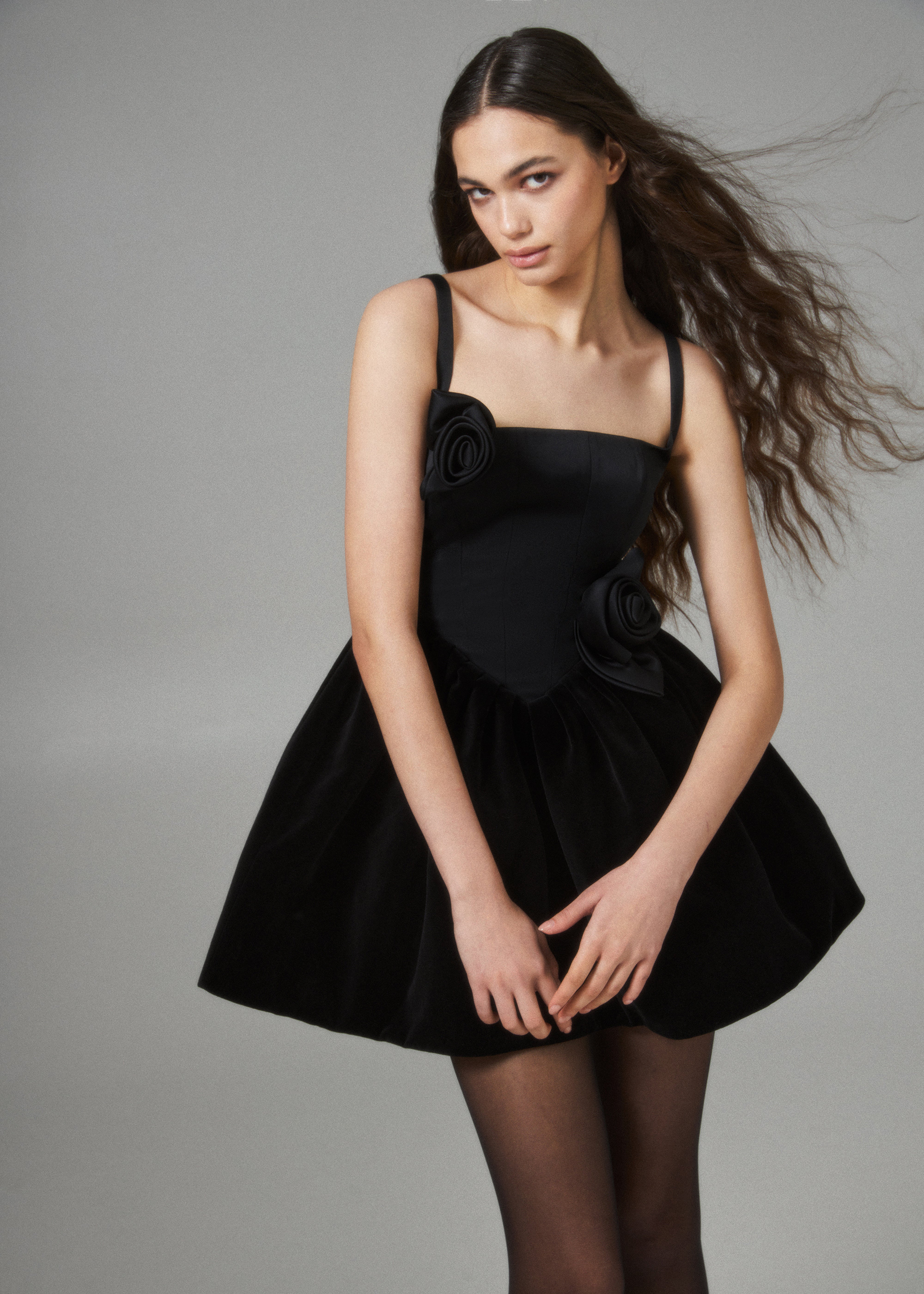 Exquisite First Date dress, a true epitome of elegance and femininity, expertly crafted from a luxurious combination of black velour and satin, creating a rich and deep colour that exudes opulence. The dress features a voluminous gathered skirt with layers of tulle underneath, beautifully enhancing the silhouette. The corset-style top boasts a square neckline, delicate straps, and boning, creating a figure-flattering and refined look. Corset is adorned with handcrafted flowers that delicately accentuate its charm. Designed for both style and comfort, elastic inserts on the sides ensure a seamless and comfortable fit. Fastened with a concealed back zipper and hook and eye.