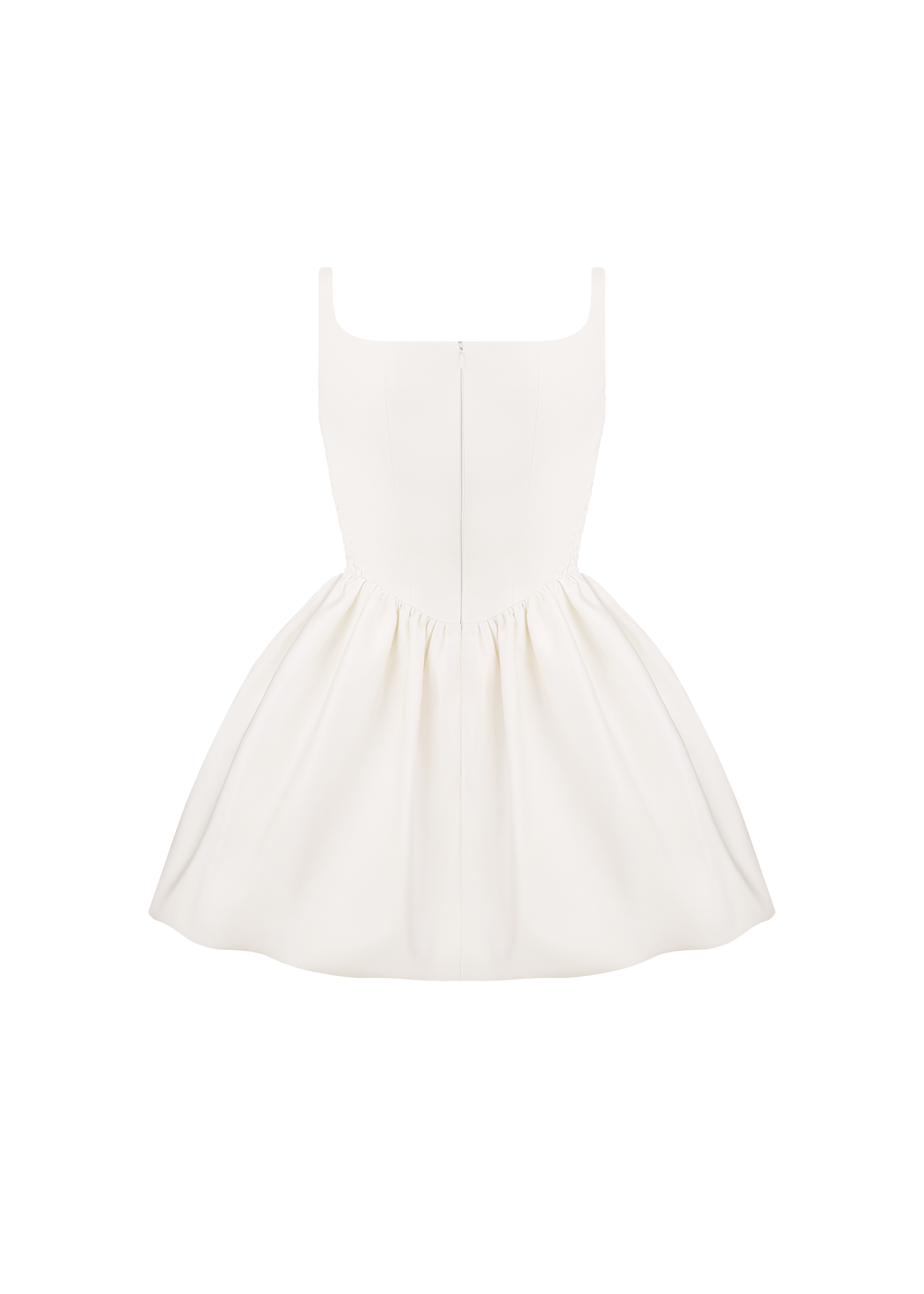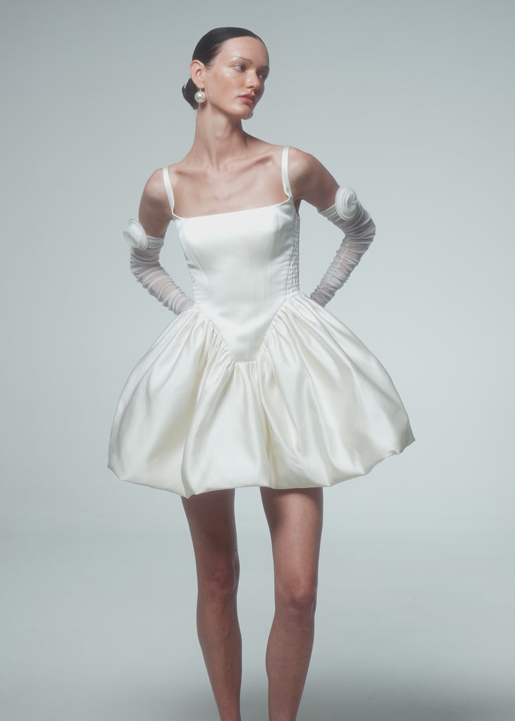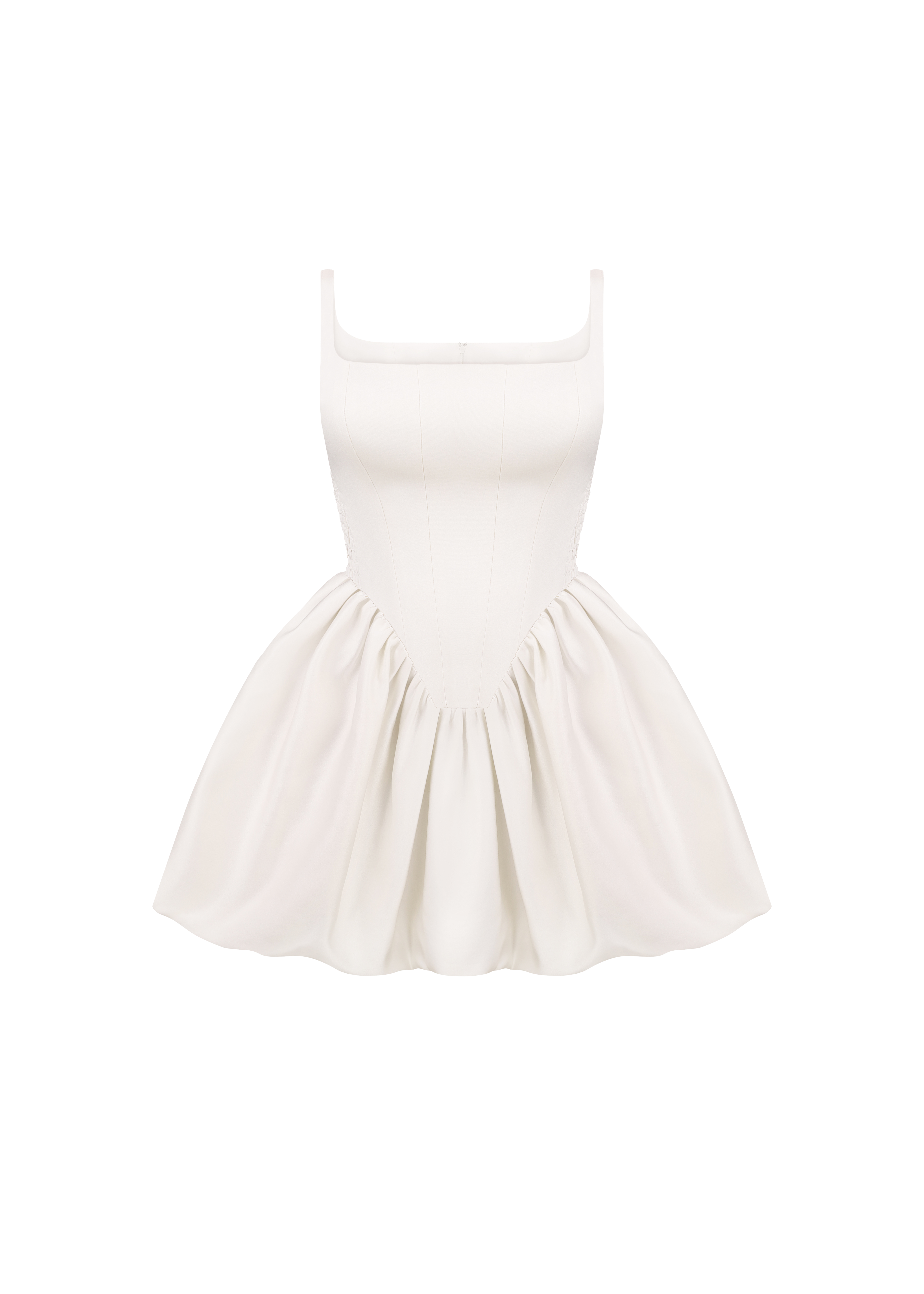 Exquisite First Date dress, a true epitome of elegance and femininity, crafted from a luxurious milky satin. The dress features a voluminous gathered skirt, the corset-style top boasts a square neckline, delicate straps, and boning, creating a figure-flattering and refined look. Designed for both style and comfort, elastic inserts on the sides ensure a seamless and comfortable fit. Fastened with a concealed back zipper and hook and eye.