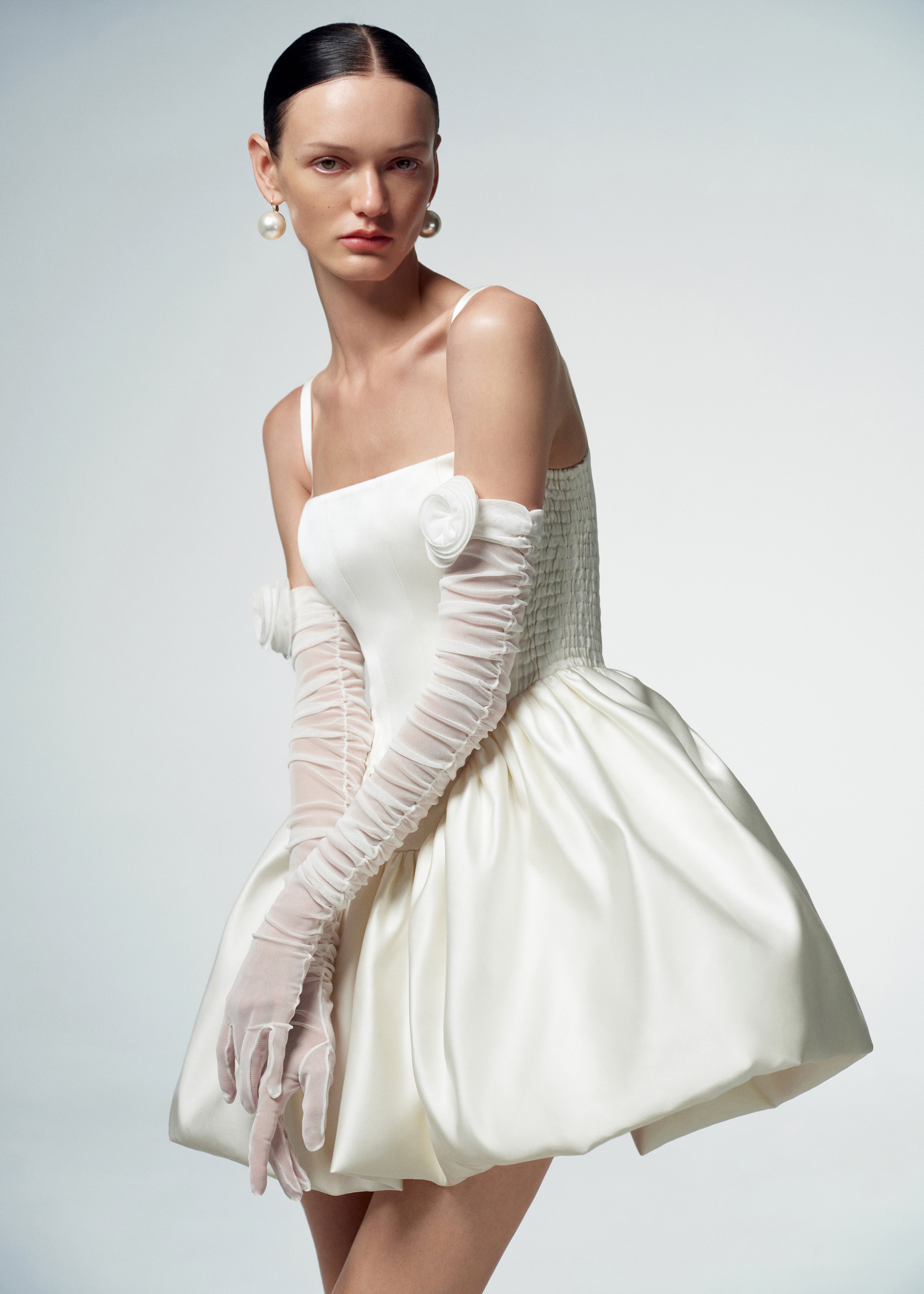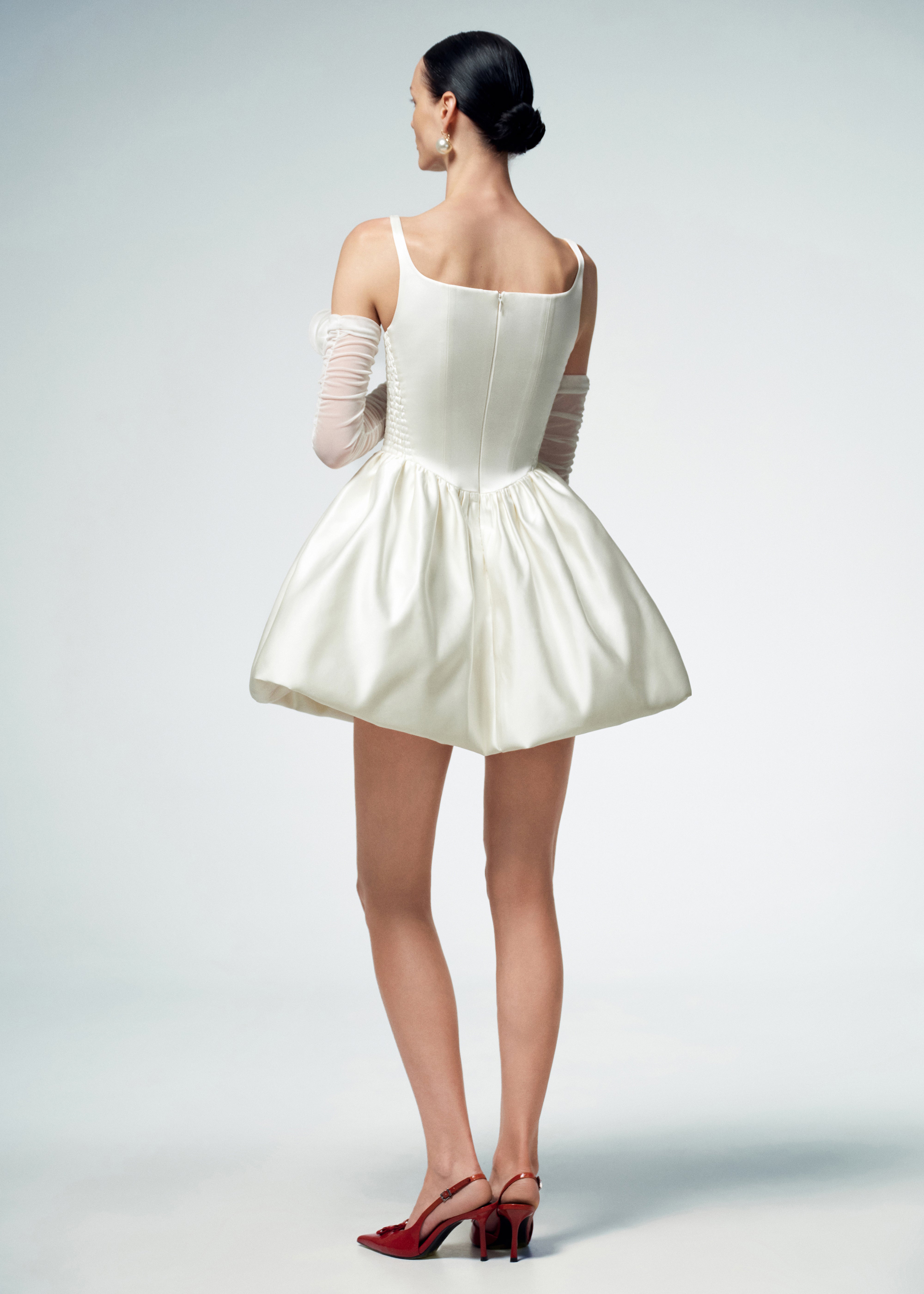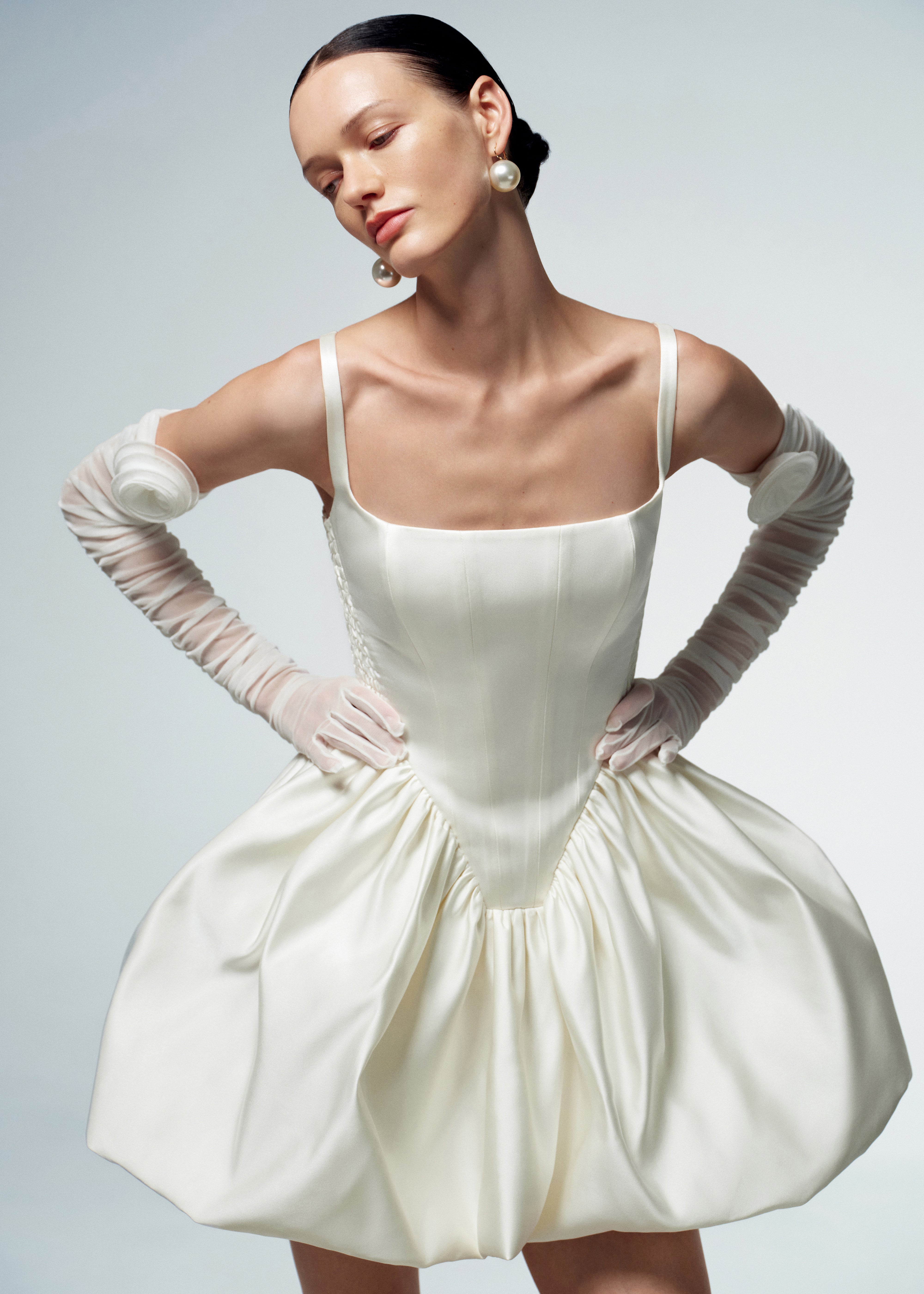 Exquisite First Date dress, a true epitome of elegance and femininity, crafted from a luxurious milky satin. The dress features a voluminous gathered skirt, the corset-style top boasts a square neckline, delicate straps, and boning, creating a figure-flattering and refined look. Designed for both style and comfort, elastic inserts on the sides ensure a seamless and comfortable fit. Fastened with a concealed back zipper and hook and eye.