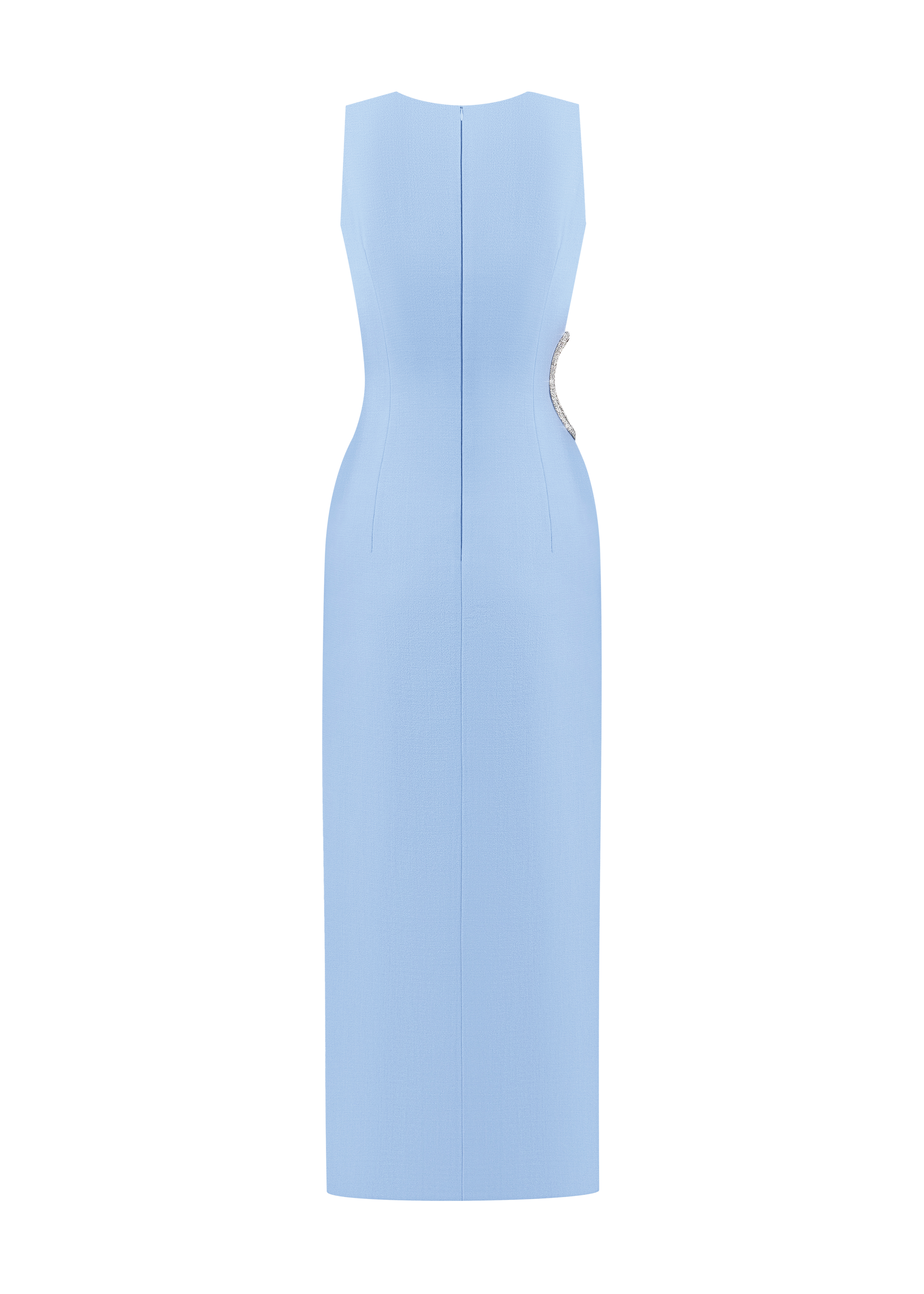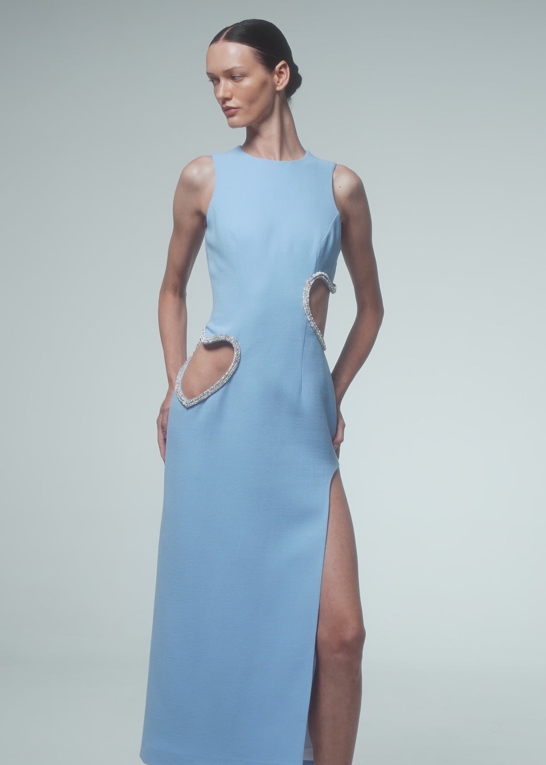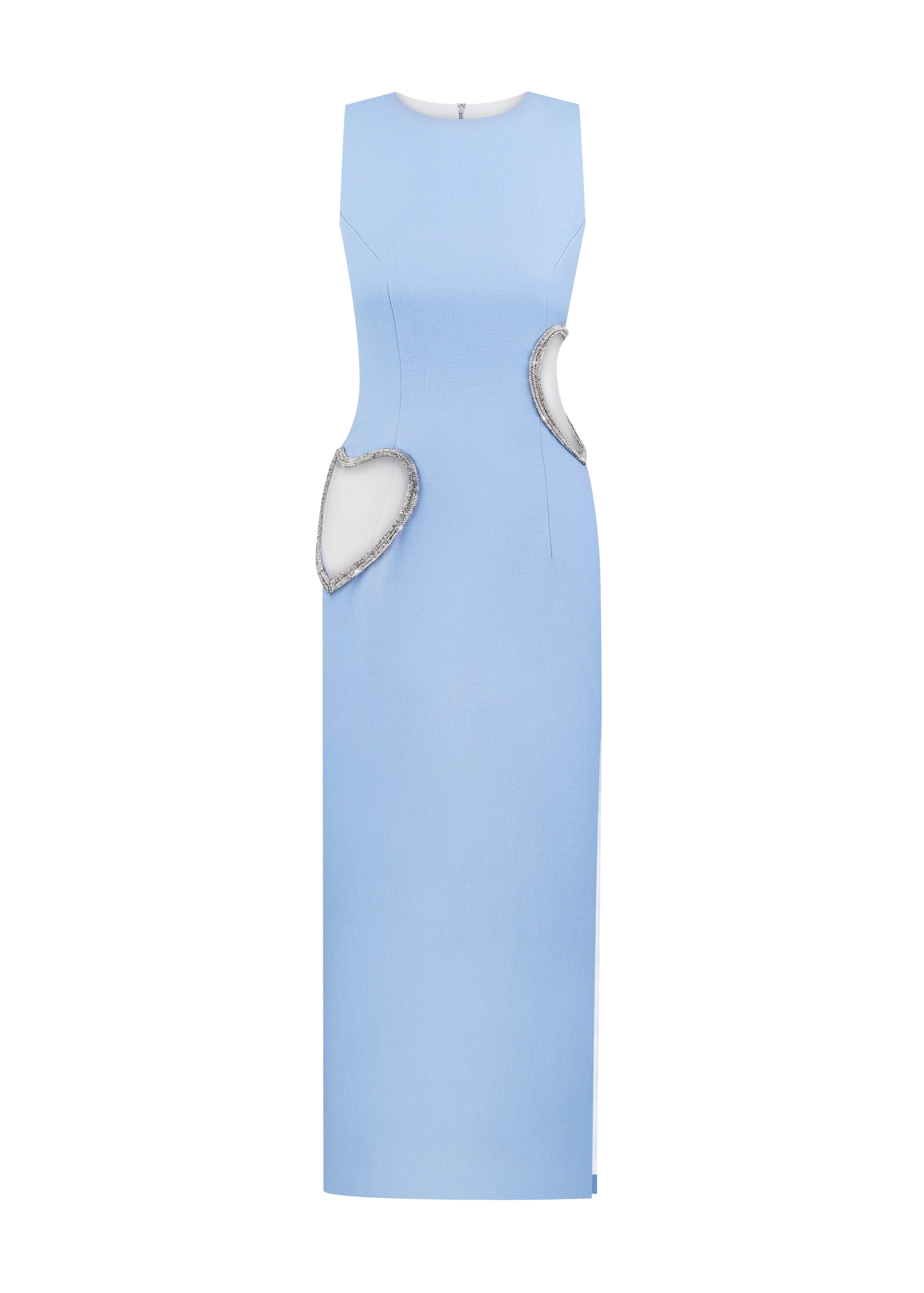 First Kiss crafted in a delicate blue hue, this sleeveless midi dress features a round neck and a flattering structured silhouette. The most captivating features are the heart-shaped cut-outs at the waist and hips, embellished with shimmering crystals, adding a touch of glamour and sophistication. Complete with a thigh-high slit, the dress is fastened with a concealed back zipper and hook and eye closure, fully lined.