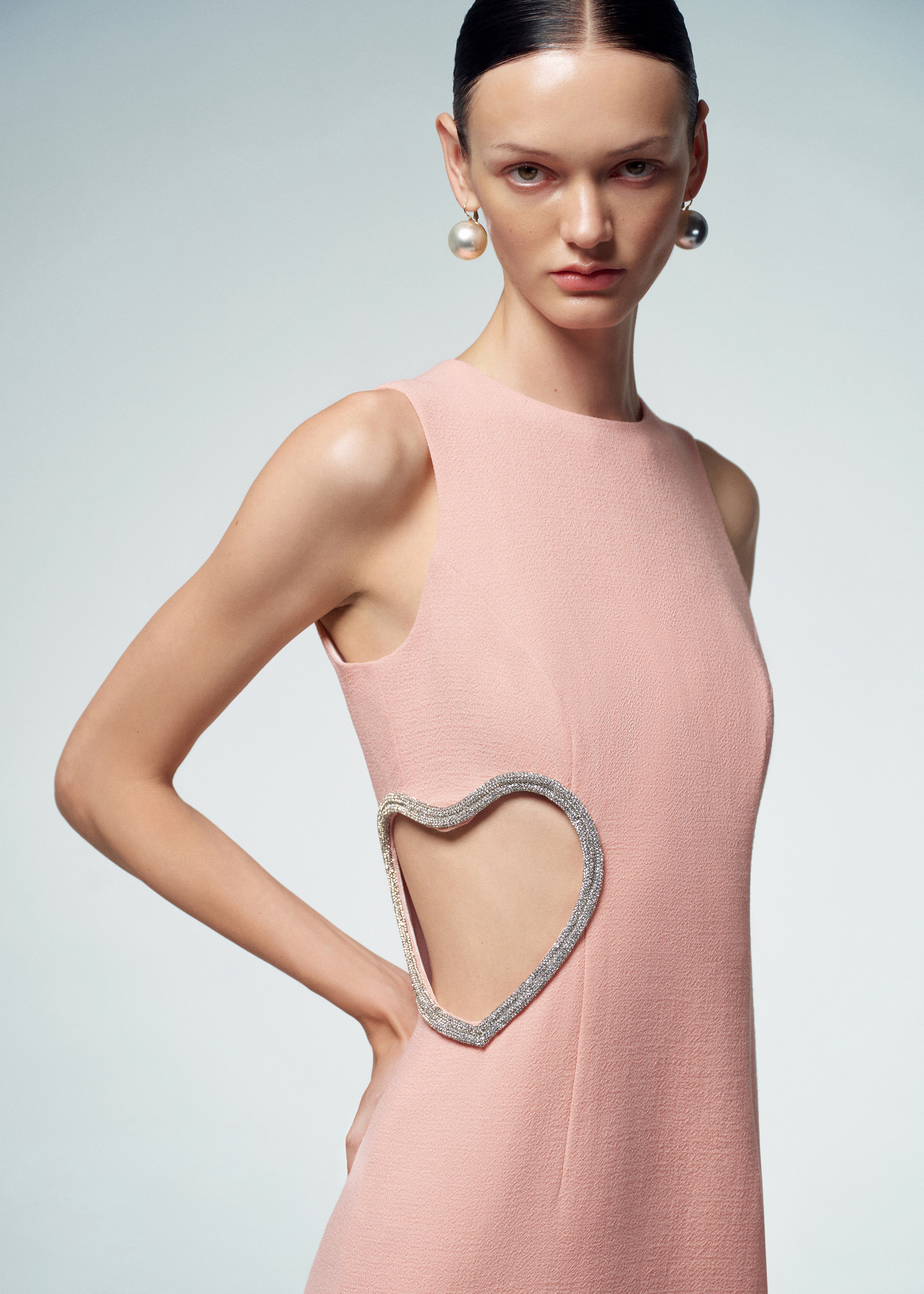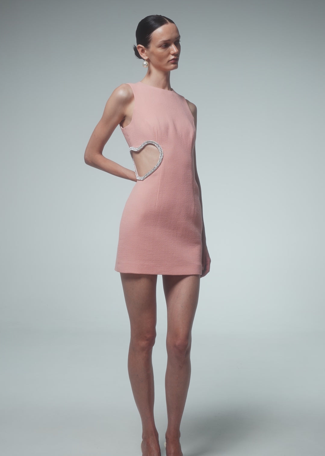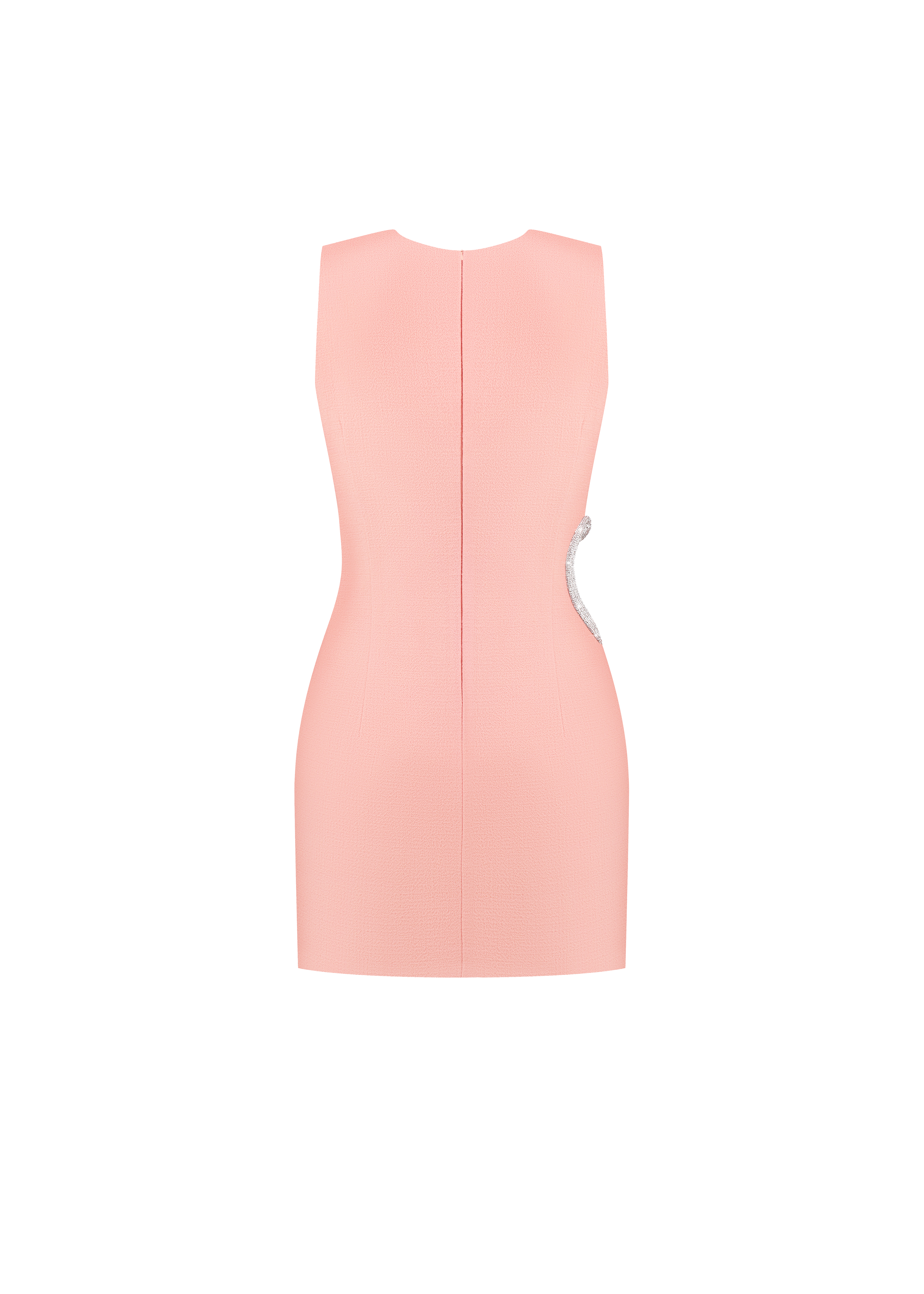 Crafted in a vibrant peach hue, this sleeveless mini dress features a round neck and a flattering structured silhouette. The most captivating features is the heart-shaped cut-out at the waist, embellished with shimmering crystals, adding a touch of glamour and sophistication. The dress is fastened with a concealed back zipper and hook and eye closure, fully lined.