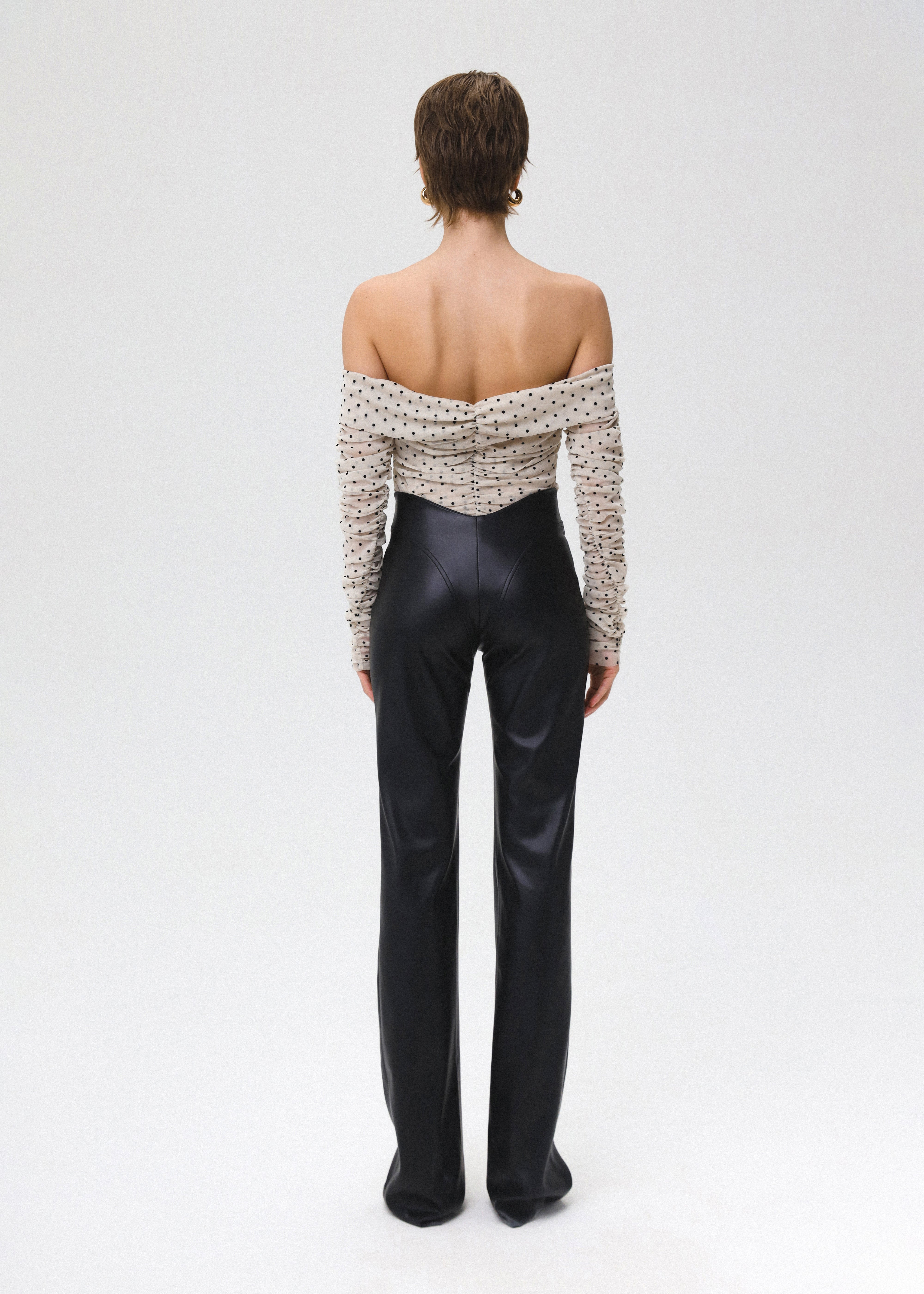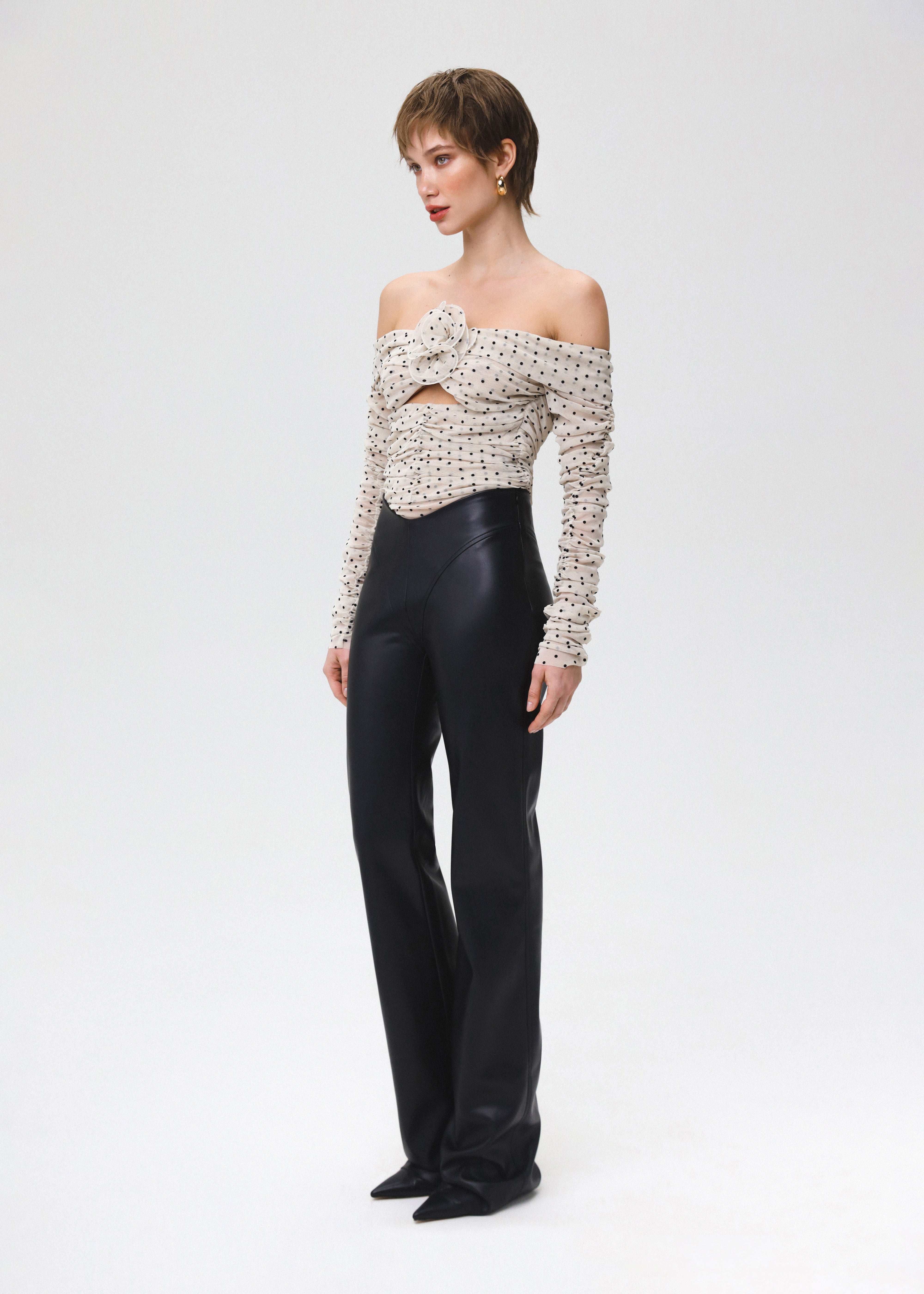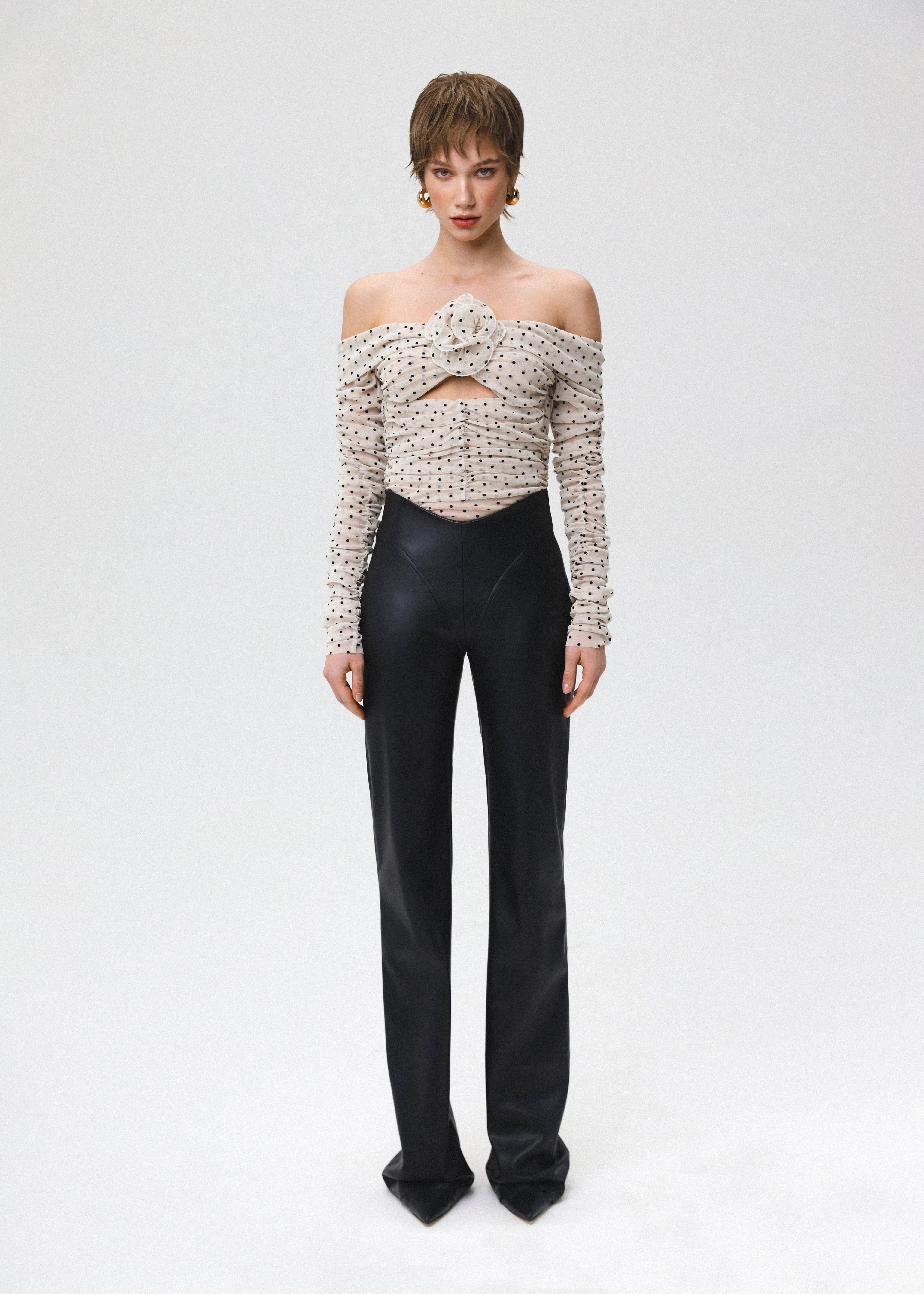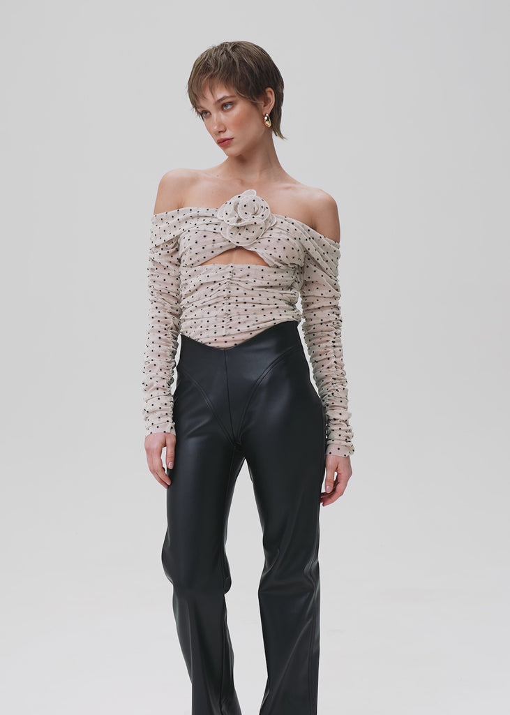 Long sleeve, off-the-shoulder ruched bodysuit adorned with delicate handmade flower. This captivating piece is meticulously crafted from beige polka dot flocked mesh fabric. The stretchy fabric ensures a comfortable and confident fit, allowing you to move with ease and grace.