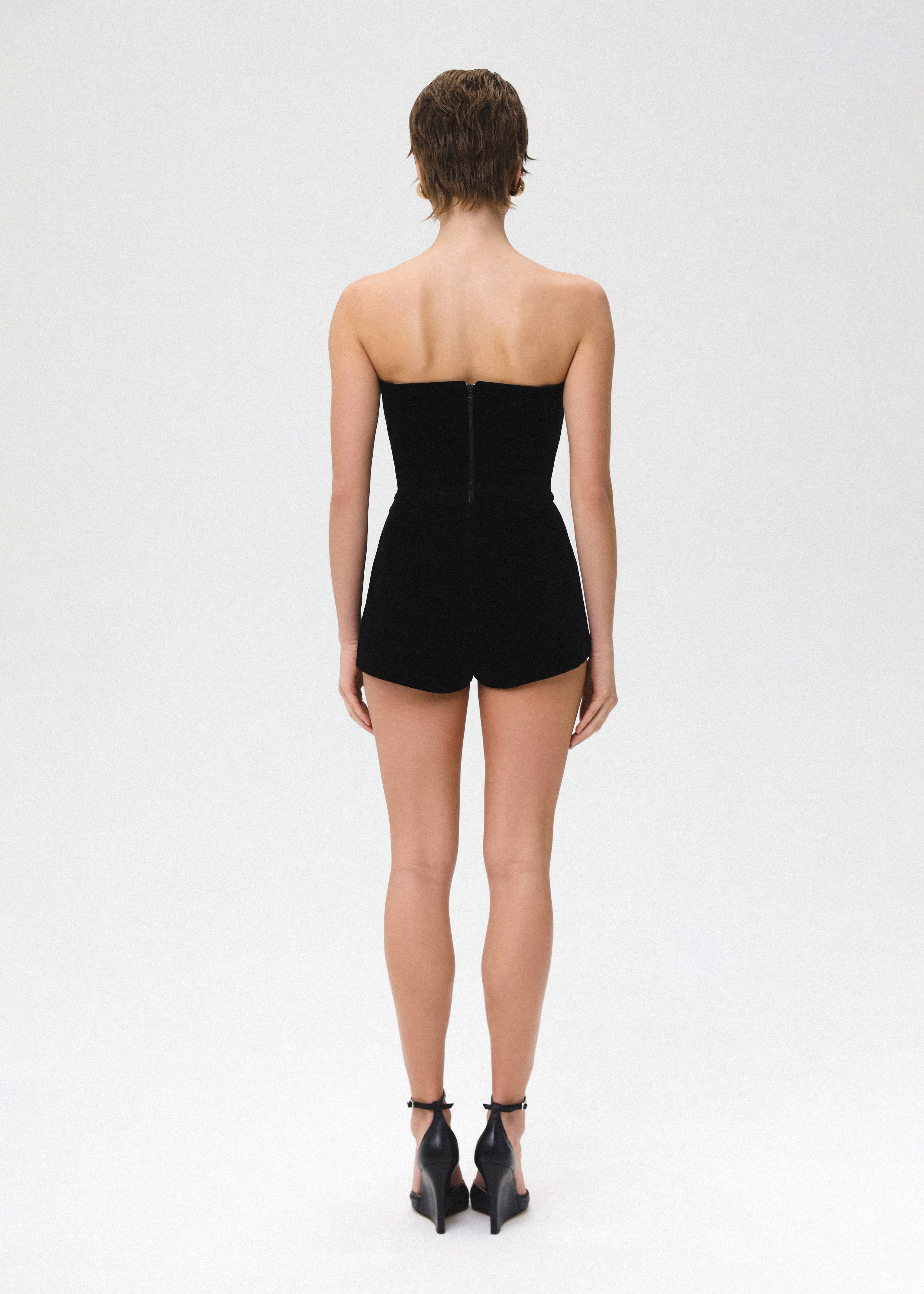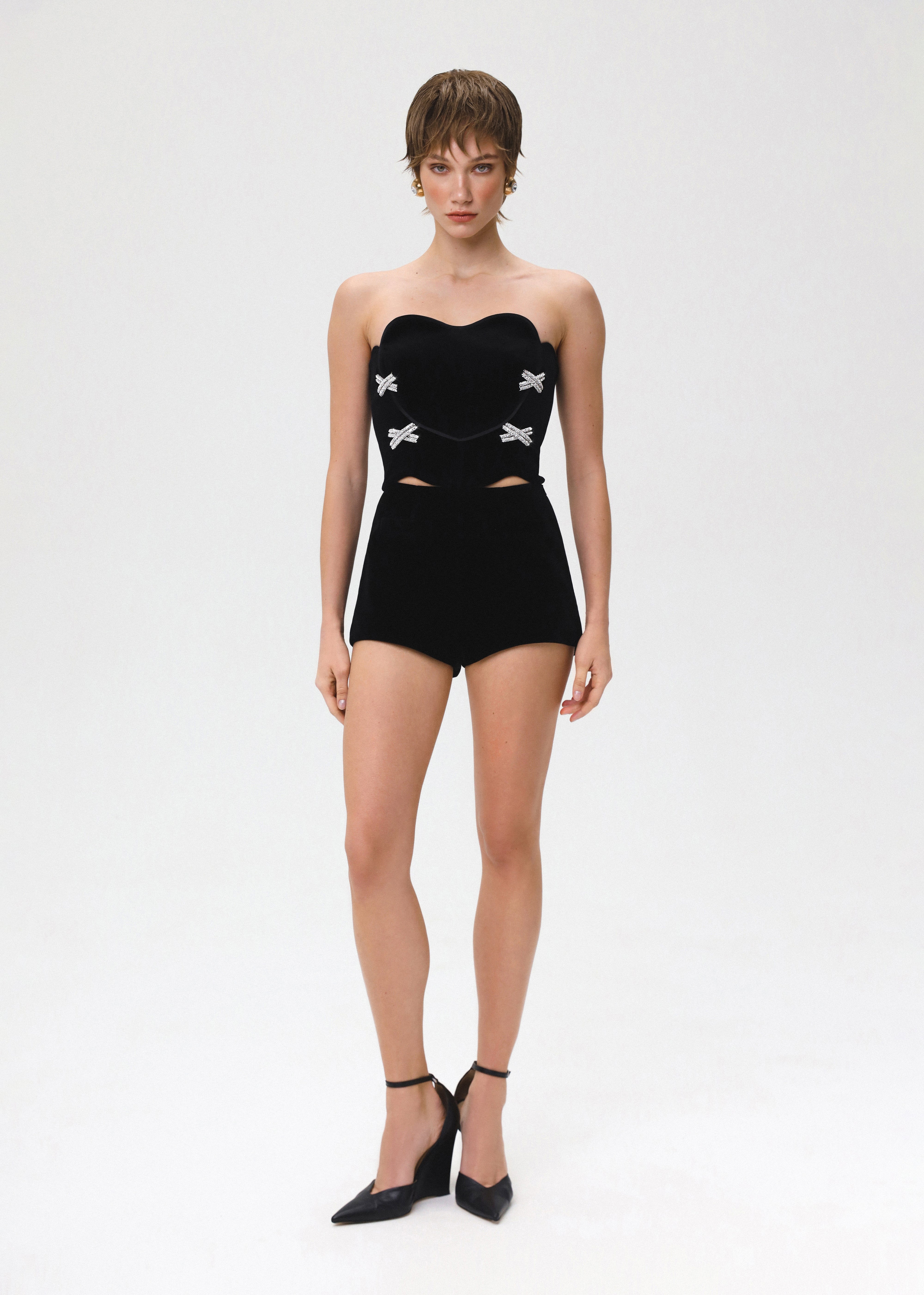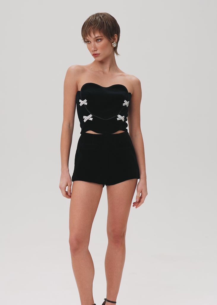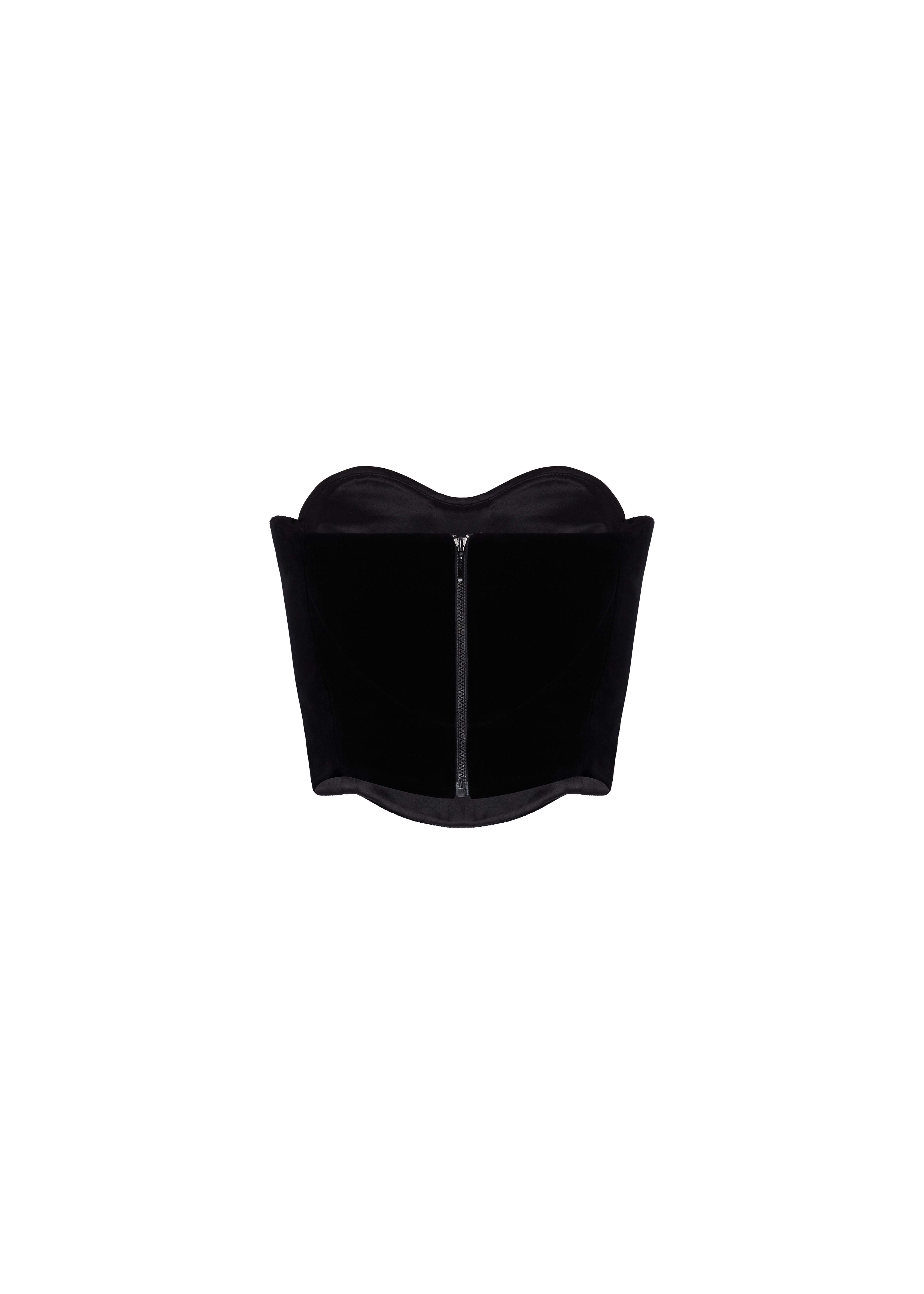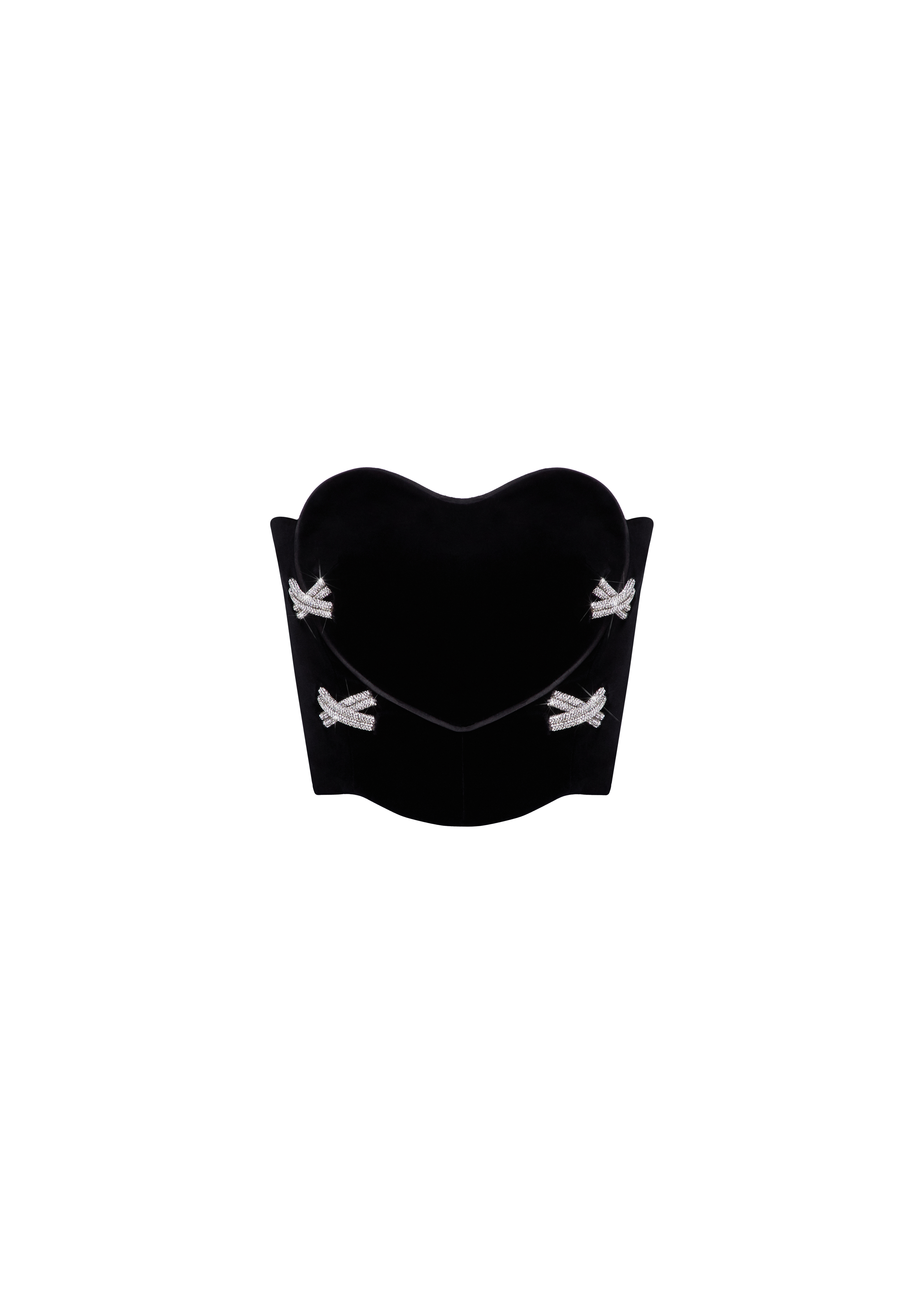 The Heart Lock top presents a captivating blend of romance and allure. Its heart-shaped crystal-embellished corset top features a delicate bustier adorned with intricate crystal embroidery, set against sumptuous black velvet and accentuated by refined black satin edging. The top's gracefully curved hemline enhances its silhouette, ensuring a flattering and feminine fit. Fastened with a detachable zipper. Fully lined.
