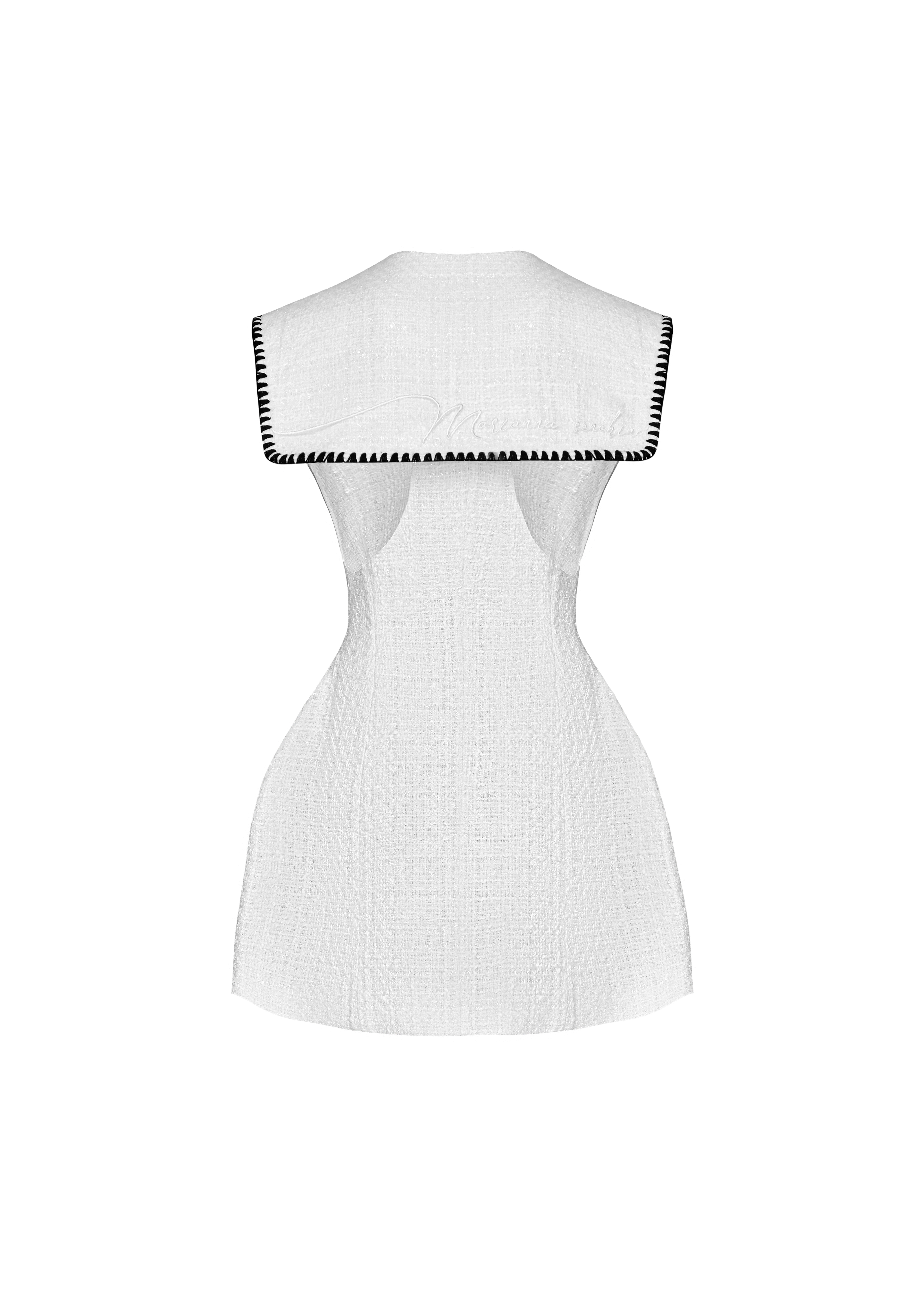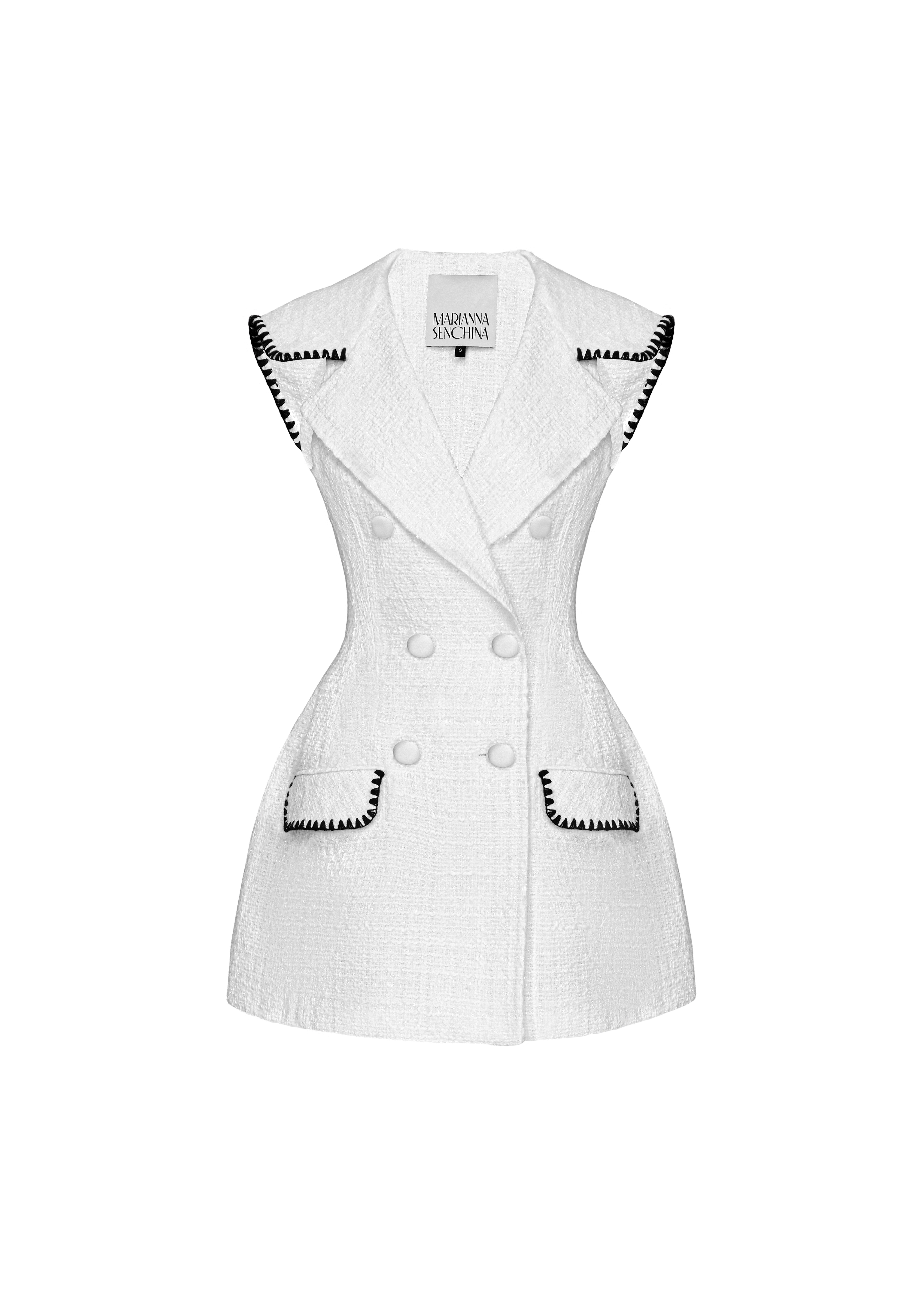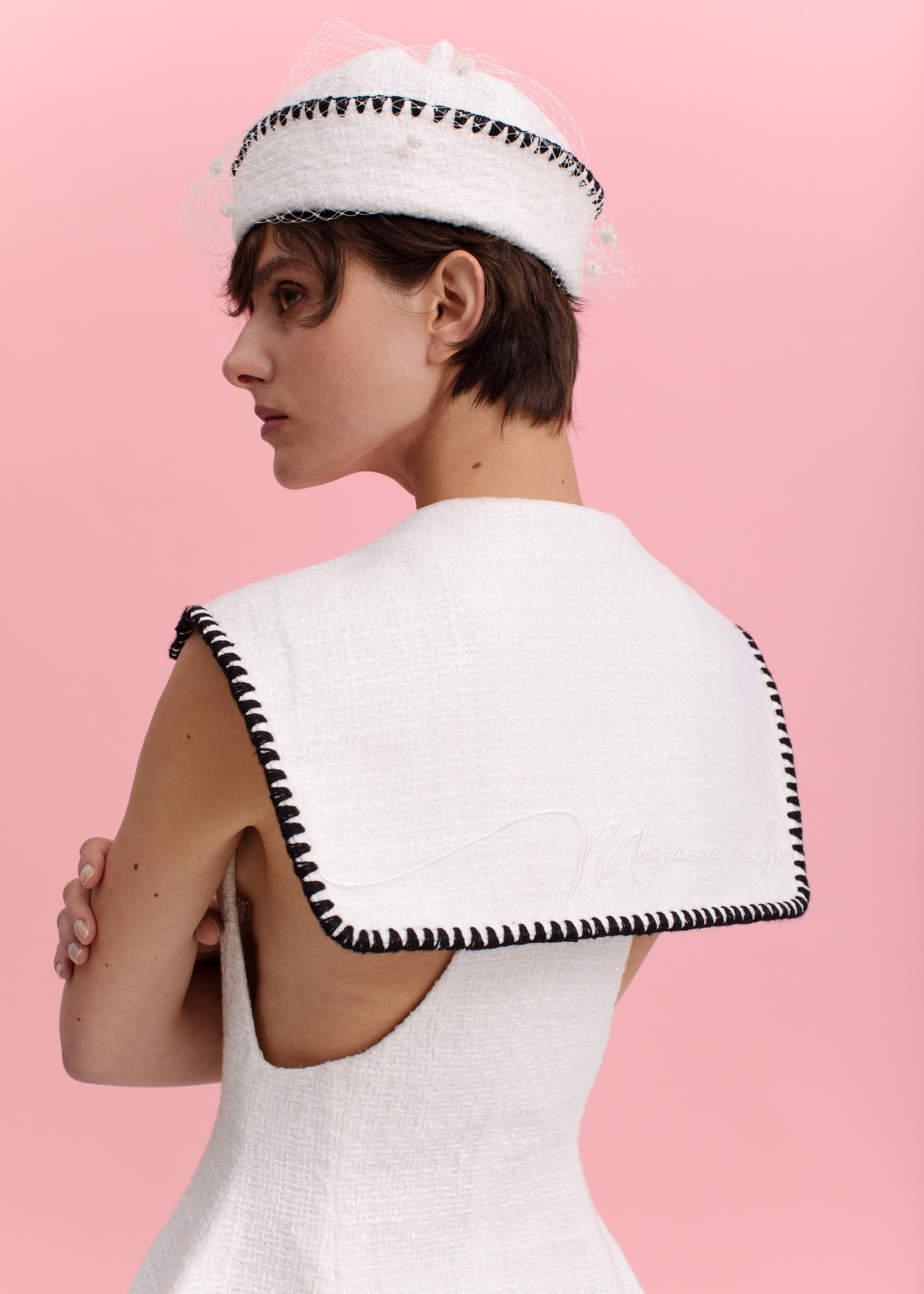 Open shoulder jacket-dress in white tweed, featuring a double-breasted button front in milky satin, this dress exudes sophistication and class. The V-neckline, big convertible collar, and mini A-line skirt create a flattering and feminine silhouette. The sailor collar and flap pocket are adorned with black handmade crochet edging, adding a touch of intricate detail to the design. Marianna Senchina inscription on the tulle fabric-covered sailor collar is the finishing touch to this unique piece. Fully lined.
