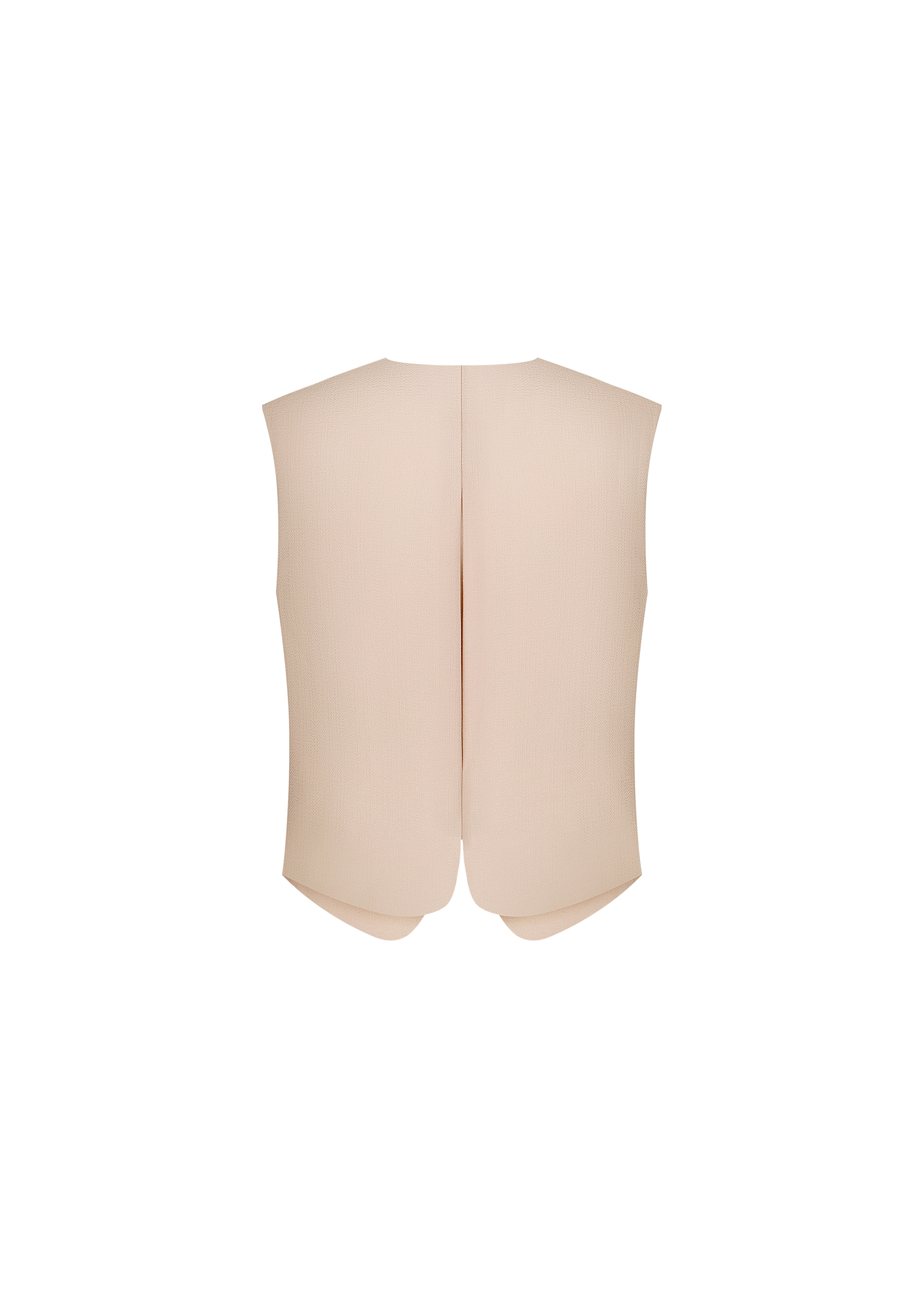 Linda cropped vest in a beige shade. This piece features a unique cut-out design on the back, adding a touch of intrigue to the overall look. The vest is fastened by two buttons, covered in the same fabric as the main body, and includes imitation flaps at the front. The round neckline enhances the sleek and modern aesthetic of the vest. Designed for both comfort and style, this vest is fully lined.