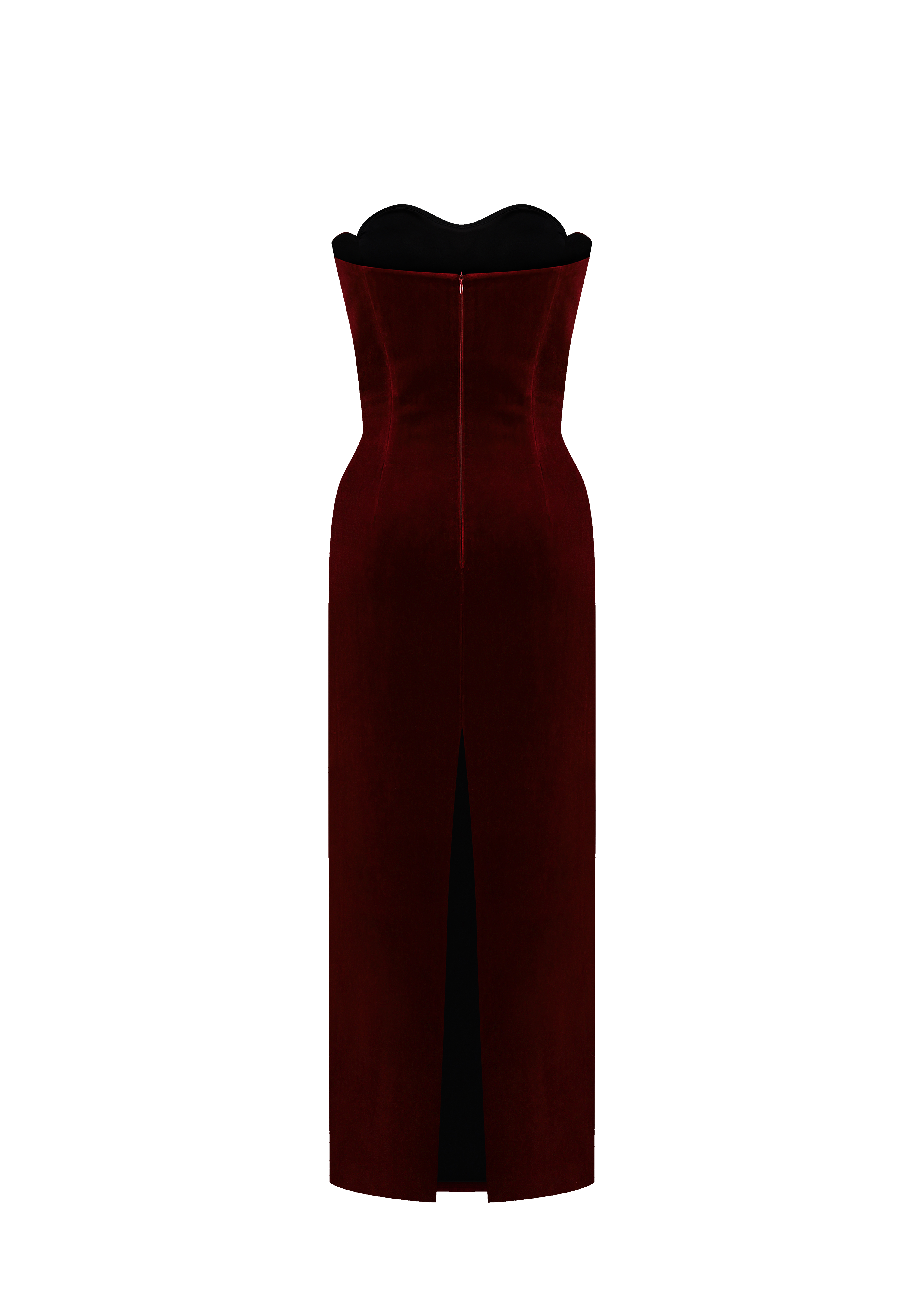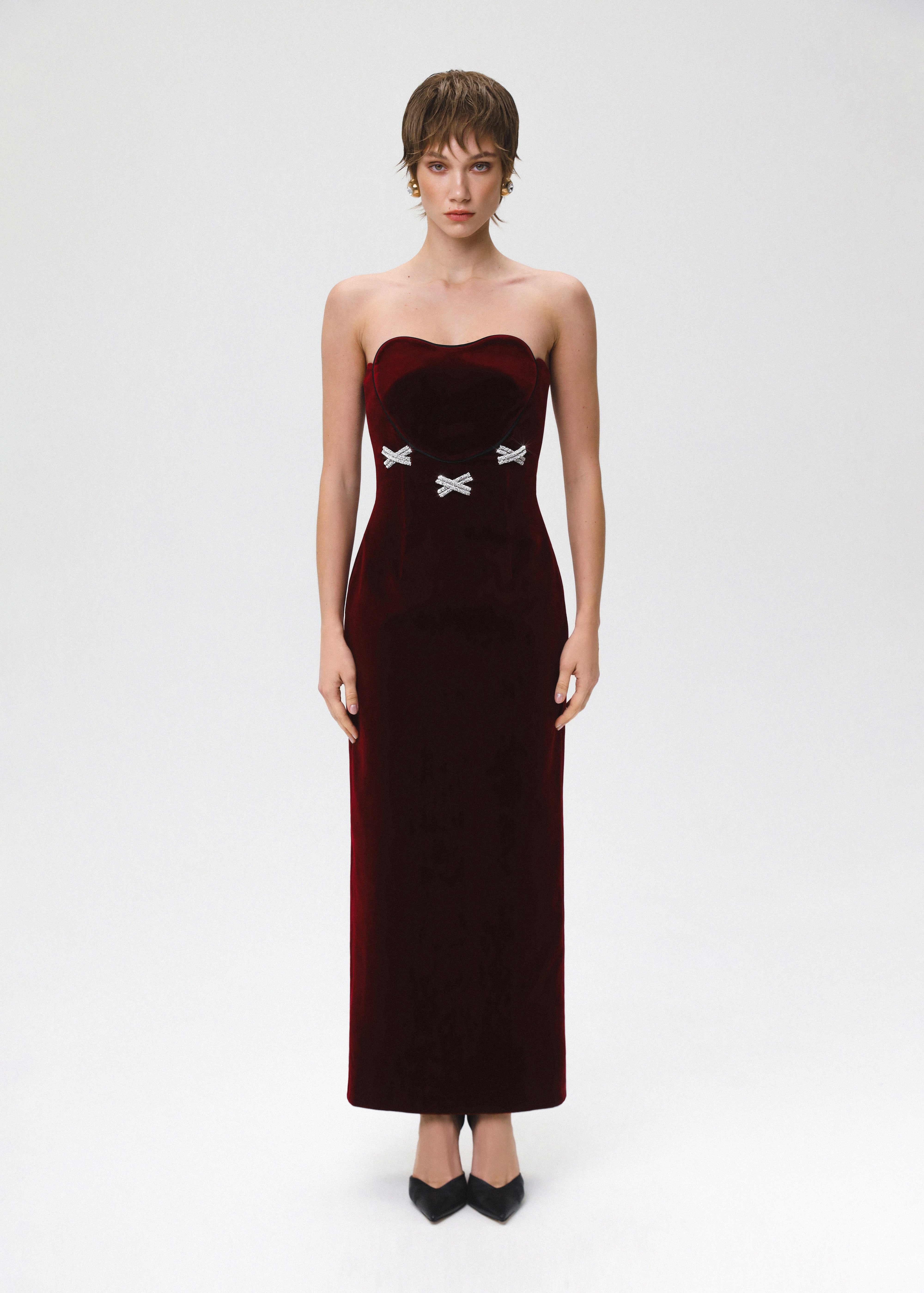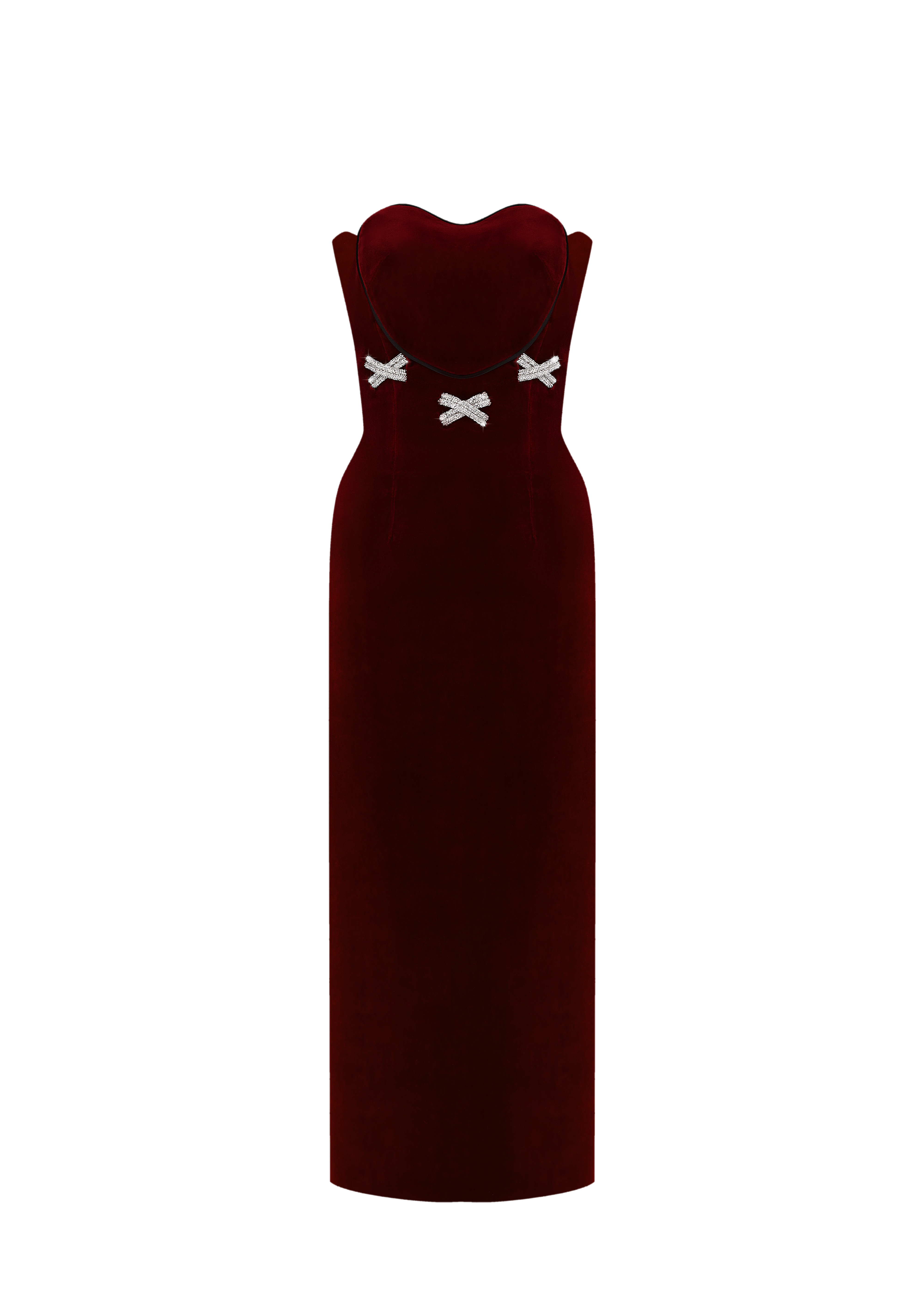 Love Lock midi dress crafted from burgundy velvet. This exquisite dress showcases a heart-shaped bustier adorned with delicate crystal embroidery. The straight long skirt gracefully flows with every step, featuring a subtle slit at the back. Fastened with a concealed back zip and hook and eye. Fully lined. The expertly tailored silhouette offers a perfect fit, accentuating your curves and enhancing your elegant shape.