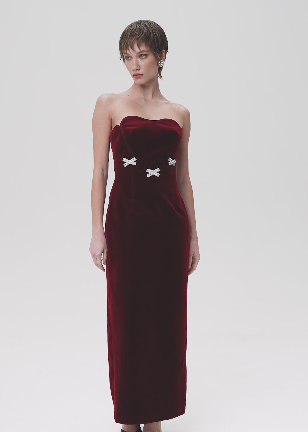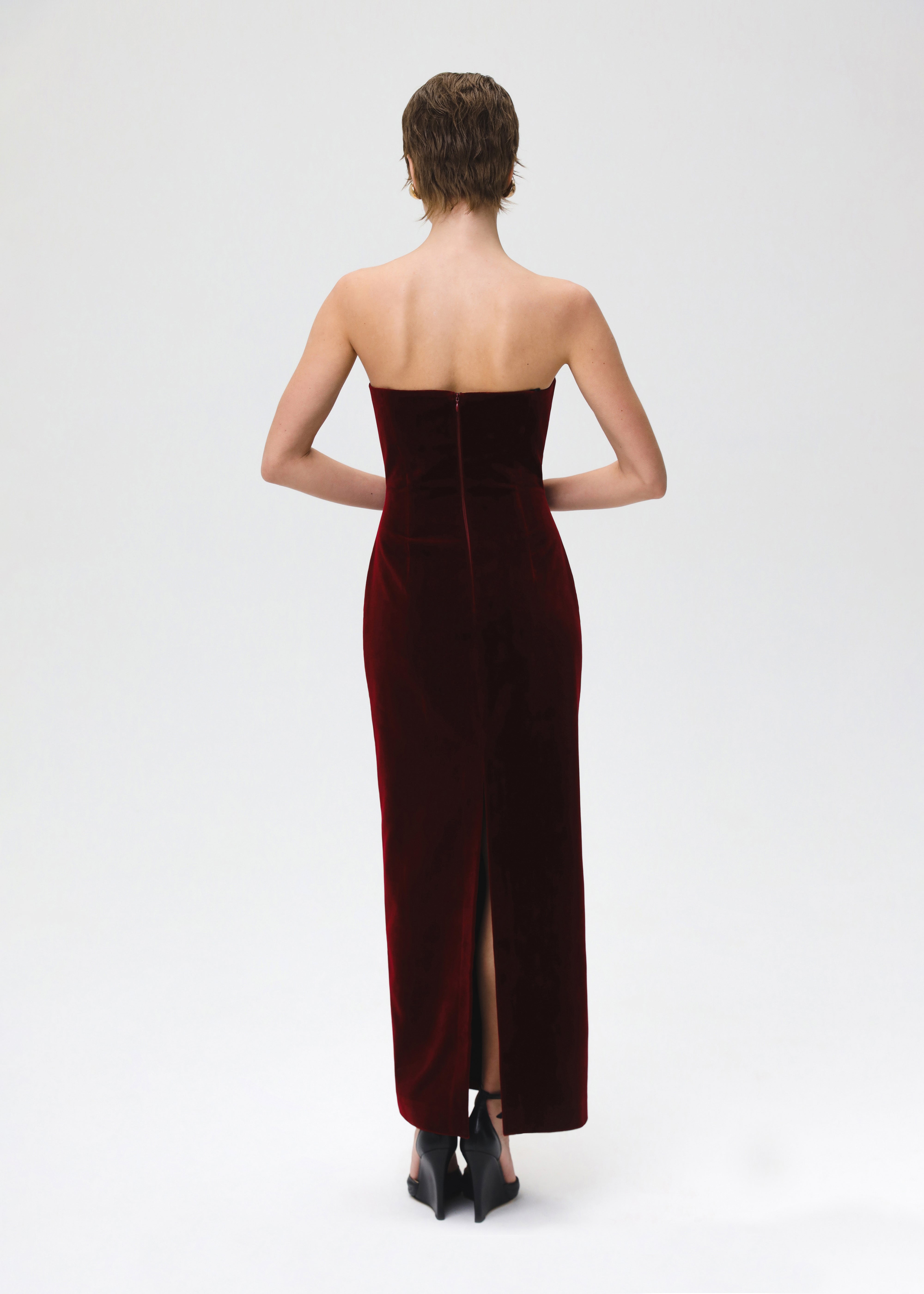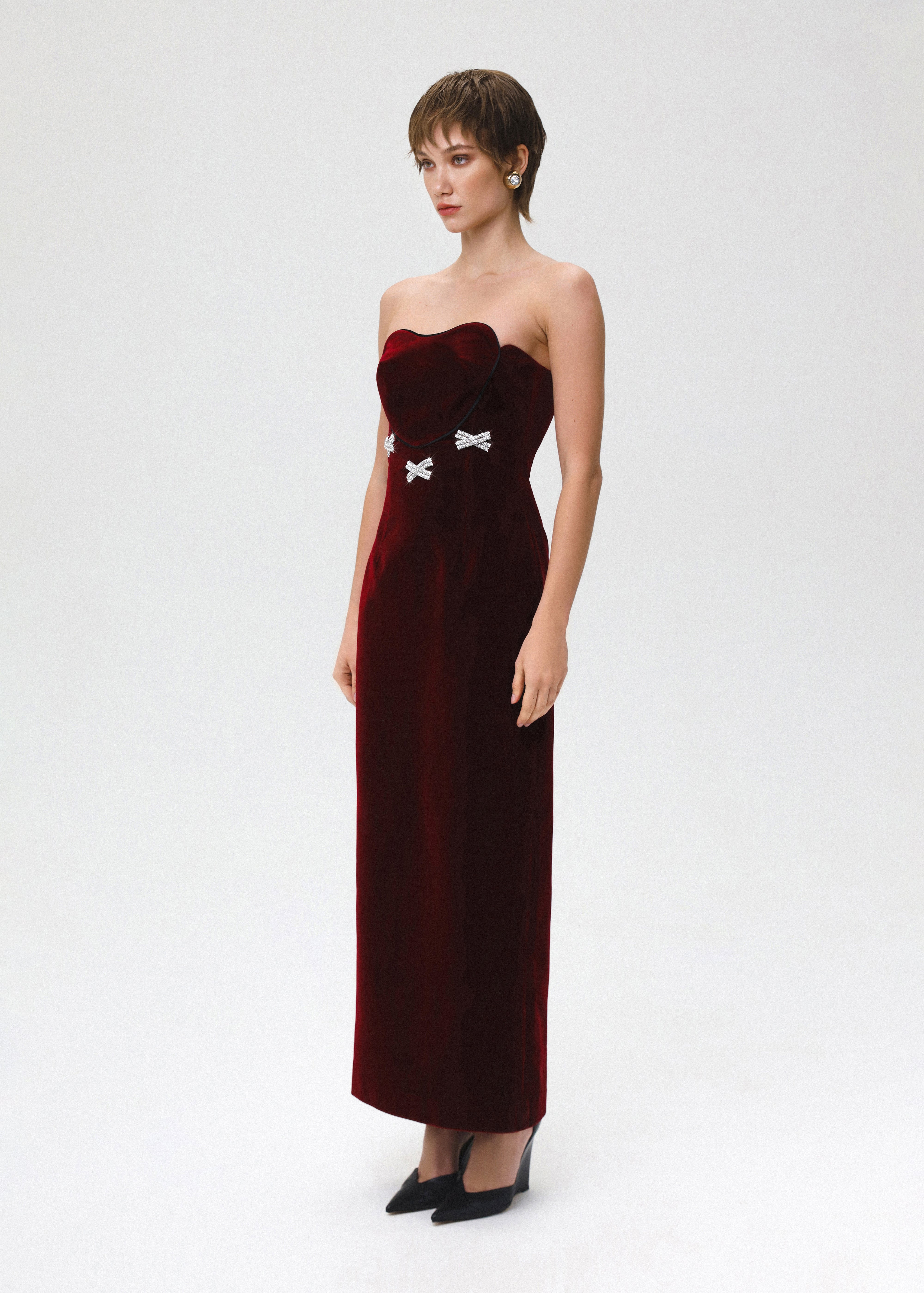 Love Lock midi dress crafted from burgundy velvet. This exquisite dress showcases a heart-shaped bustier adorned with delicate crystal embroidery. The straight long skirt gracefully flows with every step, featuring a subtle slit at the back. Fastened with a concealed back zip and hook and eye. Fully lined. The expertly tailored silhouette offers a perfect fit, accentuating your curves and enhancing your elegant shape.