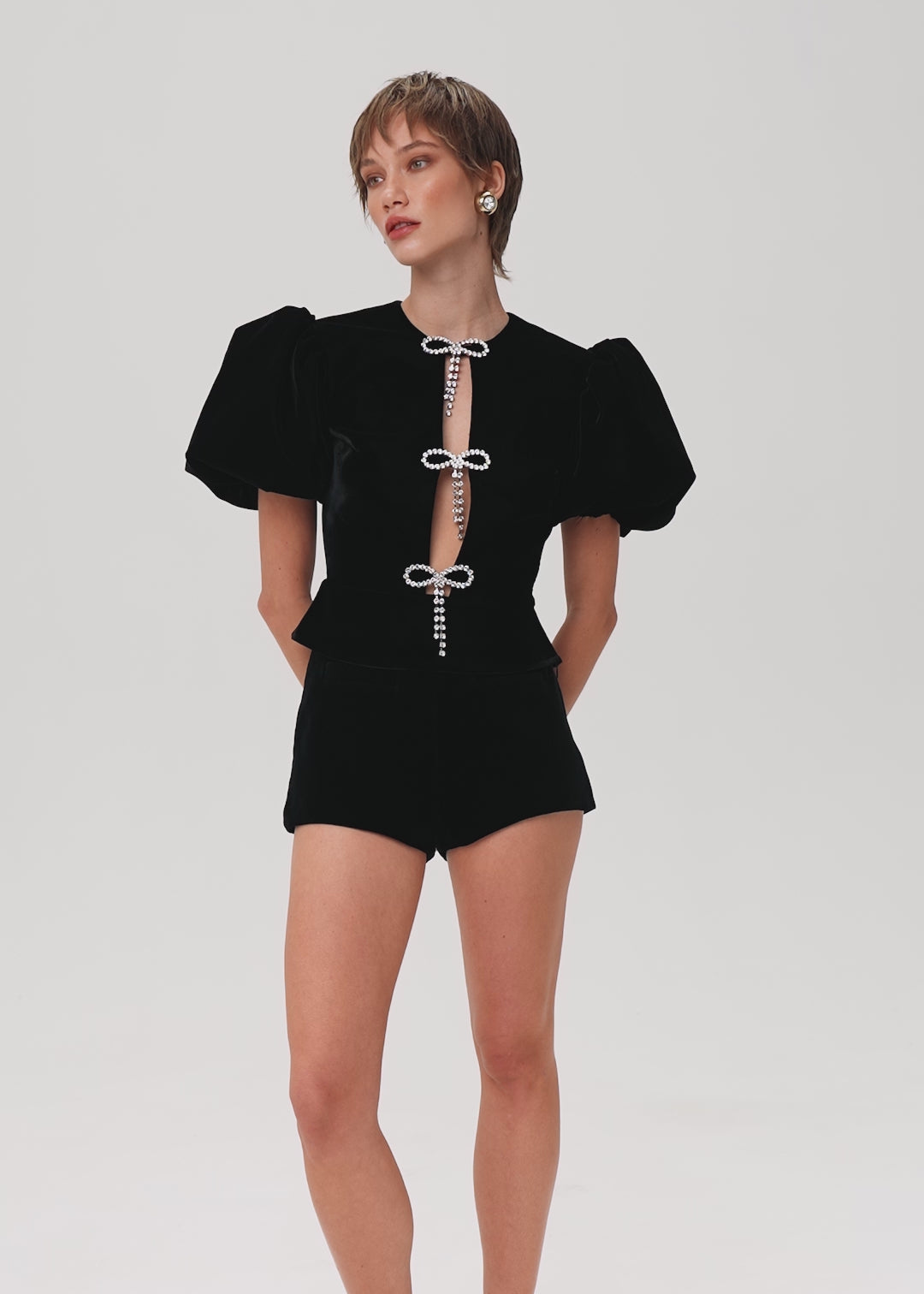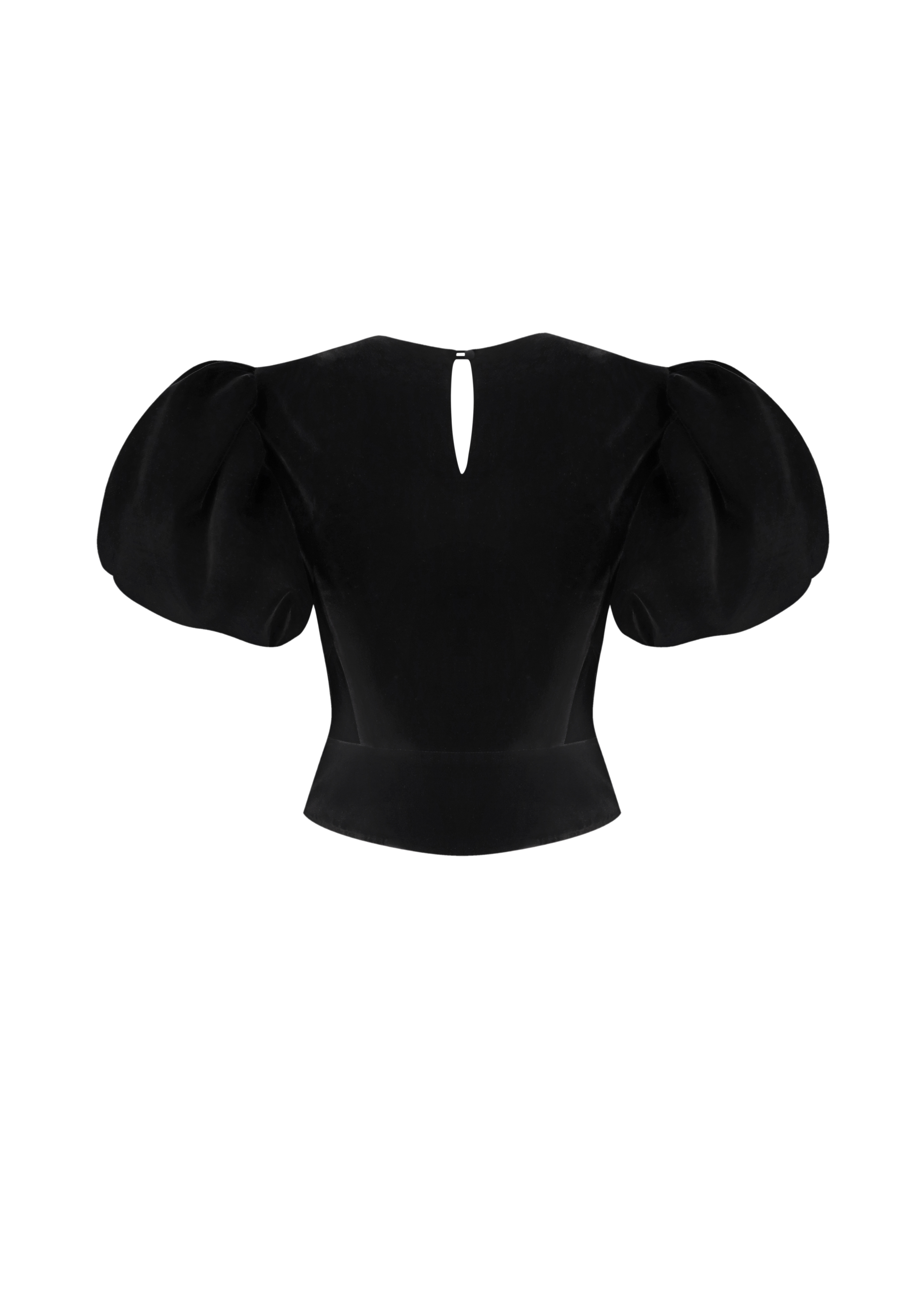 Meringue top crafted from luxurious black velvet. This top features romantic puff sleeves that enhance its feminine silhouette. Slightly fitted with a basque at the waist, it accentuates curves and emphasizes a flattering shape. A standout feature is the elegant cutout on the abdomen, adorned with mini sparkling bows and rhinestones, adding a touch of sophistication. The top is secured with an invisible side zipper and a button at the back, and is fully lined.
