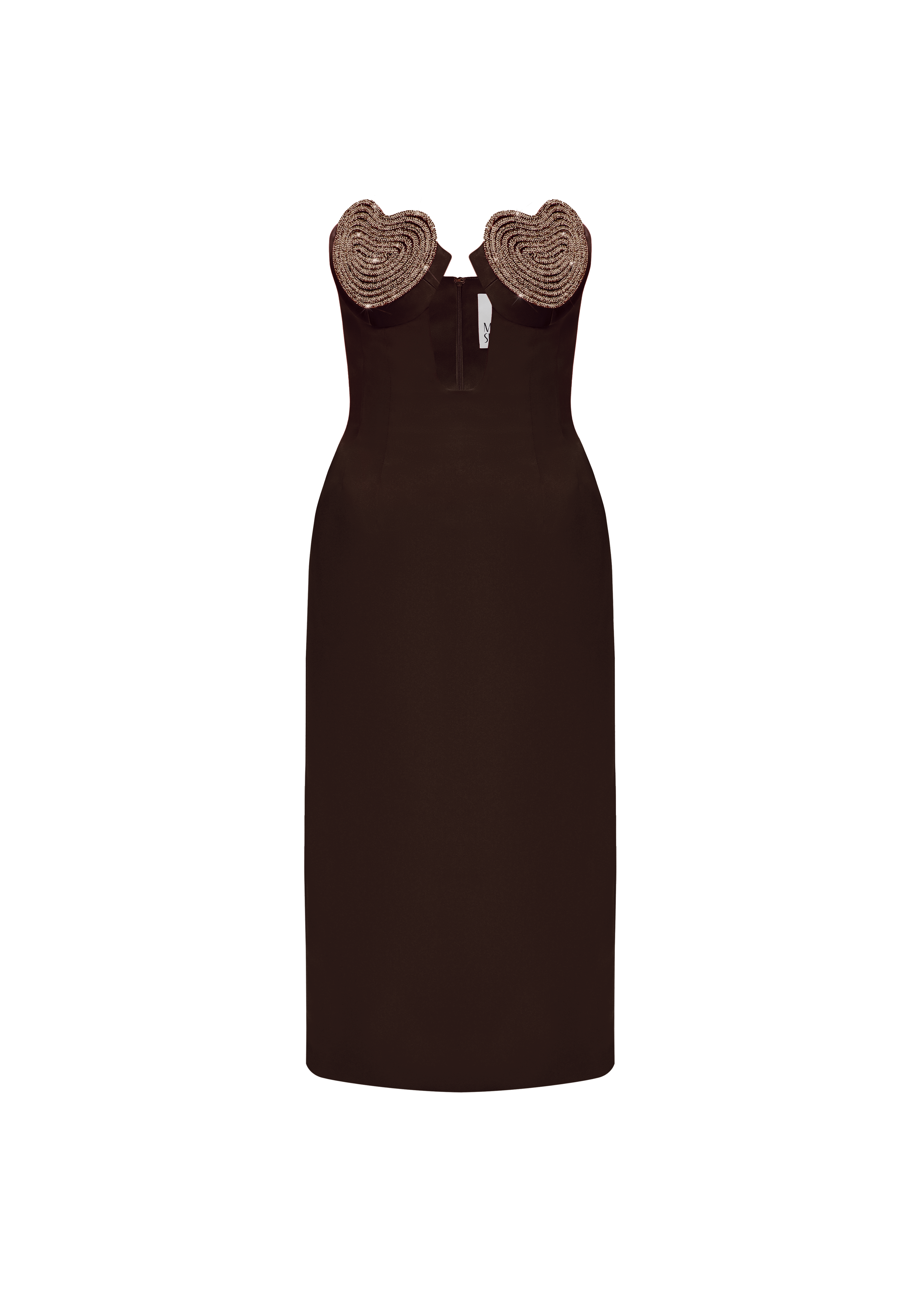Mermaid Midi Dress is a stunning addition to this season's collection, now in a rich Chocolate brown hue with matching brown crystals for an elegant twist. This strapless midi dress boasts a fitted bustier and inner corset, sculpting a tight-fitting silhouette that accentuates feminine curves with grace. The keyhole cutout at the bust adds allure, while meticulously handcrafted heart-shaped bustier cups adorned with sparkling crystals create a captivating focal point, connected by a transparent thread for a subtle yet glamorous effect. Fastened with a concealed back zipper and hook and eye closure, this dress ensures a seamless finish. Fully lined for utmost comfort.
