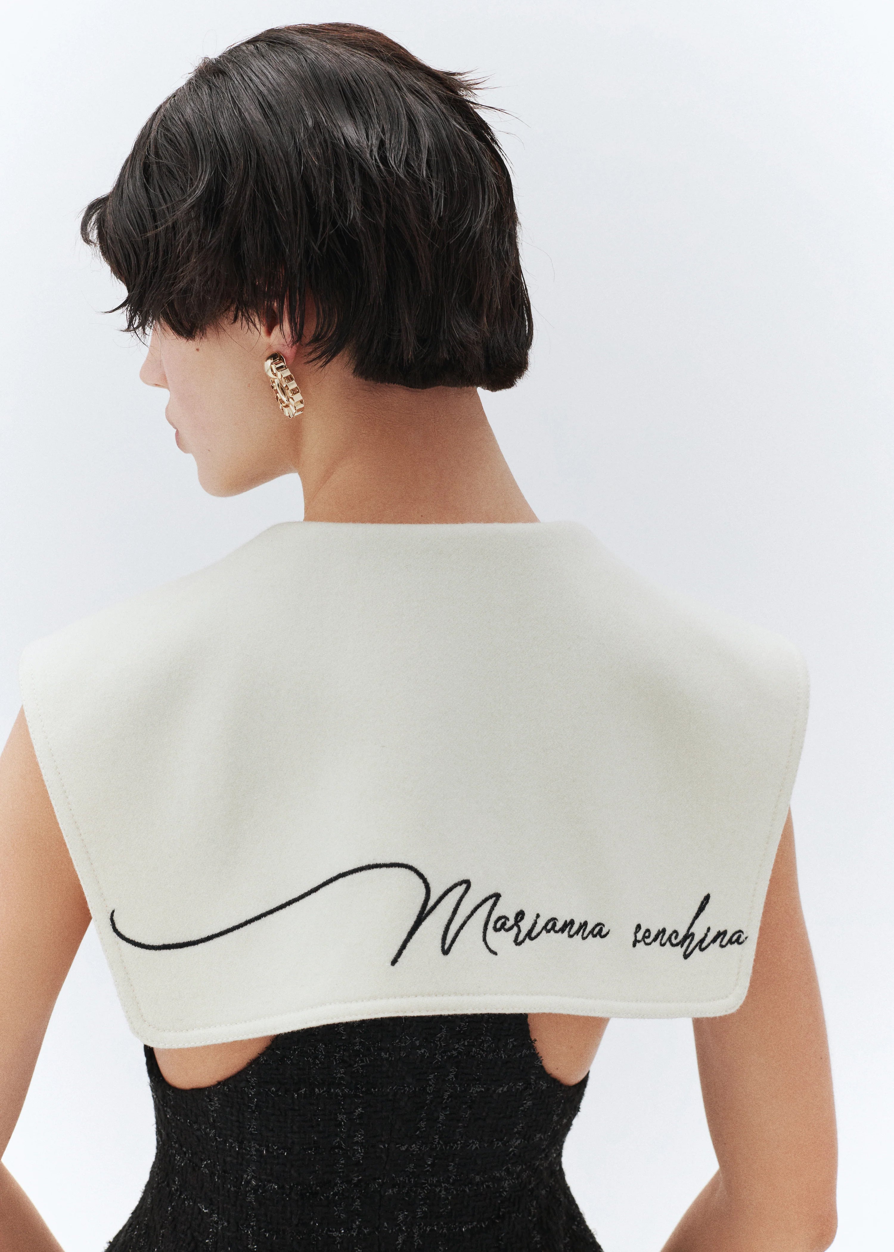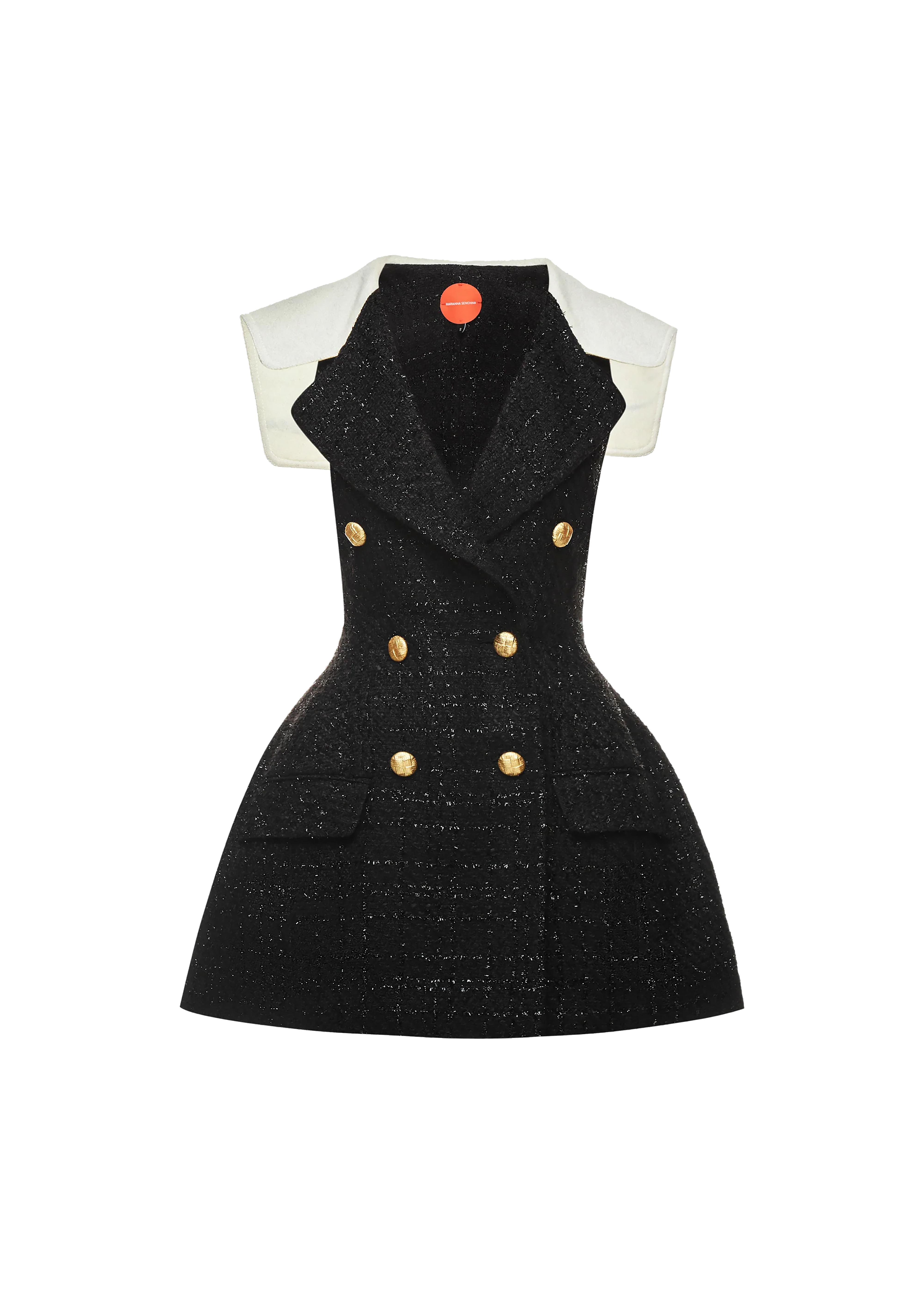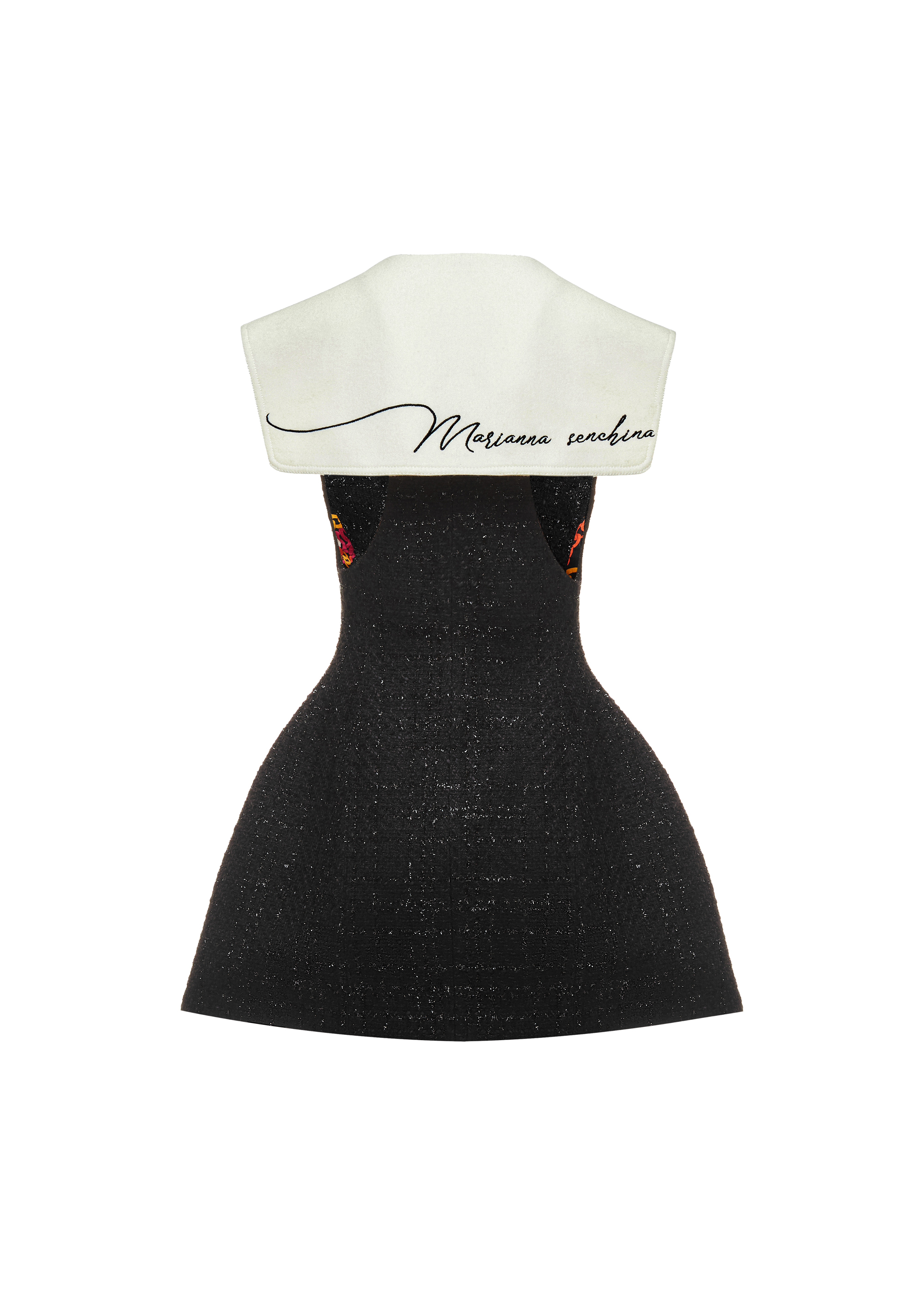 Open shoulder double breasted jacket-dress with Marianna Senchina inscription on the sailor collar.