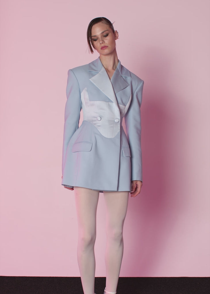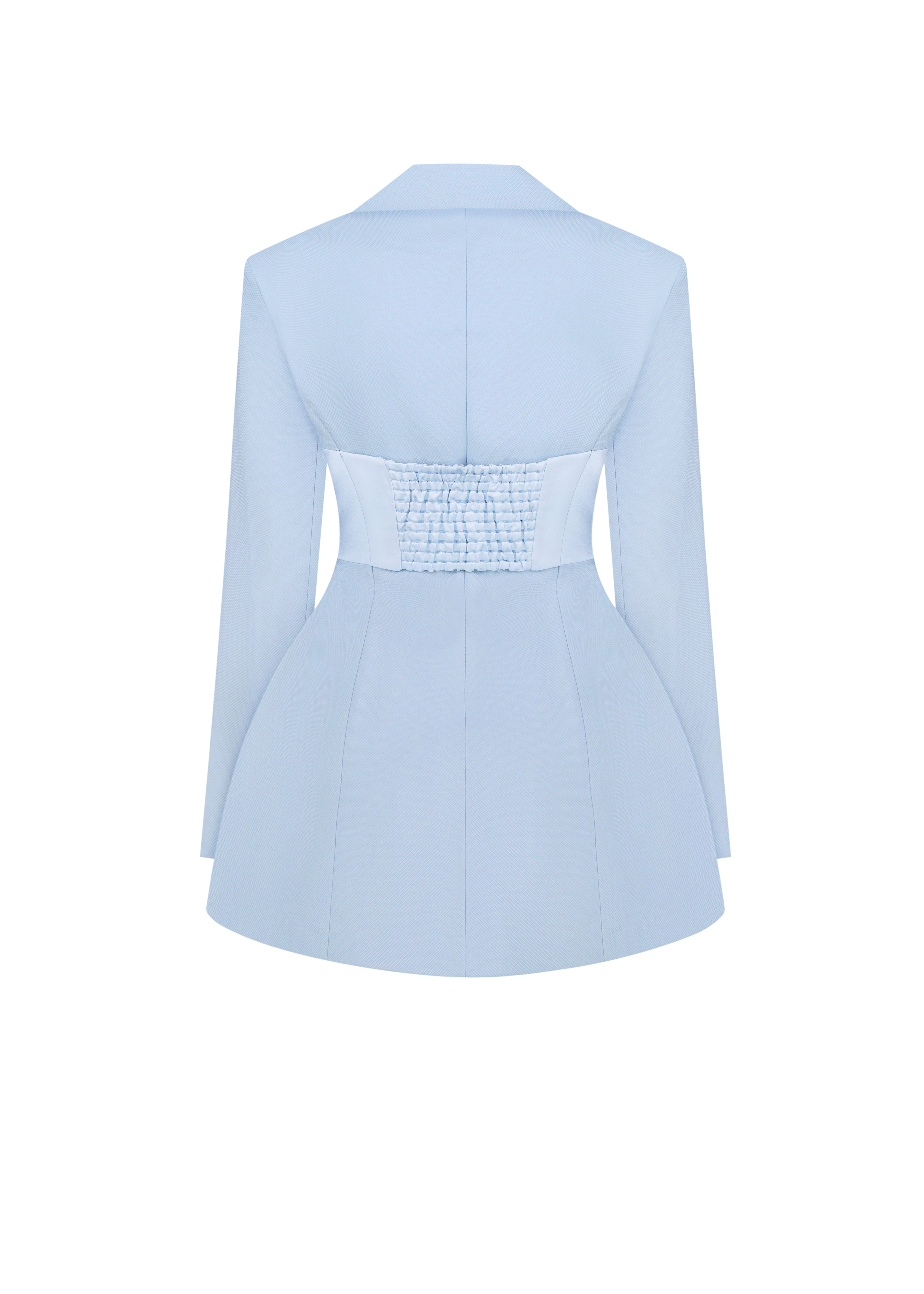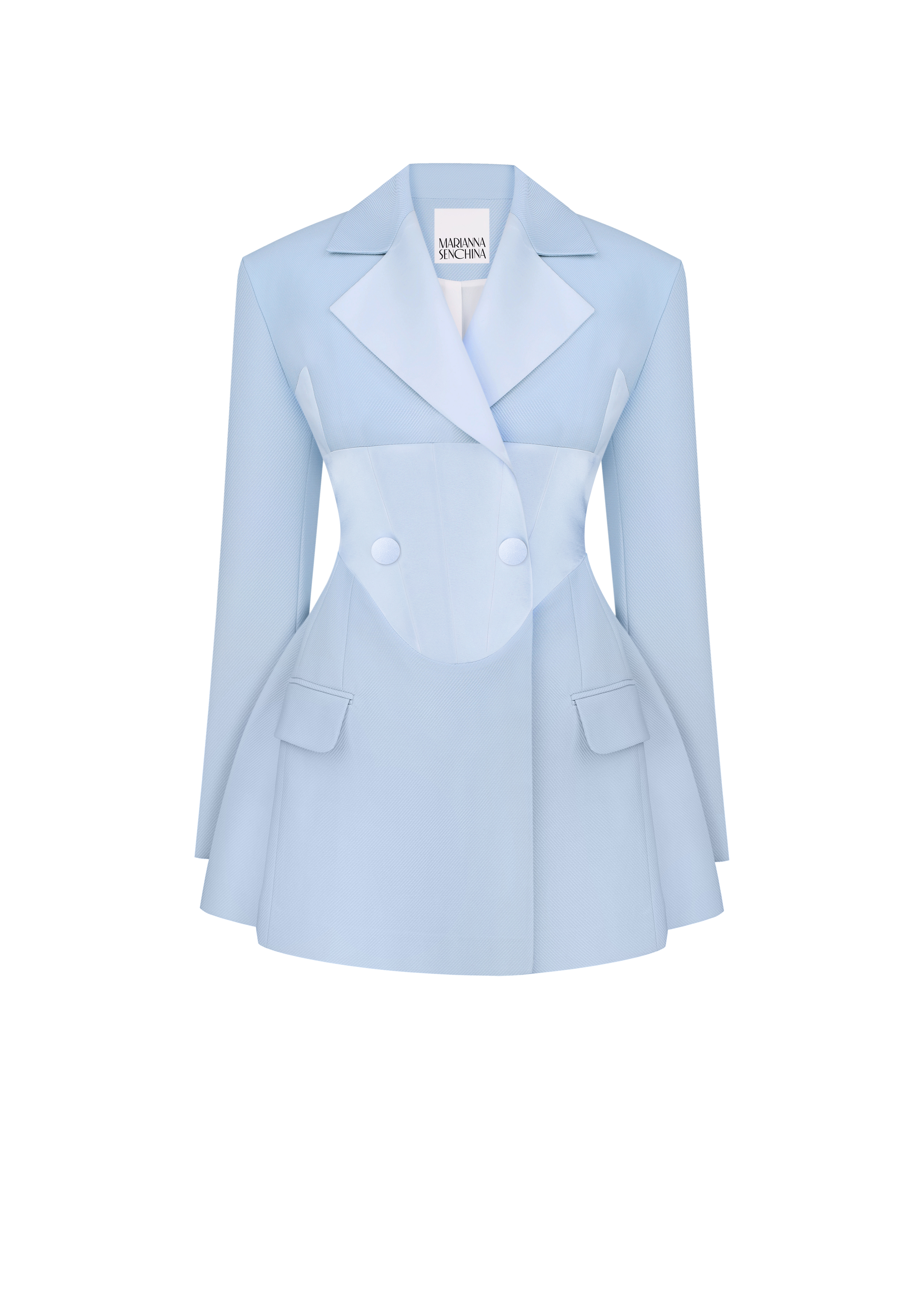 Swan jacket-dress features a satin corset that cinches the waist beautifully, creating a flattering silhouette, an elegant V neckline, padded shoulders, wide collar, and notched lapels. The corset detail and gracefully curved hemline further elevate its style, exuding elegance from every angle. Fastened with two snap buttons. The A-silhouette skirt and decorative flaps add an exquisite touch, while the elastic inserts on the back ensure a comfortable fit. Fully lined.