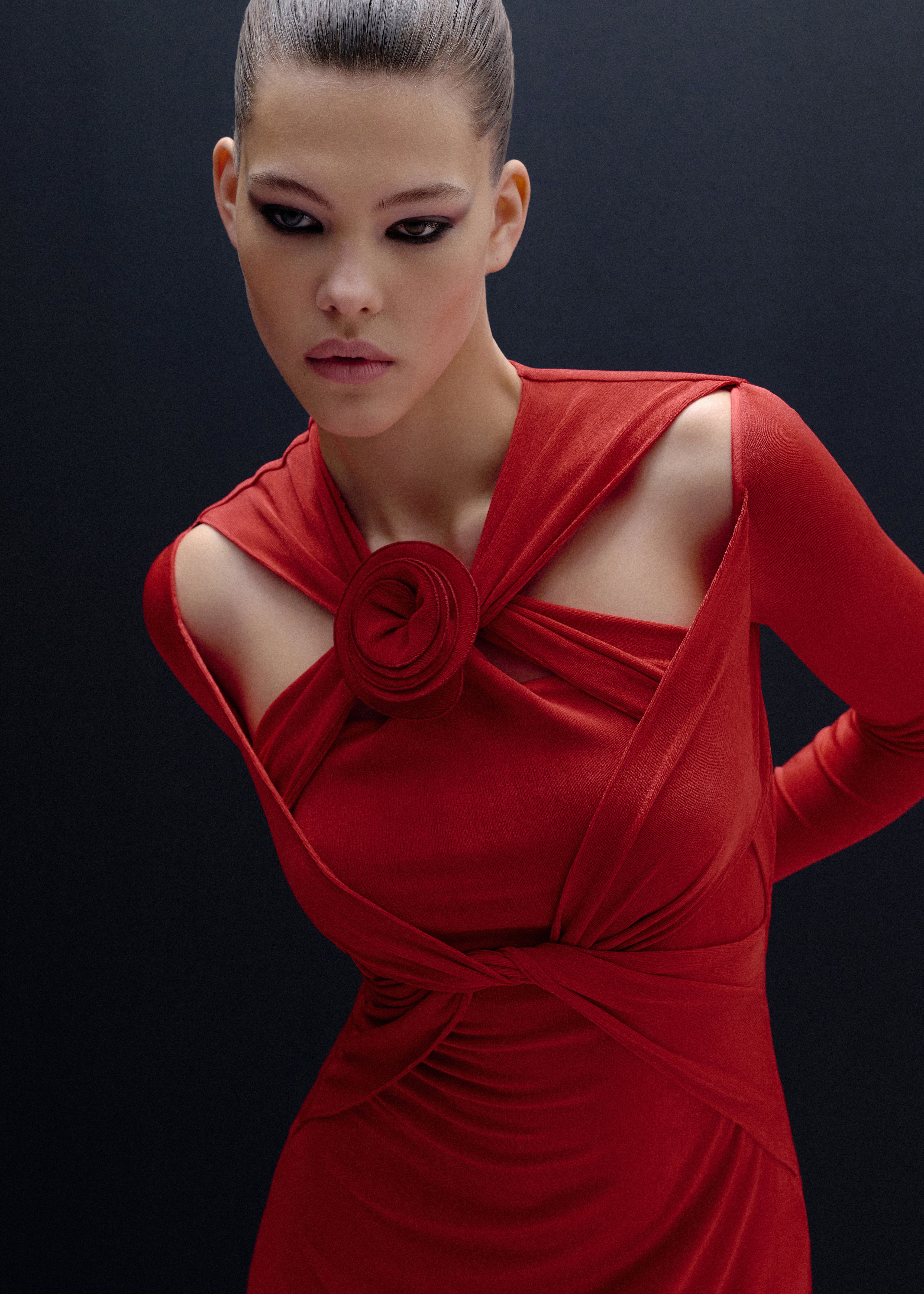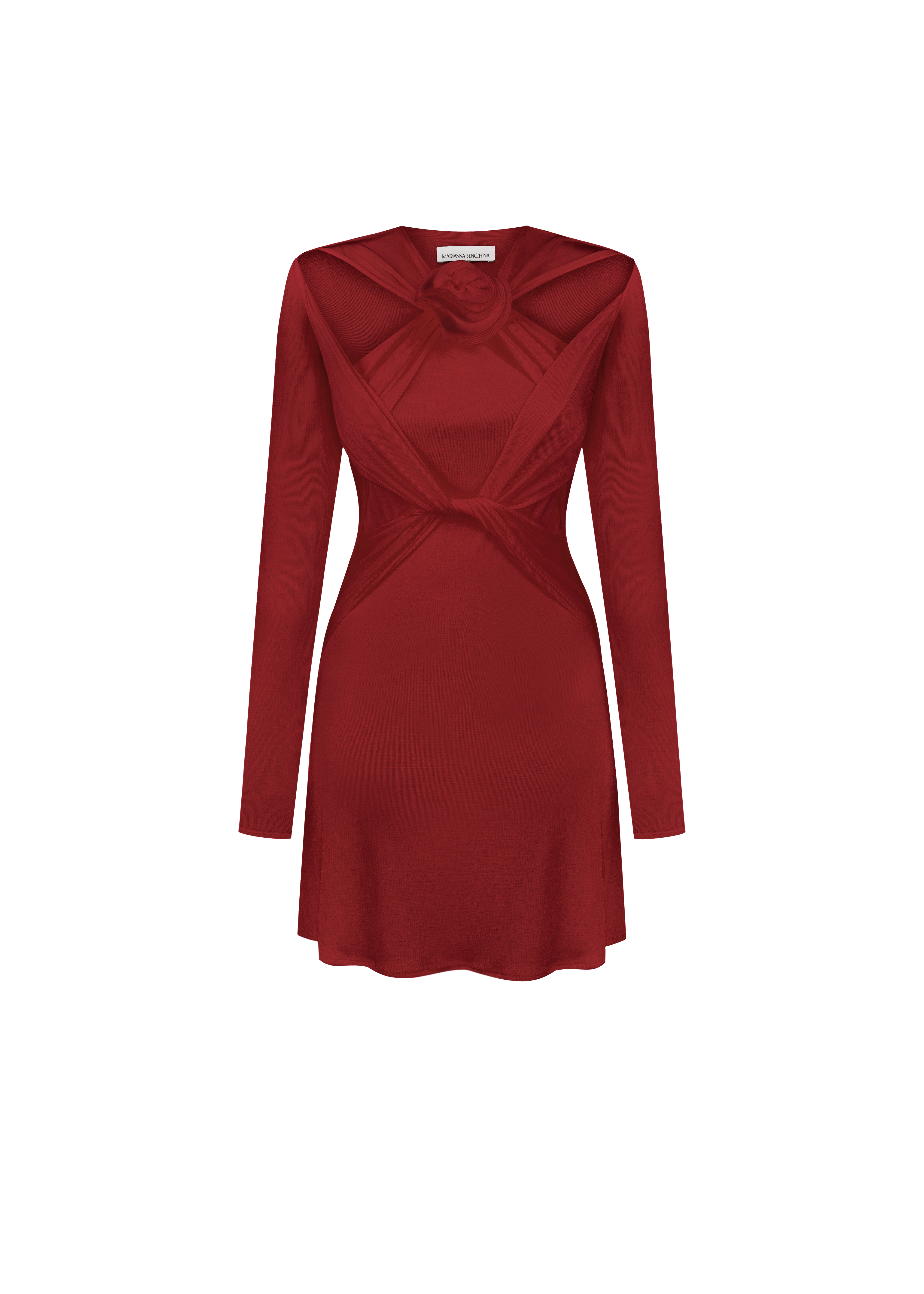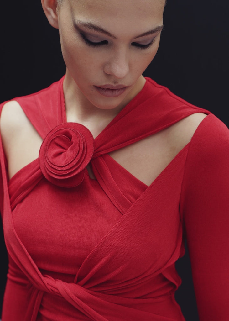 The Camelia Dress is presented in the trendy ruby red hue. This long sleeve mini dress seamlessly combines modern elegance with comfort, offering a sophisticated yet effortless look. Adorned with chic cutouts and intricate knot details, complemented by a handmade flower accent, it exudes charm and individuality. Perfect for those who seek a fusion of simplicity and striking details in their wardrobe, the Camelia Dress is sure to make a lasting impression at any occasion.
