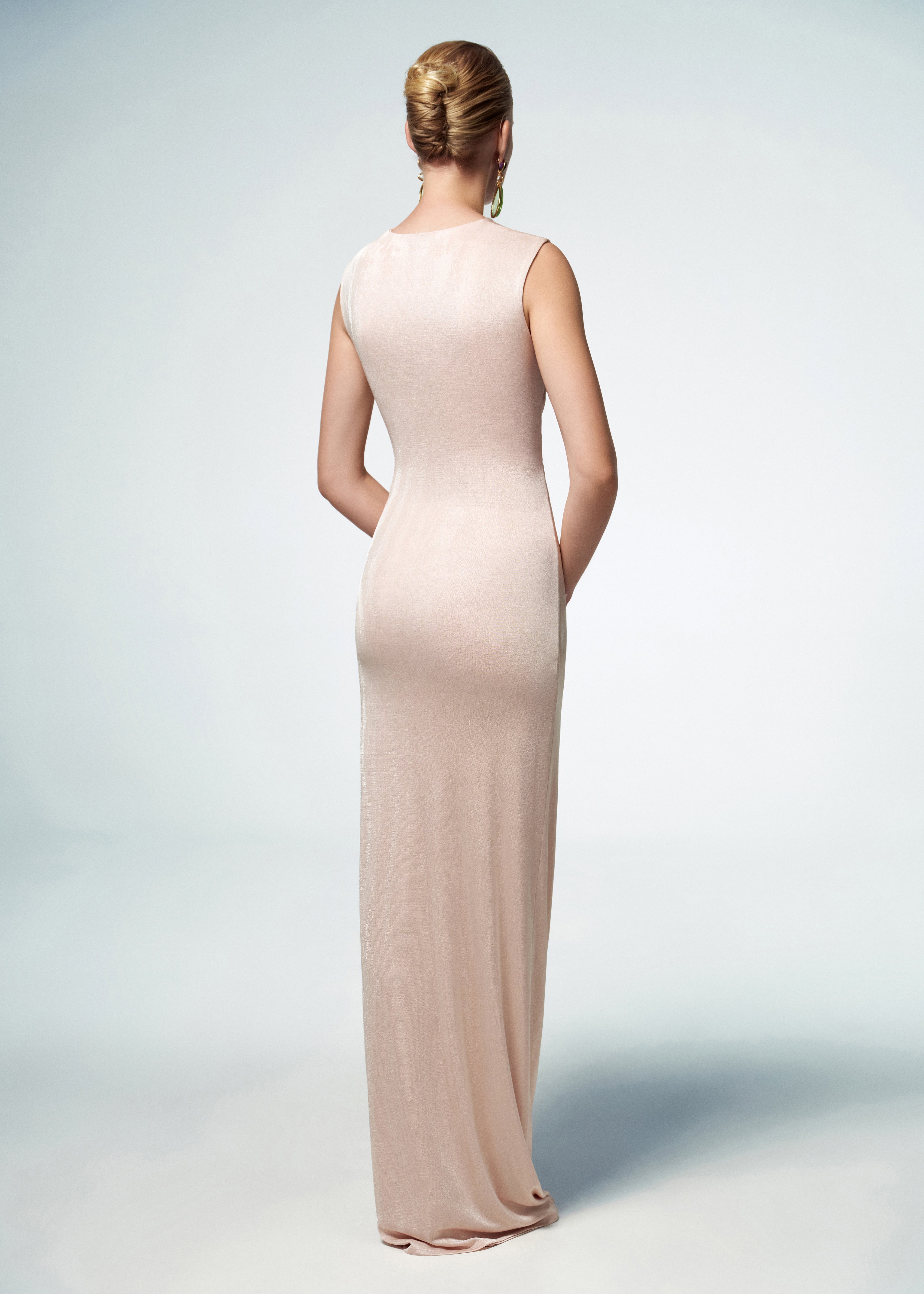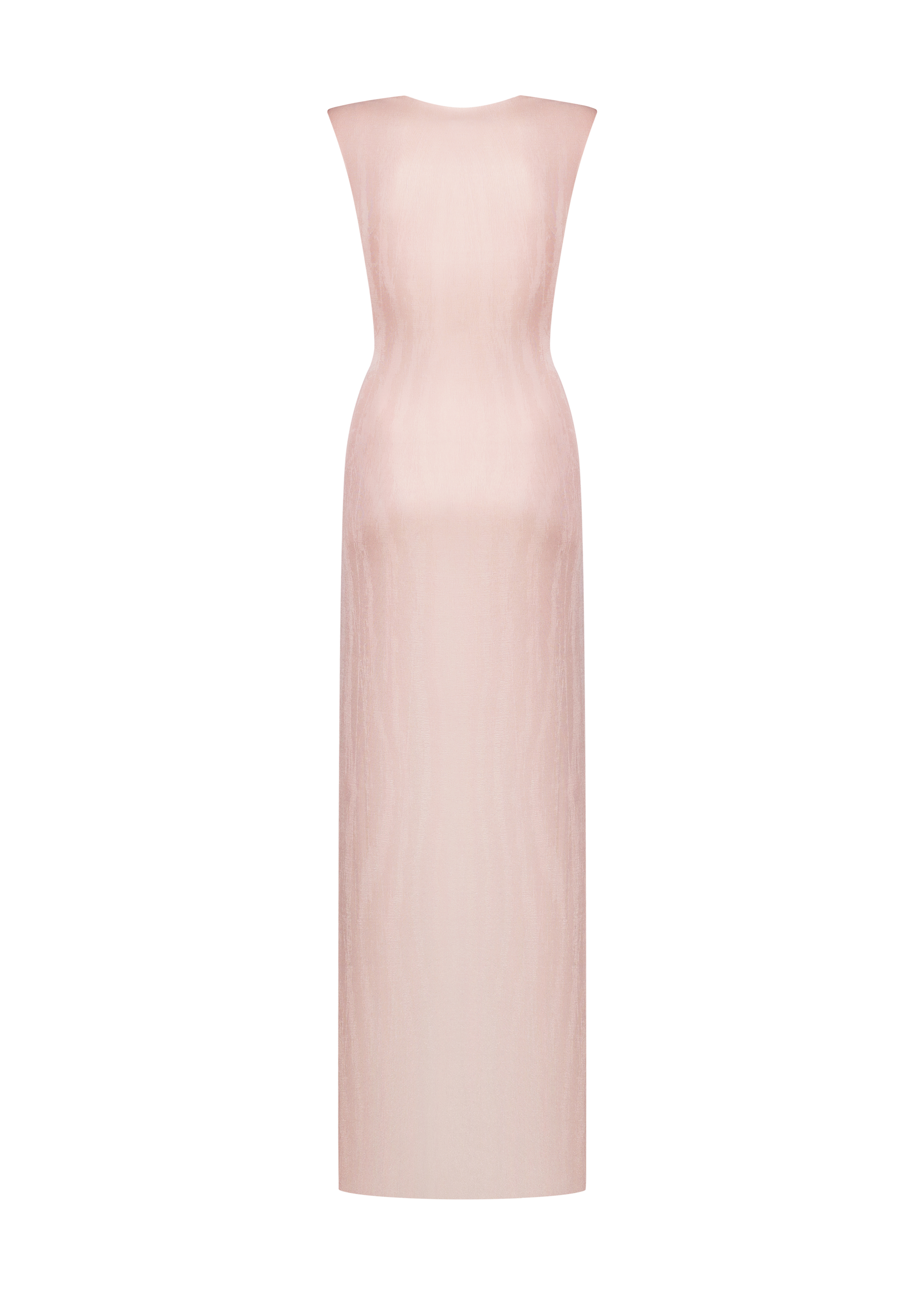 Tender dress in a soft champagne color. Sleeveless maxi dress features chic cutouts adorned with handcrafted flowers, that bring a touch of sophistication to a minimalist design. Ideal for those who embrace effortless style with unique accents.