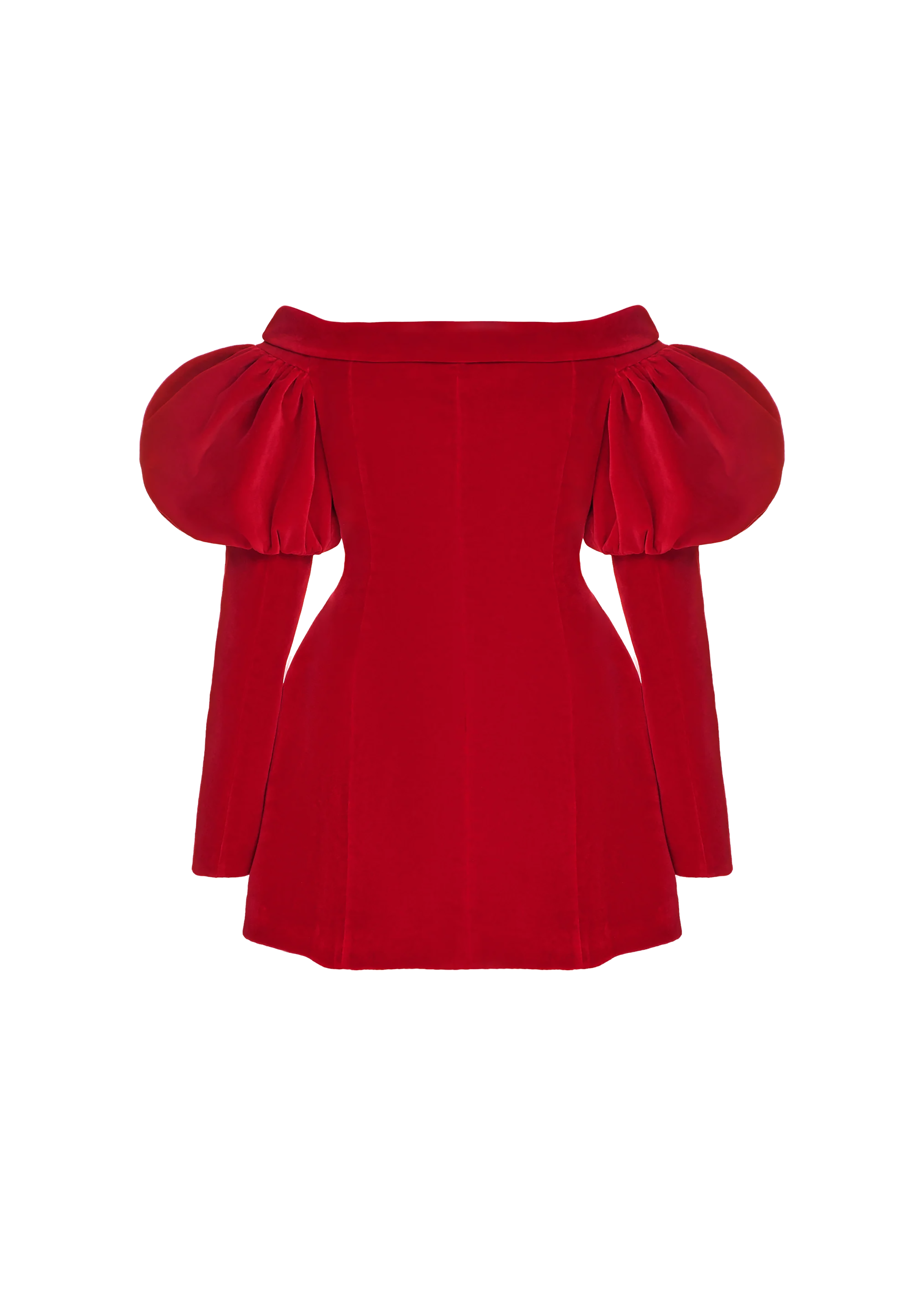 Signature off-the-shoulder velvet jacket-dress with buff-sleeves.