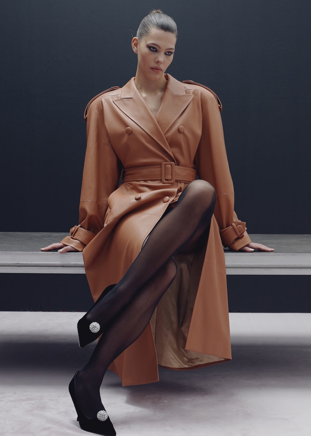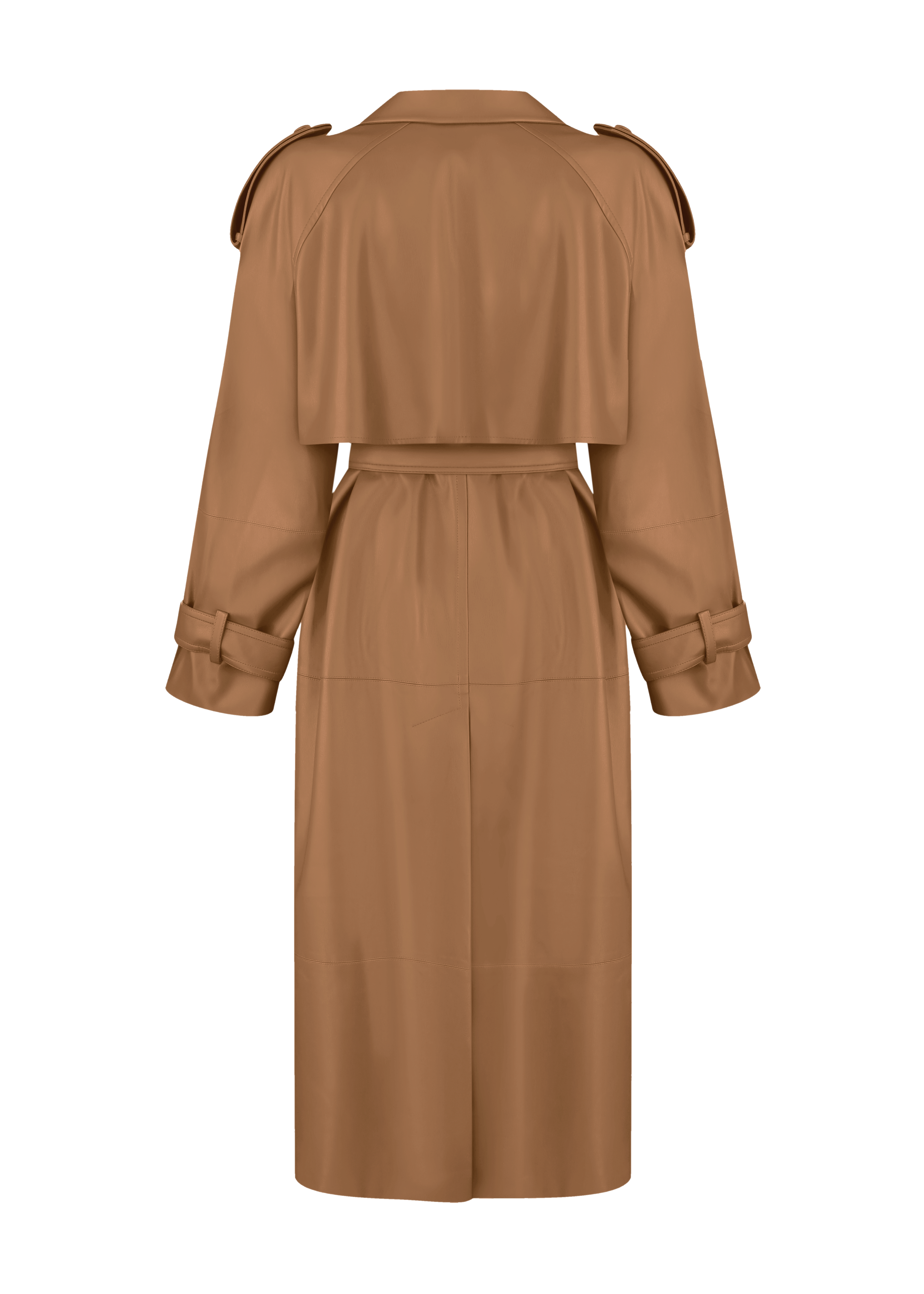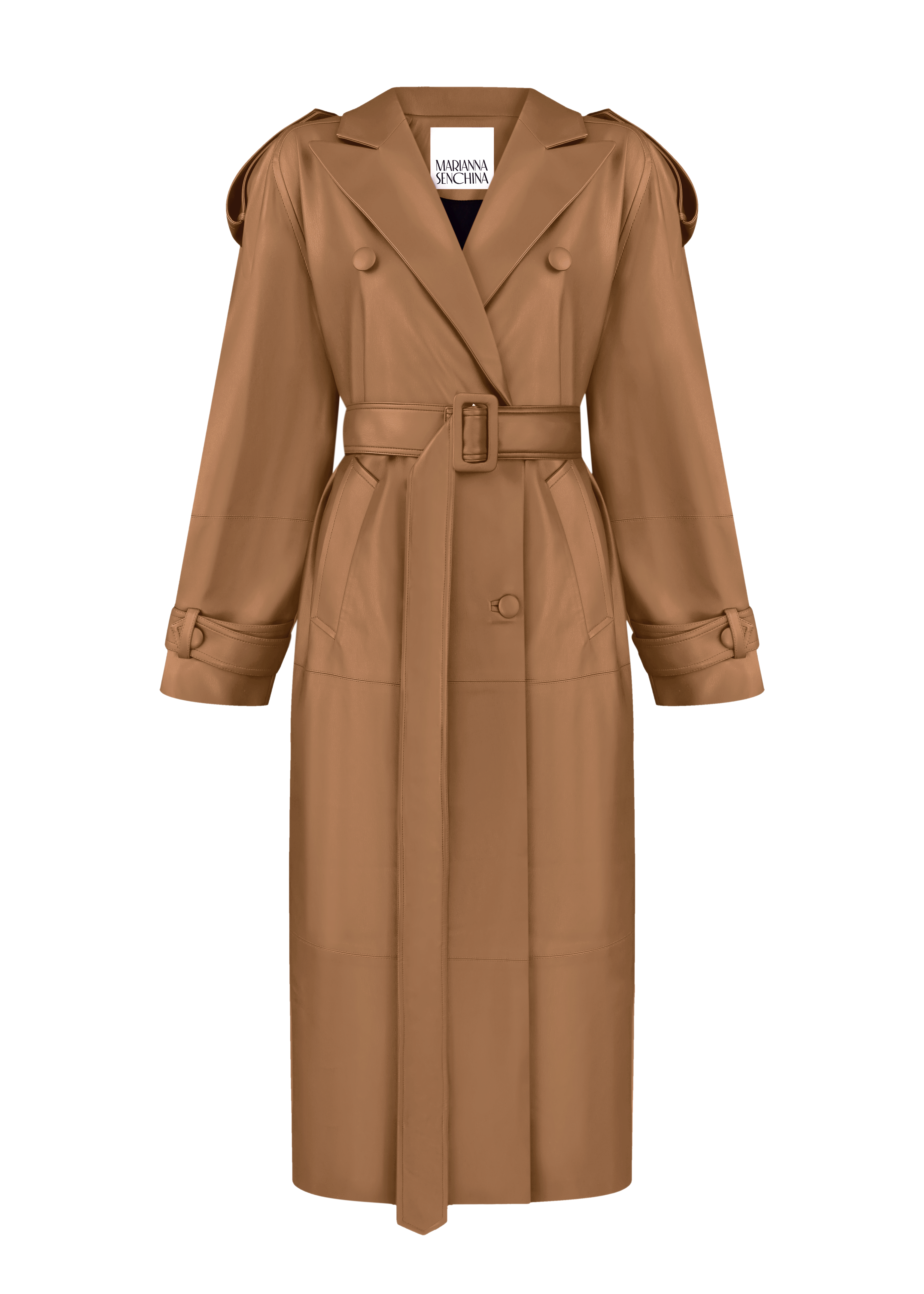 Crafted in luxurious hazelnut eco-leather, this oversized double-breasted long coat is a bold statement piece. It features raglan padded shoulders, notched lapels, and a belted waist that cinches for a defined silhouette. The coat is detailed with buttoned epaulettes, strapped cuffs, and a decorative strap for a commanding look. Slip pockets on the sides add functionality, while its maxi length enhances its dramatic flair. Fastened with buttons, this coat merges classic tailoring with modern edge.