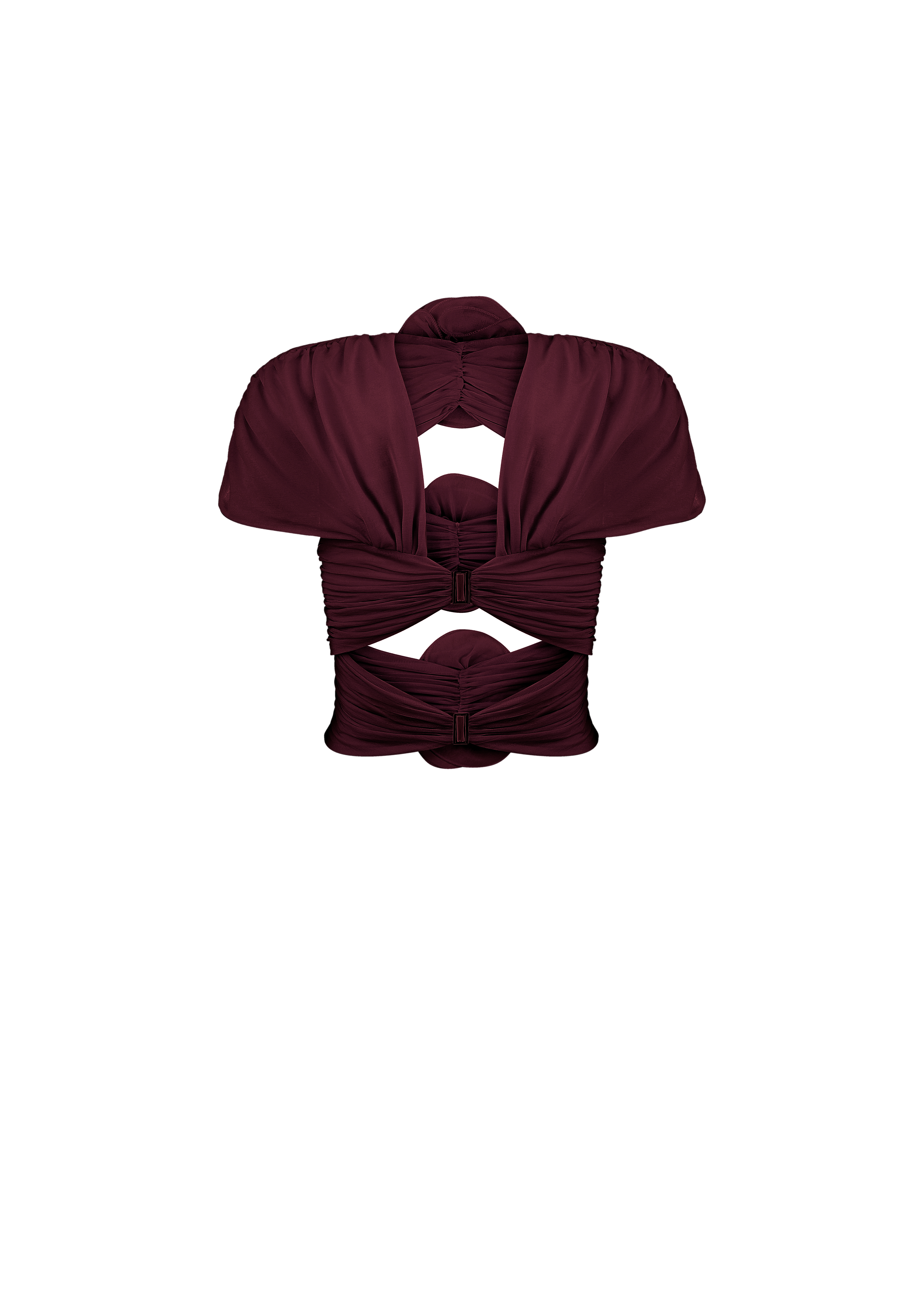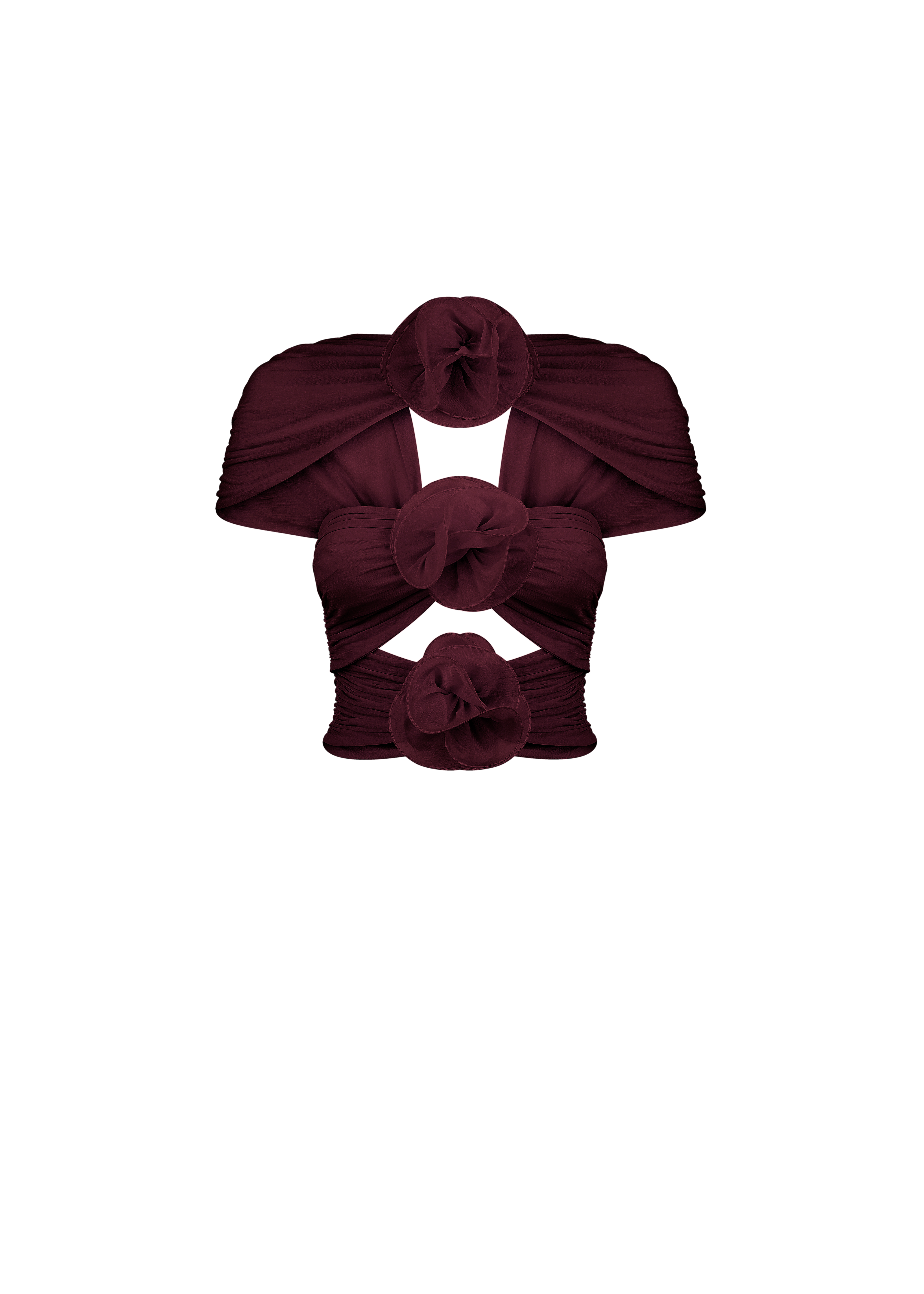 Wild Orchid ruched top, a captivating blend of modern elegance and delicate femininity. Crafted in a mulberry hue, this top showcases refined ruched detailing that beautifully contours the body. What truly sets it apart are the intricate cutouts adorned with handcrafted flowers, adding a bold and unique touch. Fastened with magnetic closures on the back.