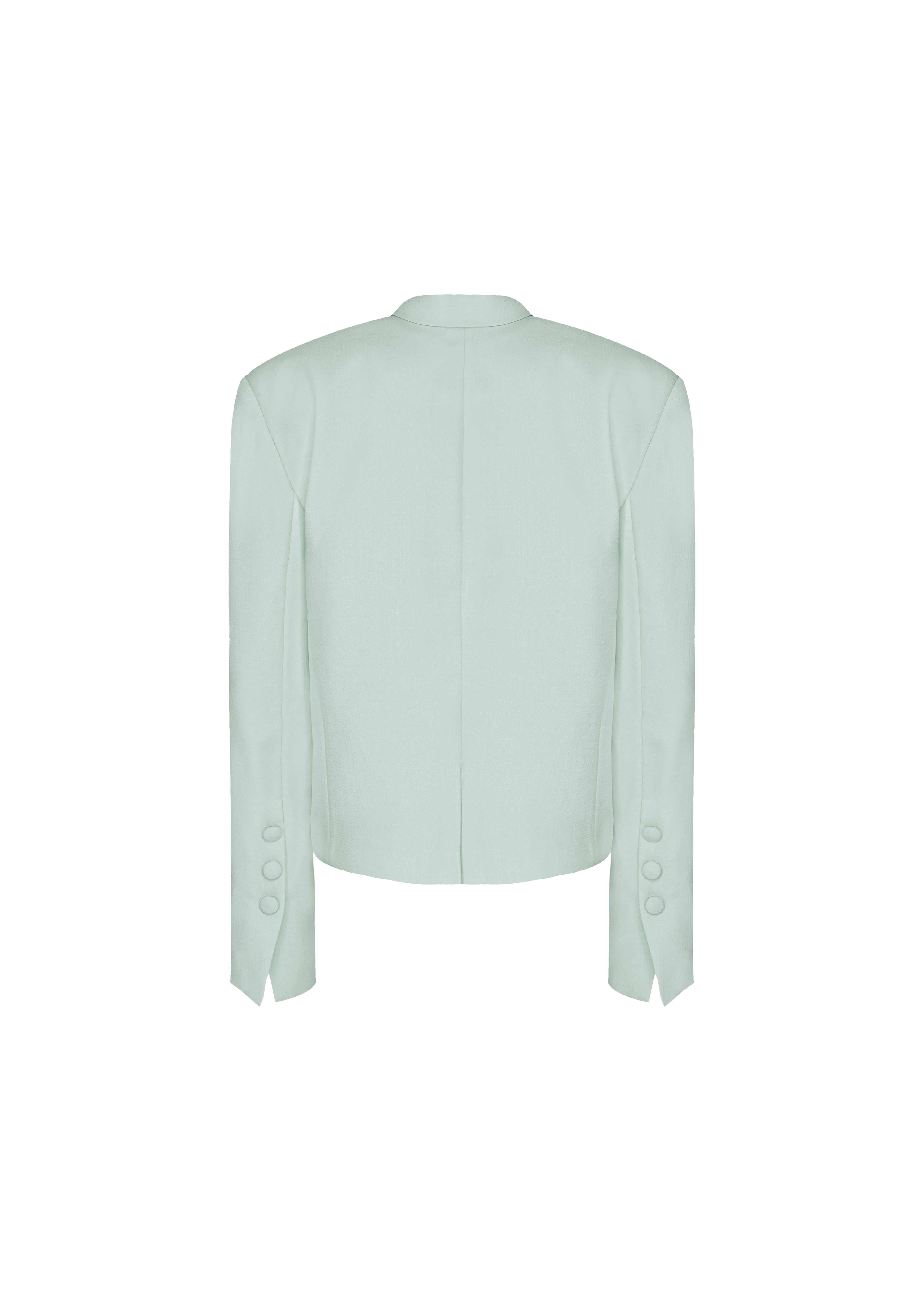 Oversized double-breasted Linda jacket in pistachio shade, featuring a classic straight silhouette with padded shoulders and notched lapels for a timeless look. The jacket is adorned with decorative buttons on the cuffs and fastens with a single fabric-covered button and a nacreous snap button inside. Two welt pockets with flap and the broad welt pocket is a practical and stylish addition, with the latter featuring a decorative polka-dot handkerchief. Fully lined.