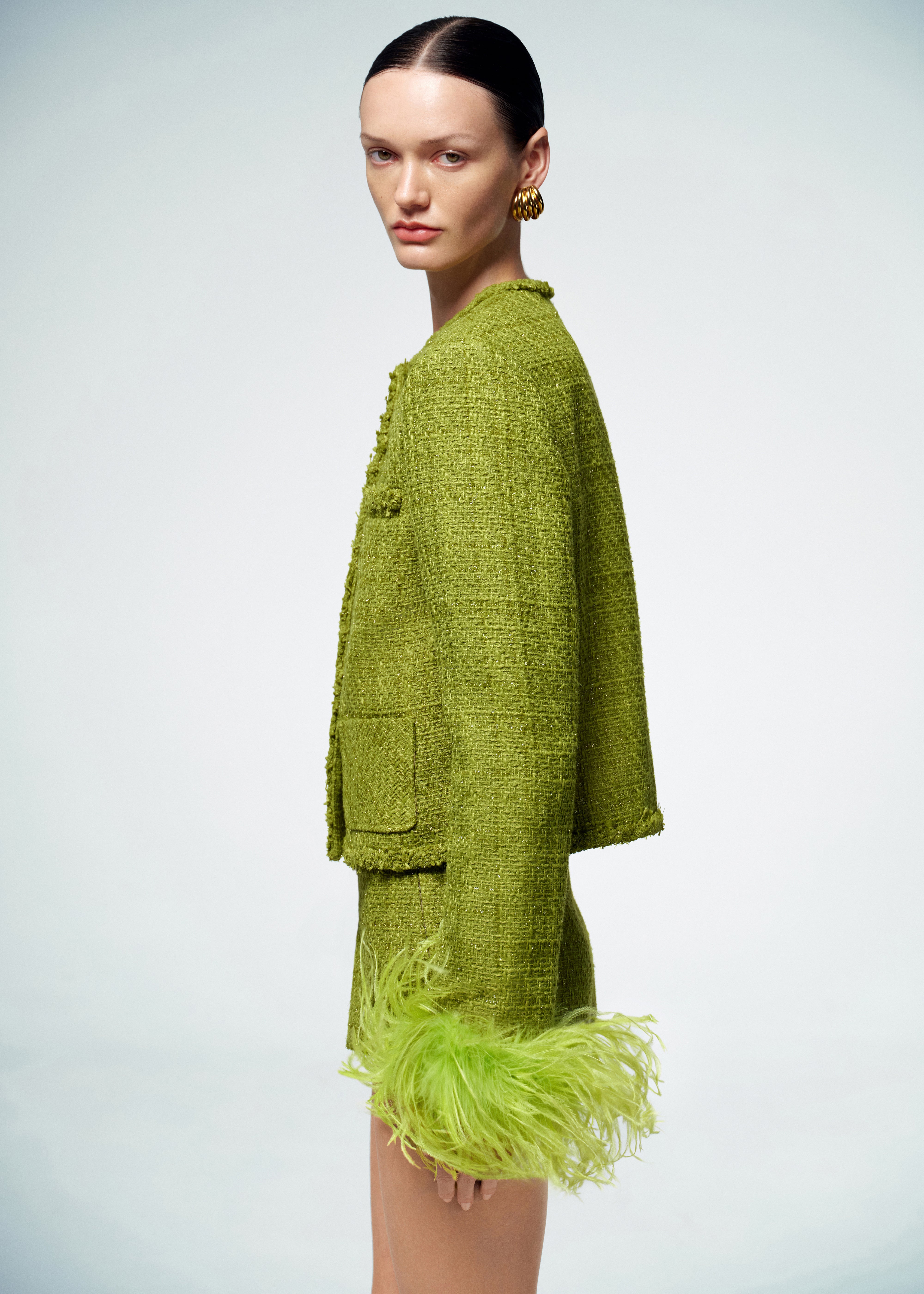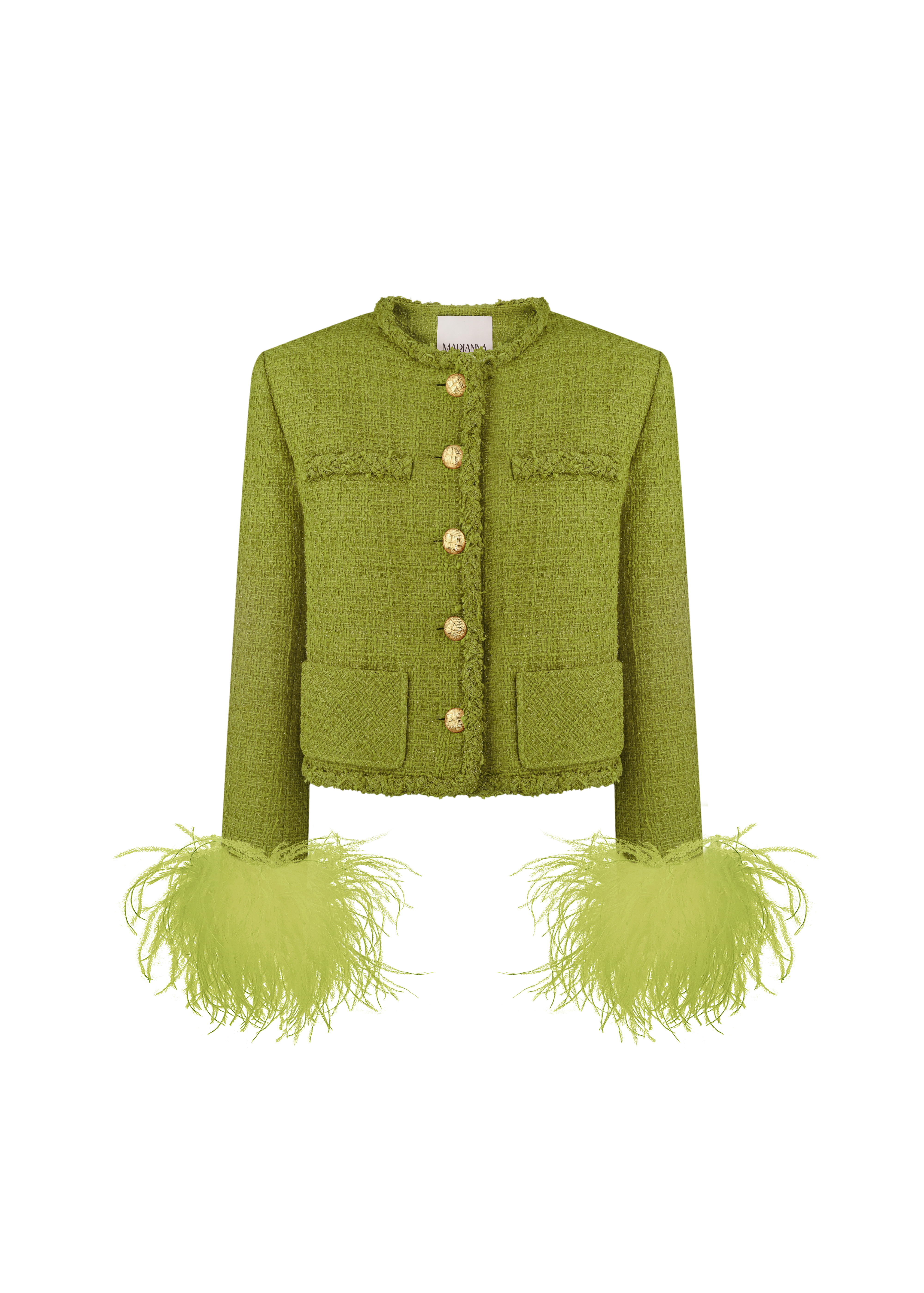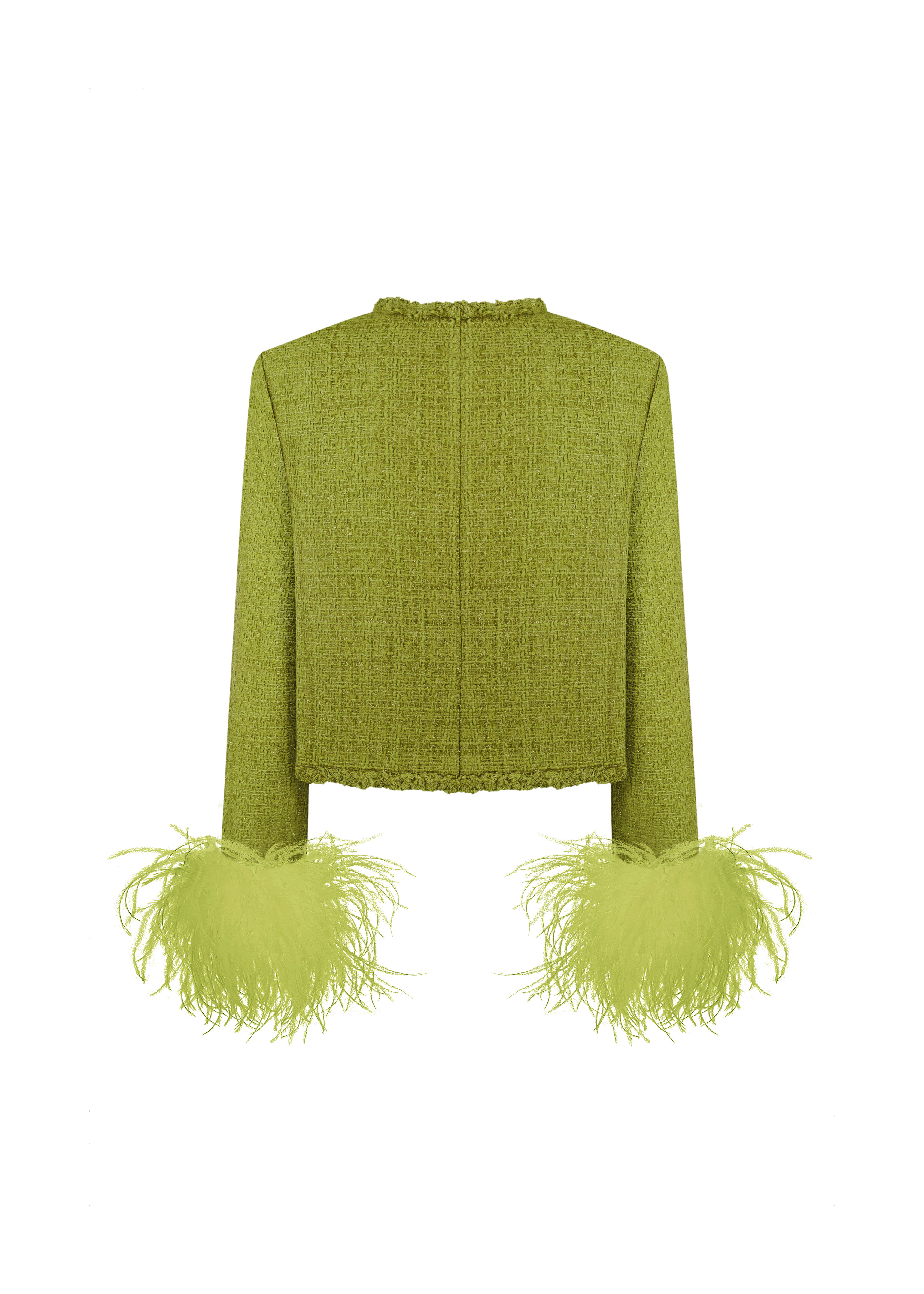 Scarlett jacket crafted from tweed with lurex in trendy matcha color. Single-breasted, with padded shoulders and extended sleeves. Delicate green feathers adorn the sleeves, infusing the jacket with a touch of allure and charm. Meticulously designed, the jacket features patch pockets and imitation broad welt pockets, offering both style and functionality. It is fastened with gold metal buttons at the front, completing the polished look. Fully lined.