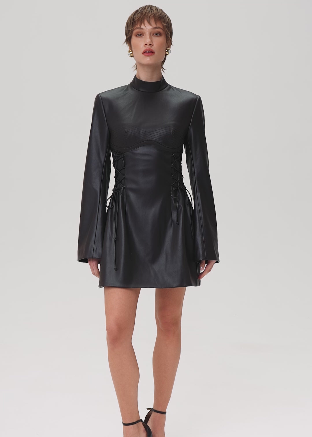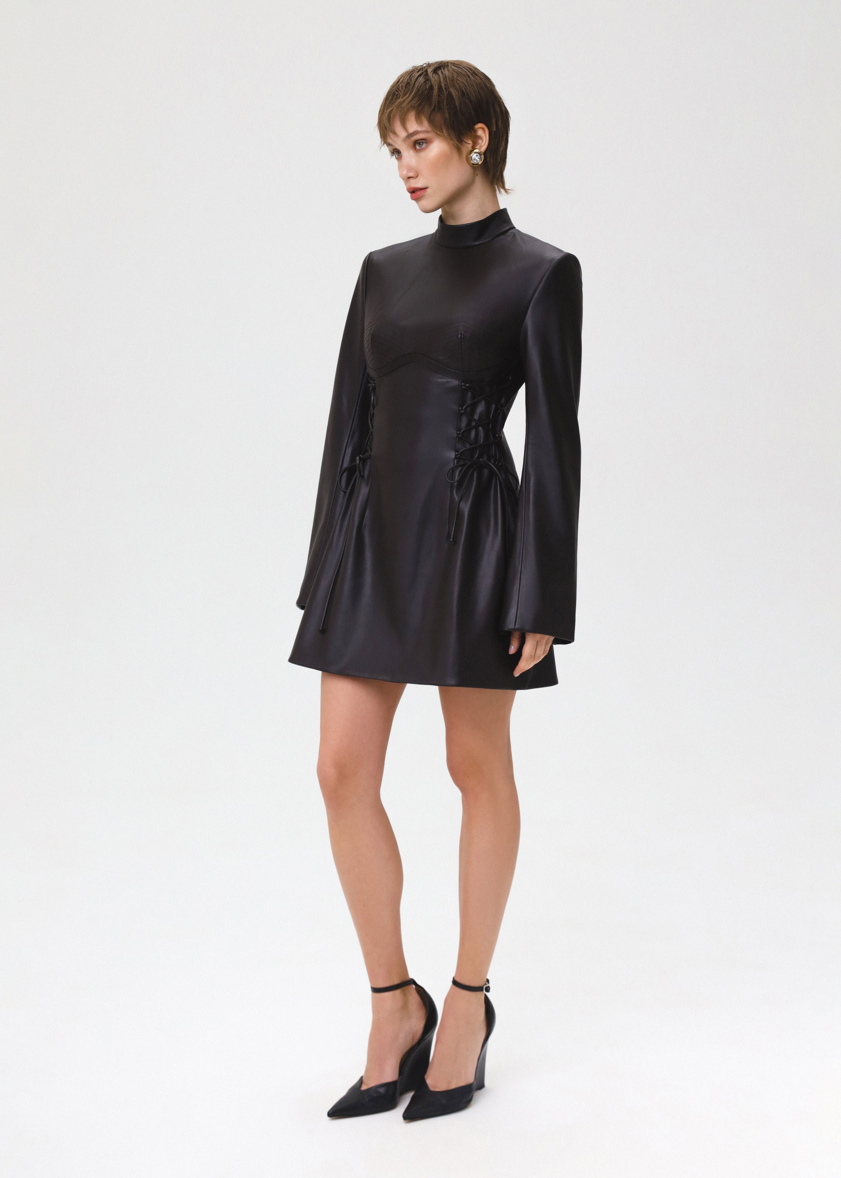 Step into the spotlight with our Badass Girl dress – a statement piece designed for the bold and fearless. Long sleeve dress, crafted from eco-leather in a rich dark brown hue, exudes an attitude that commands attention. Featuring the turtleneck and lace-up details, creating a look that's both edgy and empowering. Decorative stitching enhances the dress's unique character, ensuring you stand out with every step. Fully lined. Fastened with a concealed back zipper.