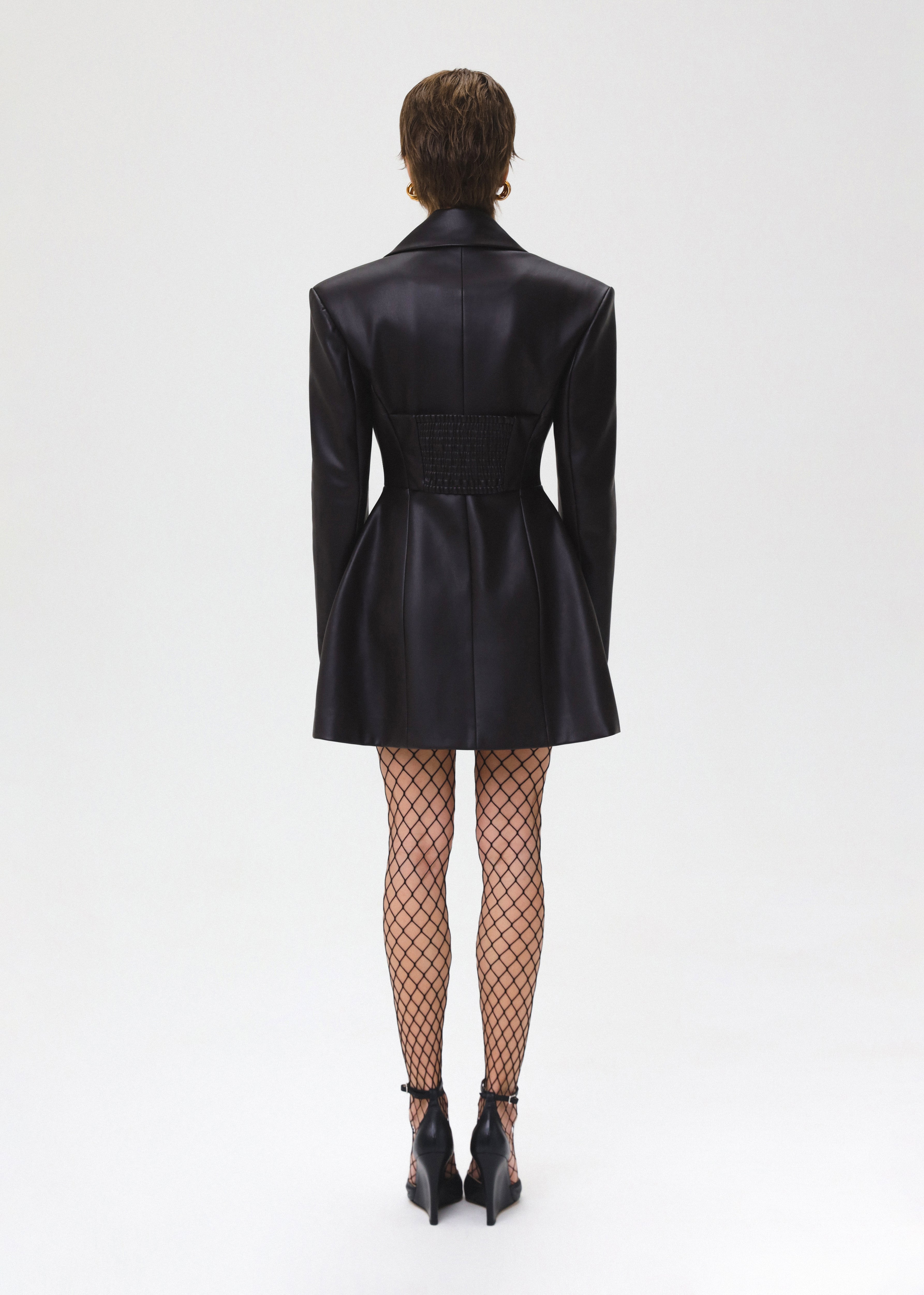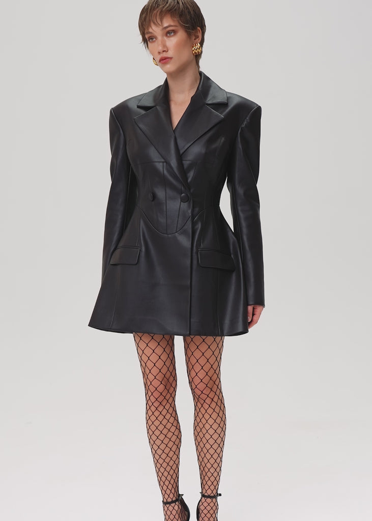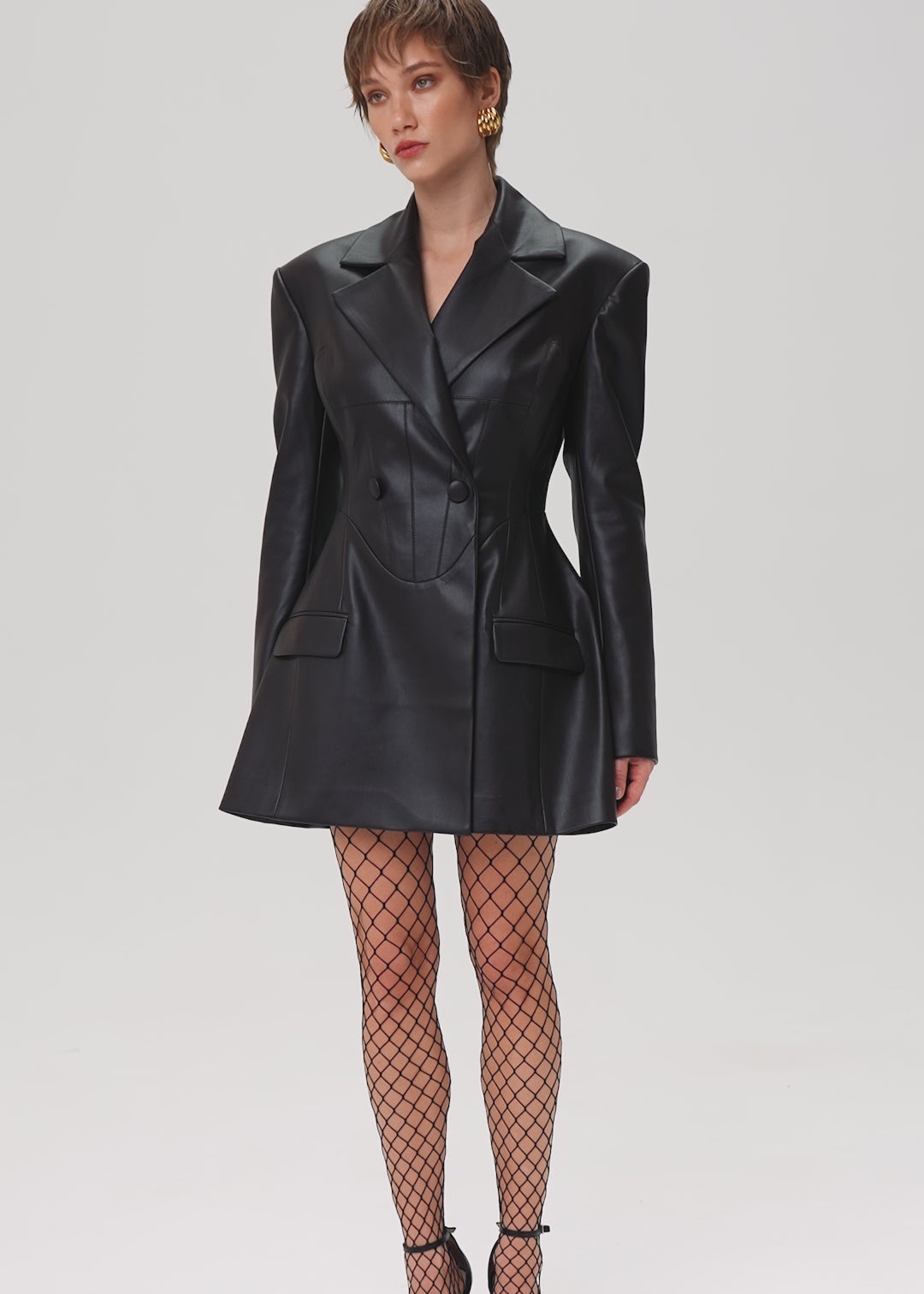 Swan leather jacket-dress in rich dark brown eco-leather. Corset that beautifully cinches the waist, enhancing a flattering silhouette with a V neckline, padded shoulders, a wide collar, and notched lapels. The corset detail and gracefully curved hemline elevate its sophisticated style. Fastened with two snap buttons, the A-line skirt and decorative flaps add a refined touch, while elastic inserts at the back provide a comfortable, tailored fit. Fully lined.