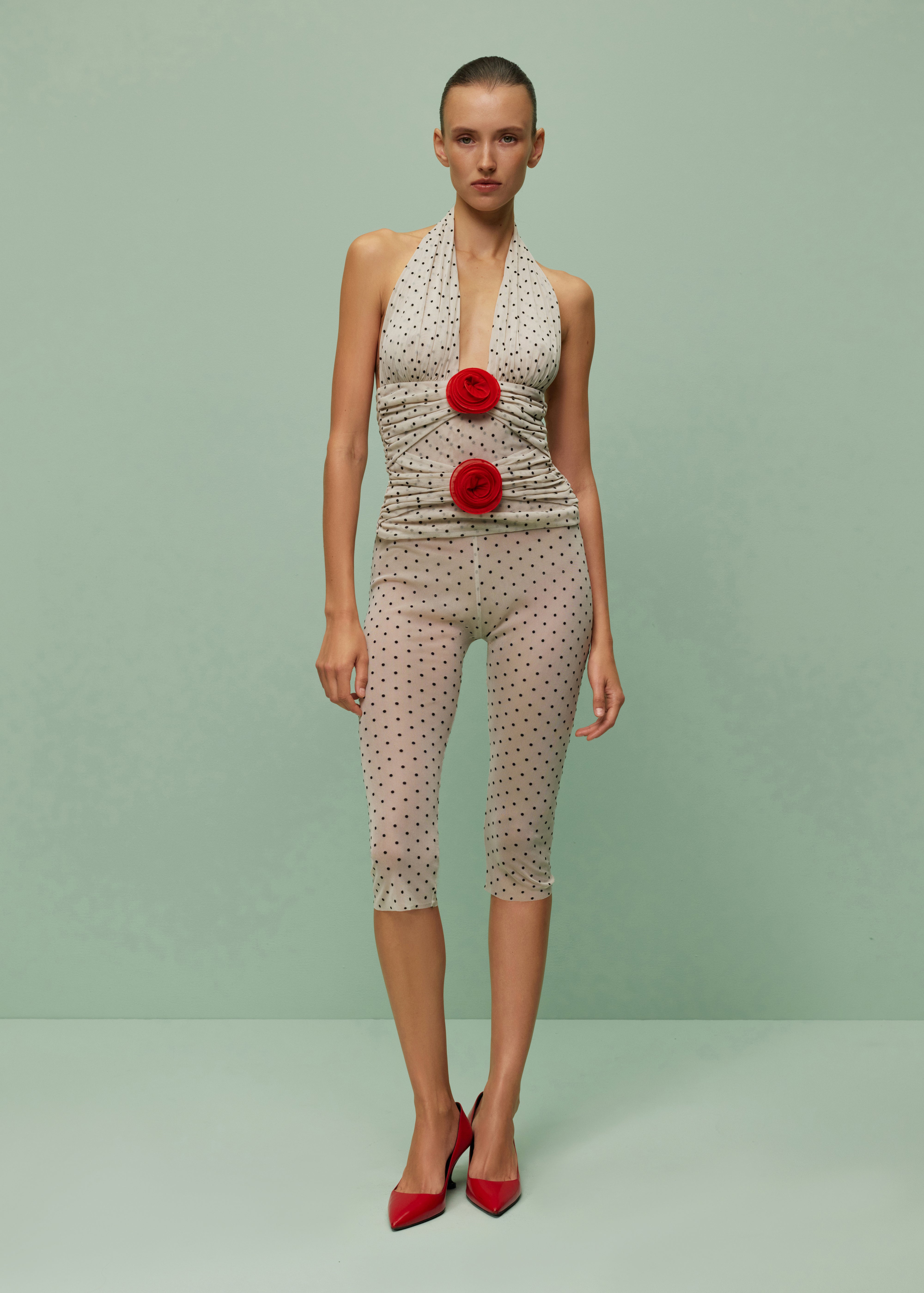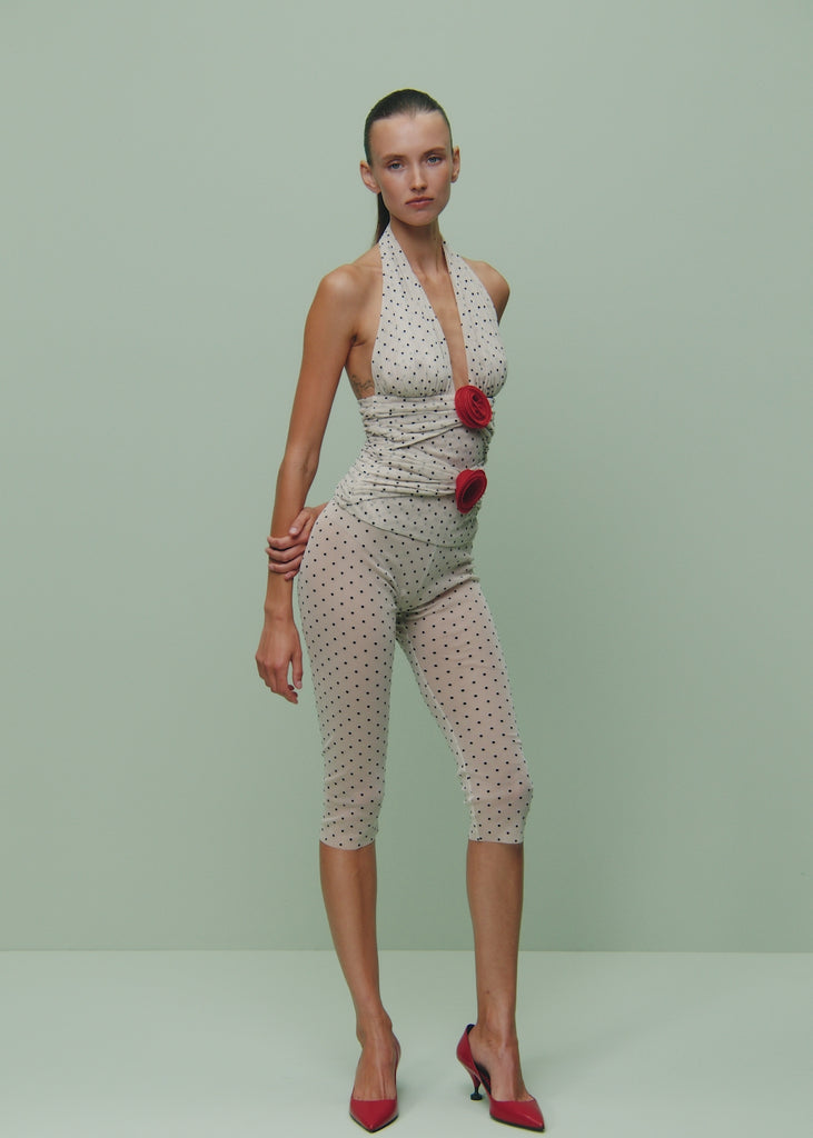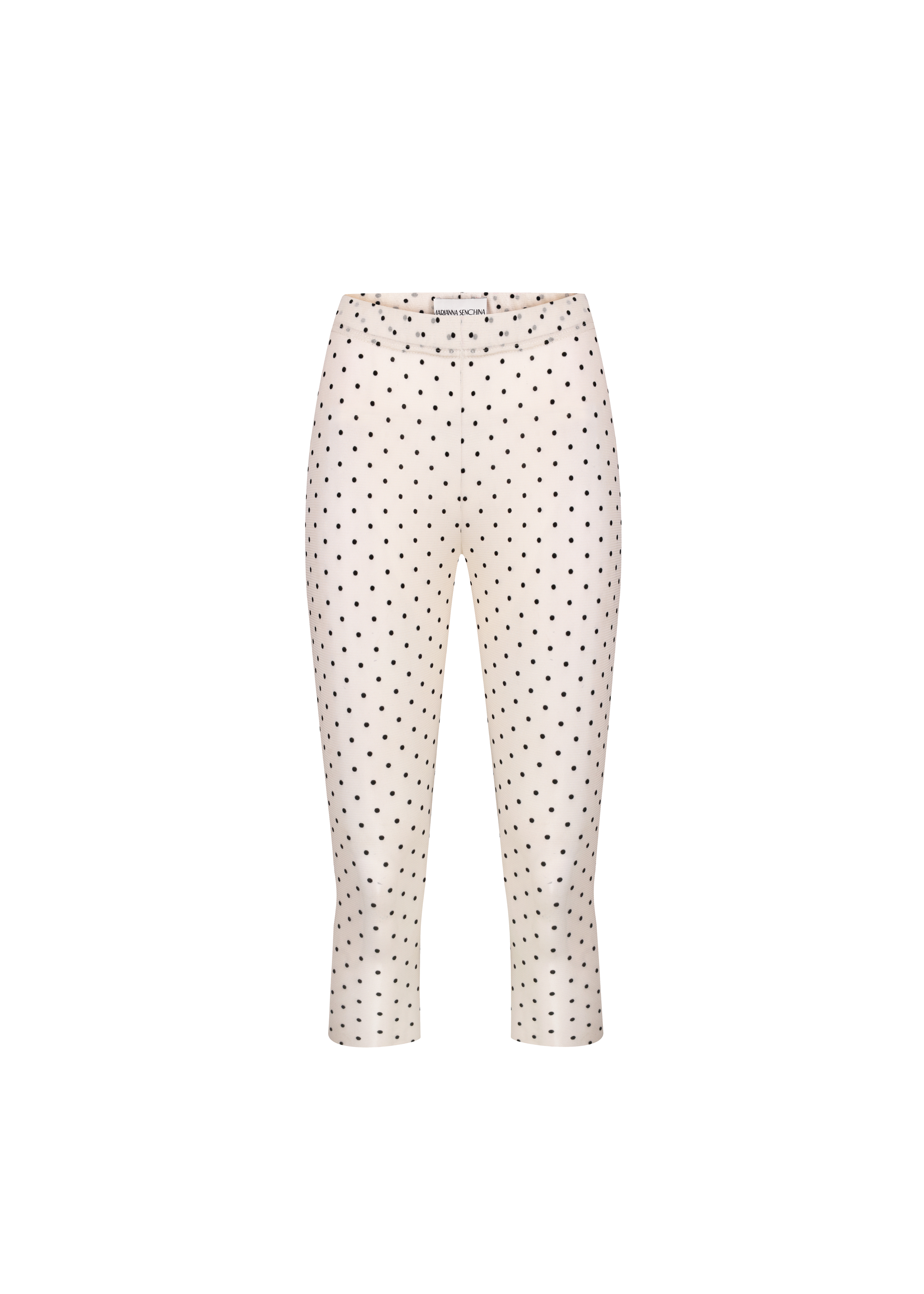 Sheer biker shorts in beige fabric with black dots. These long biker shorts, featuring an elasticated waistband, redefine sophistication, seamlessly blending comfort with chic style.