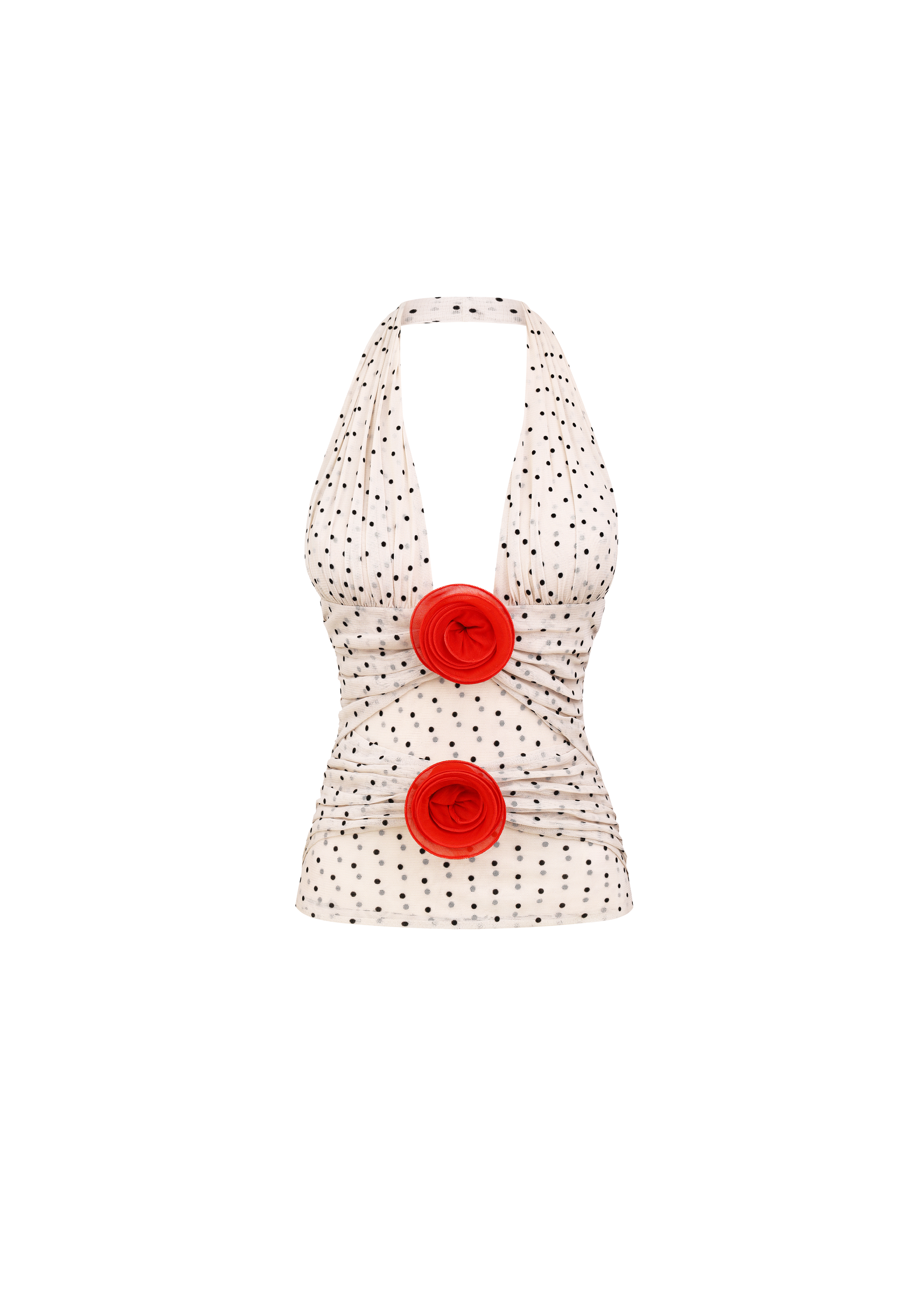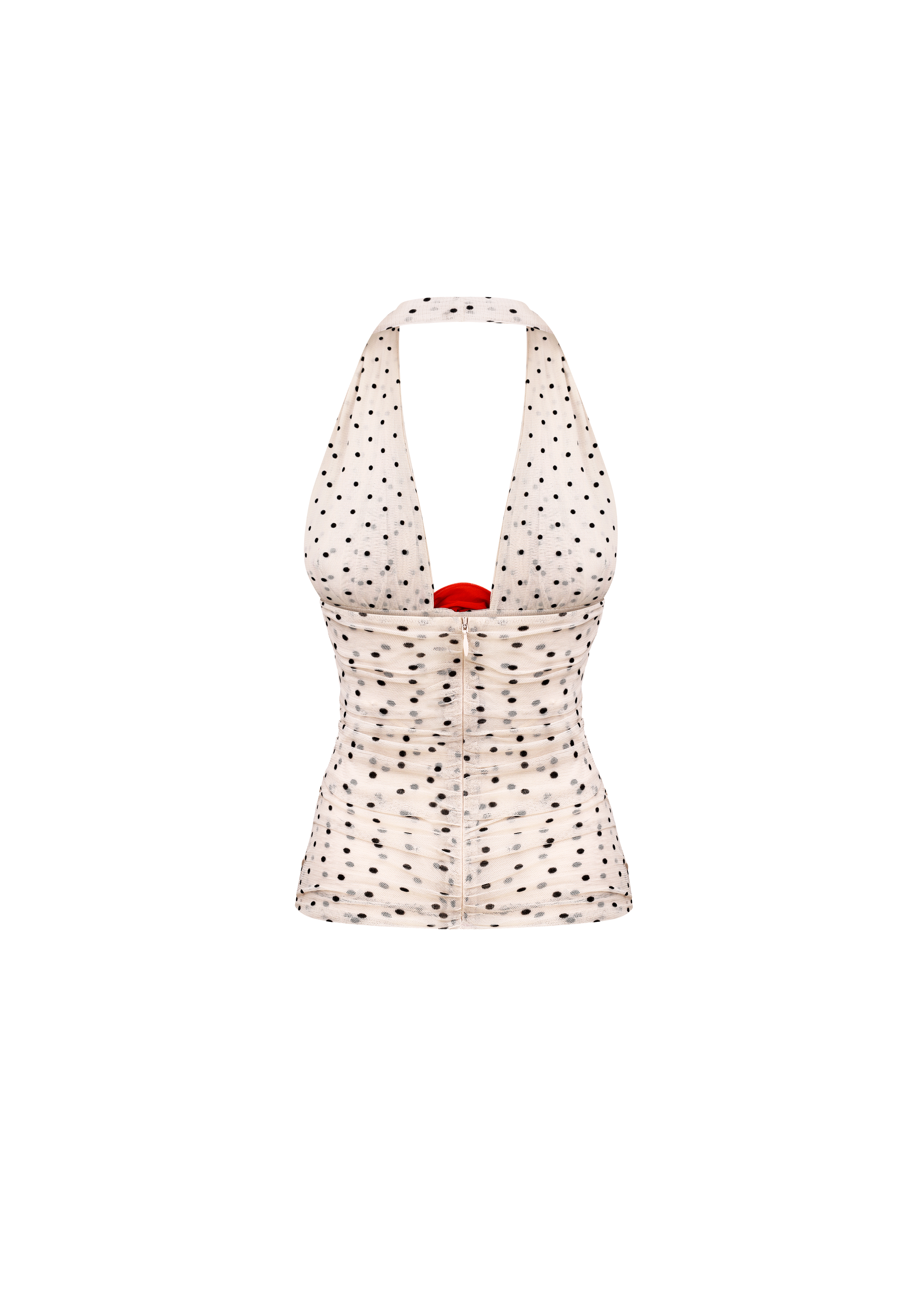 Halter neck ruched top with open back in beige sheer fabric with black dots. Top features chic ruched detailing with handcrafted red flowers flowers, adding a bold and edgy touch.