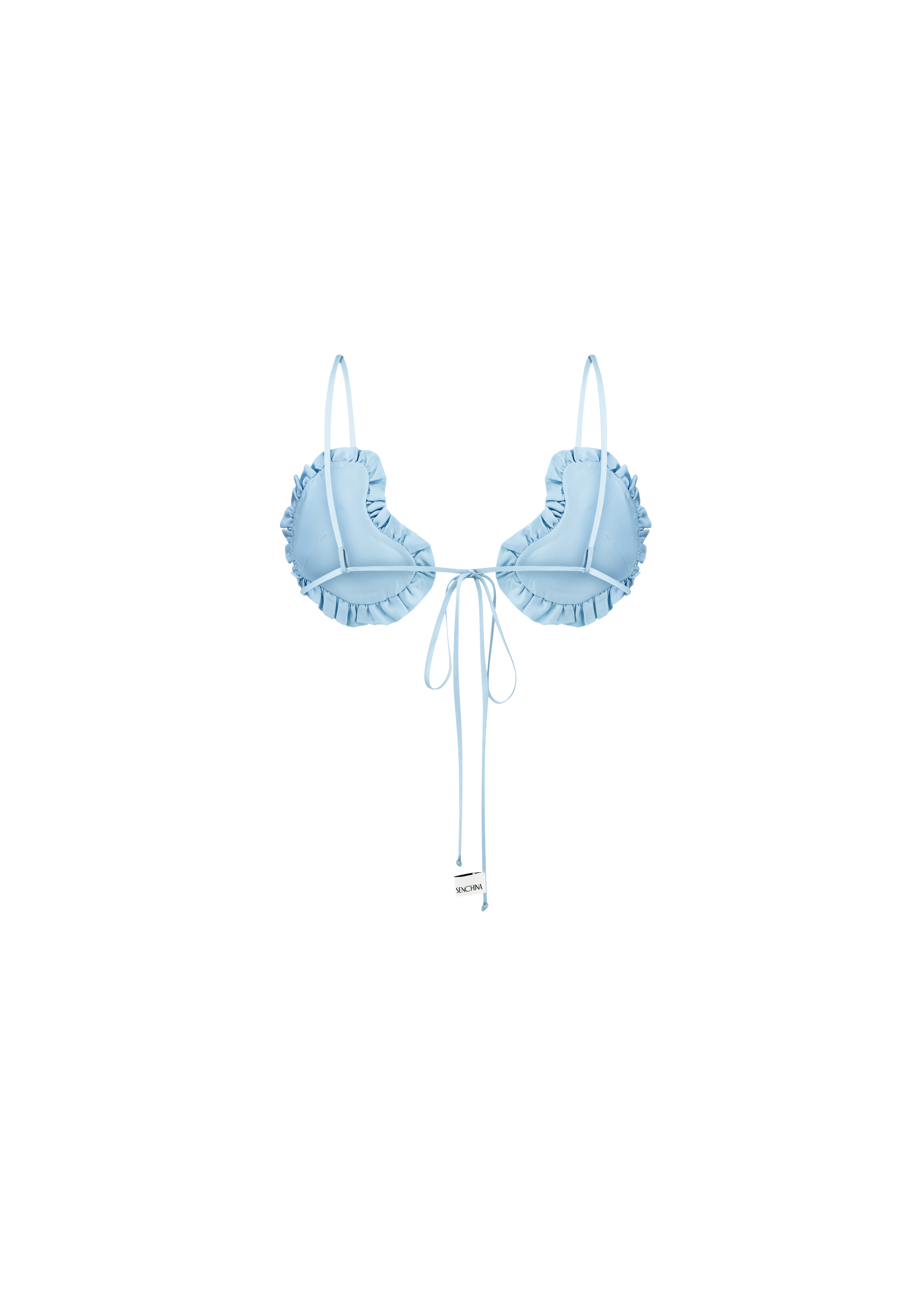 Heart-shaped bra cups adorned with playful ruffles, crafted in a delicate baby blue hue. With a front and back tie detail, unpadded.