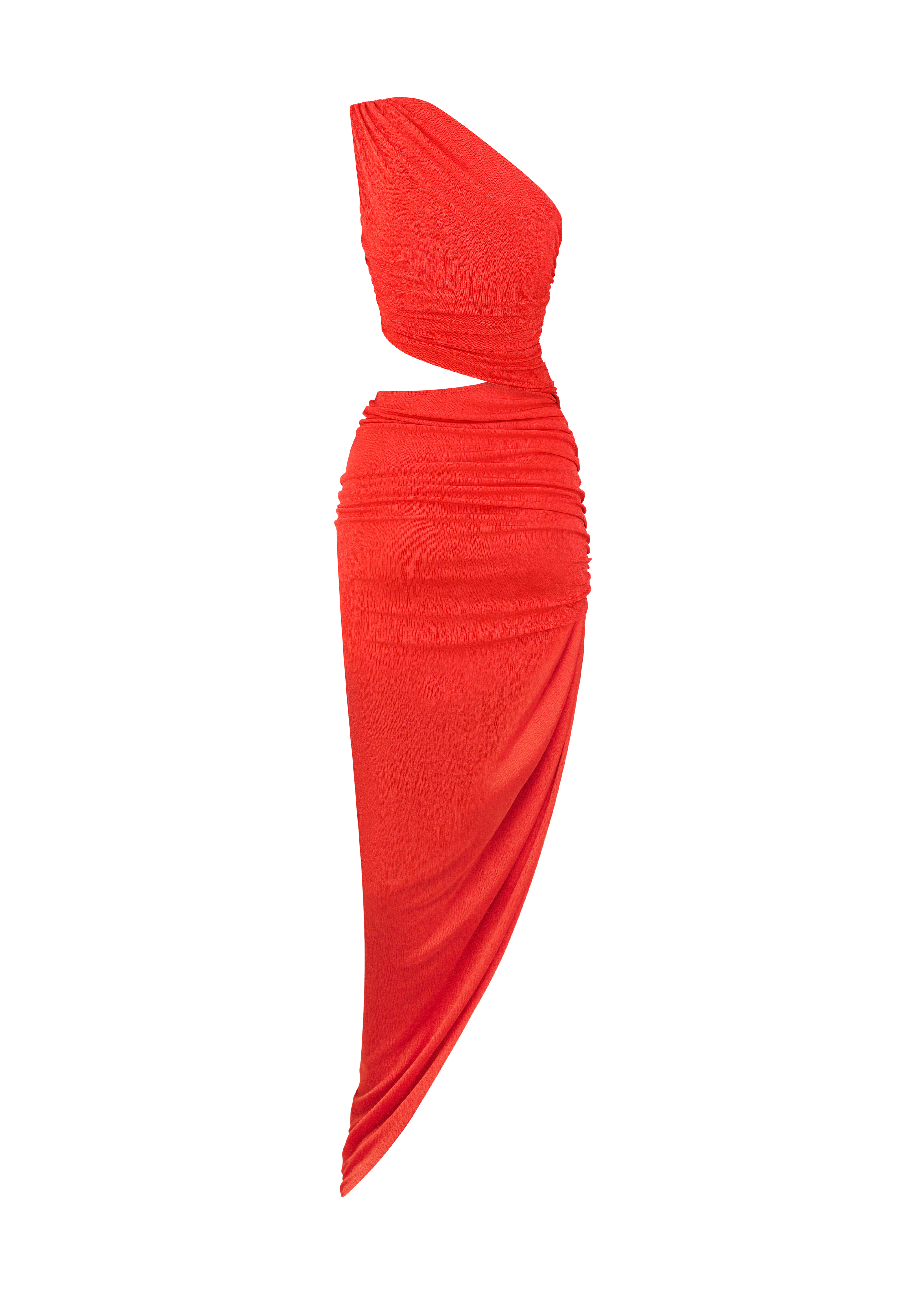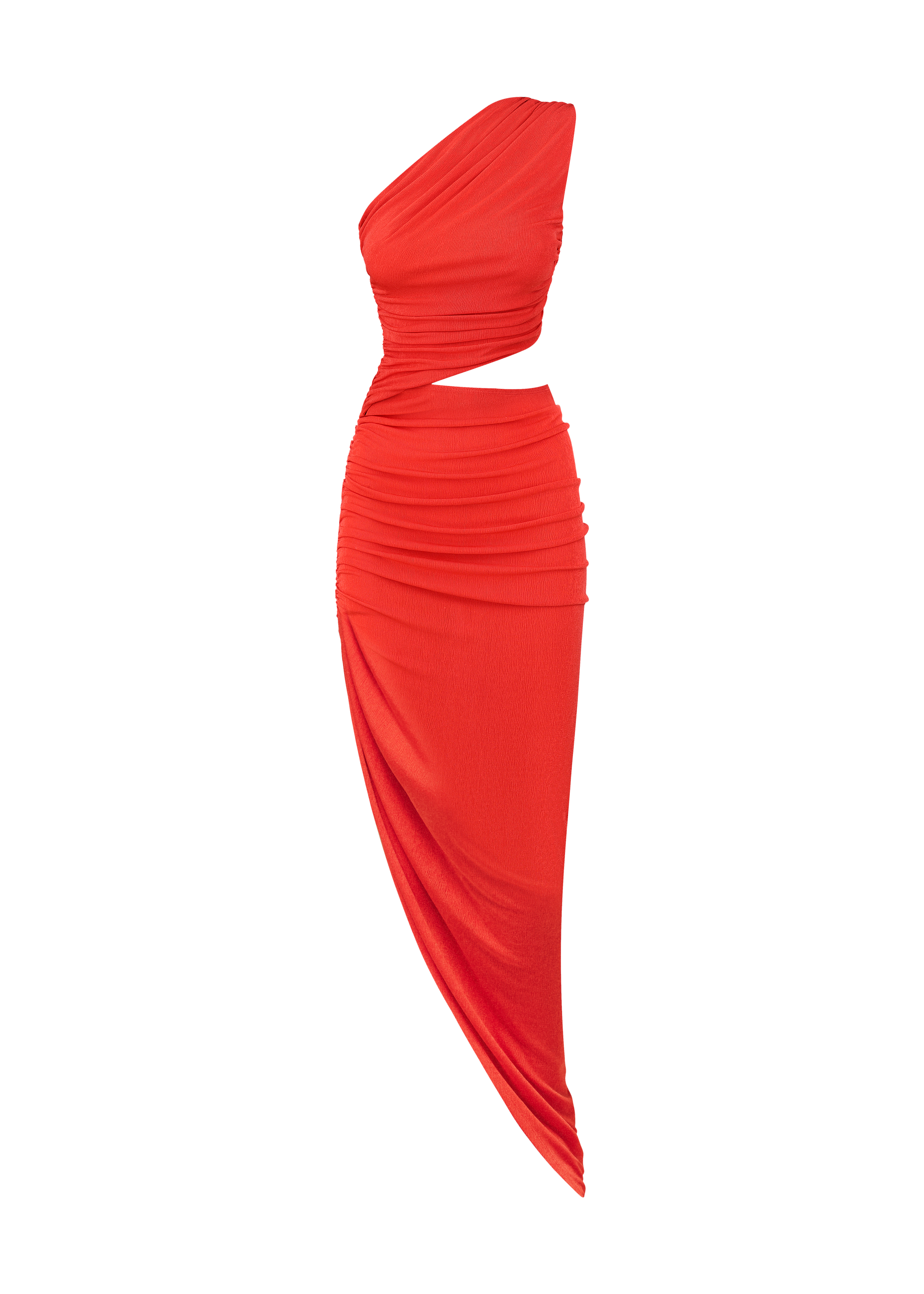 A bold statement in fiery scarlet red, this jersey one-shoulder dress is designed to captivate. The asymmetric silhouette is accentuated by artful ruching, while a daring waist cutout adds a touch of allure. Crafted from soft, stretchy fabric, it hugs your curves for a flawless fit, making it the perfect choice for various occasions.