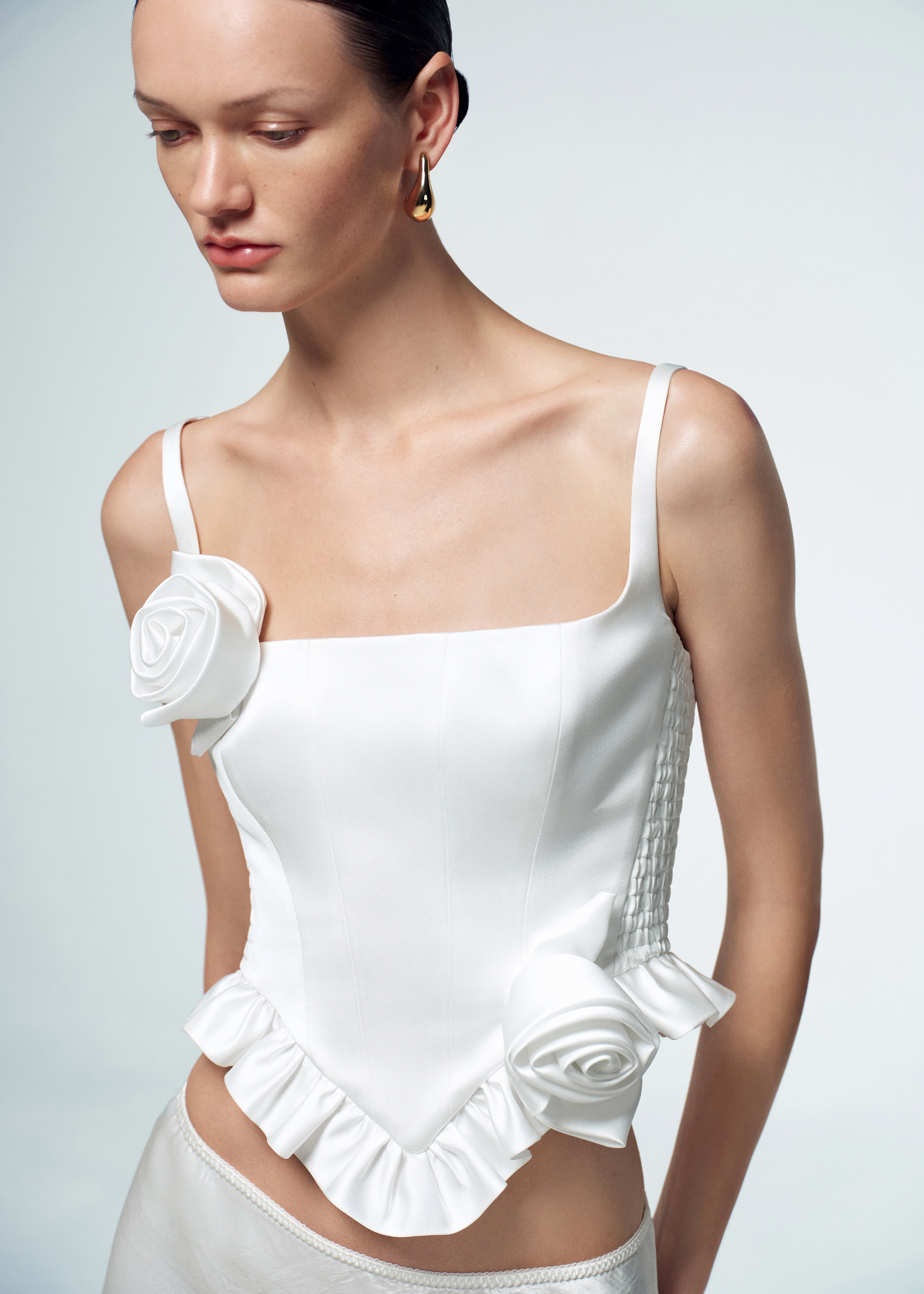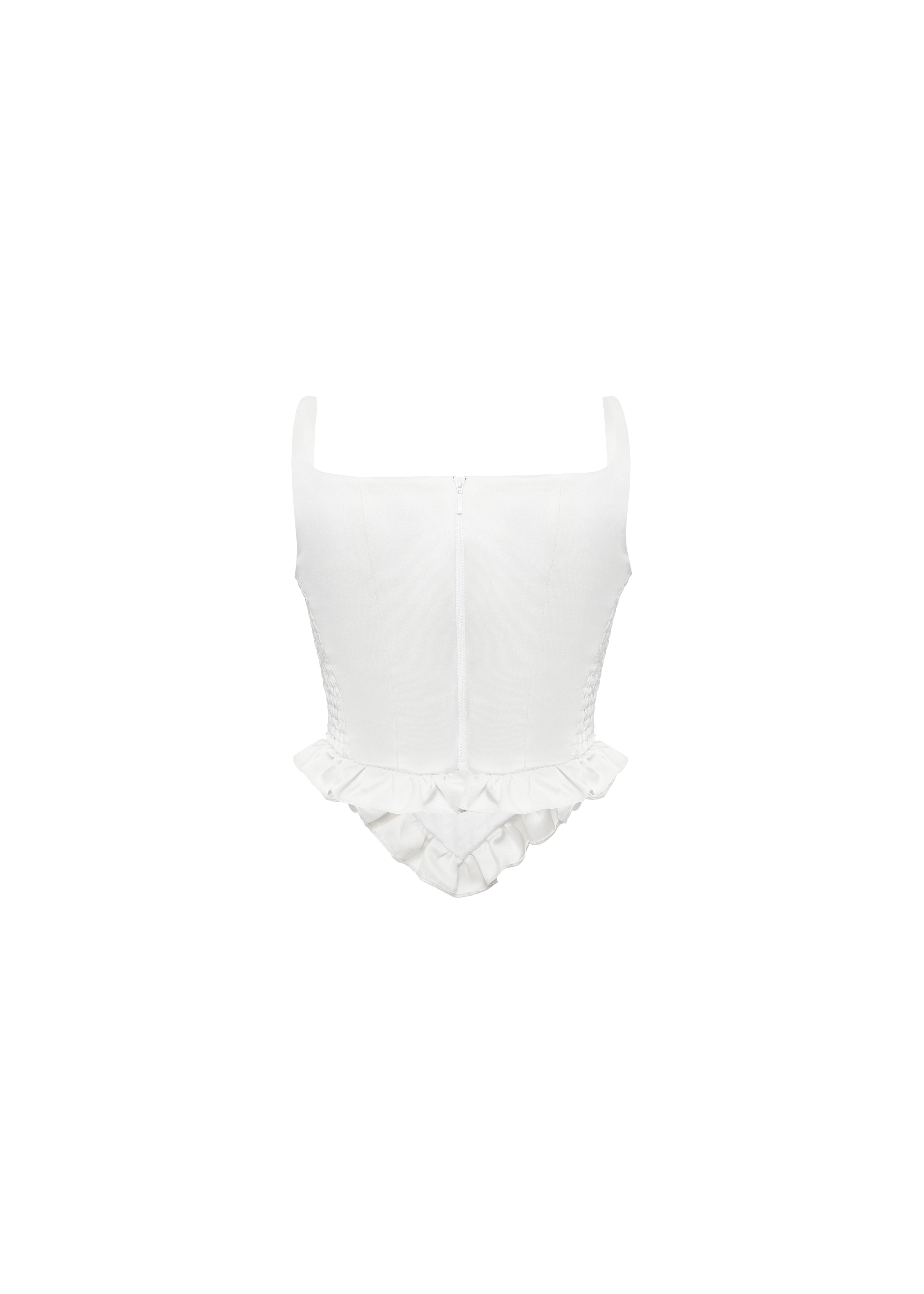 Charm your way through special occasions with our First Date top. This corset is crafted from white satin, featuring mini basque and delicate handmade flowers that add an elegant touch to its design. The square neckline and curved hemline create a flattering silhouette, while slim straps enhance its enchanting appeal. Designed with comfort in mind, the top includes elastic inserts on the sides for a form-fitting look that accentuates your figure. The top is fastened with a detachable zipper, fully lined.