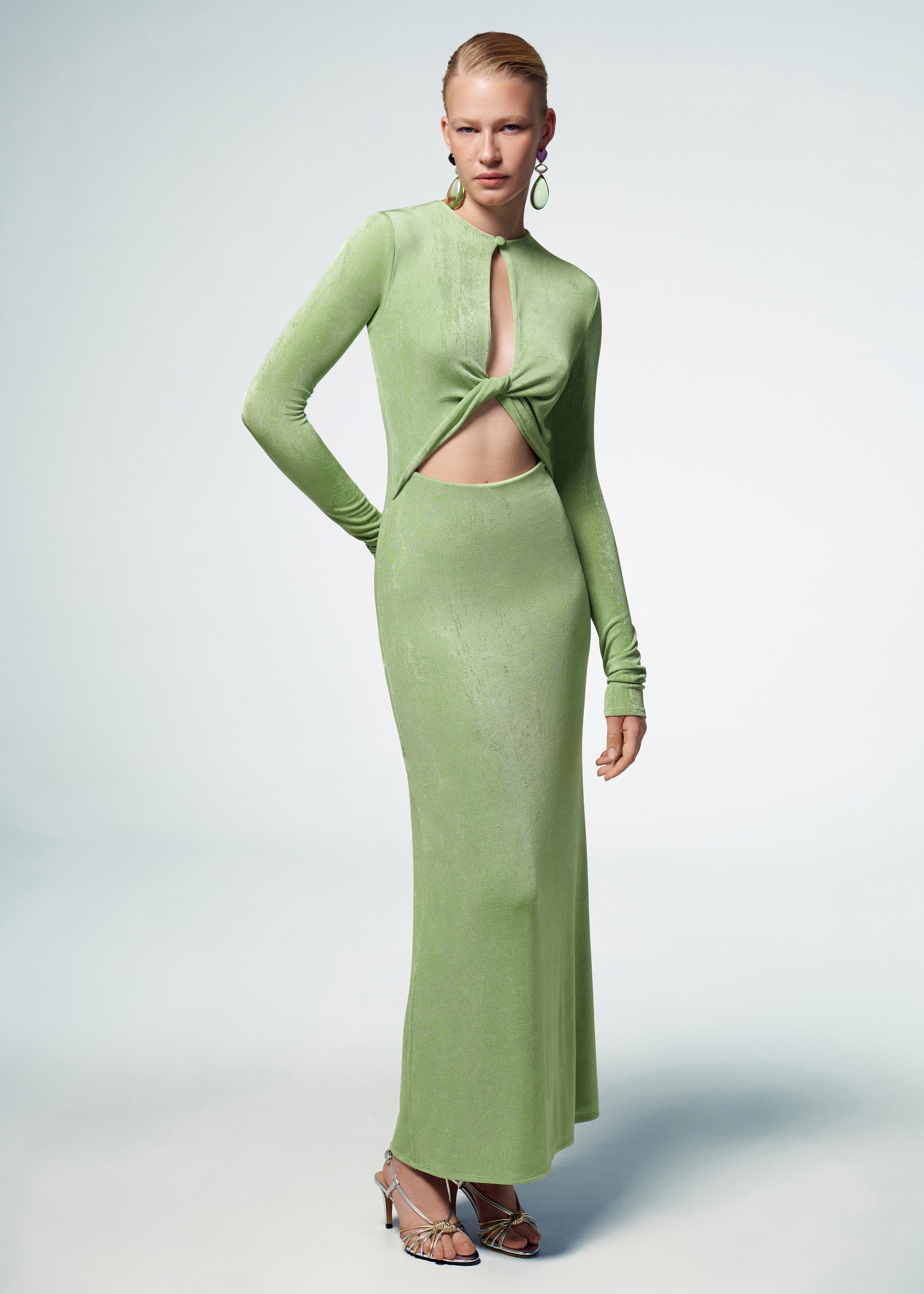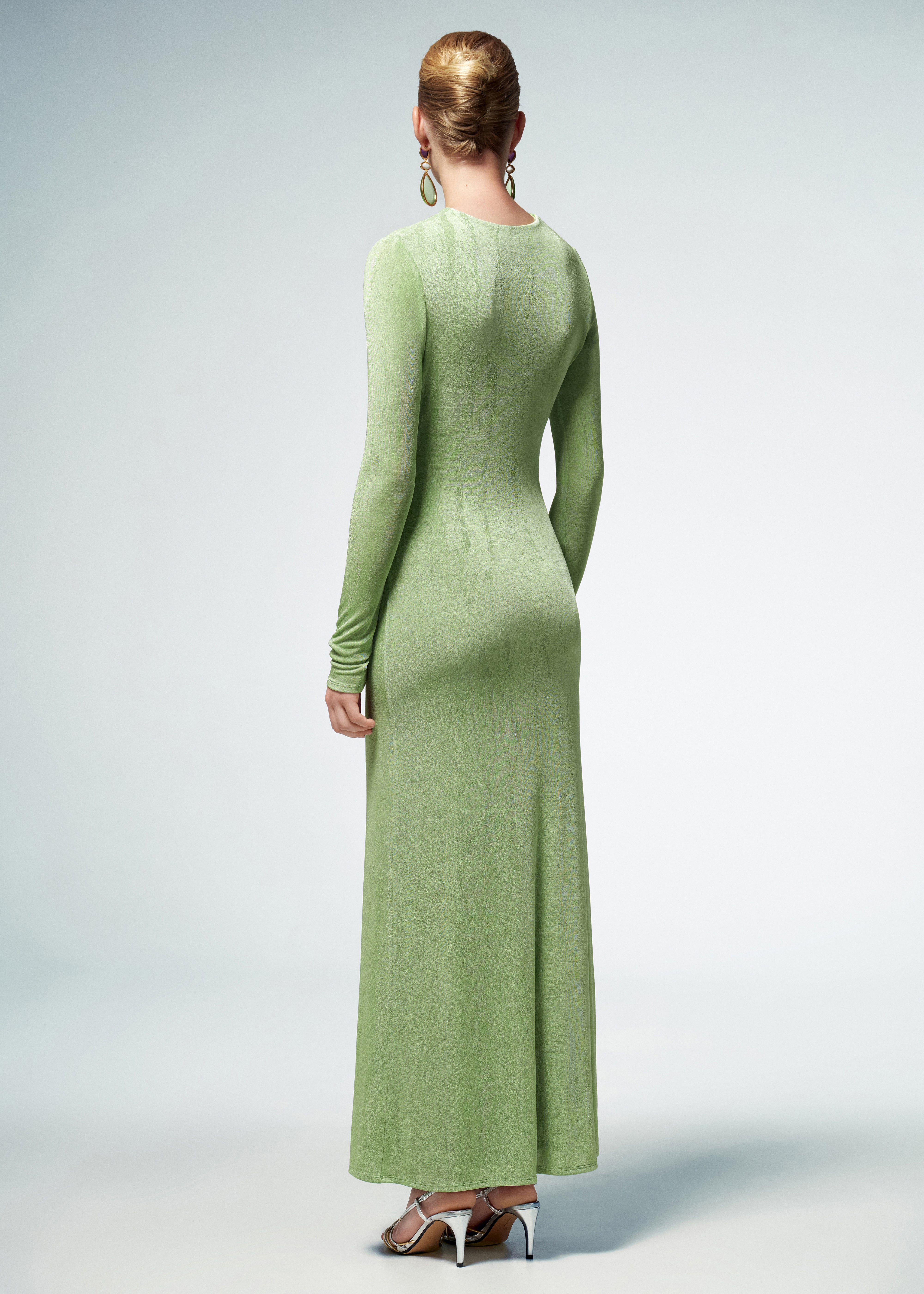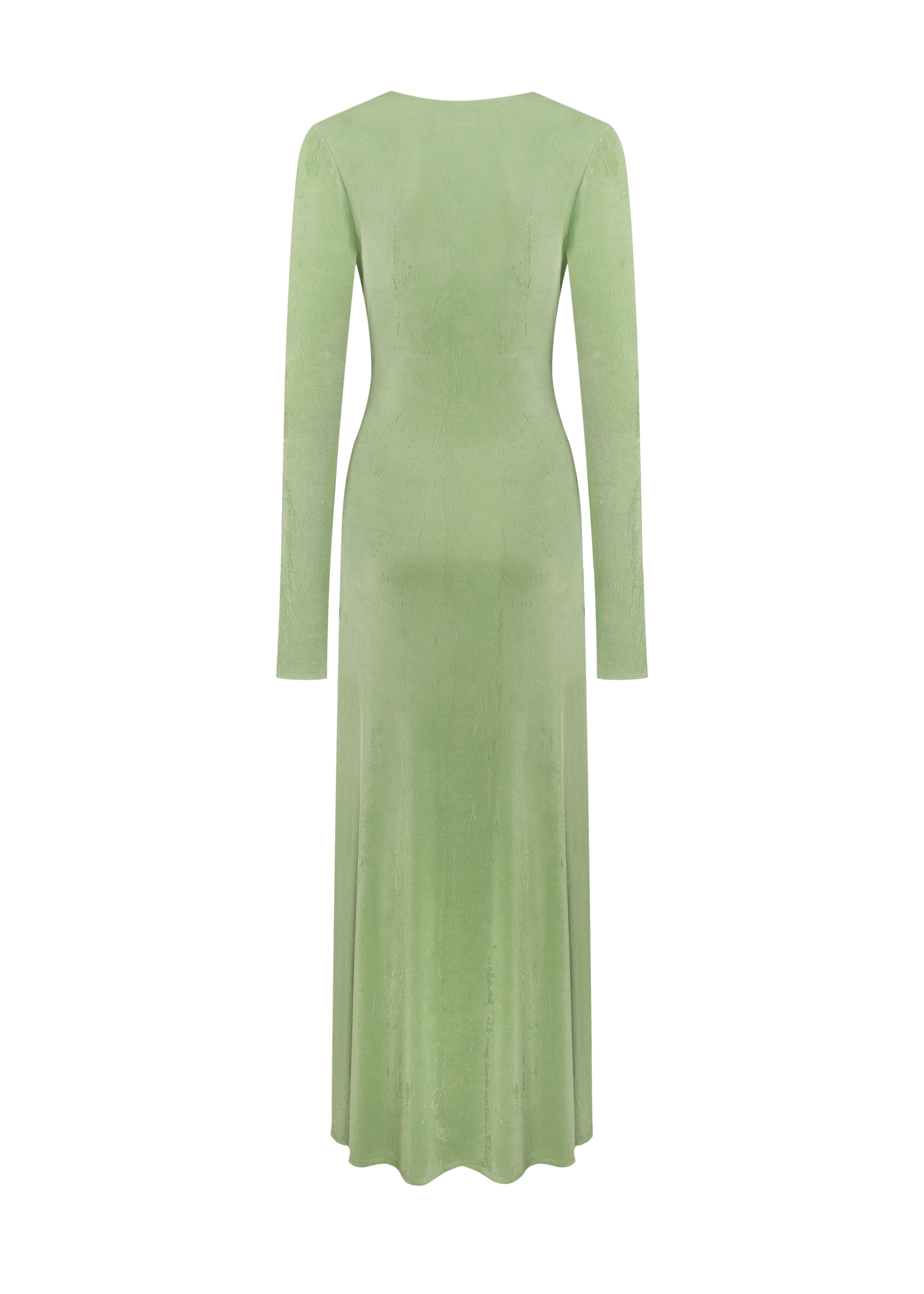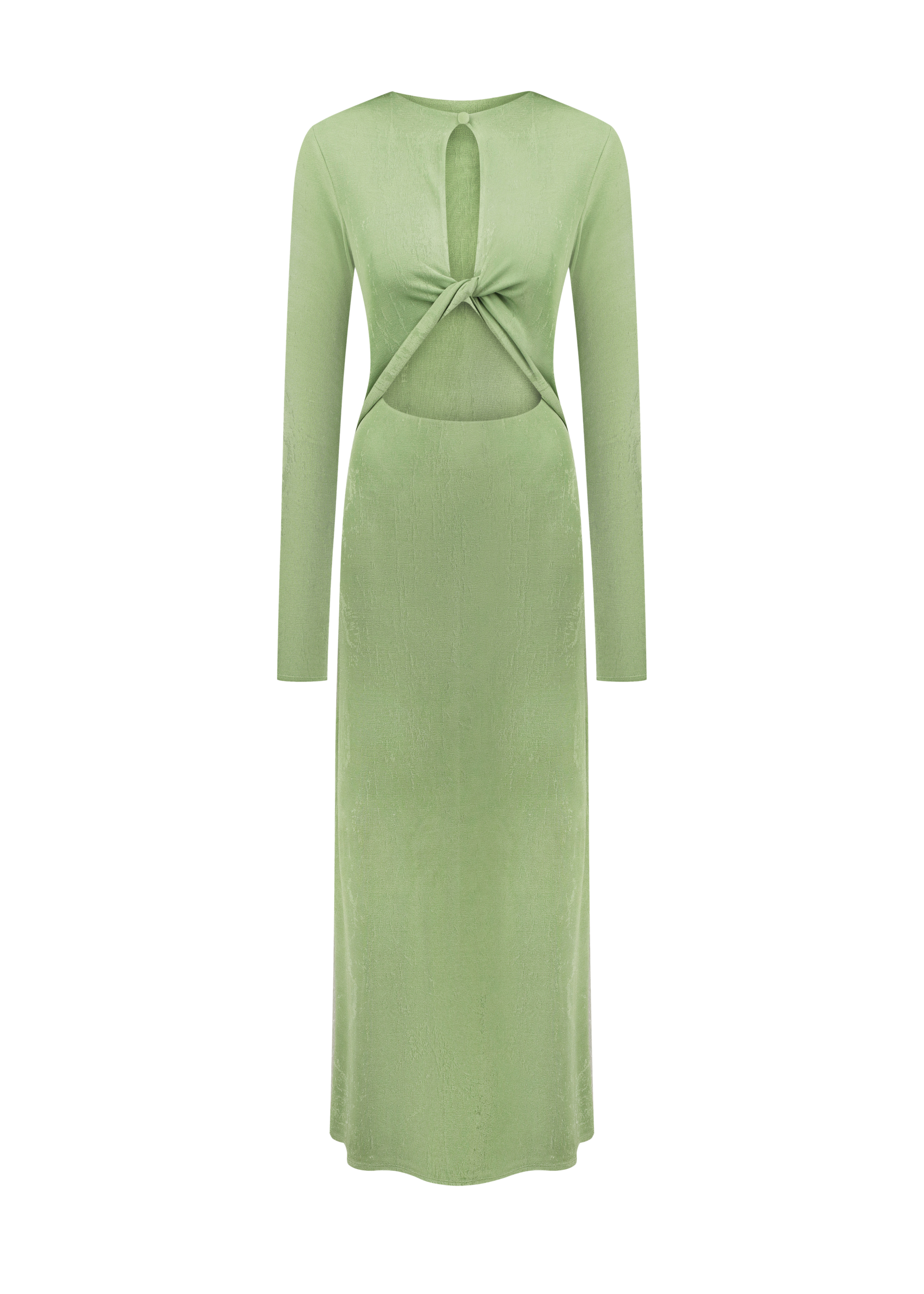 Effortlessly elegant, this long-sleeve maxi dress is crafted from soft jersey in a refined green hue. Featuring delicate cutouts and a subtle knot detail, its minimalistic design exudes understated sophistication. The fluid silhouette drapes beautifully, offering both comfort and allure for any occasion.