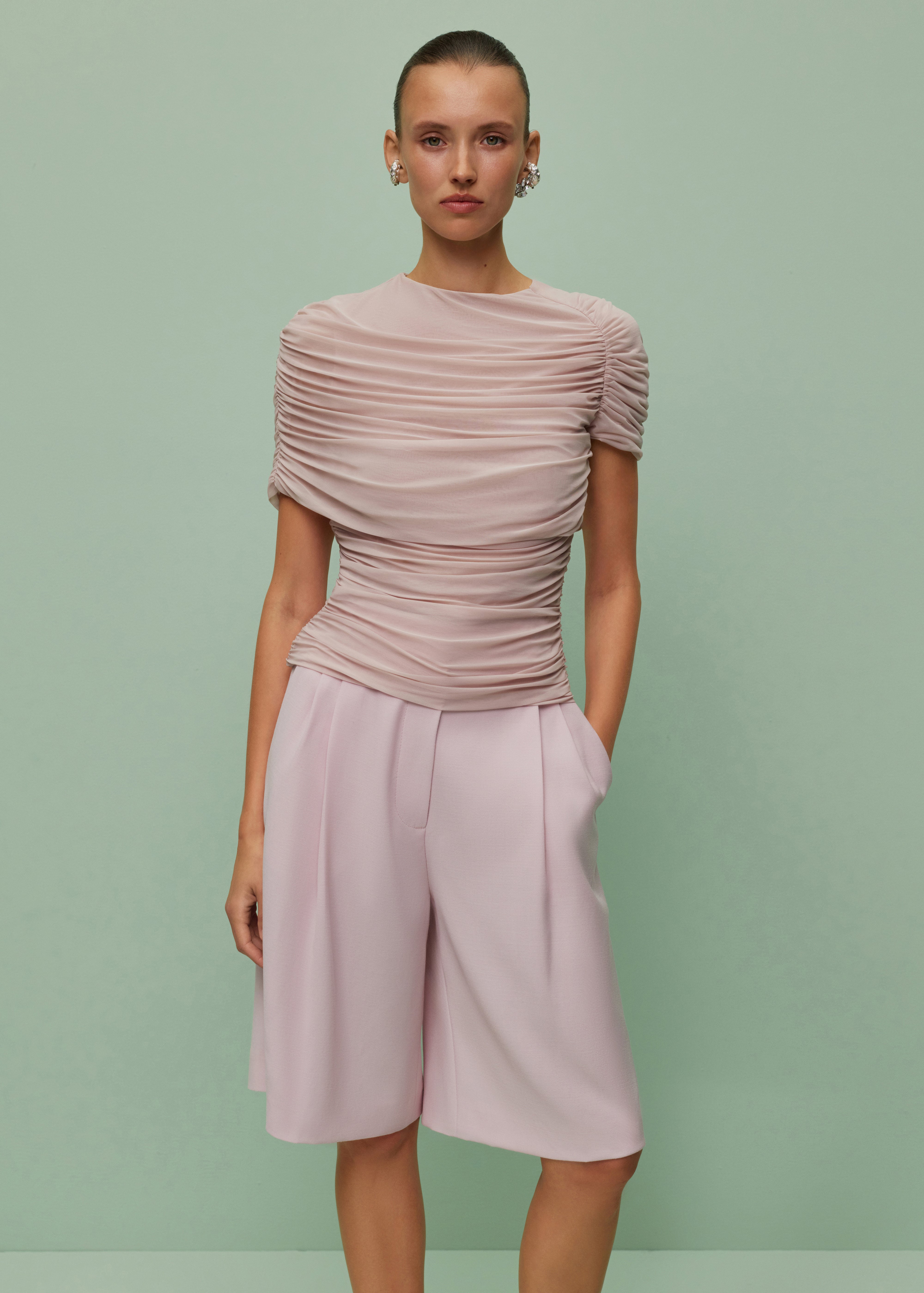 Linda shorts - high-rise, long pleated bermuda shorts. The high rise and tight waistband ensure a flattering and comfortable fit, while the straight cut provides a relaxed, laid-back vibe. Zip and button fastening.
