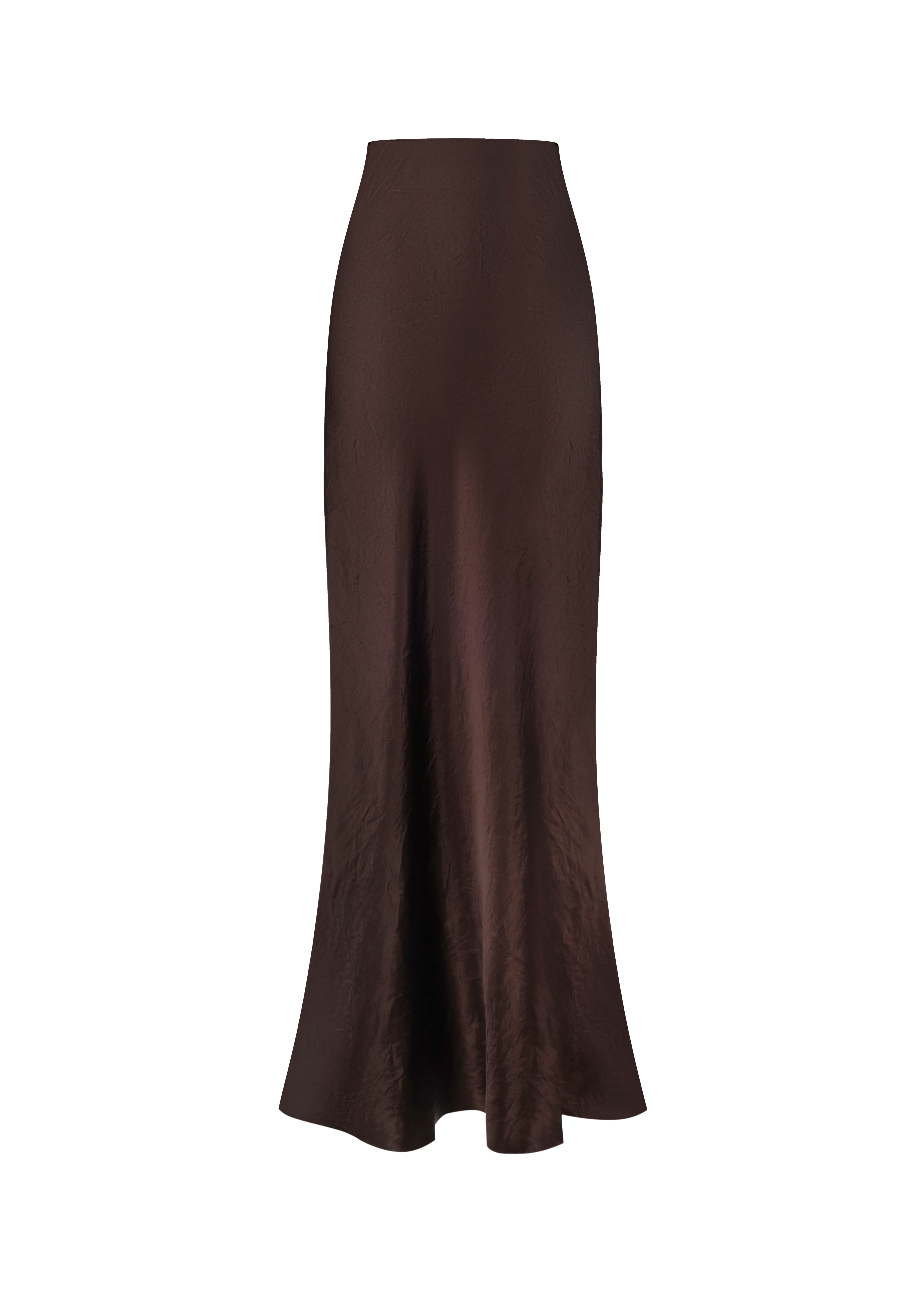 Bias-cut maxi skirt, draped in a rich chocolate brown hue, exudes an unparalleled level of elegance. Low-rise, maxi to the extreme, and gracefully cascading to floor-length. Unlined. This skirt is a polished classic, perfect for those who appreciate timeless statement pieces.