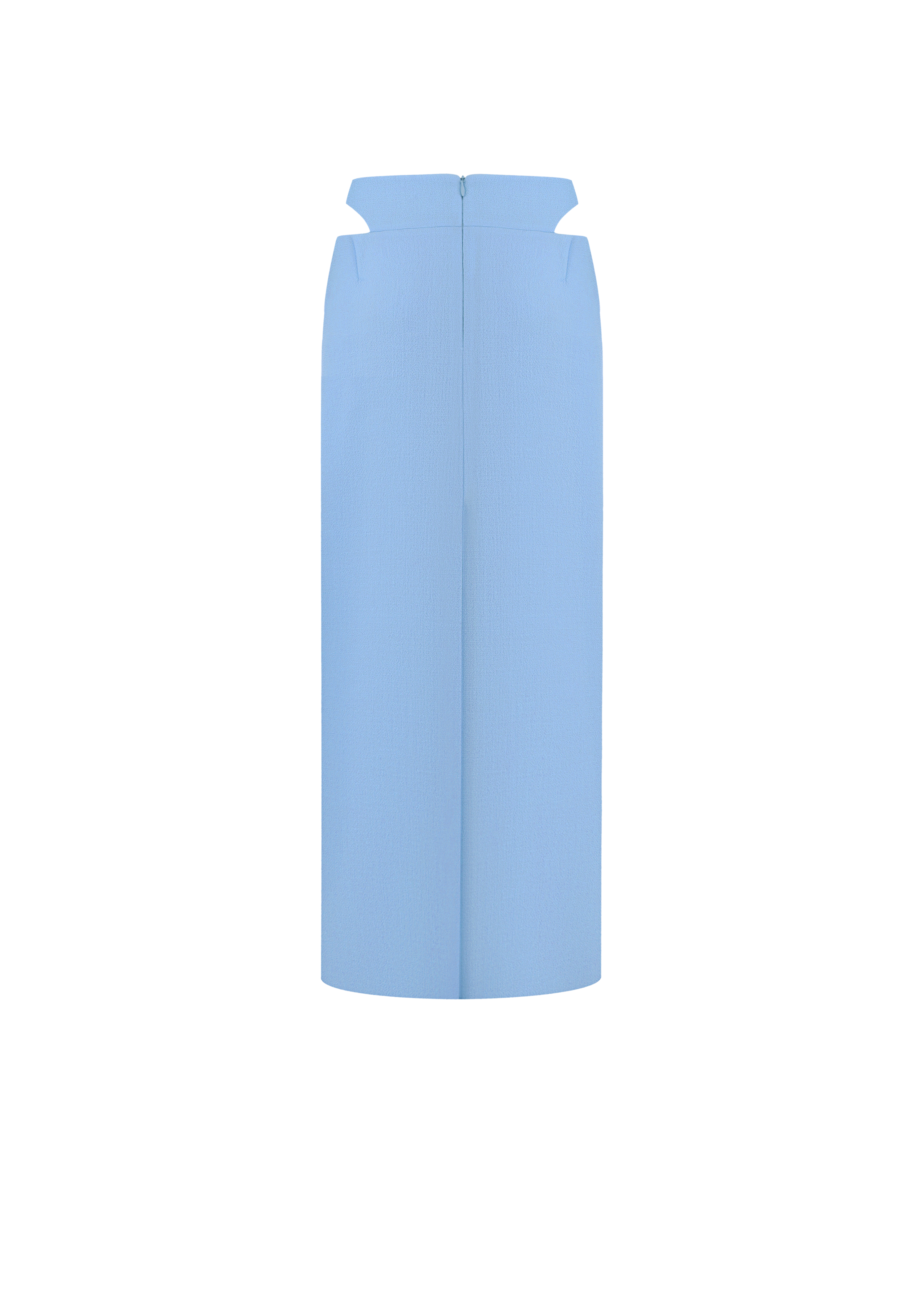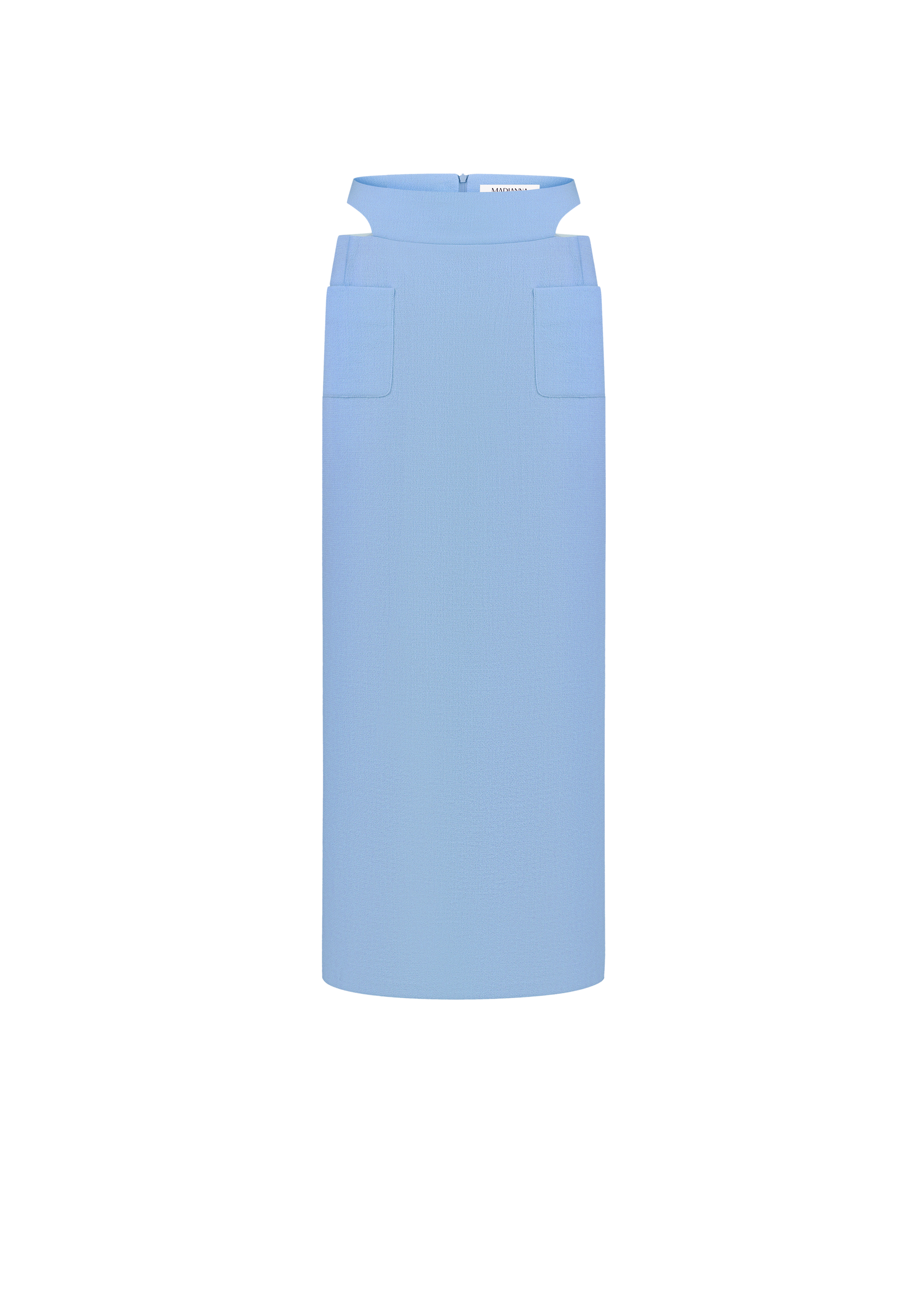 Maddy skirt crafted from luxurious blue wool fabric, features a sleek straight silhouette with structured front pockets and a statement curved waistband. Together with the Linda vest in the same fabric, they form a striking ensemble that redefines power dressing with a touch of femininity.