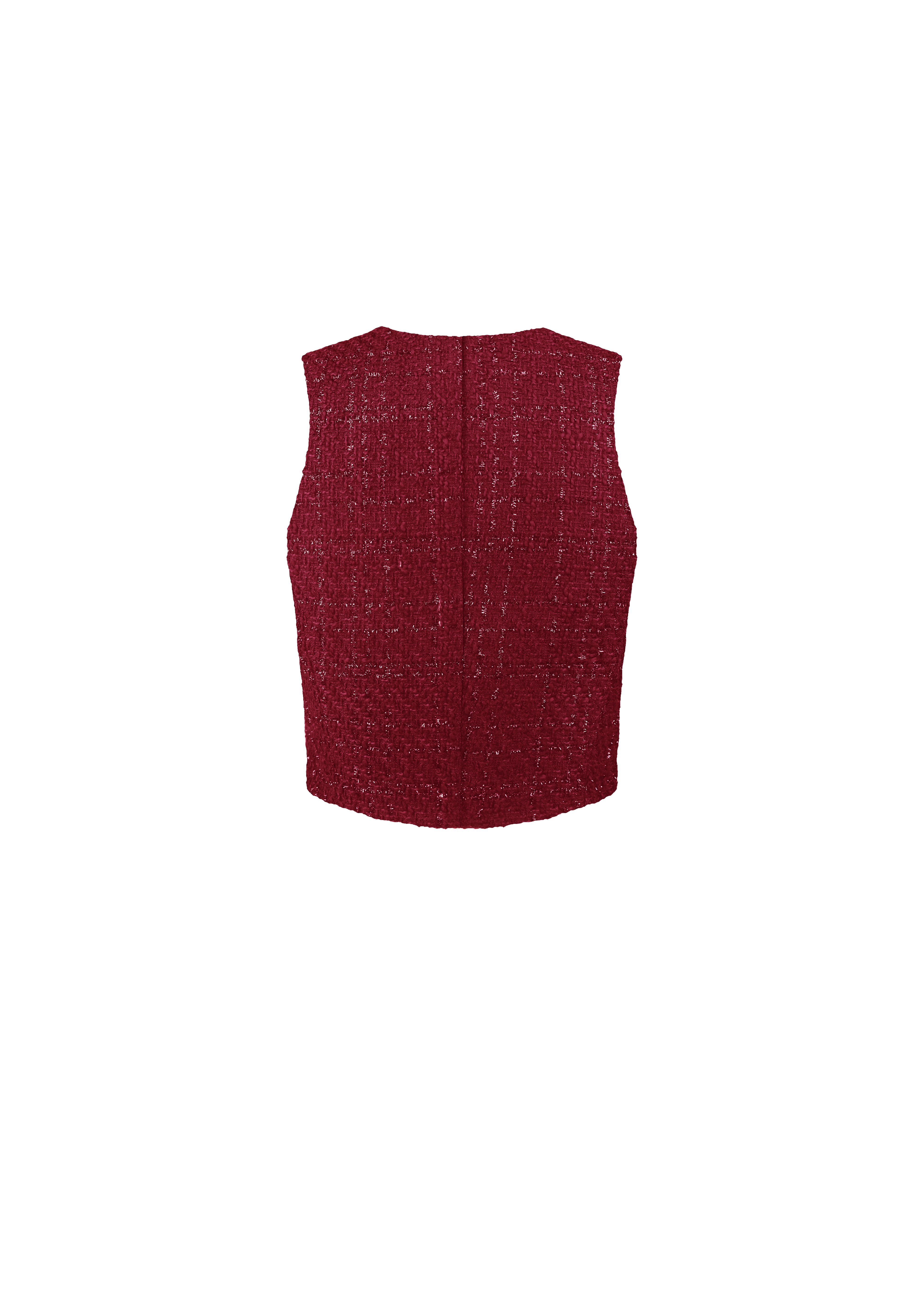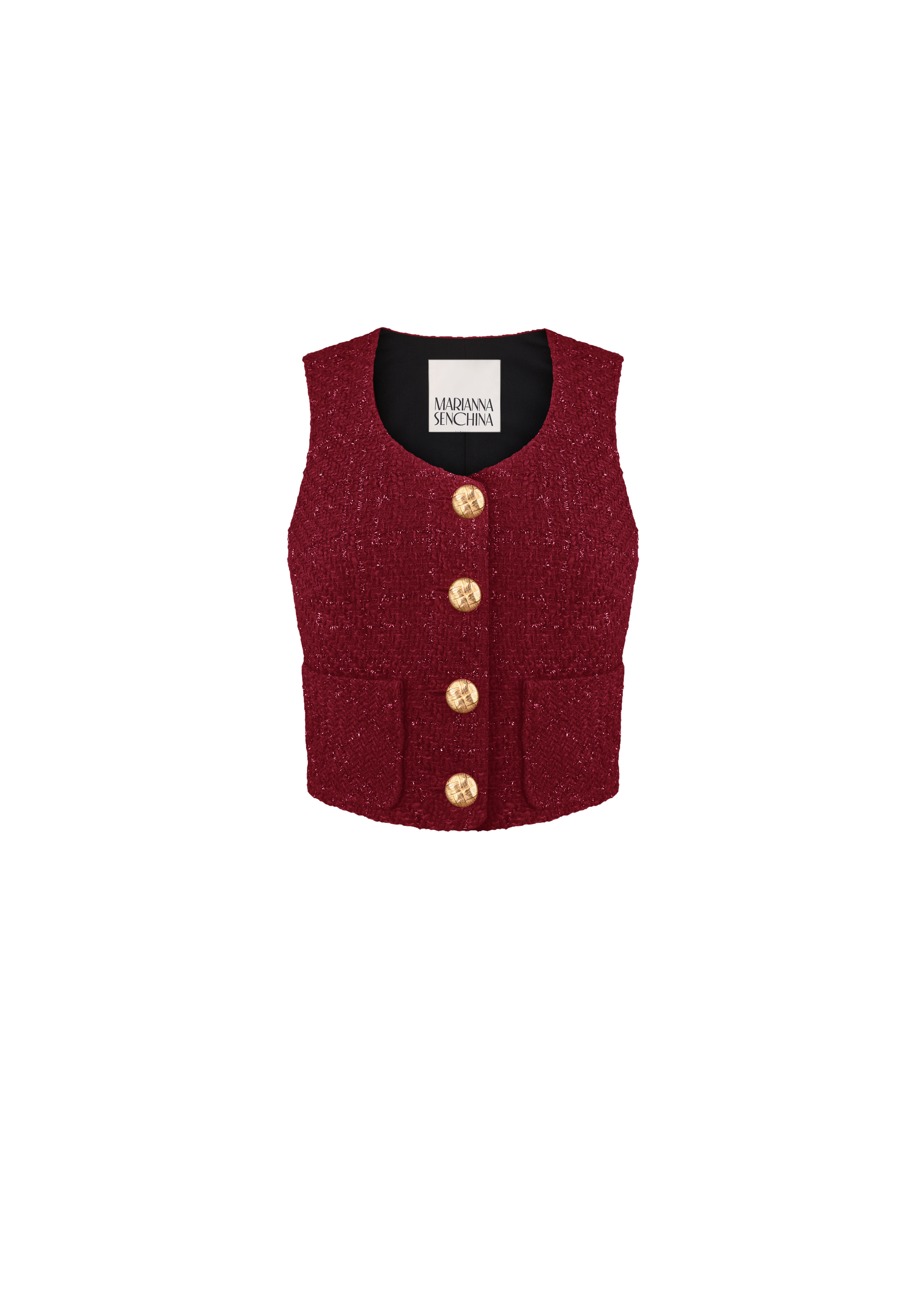 Cropped tailored tweed vest adorned with elegant golden buttons and featuring a classic patch pocket design. Crafted from the ruby red tweed, this vest effortlessly transitions from formal events to everyday elegance. Whether you're attending a special occasion or seeking to elevate your daily ensemble, this versatile piece is a must-have addition to your wardrobe. For a cohesive and sophisticated look, pair it with our Stefanie Jacket and tweed shorts, creating a stylish three-piece suit ensemble that exudes confidence and sophistication.