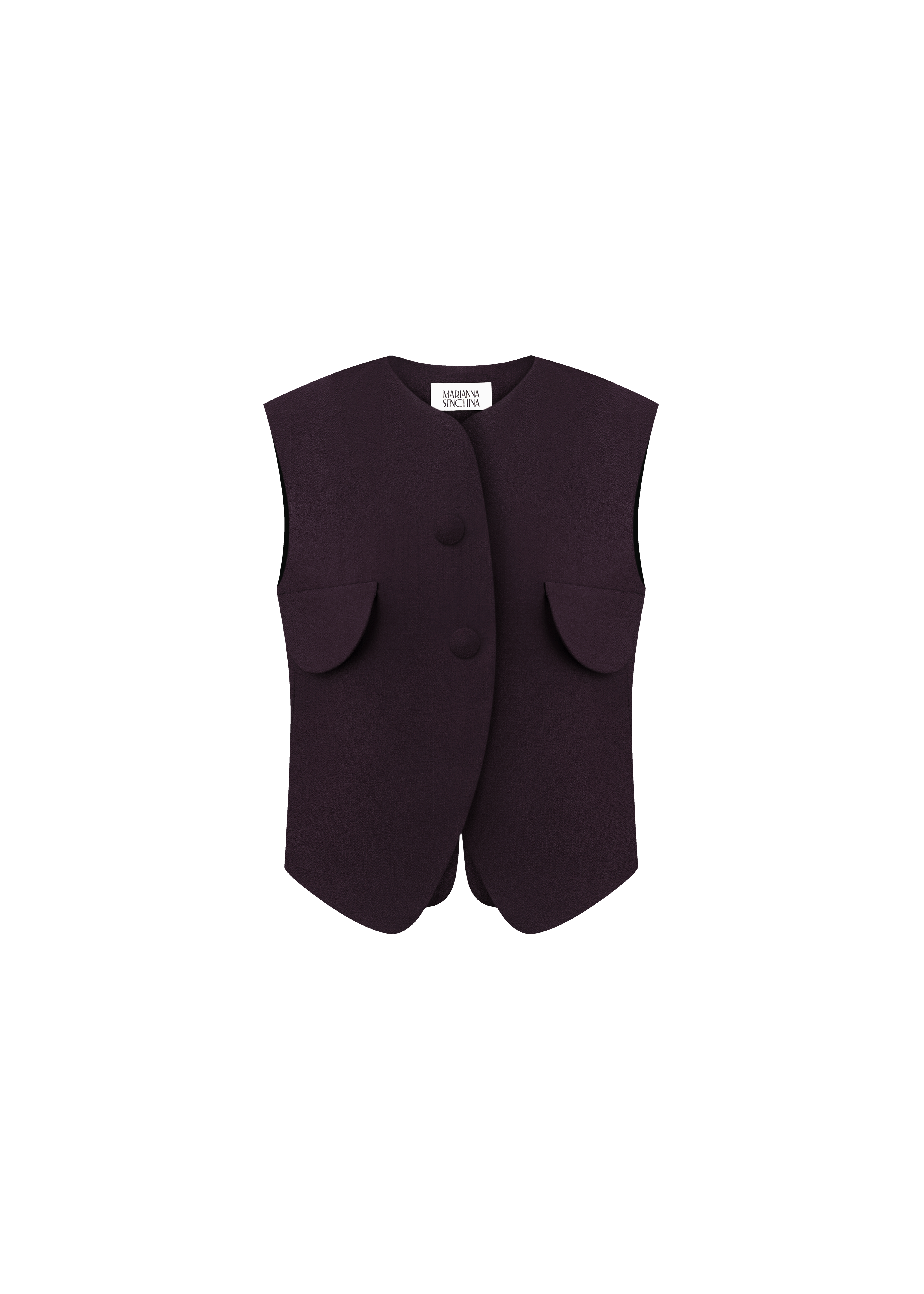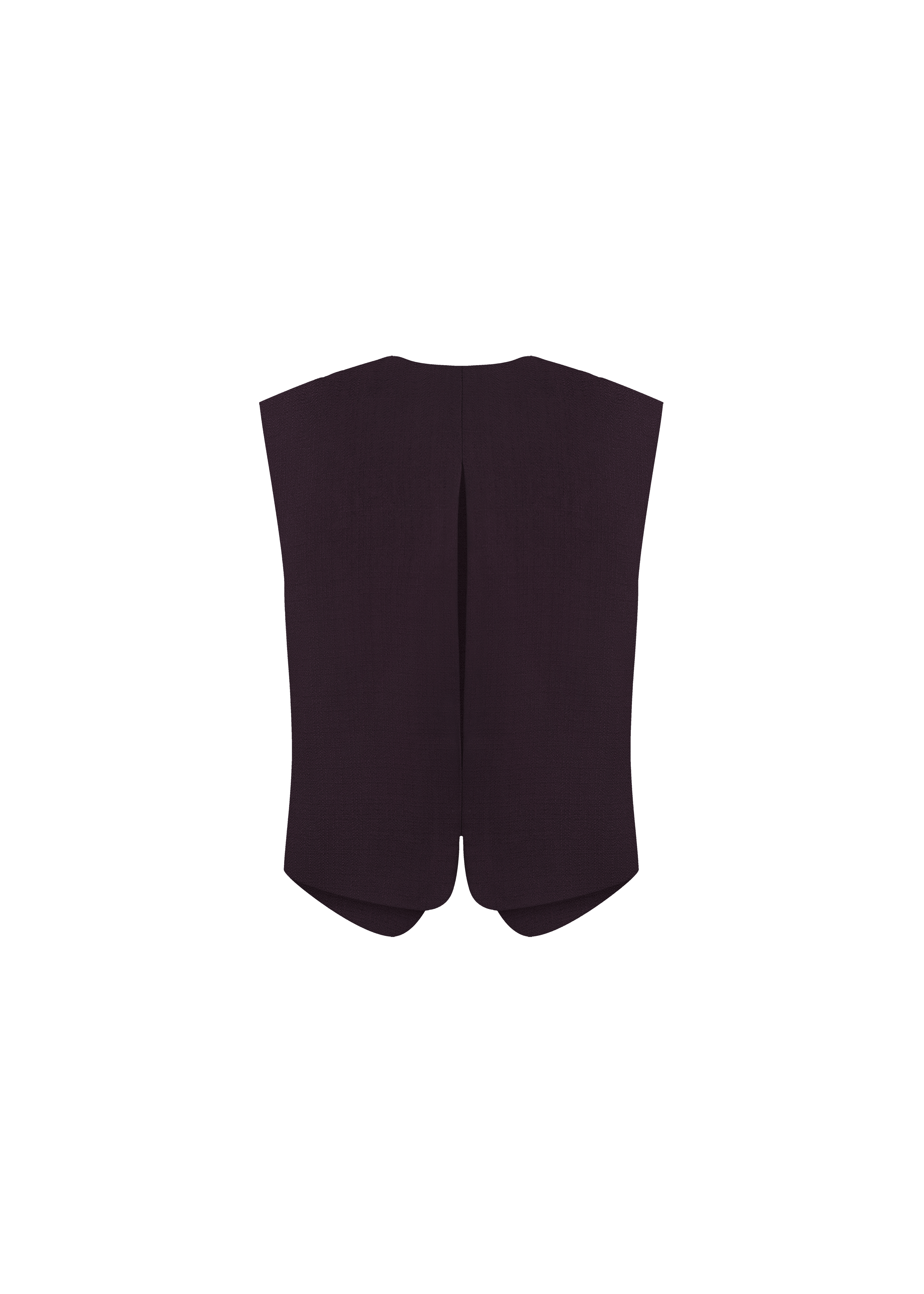 Linda vest in a fig shade. This piece features a unique cut-out design on the back, adding a touch of intrigue to the overall look. The vest is fastened by two buttons, and includes imitation flaps at the front. The round neckline enhances the sleek and modern aesthetic of the vest. Designed for both comfort and style, this vest is fully lined.
