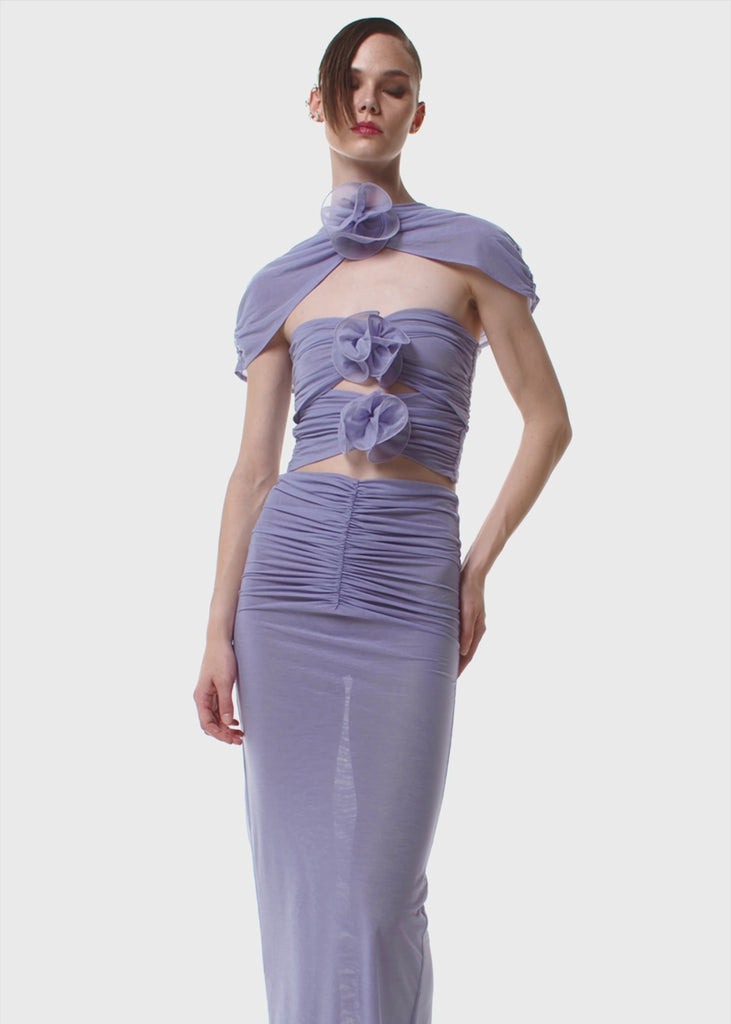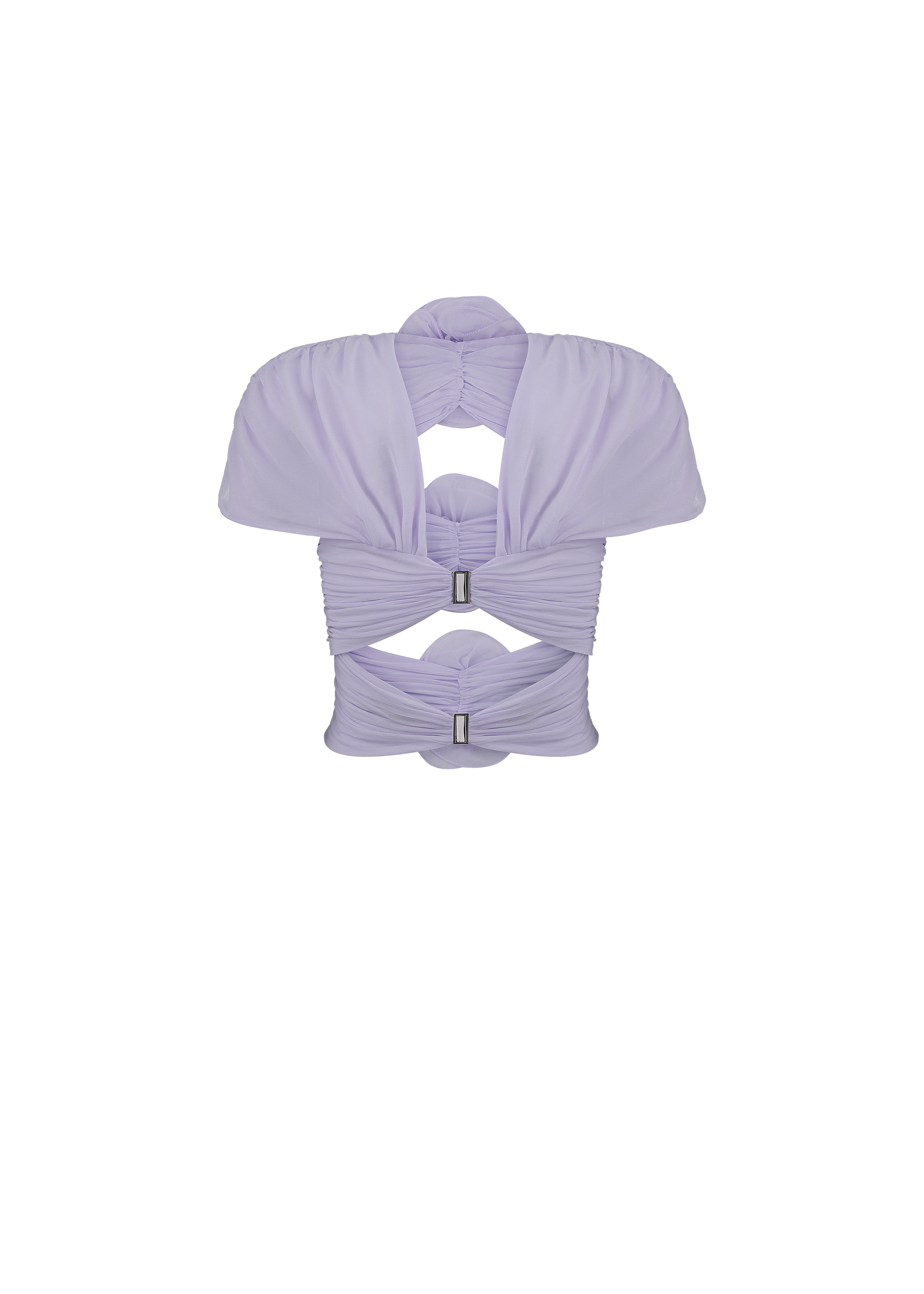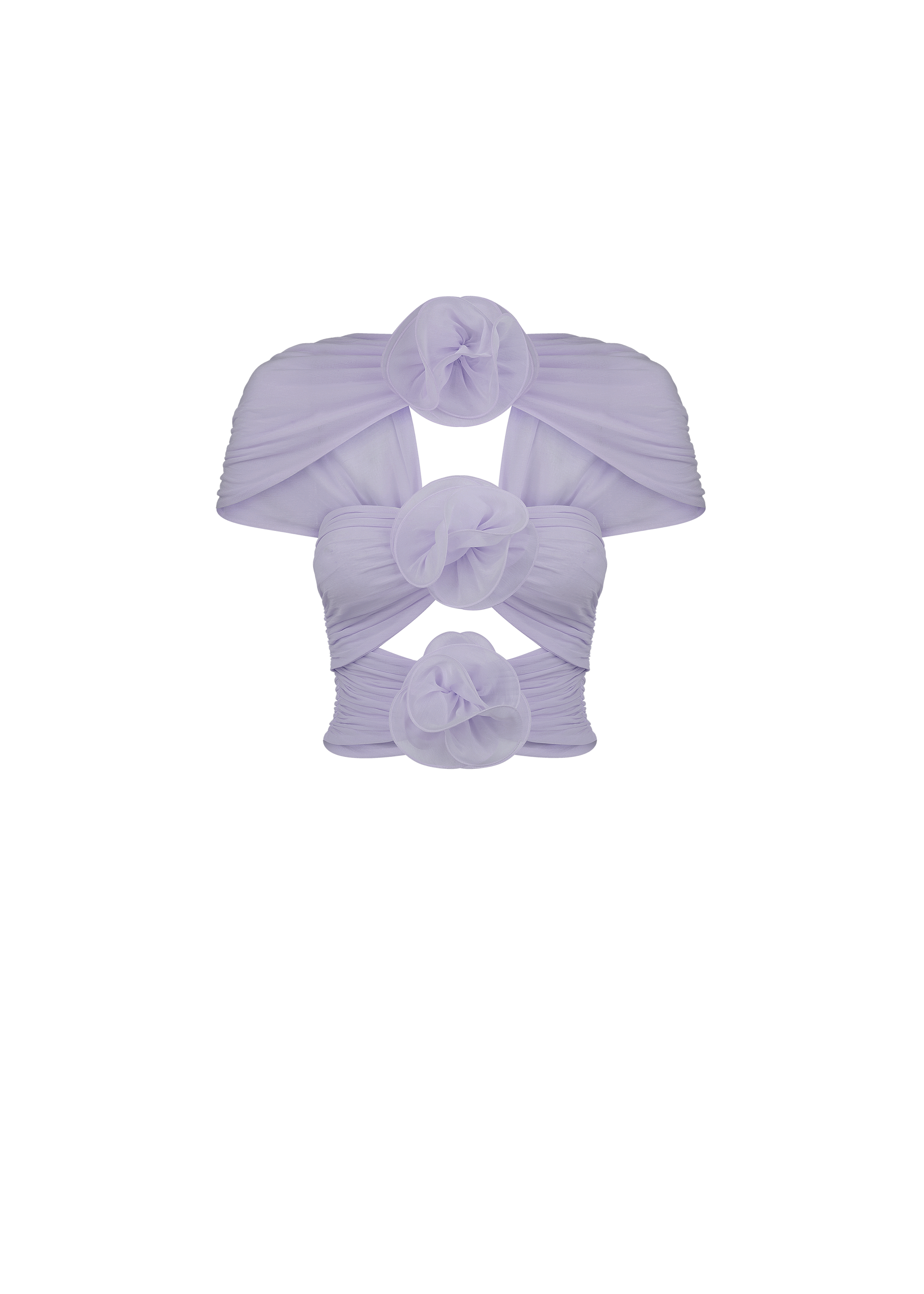 Wild Orchid ruched top, a daring fusion of modern elegance and feminine allure. Crafted in a delicate lilac hue, this top features chic ruched detailing that contours the body. What sets it apart are the intricate cutouts adorning with handcrafted flowers, adding a bold and edgy touch. Fastened with magnetic closures on the back..