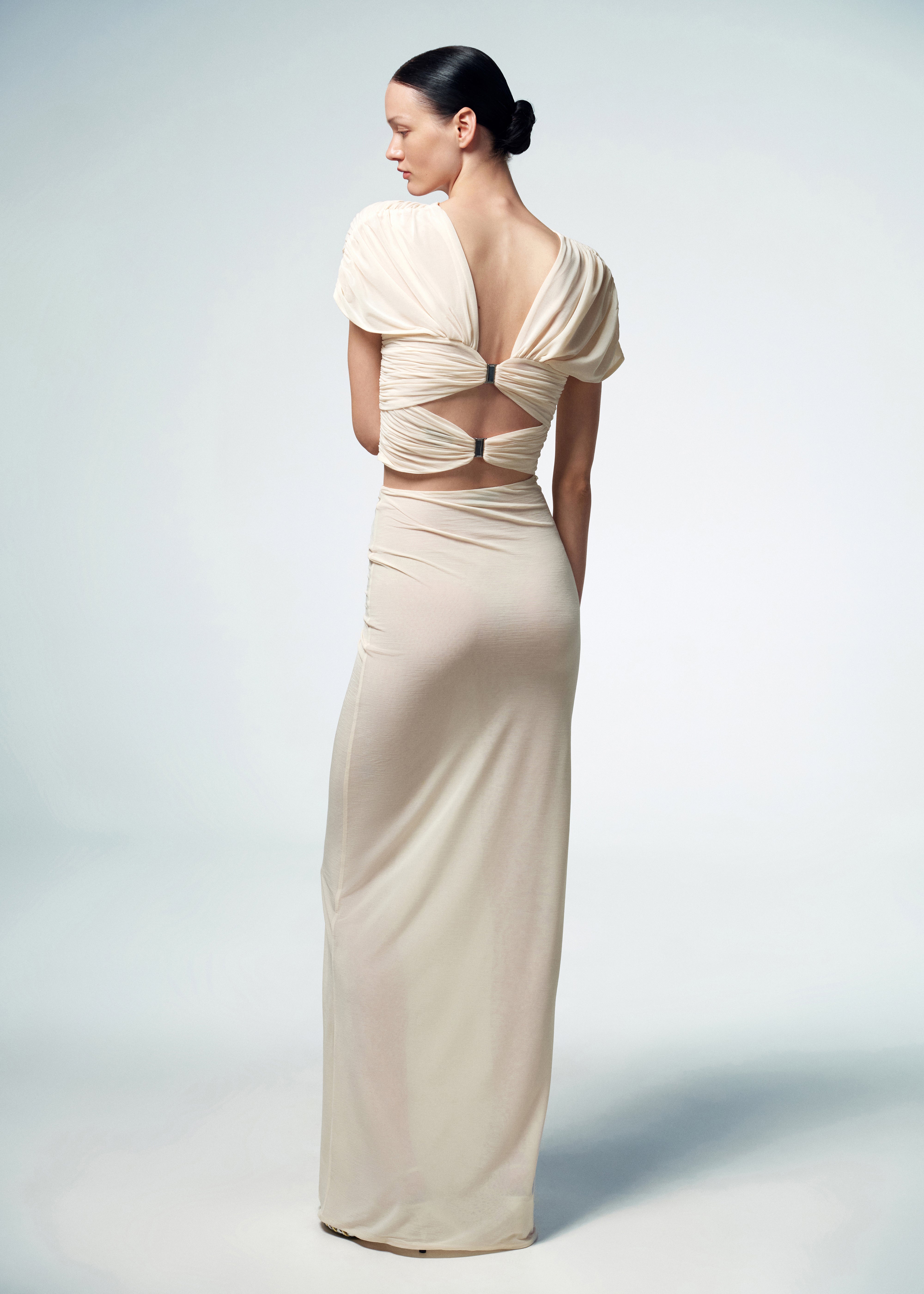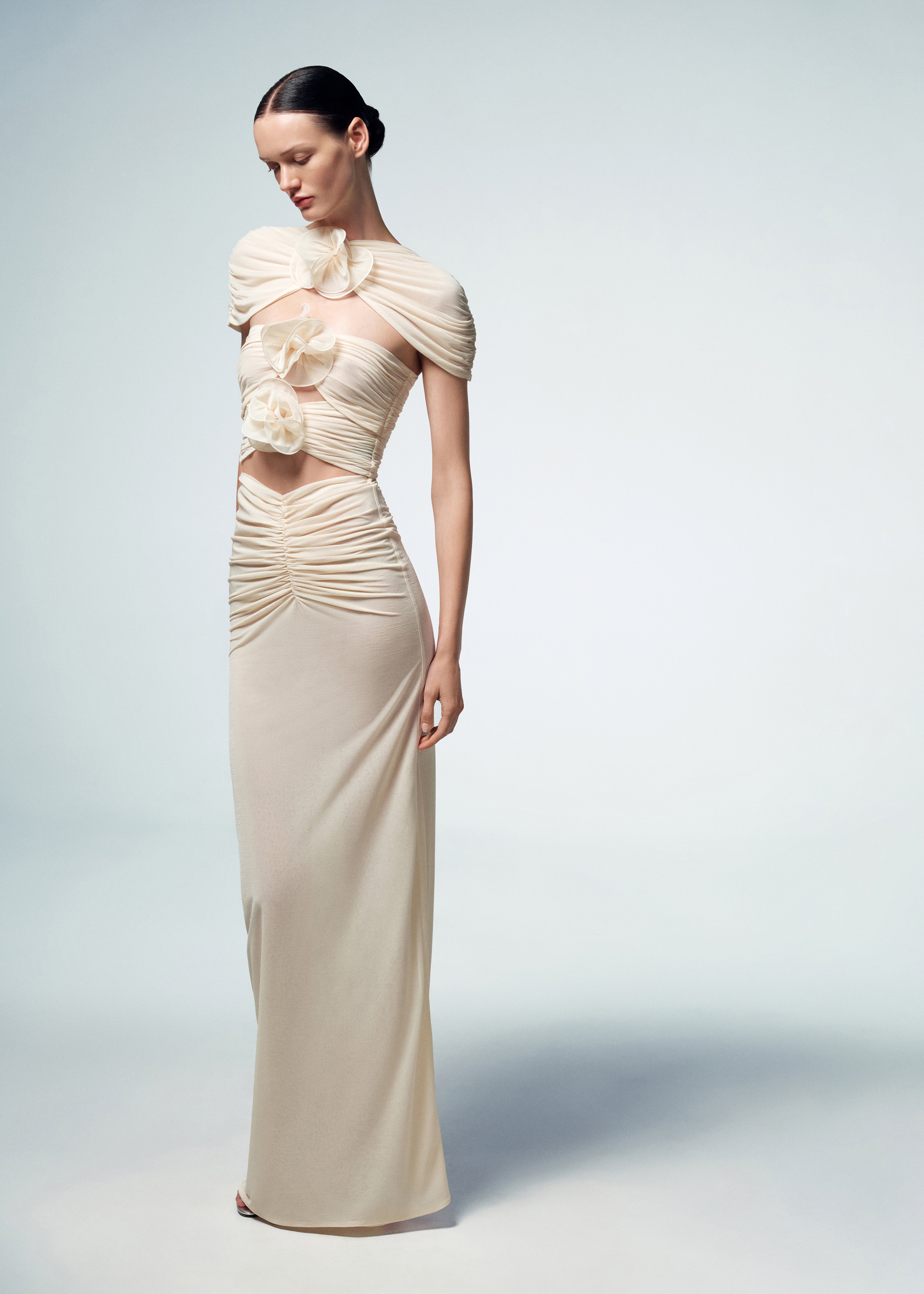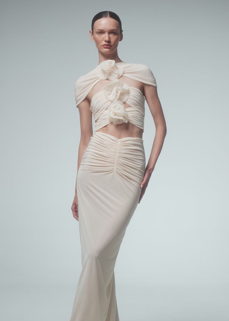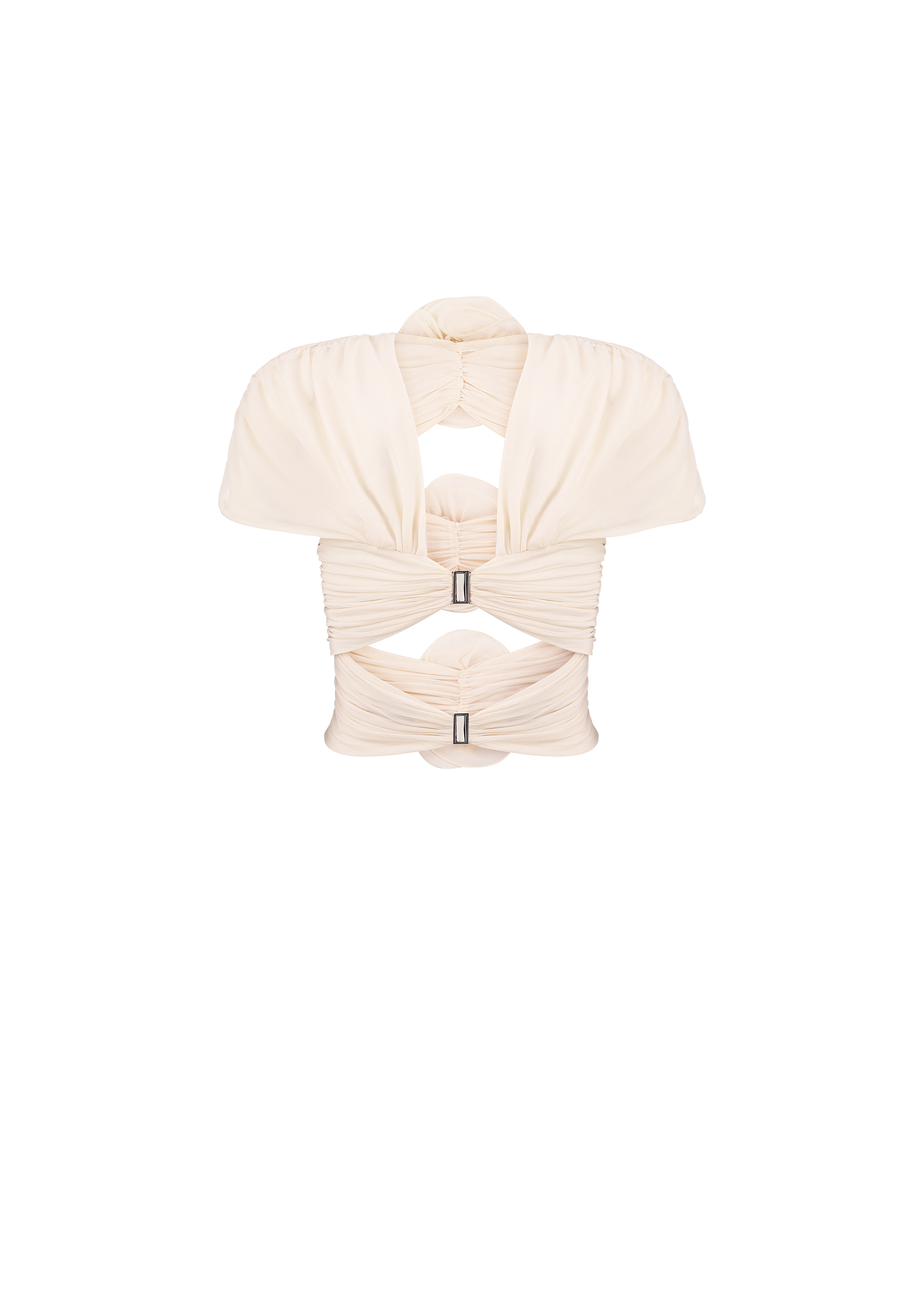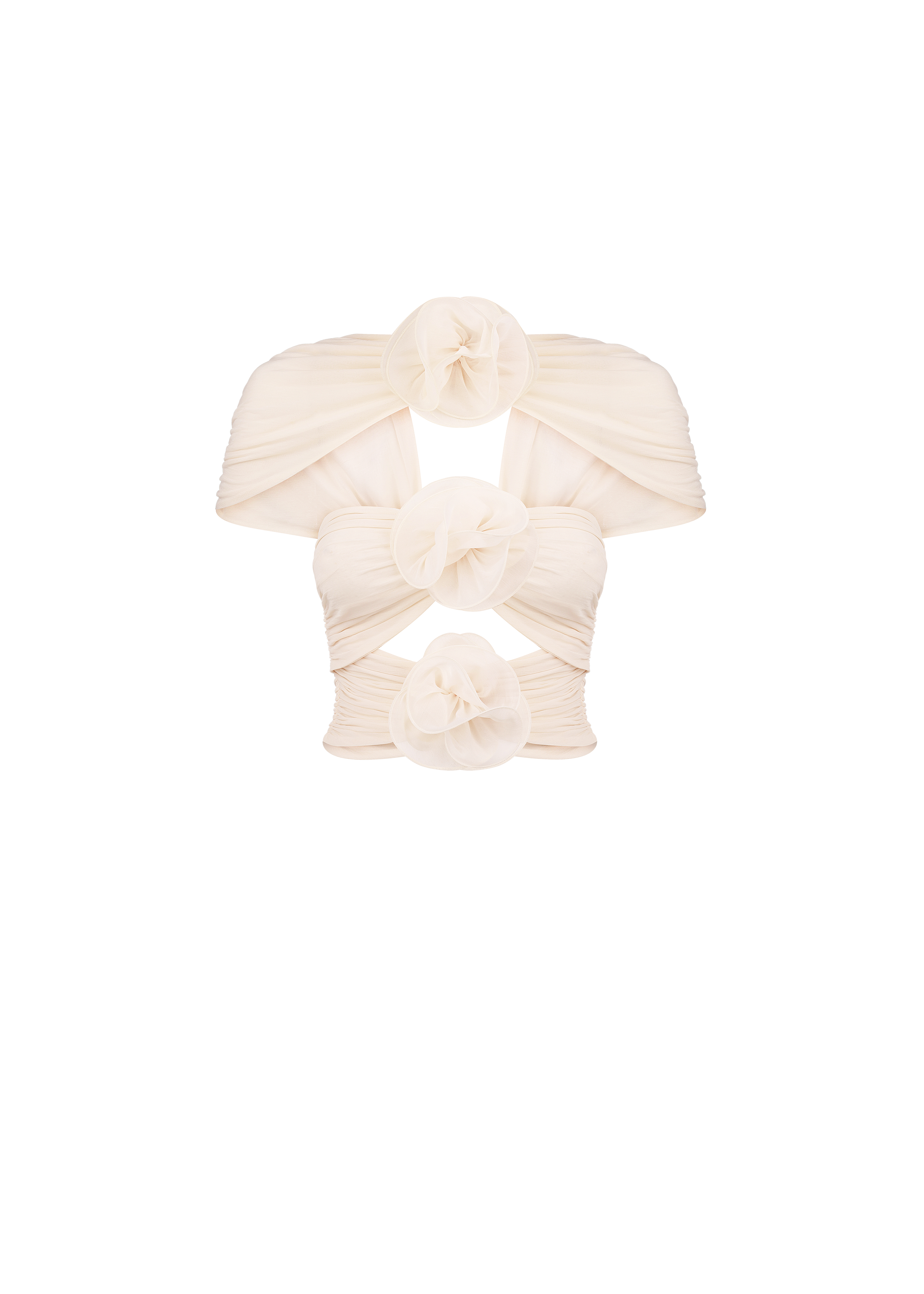 Wild Orchid ruched top, a captivating blend of modern elegance and delicate femininity. Crafted in a soft ivory hue, this top showcases refined ruched detailing that beautifully contours the body. What truly sets it apart are the intricate cutouts adorned with handcrafted flowers, adding a bold and unique touch. Fastened with magnetic closures on the back.