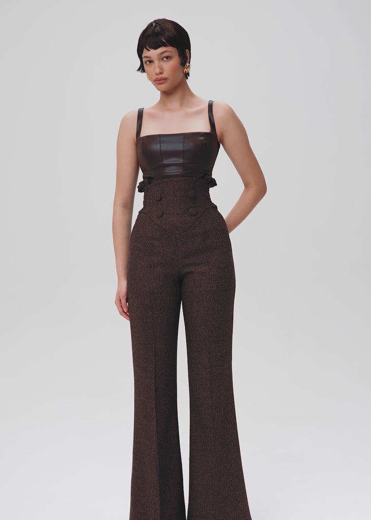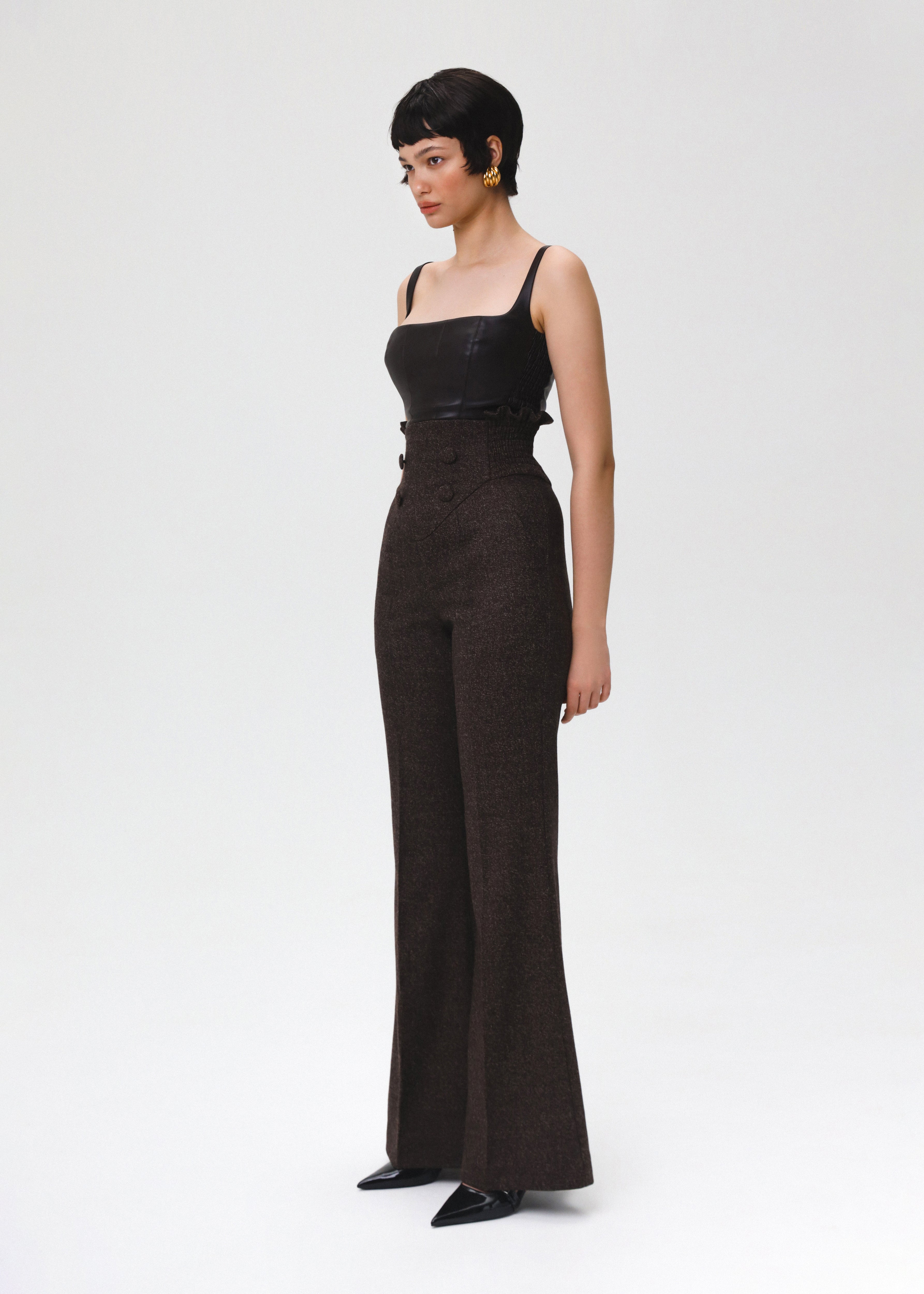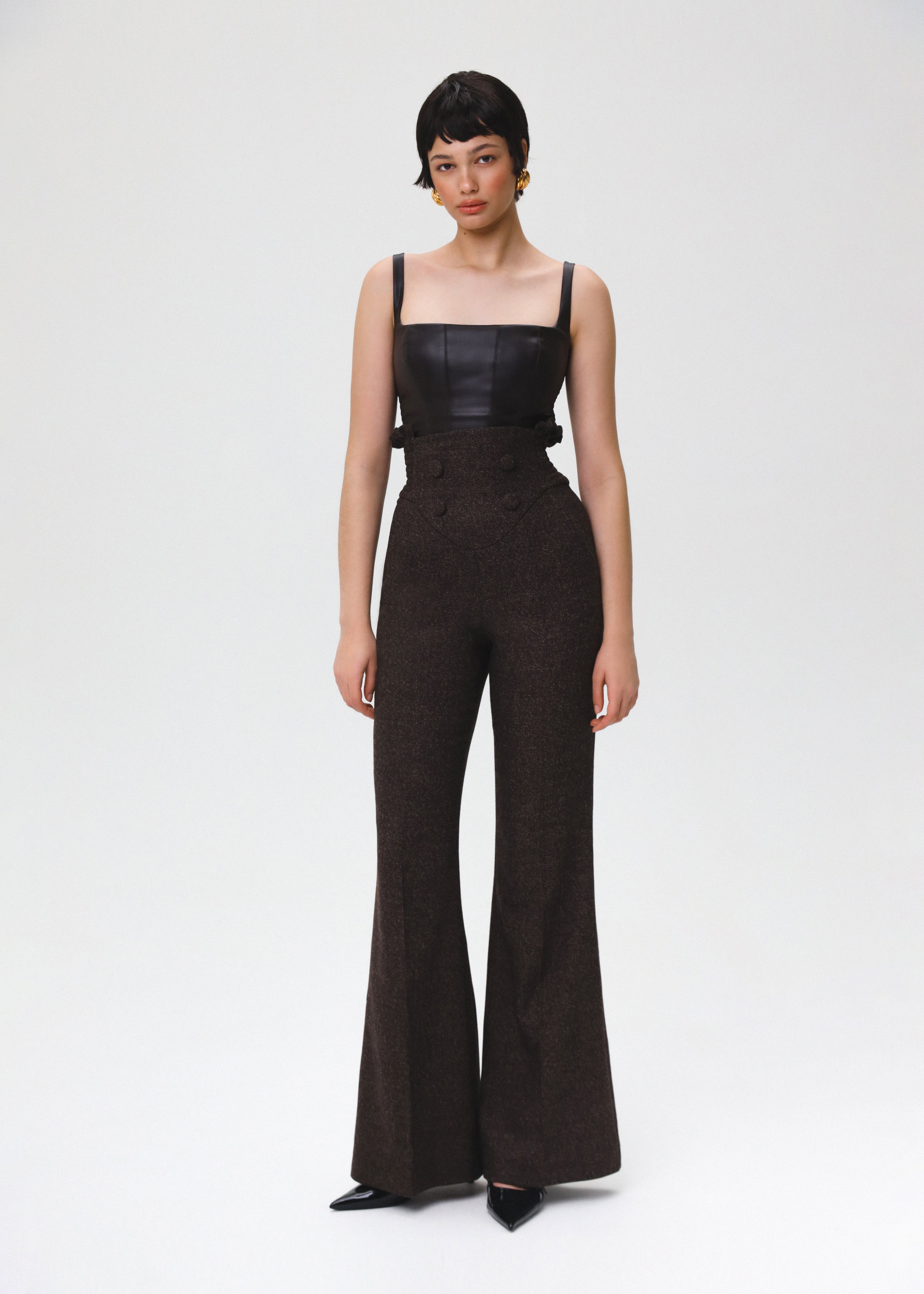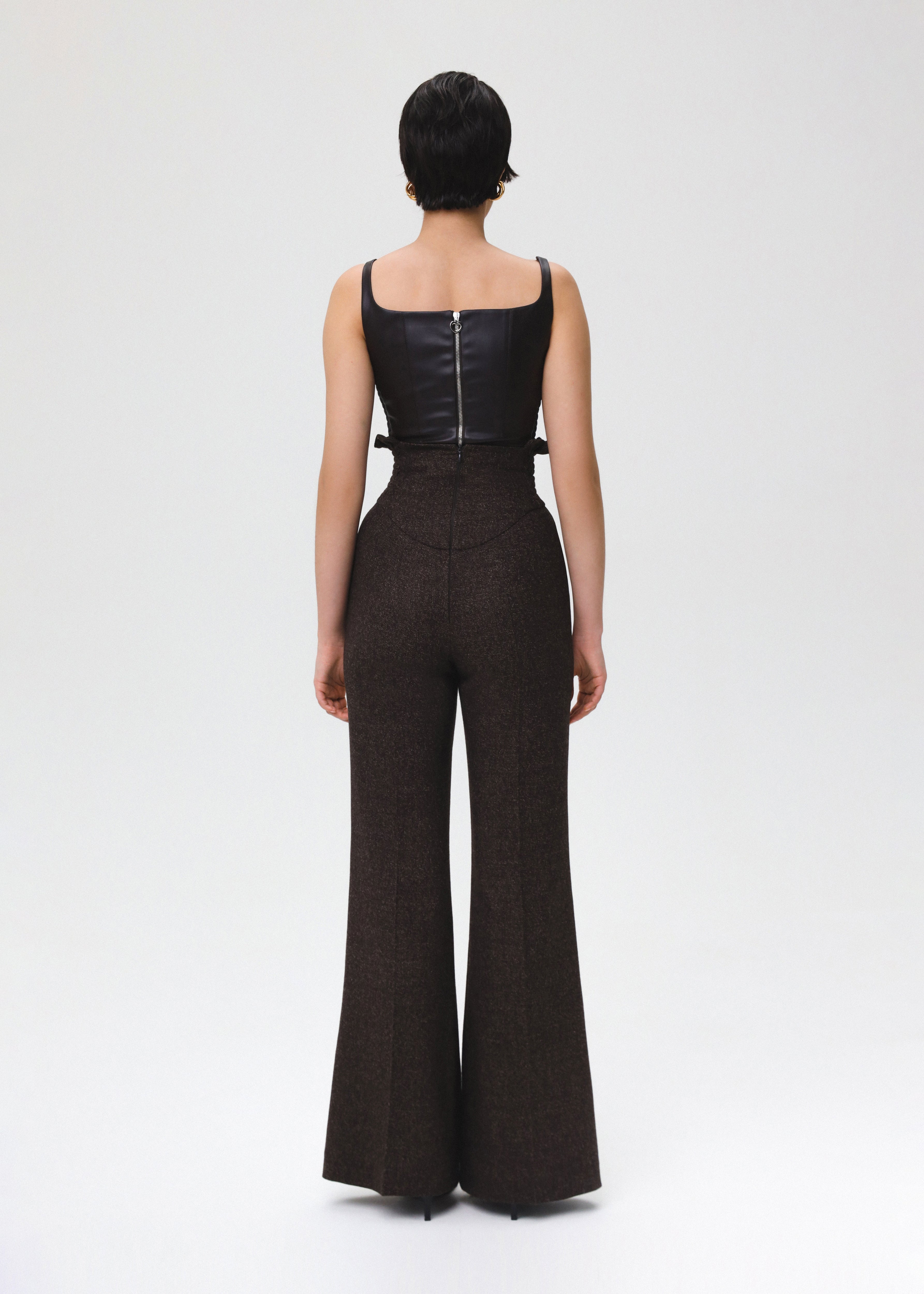 Crafted from dark brown eco-leather, this top features a square neckline and a curved hemline that collaborate to create a flattering silhouette. Designed with comfort in mind, it includes elastic inserts on the sides for a form-fitting look. It is fastened with a detachable zipper and fully lined.